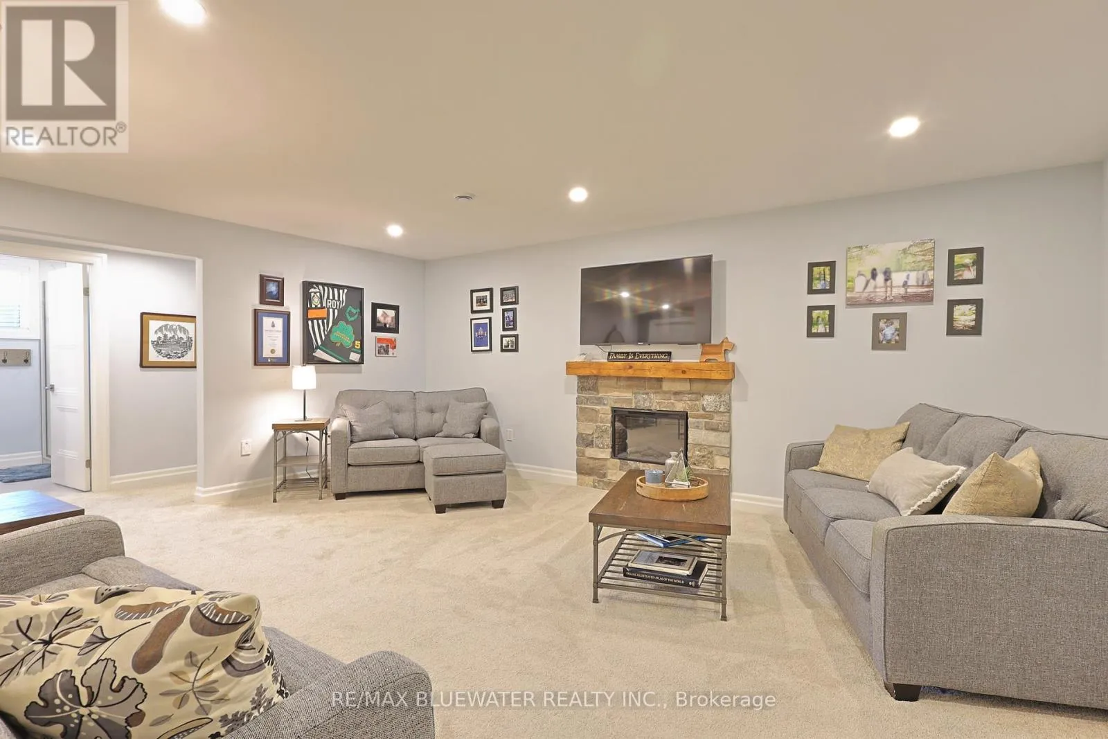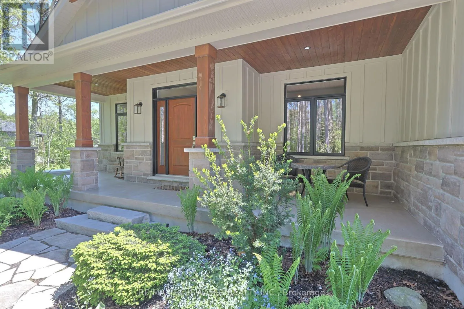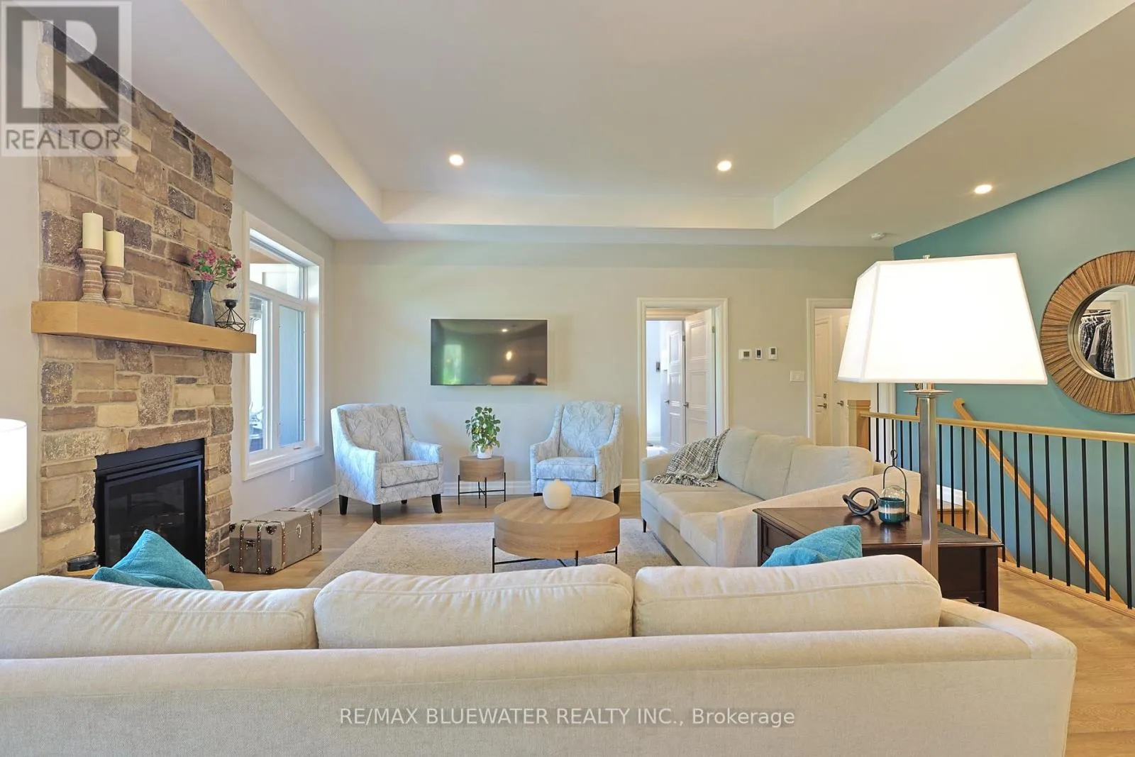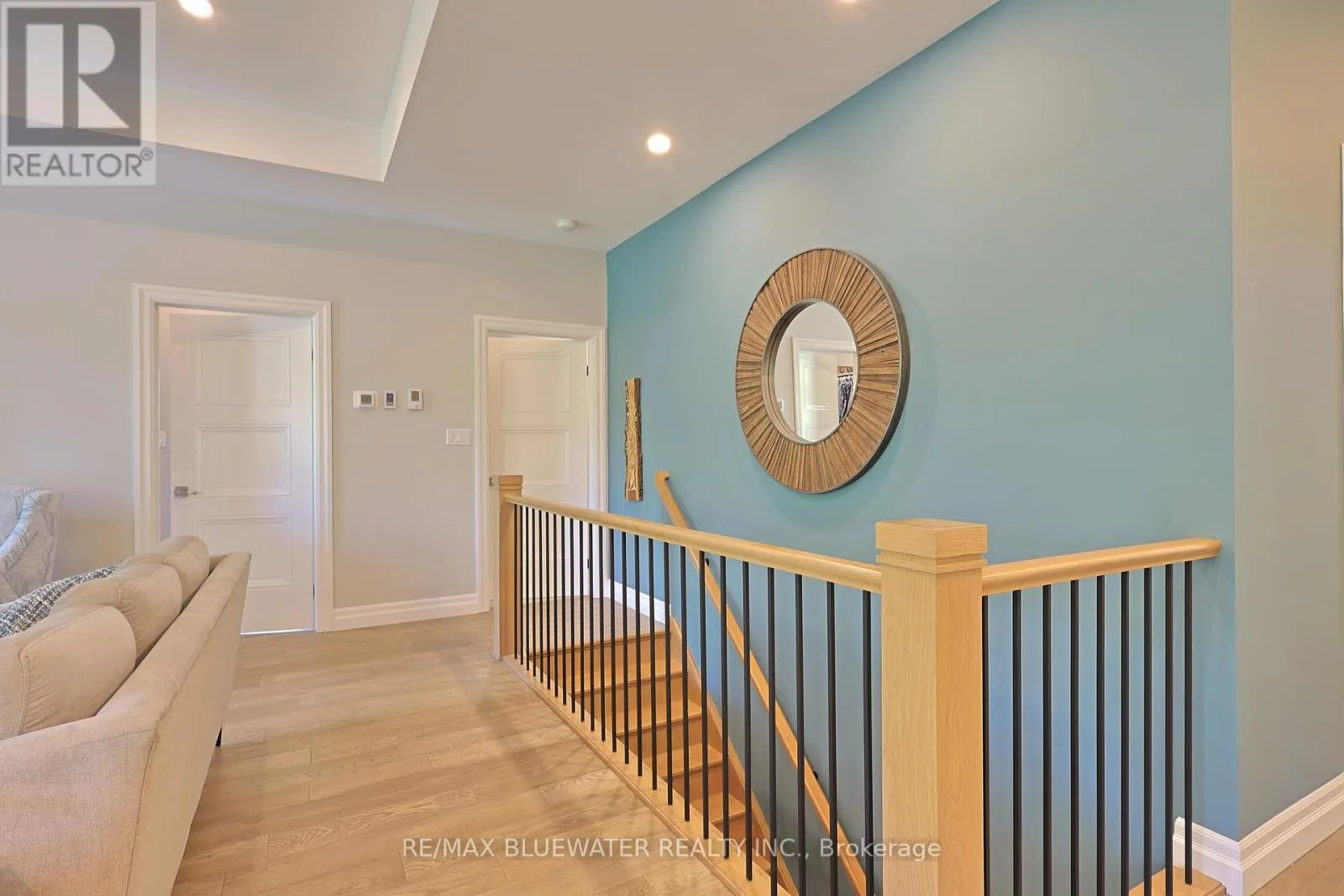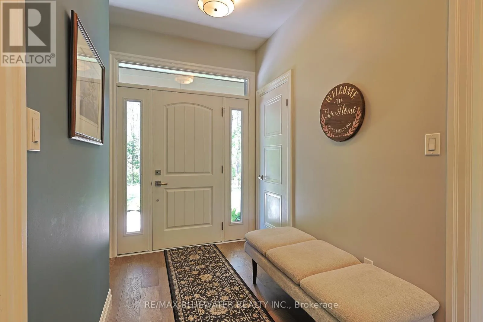 Cross Streets: Goosemarsh and Walker. ** Directions: On Goosemarsh Line between Graham St and Walker Road. Custom built modern bungalow on a one acre lot surrounded by nature near the Pinery Provincial Park. Drive through the tree lined driveway and your greeted with your new home built in 2021 by Nicholson Builders. Great curb appeal with the landscaped gardens and flagstone walkway leading to the covered front entrance and front porch seating area. Inside, you have a 1742 sqft open concept design with well appointed finishes and flowing with natural light featuring engineered hardwood floors throughout the main floor. Step inside the front foyer and you feel the warmth of the space that invites you in and makes you feel at home. As you enter the living room you will notice the coffered ceilings above and a stone feature wall around the gas fireplace. The kitchen features quartz countertops on two tone cabinetry, large island with waterfall countertop edges, herringbone patterned tile backsplash and stainless steel appliances. Spacious eating area off the kitchen and living room with large windows overlooking the back yard and access to the covered deck. Main floor primary bedroom suite with walk in closet and beautiful ensuite that includes a double vanity and tile shower. The main floor also includes his and her separate offices that border the front foyer overlooking the front entrance or easily include a guest room on the main floor as both offices have full closets. There's an additional full bathroom off the main living space and a mudroom with laundry as you enter from the 22'x24' double car garage. Full finished basement with large family room that features and electric fireplace, 3 bedrooms for kids and guests or crafts, full bathroom, workshop for the handy person and lots of storage in the utility room. Entertain friends in your private back yard as you enjoy the 18' x 14' covered back deck with vaulted ceilings and pot lighting overlooking the tree lined natural setting and flagstone walkway leading to your armour stone firepit. BONUS: GENERAC Generator! (id:27476)