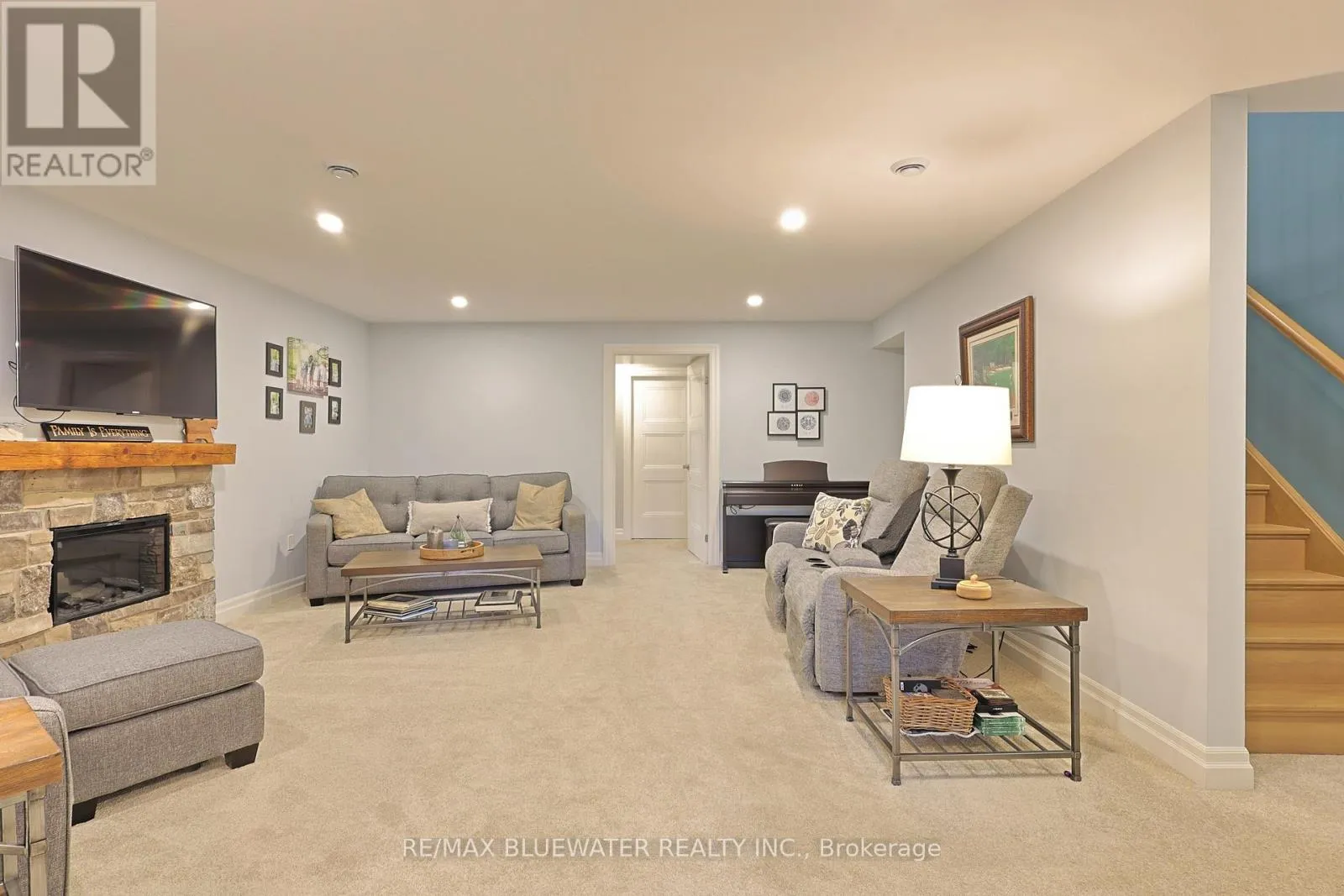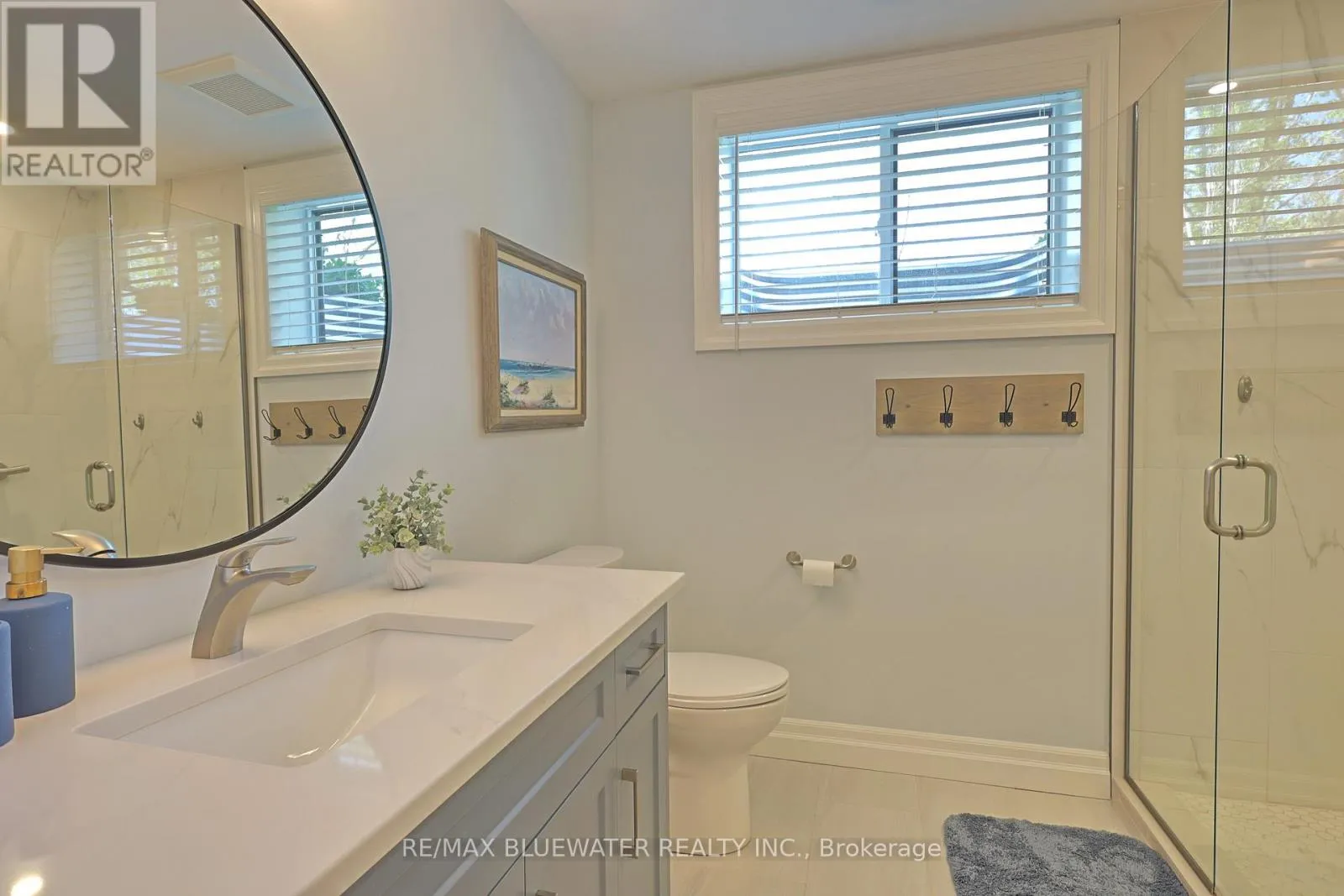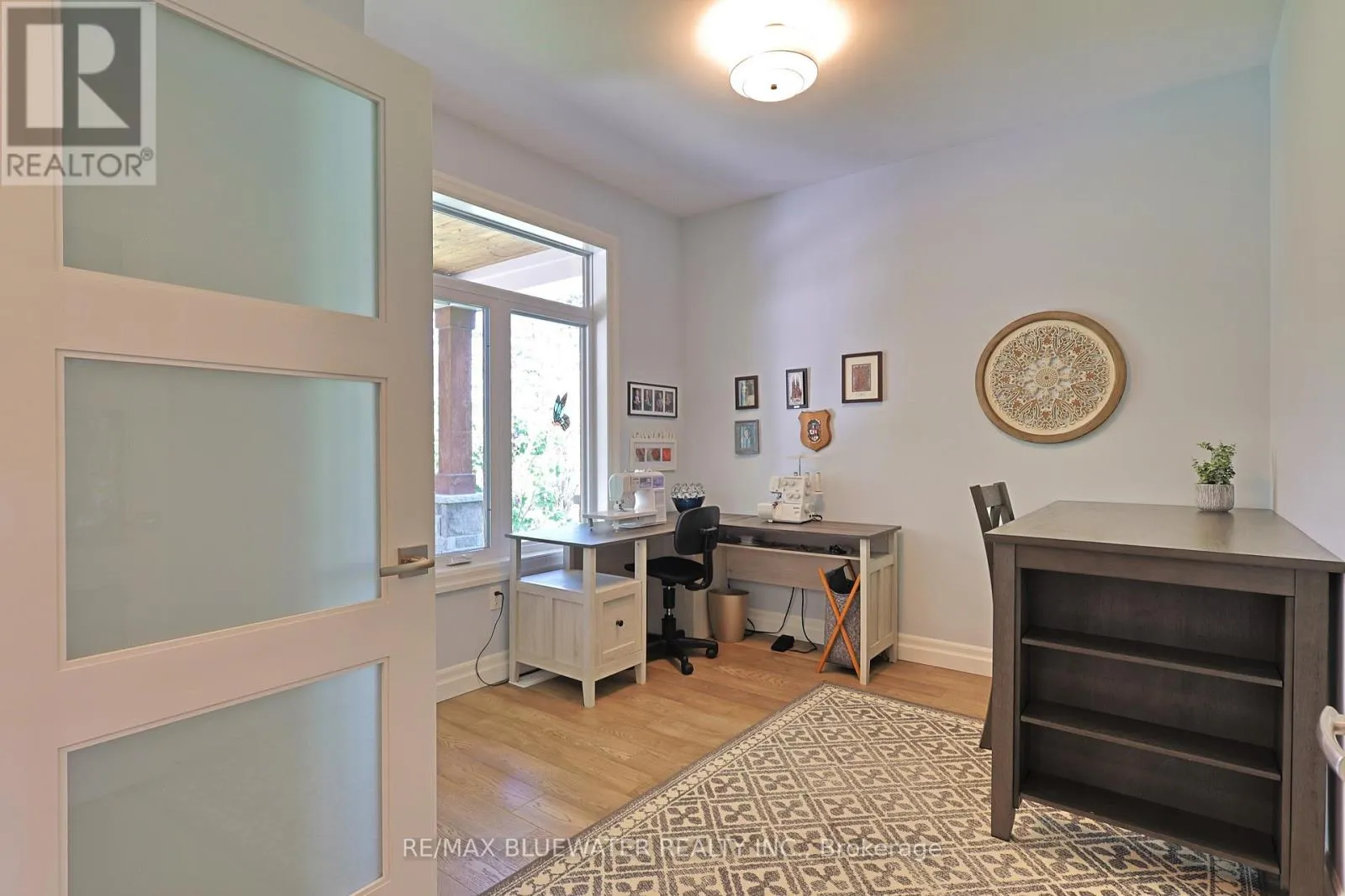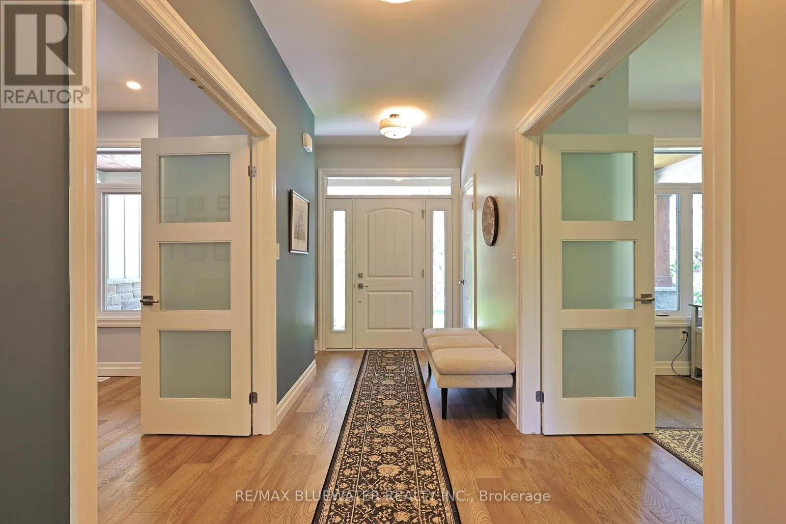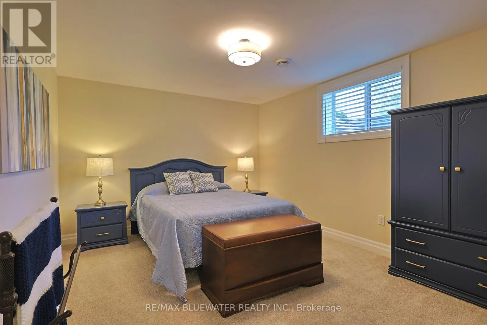 Cross Streets: Goosemarsh and Walker. ** Directions: On Goosemarsh Line between Graham St and Walker Road. Custom built modern bungalow on a one acre lot surrounded by nature near the Pinery Provincial Park. Drive through the tree lined driveway and your greeted with your new home built in 2021 by Nicholson Builders. Great curb appeal with the landscaped gardens and flagstone walkway leading to the covered front entrance and front porch seating area. Inside, you have a 1742 sqft open concept design with well appointed finishes and flowing with natural light featuring engineered hardwood floors throughout the main floor. Step inside the front foyer and you feel the warmth of the space that invites you in and makes you feel at home. As you enter the living room you will notice the coffered ceilings above and a stone feature wall around the gas fireplace. The kitchen features quartz countertops on two tone cabinetry, large island with waterfall countertop edges, herringbone patterned tile backsplash and stainless steel appliances. Spacious eating area off the kitchen and living room with large windows overlooking the back yard and access to the covered deck. Main floor primary bedroom suite with walk in closet and beautiful ensuite that includes a double vanity and tile shower. The main floor also includes his and her separate offices that border the front foyer overlooking the front entrance or easily include a guest room on the main floor as both offices have full closets. There's an additional full bathroom off the main living space and a mudroom with laundry as you enter from the 22'x24' double car garage. Full finished basement with large family room that features and electric fireplace, 3 bedrooms for kids and guests or crafts, full bathroom, workshop for the handy person and lots of storage in the utility room. Entertain friends in your private back yard as you enjoy the 18' x 14' covered back deck with vaulted ceilings and pot lighting overlooking the tree lined natural setting and flagstone walkway leading to your armour stone firepit. BONUS: GENERAC Generator! (id:27476)
