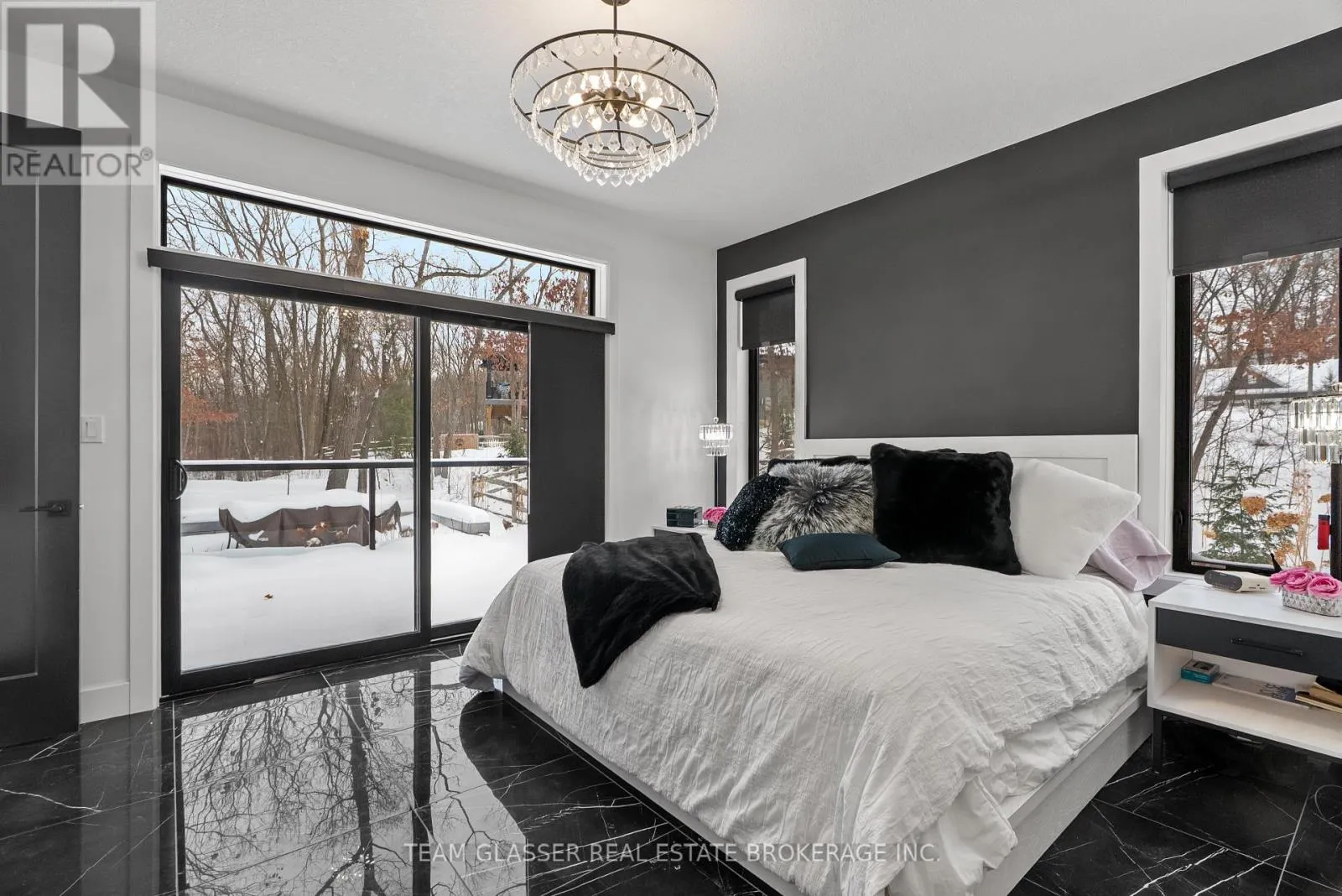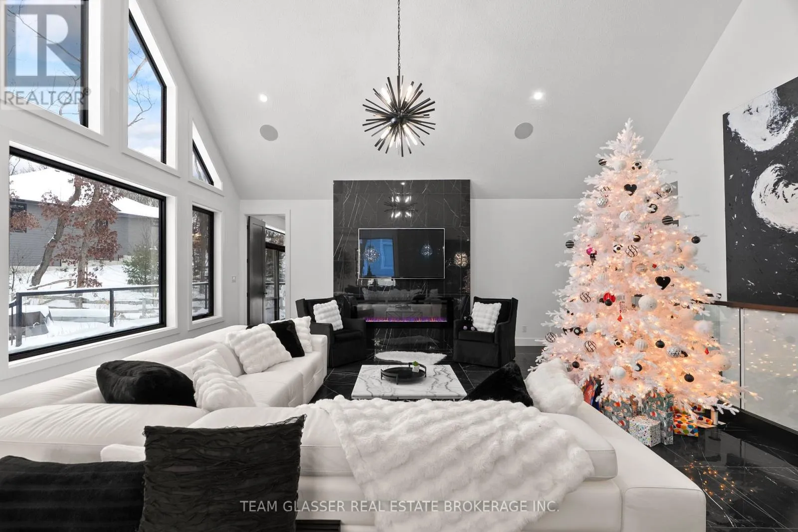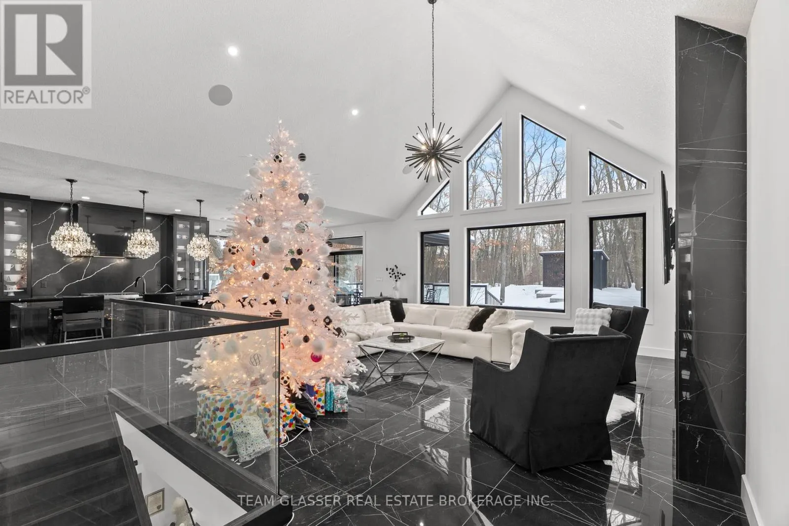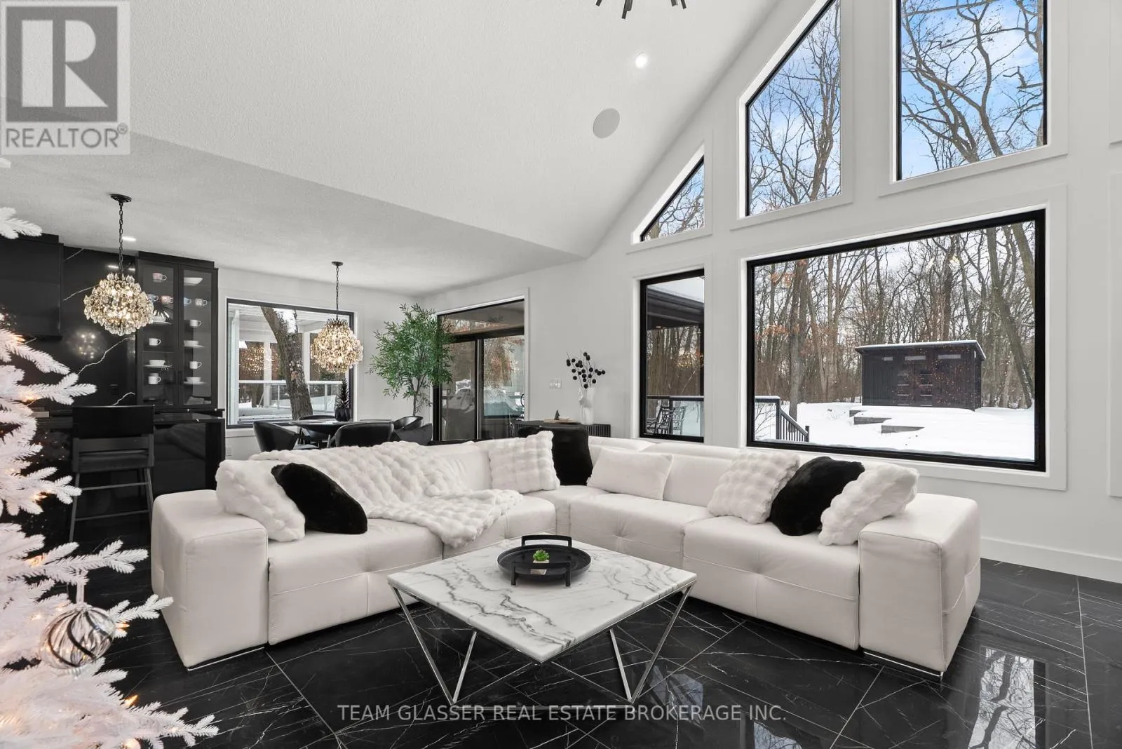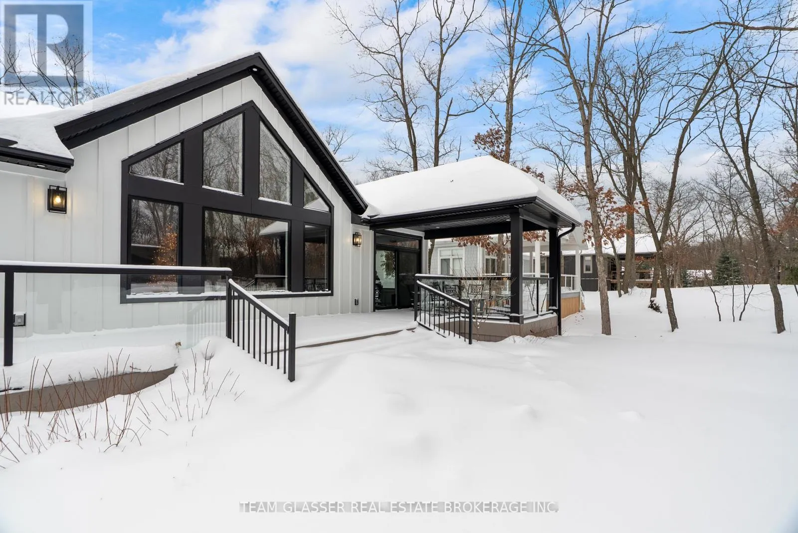 Cross Streets: LAKESHORE ROAD AND PINERY BLUFFS. ** Directions: FROM GRAND BEND TAKE LAKE SHORE ROAD (21) TO PINERY BLUFFS TURN RIGHT TRAVEL HALF WAY DOWN AND ITS ON THE RIGHT. Live the dream in this custom built 3000+ sq ft. stylized bungalow Nestled nicely on a gorgeously designed street, you'll find plenty of space inside and outside the home to enjoy. Professionally landscaped from front to back, with serenely large, relaxing patios, you can entertain in comfort outside or simply enjoy the peace and quiet that this expansive property offers. All of your necessities are catered to inside of course, with all of the most modern conveniences that you would want in a 4 bedroom home including its high end appliances, the butlers pantry/bar, open concept living room, 100 inch and 72 inch fireplaces and private dining room. Cleaning is made easy with the porcelain tile found throughout and modern touches adorn every living space. There's also plenty of storage and room for 3 cars in the garagE. Many finished rooms to be found off the lower level recroom which have been designed to match the decor of the entire home to entertain, work out, or have guests stay while keeping their privacy. There are many impressive touches here including in floor heating, media installations and demarcation. For a list of its treasures, please reach out to the listing agent. (id:27476)