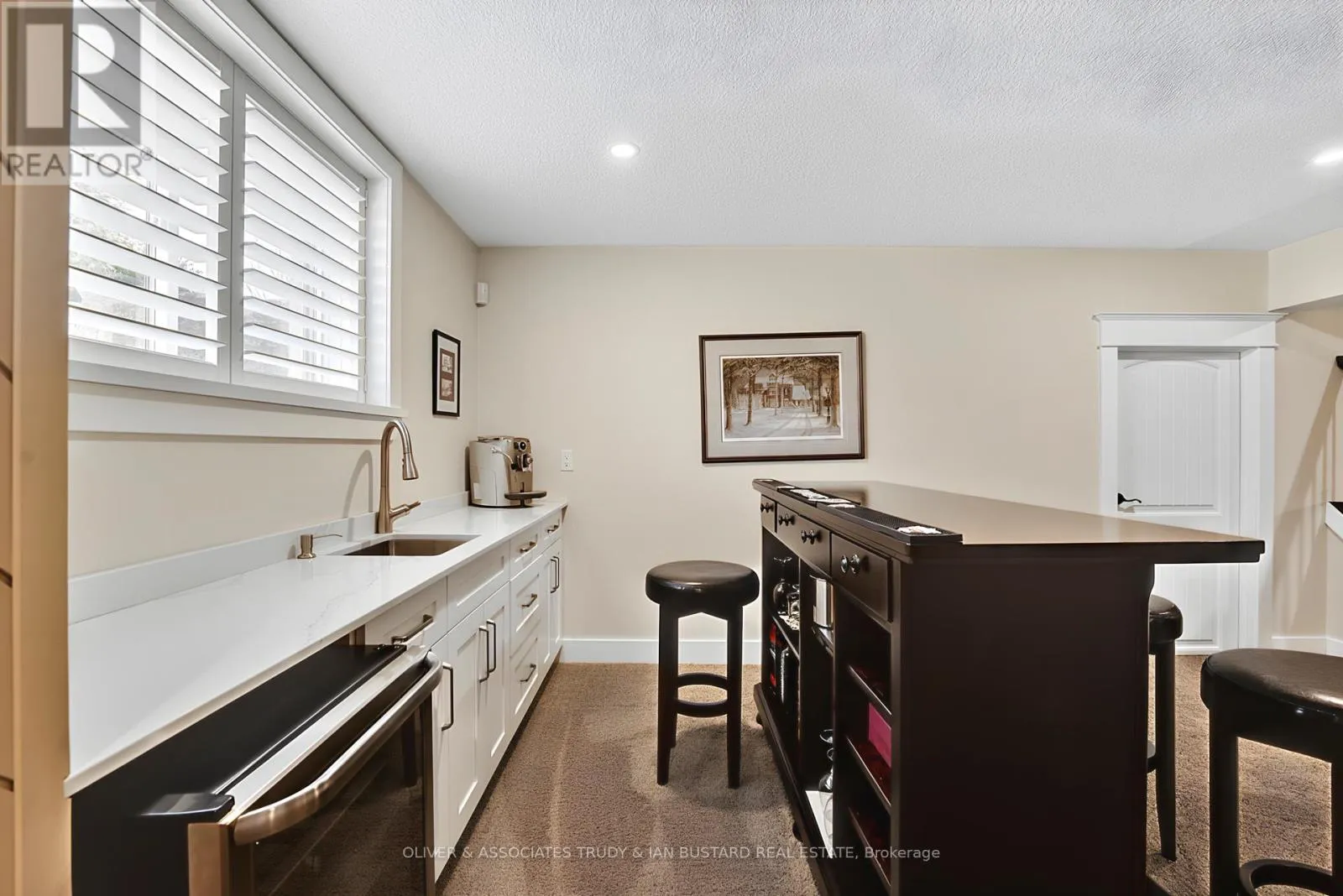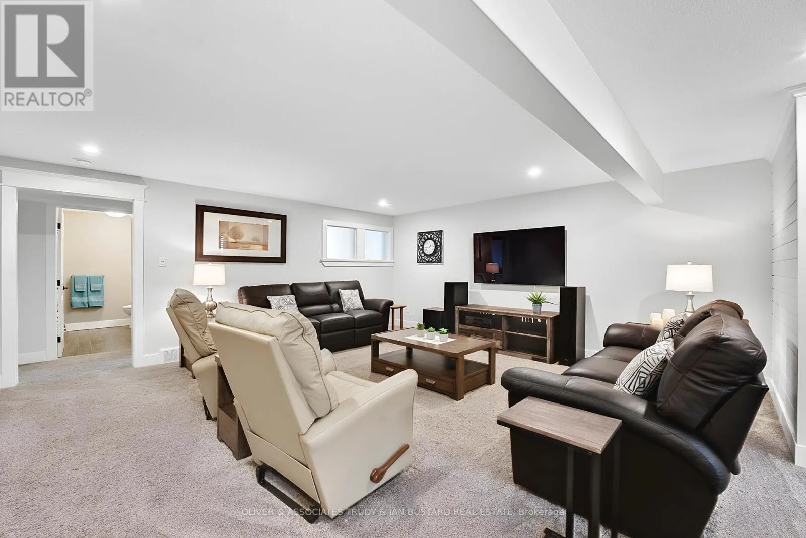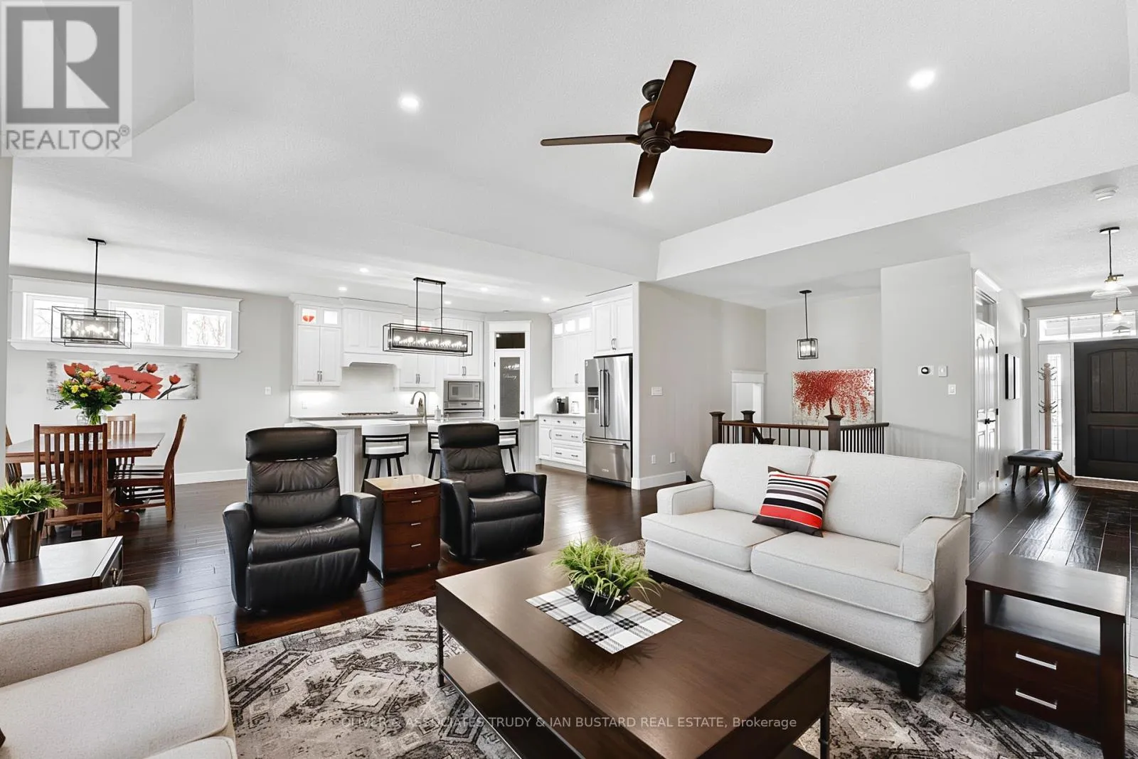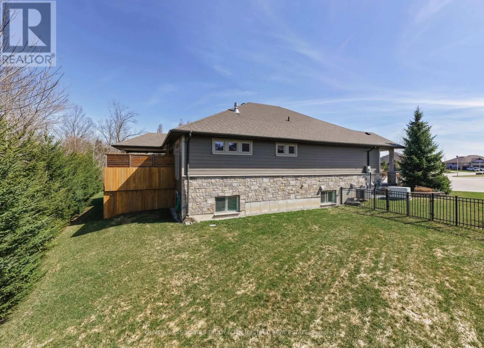 Cross Streets: Hayter Drive. ** Directions: Gill Rd to Hayter Drive turn left onto Erin Place. Welcome to this picture-perfect bungalow by Medway Homes, nestled in the prestigious Harbourside Village of Grand Bend. Just a short stroll to downtown shops, dining, and the beach, this exceptional home blends elegance, comfort, and effortless one-floor living. Offering over 2,800 sq ft of total finished space, the home features a bright, open-concept layout with tasteful, upscale finishes. The stunning custom kitchen serves as the heart of the home, boasting an oversized island, quartz countertops, and premium appliances. The main floor includes a convenient laundry room and a spacious primary suite. Extend your living space outdoors to the expansive deck, complete with a covered area and powered awning, overlooking a private, landscaped lot that backs onto serene woods. The fully finished lower level adds significant value, featuring a cozy family room with a gas fireplace, a wet bar, and additional versatile rooms perfect for guests or a home office. Practicality meets luxury with a massive attached garage, featuring a sink and direct walk-up access to the basement. Recent upgrades include a new poured concrete driveway and walkway, a sophisticated sprinkler system and a security system. Situated on a quiet, pie-shaped lot, this home offers the perfect balance of privacy and community, with local schools and the Old Ausable Channel just moments away. Experience the best of Grand Bend living in this meticulously maintained, move-in-ready residence. (id:27476)