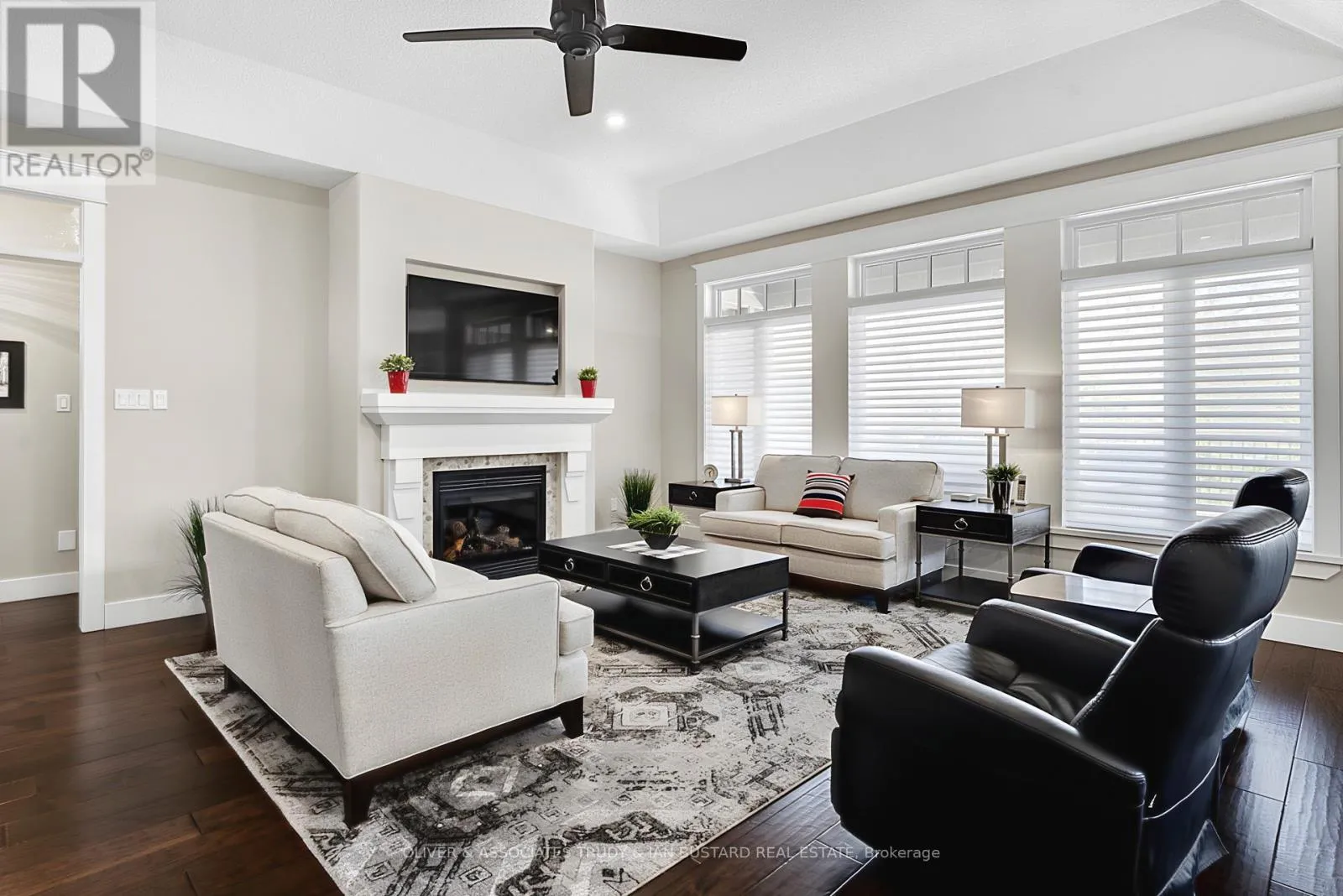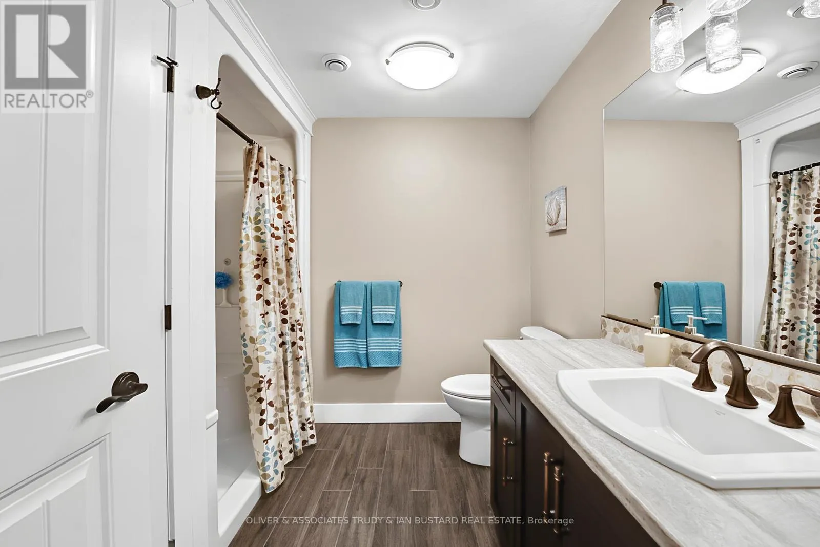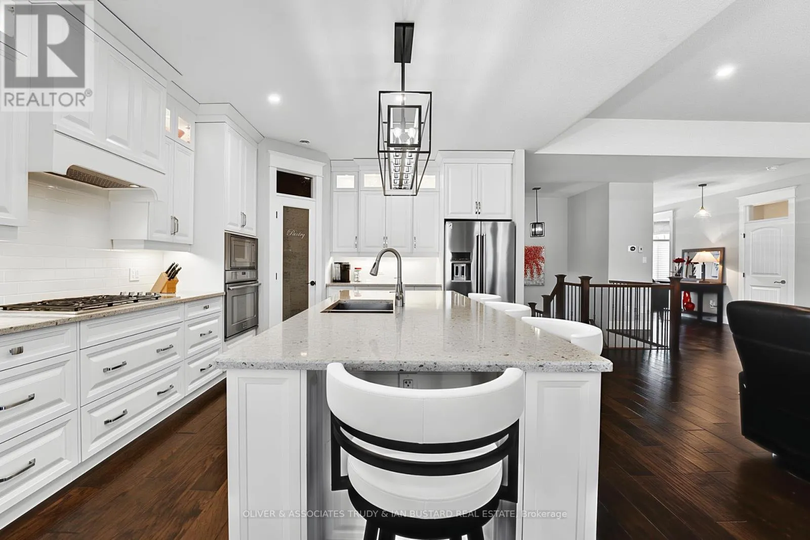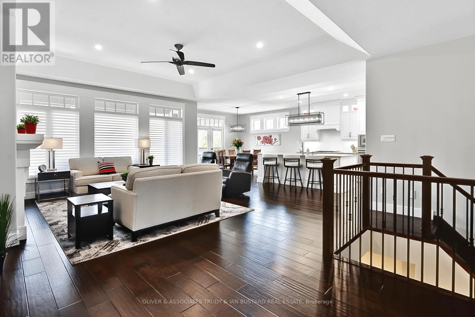 Cross Streets: Hayter Drive. ** Directions: Gill Rd to Hayter Drive turn left onto Erin Place. Welcome to this picture-perfect bungalow by Medway Homes, nestled in the prestigious Harbourside Village of Grand Bend. Just a short stroll to downtown shops, dining, and the beach, this exceptional home blends elegance, comfort, and effortless one-floor living. Offering over 2,800 sq ft of total finished space, the home features a bright, open-concept layout with tasteful, upscale finishes. The stunning custom kitchen serves as the heart of the home, boasting an oversized island, quartz countertops, and premium appliances. The main floor includes a convenient laundry room and a spacious primary suite. Extend your living space outdoors to the expansive deck, complete with a covered area and powered awning, overlooking a private, landscaped lot that backs onto serene woods. The fully finished lower level adds significant value, featuring a cozy family room with a gas fireplace, a wet bar, and additional versatile rooms perfect for guests or a home office. Practicality meets luxury with a massive attached garage, featuring a sink and direct walk-up access to the basement. Recent upgrades include a new poured concrete driveway and walkway, a sophisticated sprinkler system and a security system. Situated on a quiet, pie-shaped lot, this home offers the perfect balance of privacy and community, with local schools and the Old Ausable Channel just moments away. Experience the best of Grand Bend living in this meticulously maintained, move-in-ready residence. (id:27476)