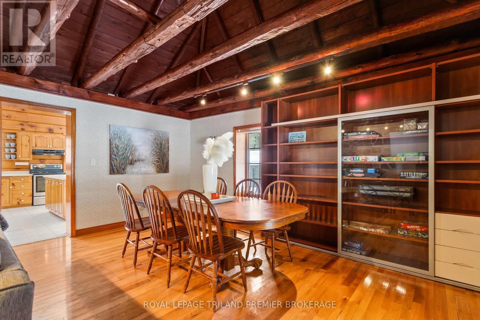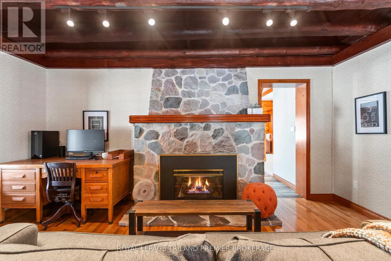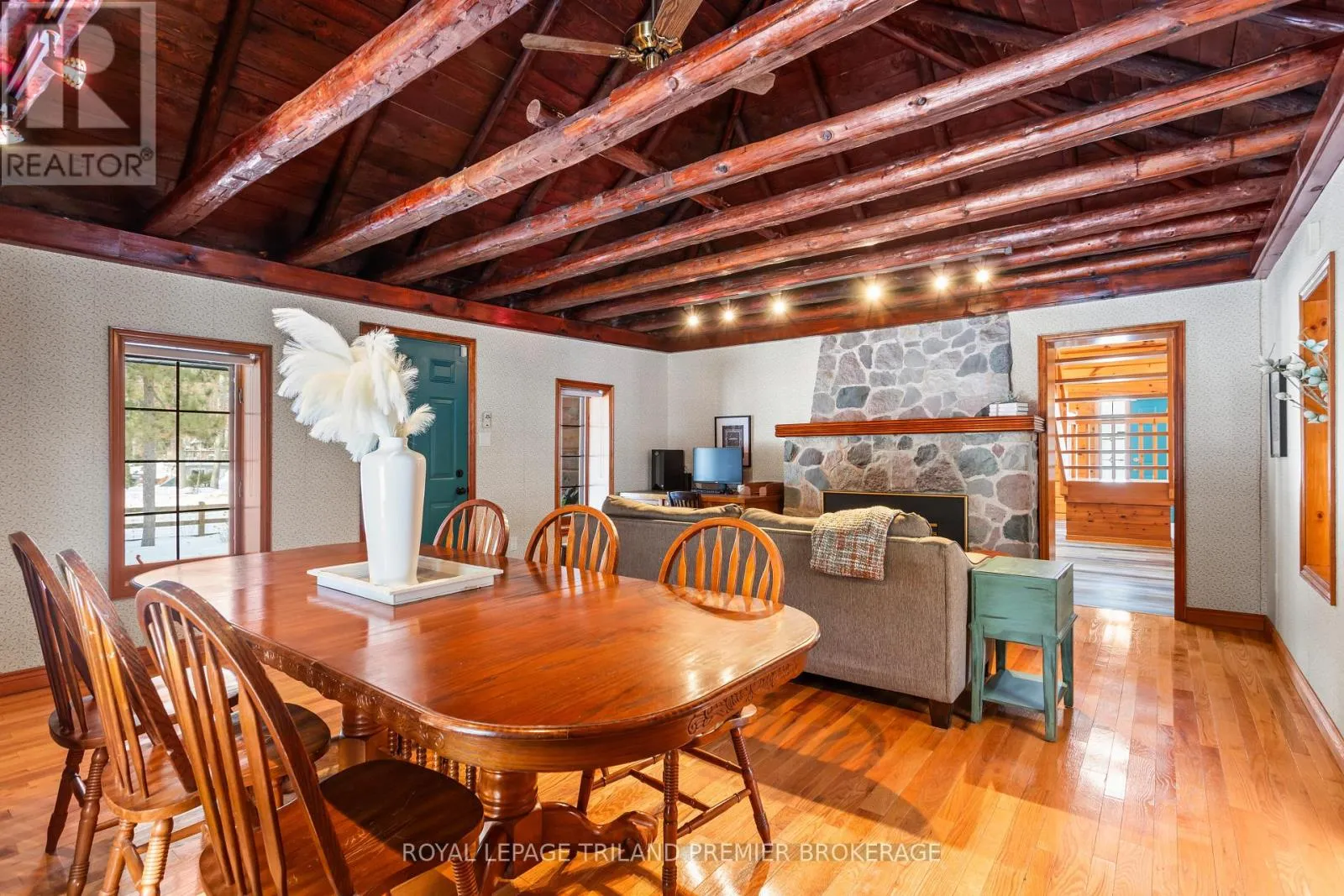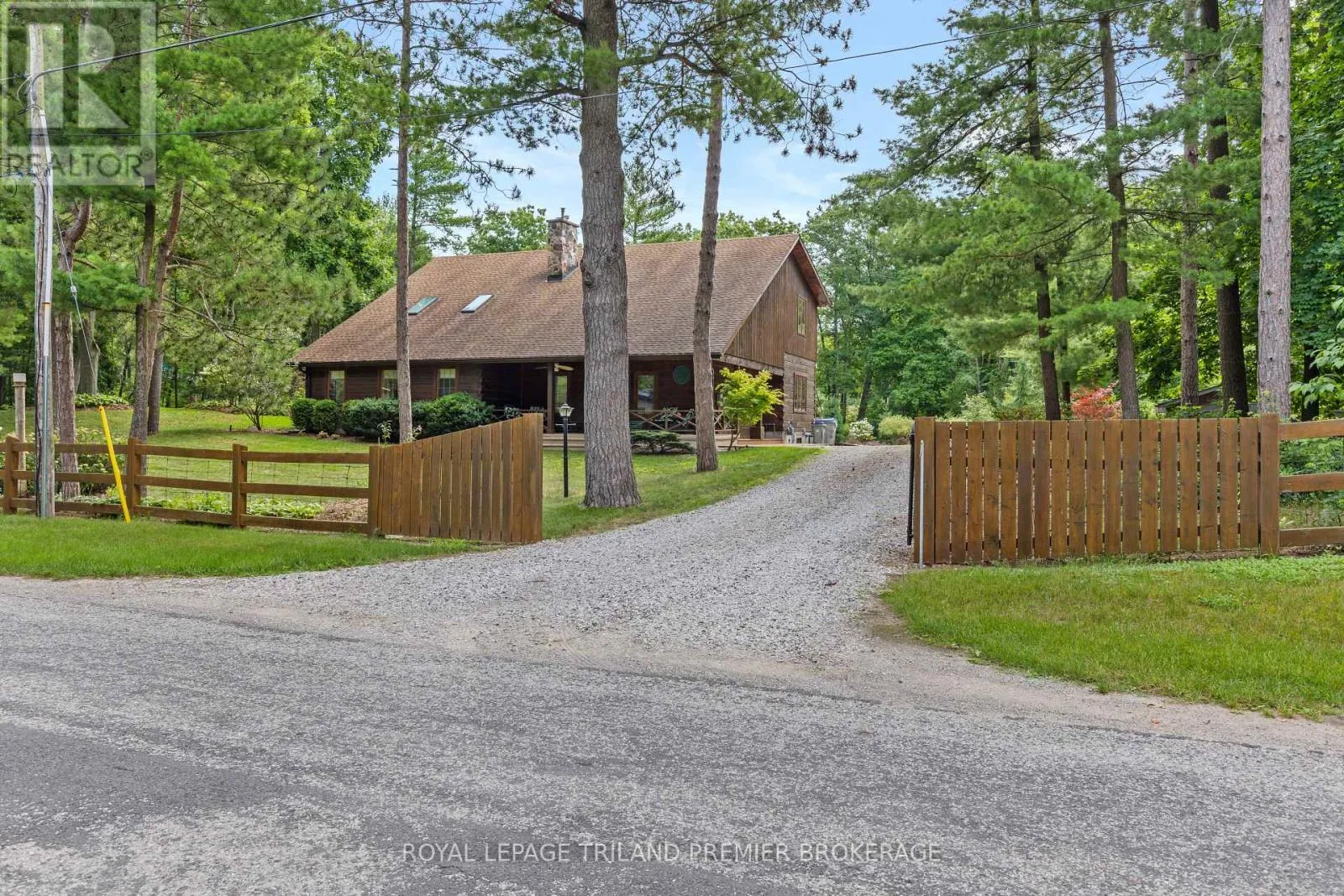 FROM PORT FRANKS RD, TURN ONTO ONTARIO ST Seize this opportunity to own a piece of history in beautiful Port Franks! This picturesque log cabin is nestled on a mature treed lot and features all the conveniences of modern day living. The generous main floor boasts a cozy dining/sitting room with exposed beams, hardwood flooring and gas fireplace; double height family room with log interior walls, vaulted ceilings, sky lights, grand wooden open riser staircase, and gas fireplace; eat in kitchen with updated appliances (2019) and island with breakfast bar; updated bathroom and large foyer. The upper level boasts full views of the family room with updated main bathroom including tiled shower with glass enclosure, double sinks and stand alone soaker tub and 3 generous bedrooms including primary with vaulted ceilings, double closets and sky light. The entire home is surrounded by wrap around porches and decks with stunning landscaping and hot tub all with privacy from the mature trees. The expansive treed lot spans 198 ft front by 247ft depth. Large triple car detached garage is perfect for parking or hobbiest. Outdoor features include generous driveway with room for RV/boat parking, fire pit, irrigation system (2020), and 2 sand points which provide water for the lawn and gardens. Luxury vinyl flooring (2022), painted (2022), electrical for hot tub, and electrical for generator. Wonderful location being walking distance to 3 marinas, community centre, playground, trails and library and in close proximity to private Port Franks beach, golf coarse and restaurants. (id:27476)