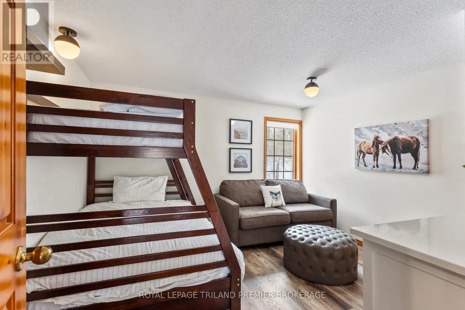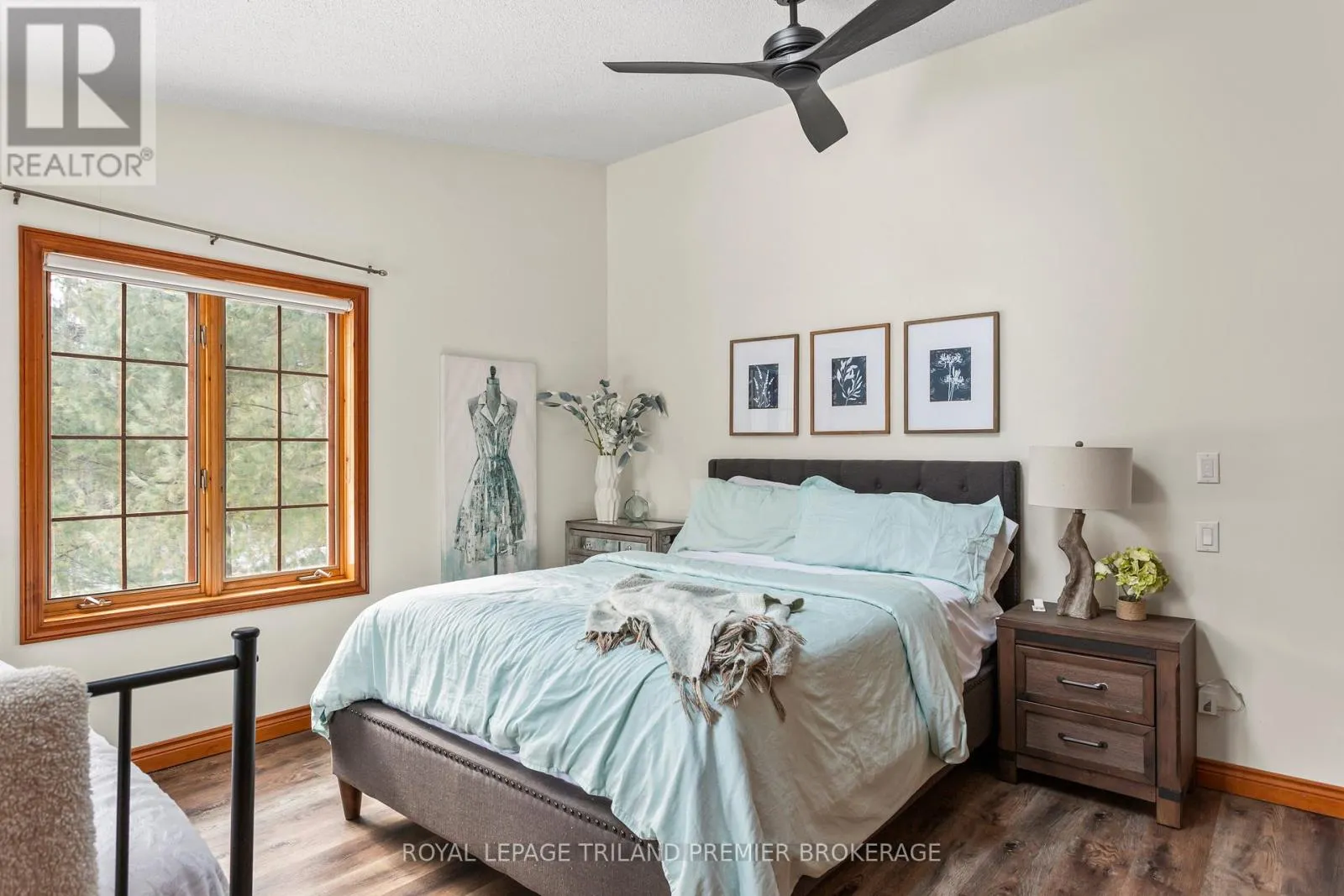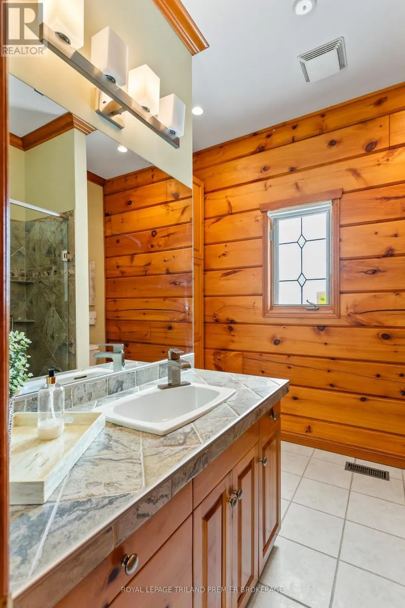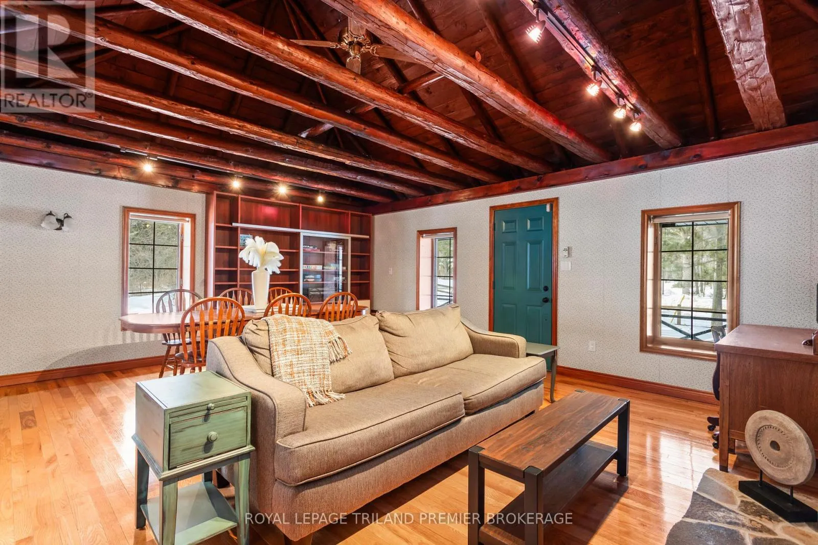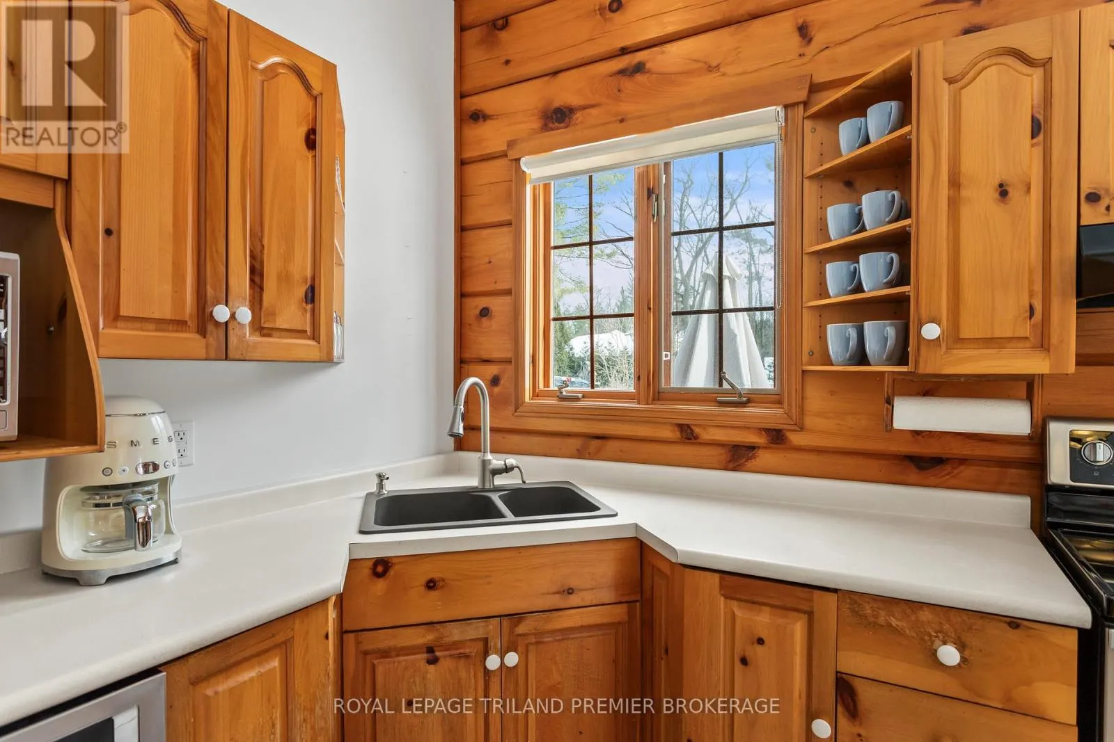 FROM PORT FRANKS RD, TURN ONTO ONTARIO ST Seize this opportunity to own a piece of history in beautiful Port Franks! This picturesque log cabin is nestled on a mature treed lot and features all the conveniences of modern day living. The generous main floor boasts a cozy dining/sitting room with exposed beams, hardwood flooring and gas fireplace; double height family room with log interior walls, vaulted ceilings, sky lights, grand wooden open riser staircase, and gas fireplace; eat in kitchen with updated appliances (2019) and island with breakfast bar; updated bathroom and large foyer. The upper level boasts full views of the family room with updated main bathroom including tiled shower with glass enclosure, double sinks and stand alone soaker tub and 3 generous bedrooms including primary with vaulted ceilings, double closets and sky light. The entire home is surrounded by wrap around porches and decks with stunning landscaping and hot tub all with privacy from the mature trees. The expansive treed lot spans 198 ft front by 247ft depth. Large triple car detached garage is perfect for parking or hobbiest. Outdoor features include generous driveway with room for RV/boat parking, fire pit, irrigation system (2020), and 2 sand points which provide water for the lawn and gardens. Luxury vinyl flooring (2022), painted (2022), electrical for hot tub, and electrical for generator. Wonderful location being walking distance to 3 marinas, community centre, playground, trails and library and in close proximity to private Port Franks beach, golf coarse and restaurants. (id:27476)
