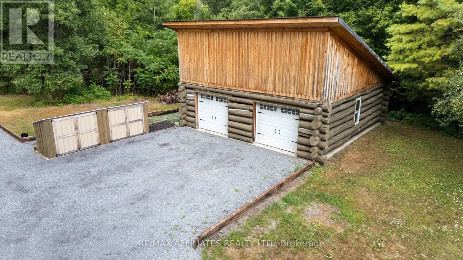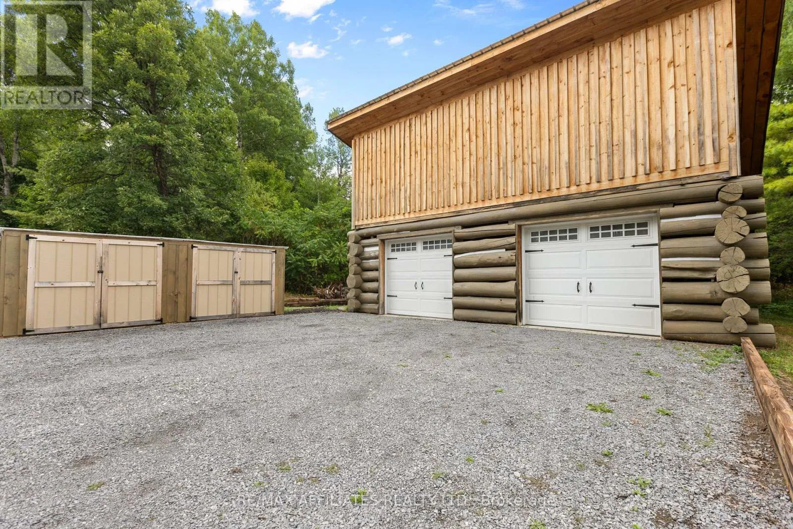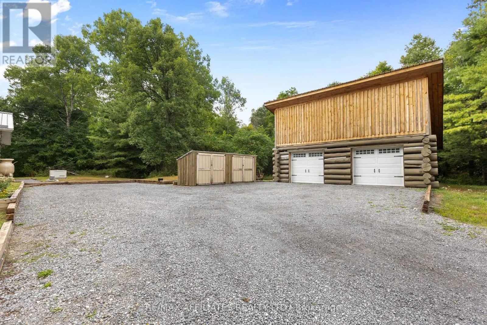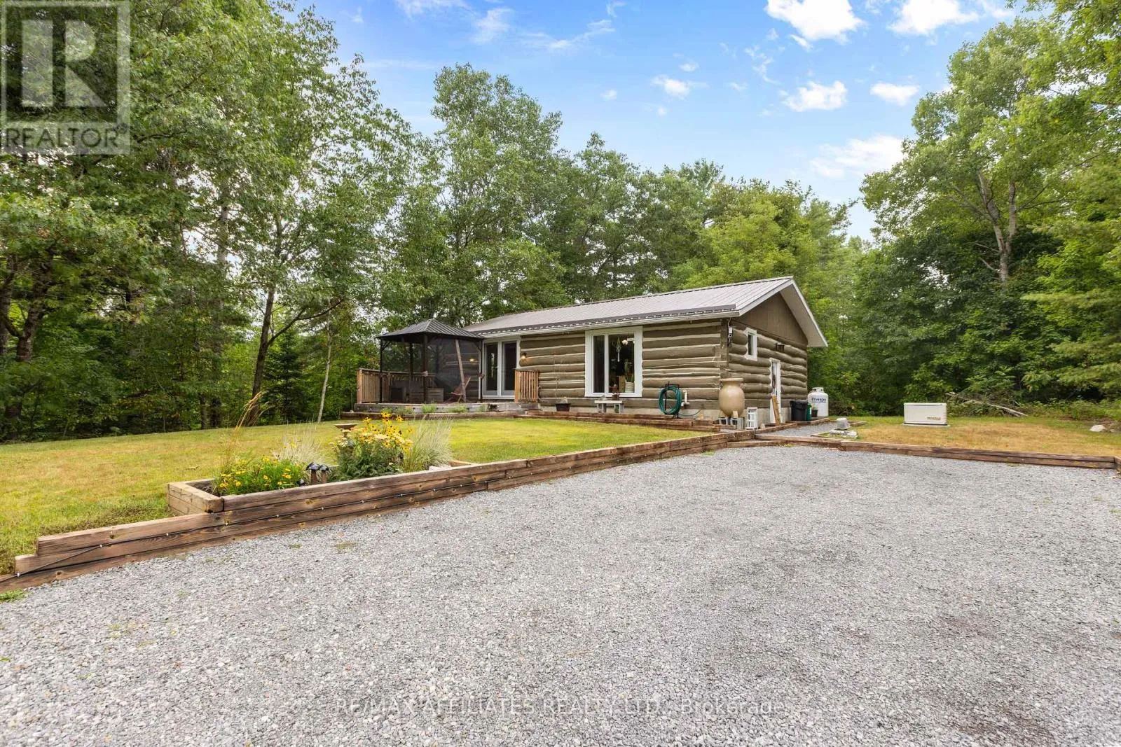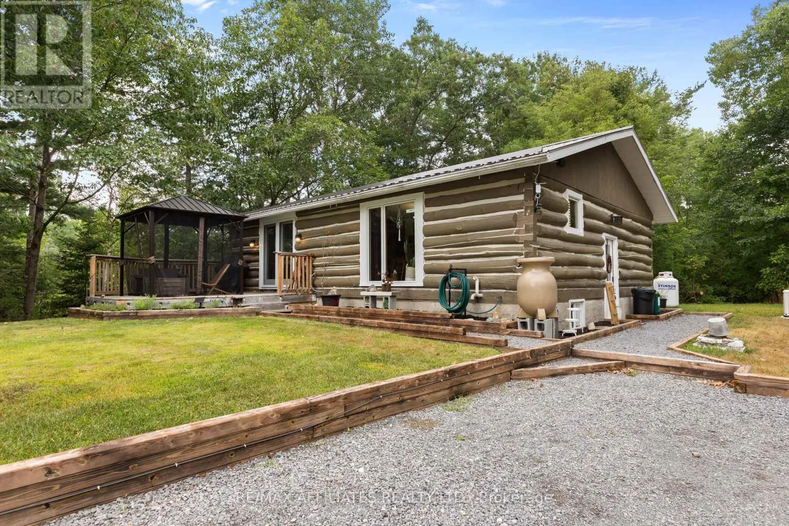 Cross Streets: Hwy 511 and French Line Rd. ** Directions: On Hwy 7 turn right onto Tatlock Rd, left onto Wolf Grove Rd, Turn right onto County Rd 511 and turn left onto the French Line. "There is no remedy for love but to love more." - Thoreau. One might say the same about country living: once you've had a taste of it, you'll only want more. Tucked on just over 11 acres of trees, trails, and endless fresh air, this 2-bedroom, 1 bath log bungalow is as charming as it is practical - an irresistible mix of rustic character and modern updates.From the outside, you'll notice the handiwork of Keeley Log (2023), where the home's logs were painstakingly refinished and rechinked - preserving that timeless warm aesthetic while ensuring decades of durability. Recent investments make this property worry-free: a metal roof (2021), furnace (2021), AC (2024), windows (2024/25), and a whole-home generator (2023) stand ready for peace of mind in all seasons. Starlink internet keeps you connected, though you might prefer to disconnect as you wander the private trails winding through your own forest - a foragers dreamscape of wild berries, mushrooms, and quiet discovery. Inside, the style is delightfully quirky, mixing the rustic backdrop of logs with thoughtful modern comforts. The kitchen, updated with induction cooktop, double oven, and 2024 appliances, invites both experimentation and family feasts. The unfinished basement, already boasting a walkout door, offers ample potential: imagine a guest suite, studio, or workshop carved into the space. Step outside to the deck, shaded with a gazebo. Out the back of the house, you overlook a backdrop of no rear neighbours - only the hush of nature. Two storage sheds and an oversized two-car detached garage (built c.2010) ensure room for tools, toys, and projects. This is not just a home but a lifestyle: woodsy solitude paired with comfort, adventure paired with ease. A place where you can follow a winding trail, then return to the glow of the log walls and the hum of modern convenience. (id:27476)
