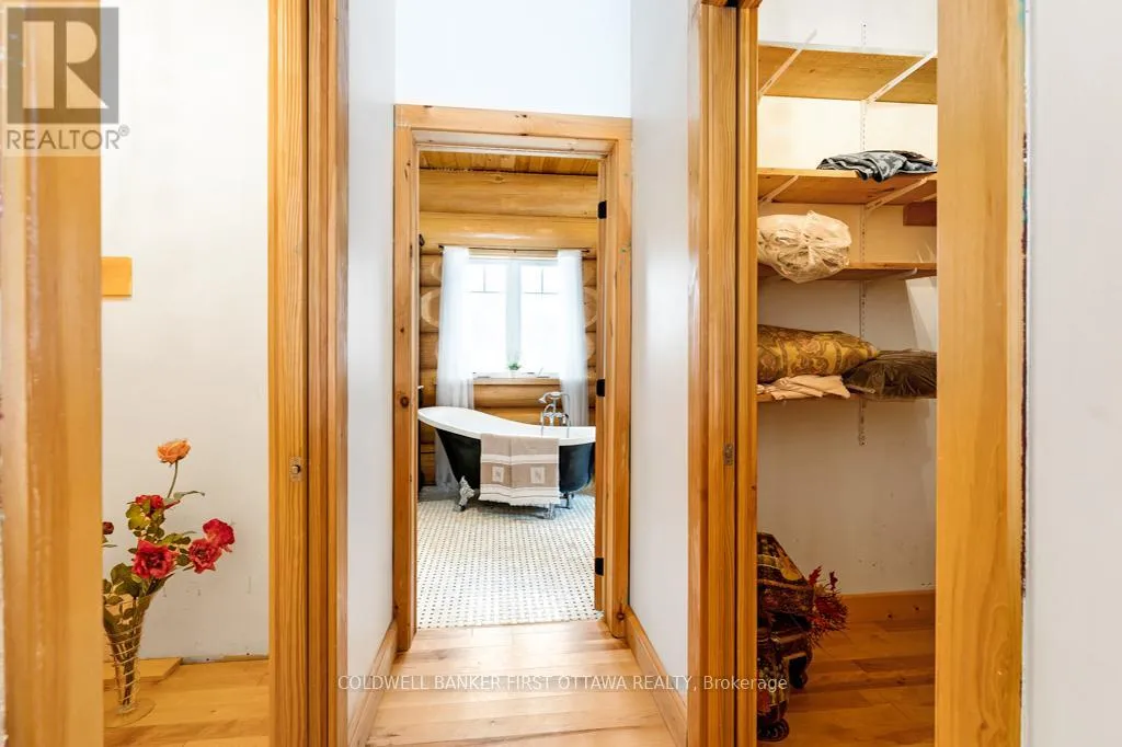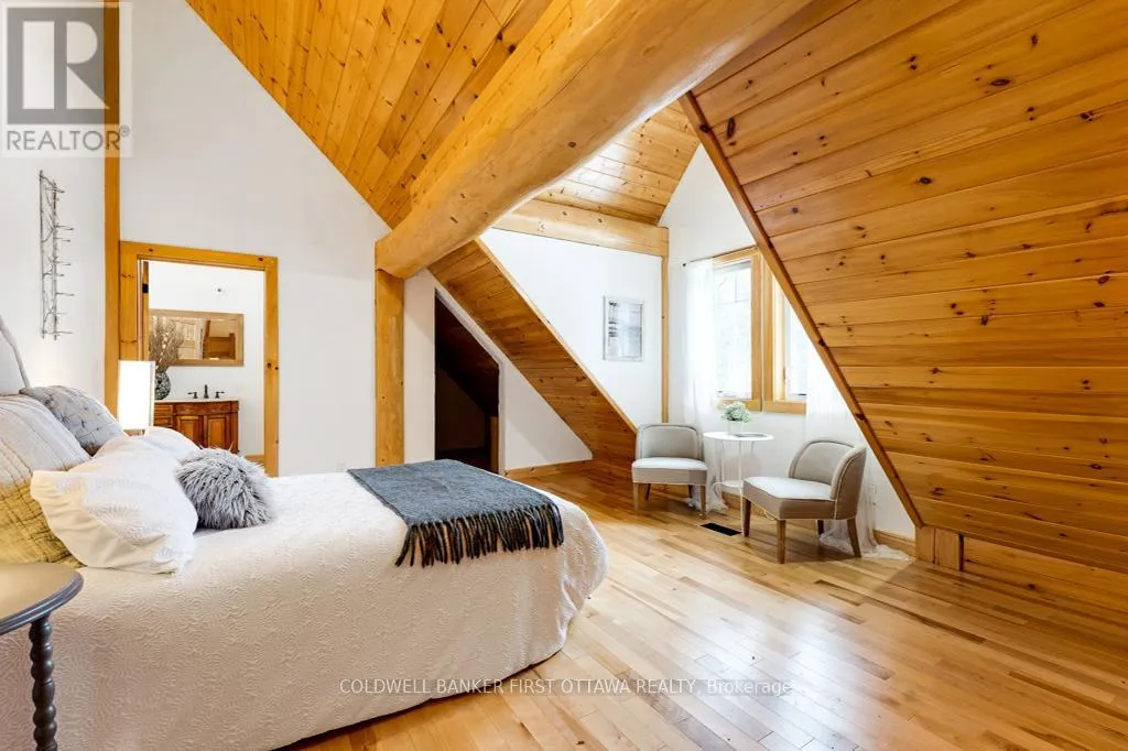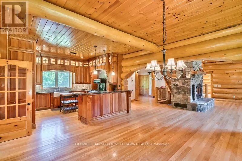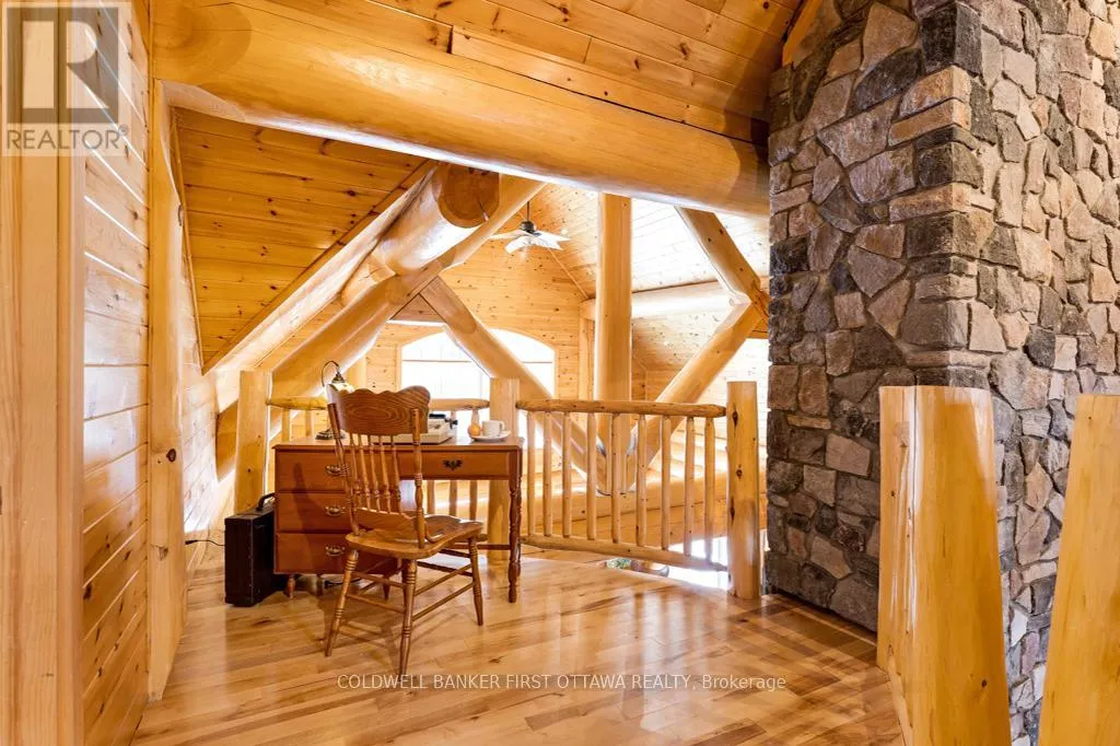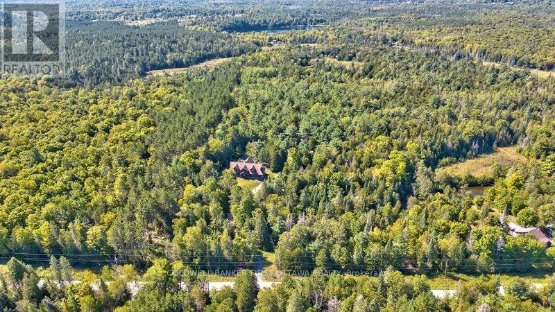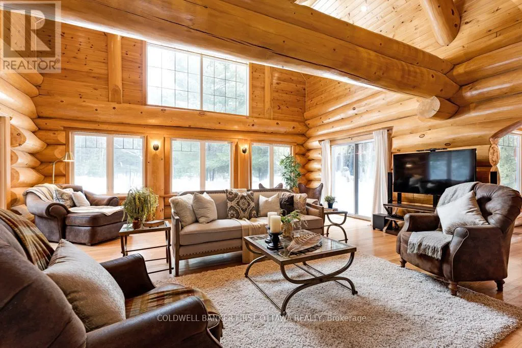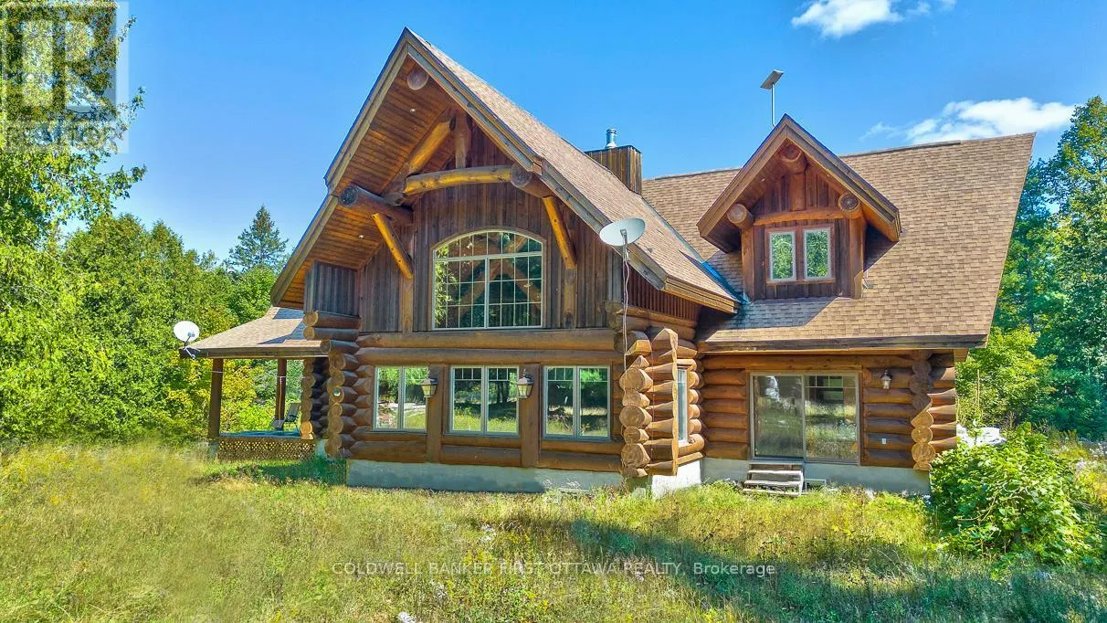 Cross Streets: Tatlock Road to Darling Road. ** Directions: From Ottawa, Hwy 417 West. Exit Almonte's March Rd. South on County Ro 49. Follow thru Almonte. Continue South on Wolf Grove Rd. At Union Hall, right on Tatlock Rd (County Rd 9). In Clayton, keep left on Tatlock Rd. Right Darling Rd to PIN 2467. It is so quiet on this 60 acres, you can hear the sound of crickets and songs of birds. The big beautiful sky has Canada geese flying back home and in the evening, starry galaxy. Tucked into all this beauty, quality built log home with amazing spaces. The huge 1ft diameter logs are an architectural marvel, adding solid character. The 4 bedroom, 4 bathroom home has easy flow layout, soaring ceilings, walls of windows with deep sills and floors of select-ash hardwood plus ceramic tile. Front foyer welcomes you with dramatic 22' high ceiling and dream walk-in closet. Great Room showcases majestic two-storey cultured stone fireplace and impressive cathedral ceiling with honey-hued, light-reflecting, beams. Expansive dining room connects Great Room to kitchen and has door to covered verandah. Exquisite kitchen a culinary delight with phenomenal select-cherry cabinetry, Cambria quartz counters, breakfast bar and deep window sills. Added design feature is refrigerator being integrated into the cabinetry. Modern Elmira cookstove makes food prep easier with its four propane burners, three electric burners and electric oven. Main floor generous primary suite offers two walk-in closets and patio doors to the great outdoors; spa 5-piece ensuite has marble floor, marble counters on the two teak vanities, large deep soaker tub and glass shower. On other side of the home is the family-sized mudroom with easy-clean ceramic tile floor, oversized closet and laundry station. Main floor also has powder room. Log staircase leads to second floor landing with flex space. Two extra-large bedrooms share 5-piece Jack & Jill bathroom. Fourth bedroom includes luxury 5-piece ensuite. Outside, the yard provides lots of space for gardening & play. The bunkie need some finishing for guests or, possible studio. The forest backs onto Indian River where, depending on the season, you can canoe to Robbs Lake. Hi-speed & cell service. On township maintained road, 25 mins to Almonte. 45 mins Kanata. (id:27476)