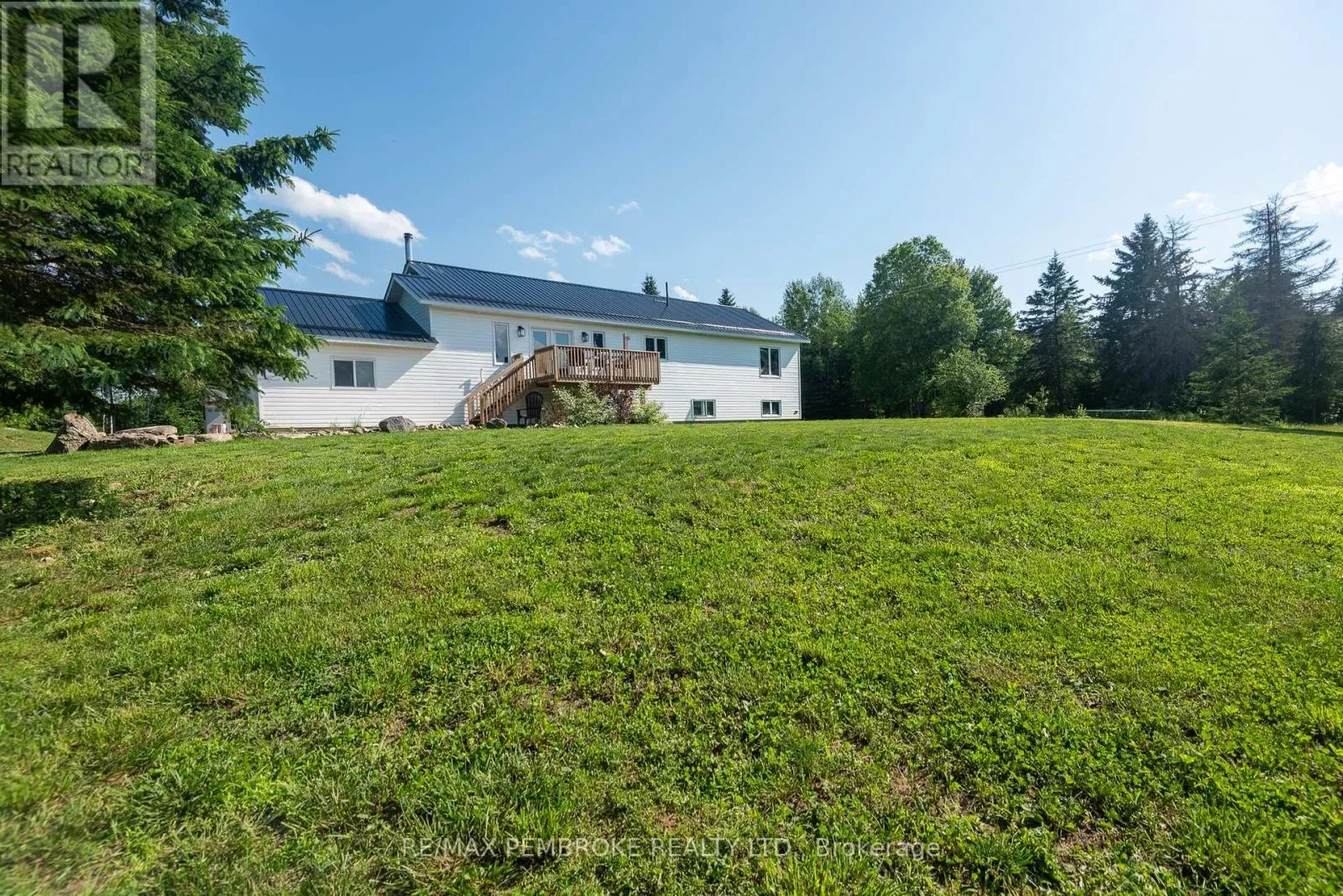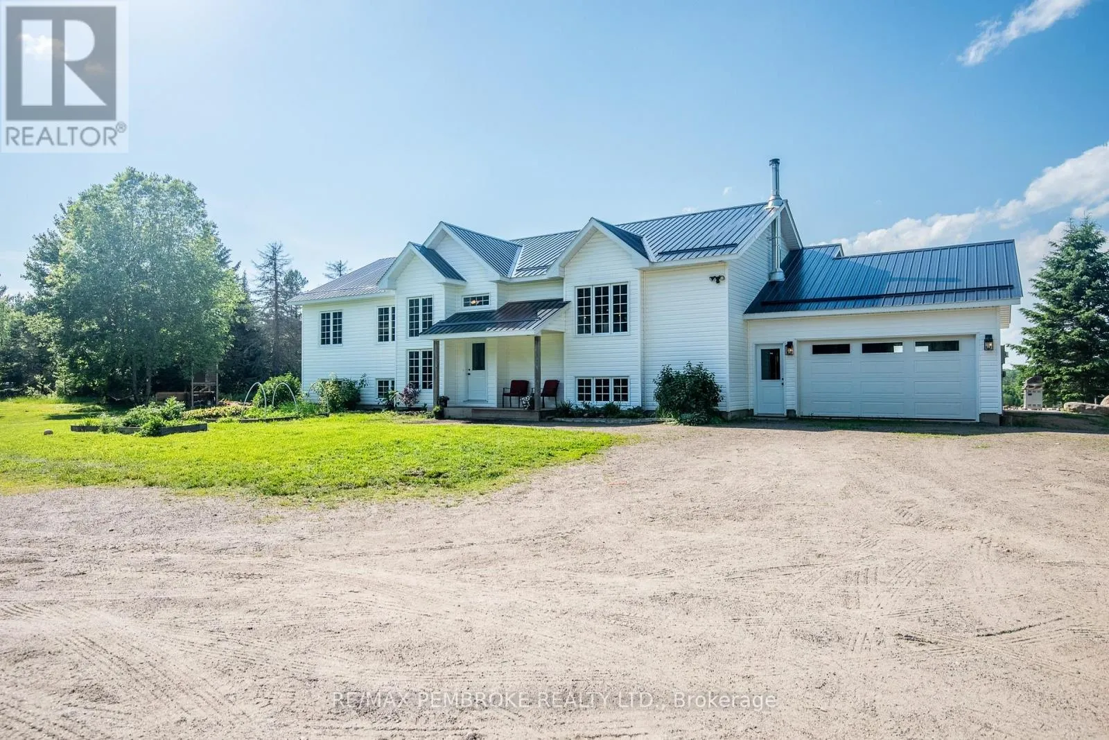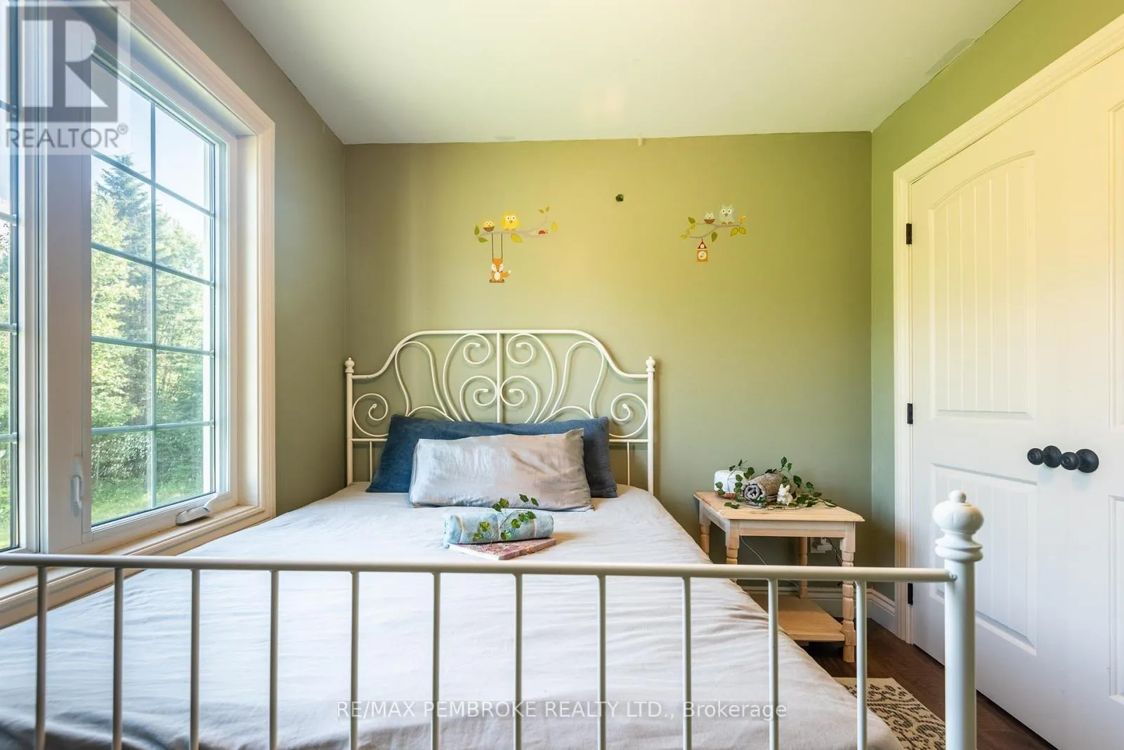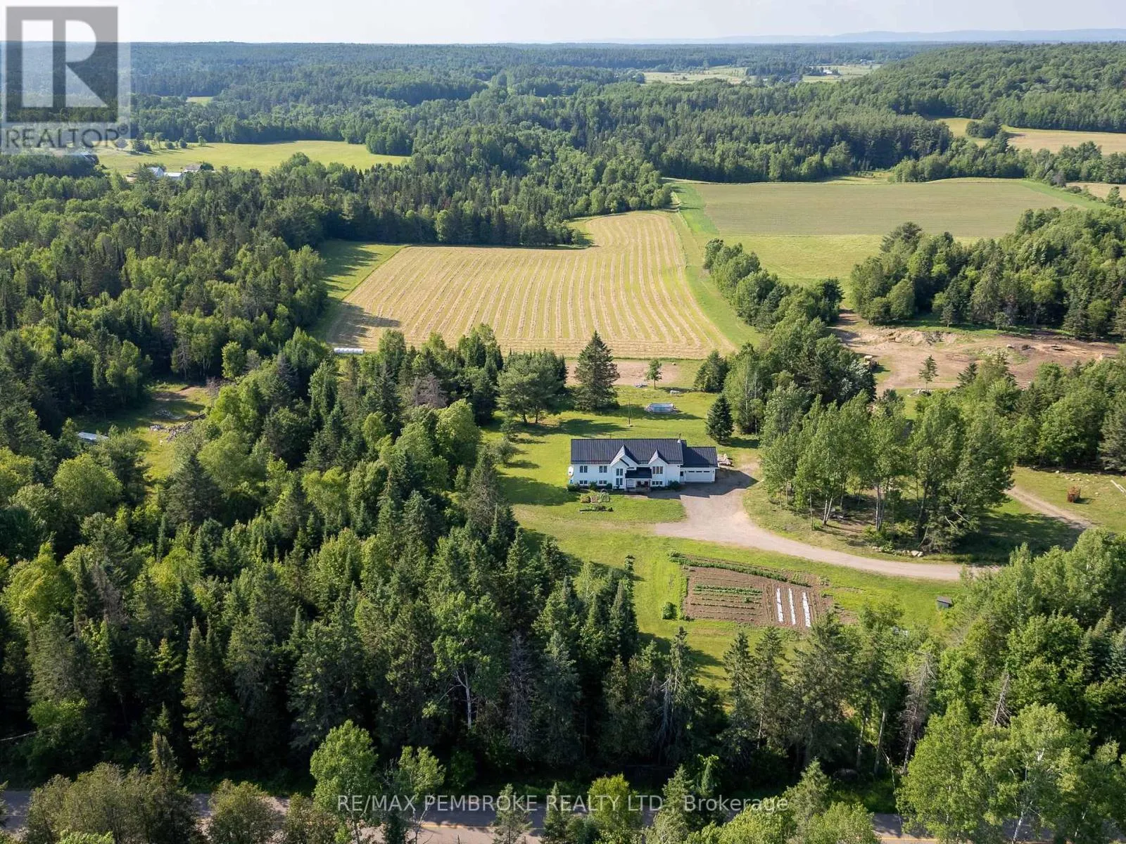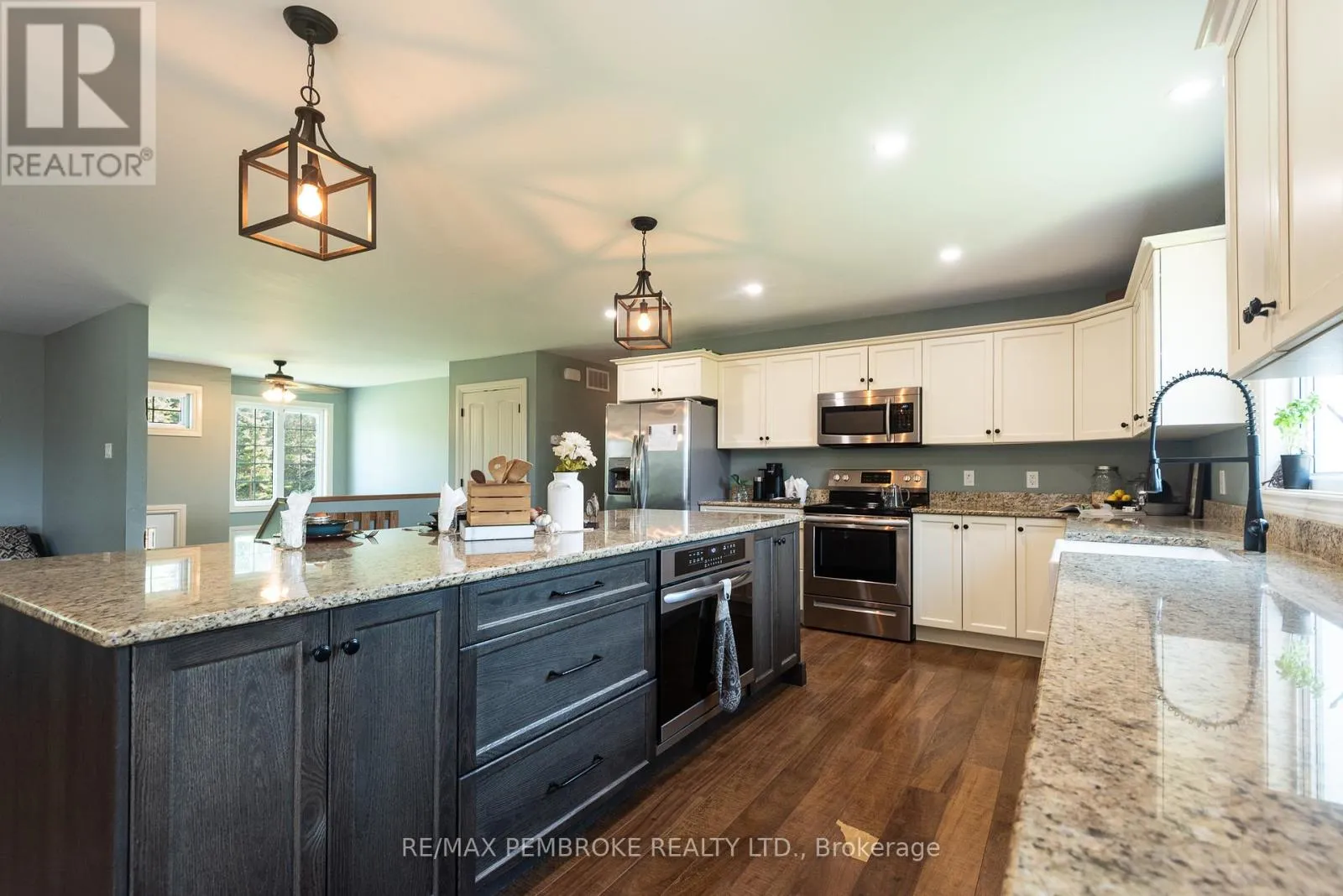 Cross Streets: Doran and Round Lake. ** Directions: Round Lake Rd to Doran to Sandy Beach. This custom built home sits on a picturesque, three acre parcel of land surrounded by fields, on a quiet country road; a quick 15 minute drive to Petawawa or Pembroke, and short commute to Highway 17. The raised ranch design welcomes you with a spacious foyer and ample natural light. The upper level boasts a custom kitchen by Sylvestre's, with modern cream cabinetry and contrasting island that seats six, has a built in second oven, and offers an abundance of prep space with natural granite countertops, and an apron front sink overlooking the rear yard. You have access to the deck and yard, as well as the attached garage from the main floor. Also on this level you will find a spacious primary bedroom with cheater ensuite and walk in closet, and two additional bedrooms. The lower level offers an expansive family room with wood fireplace, two more bedrooms, full bathroom, large finished laundry room and a utility room with lots of space for hobbies. 48 hour irrevocable on any Offer (id:27476)