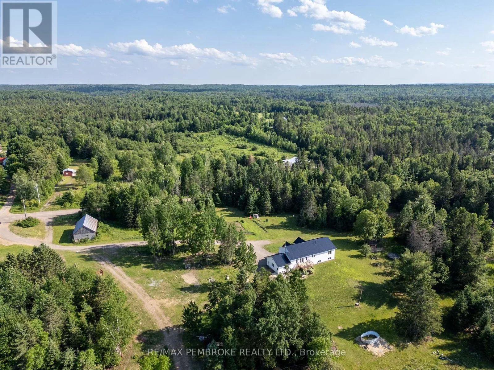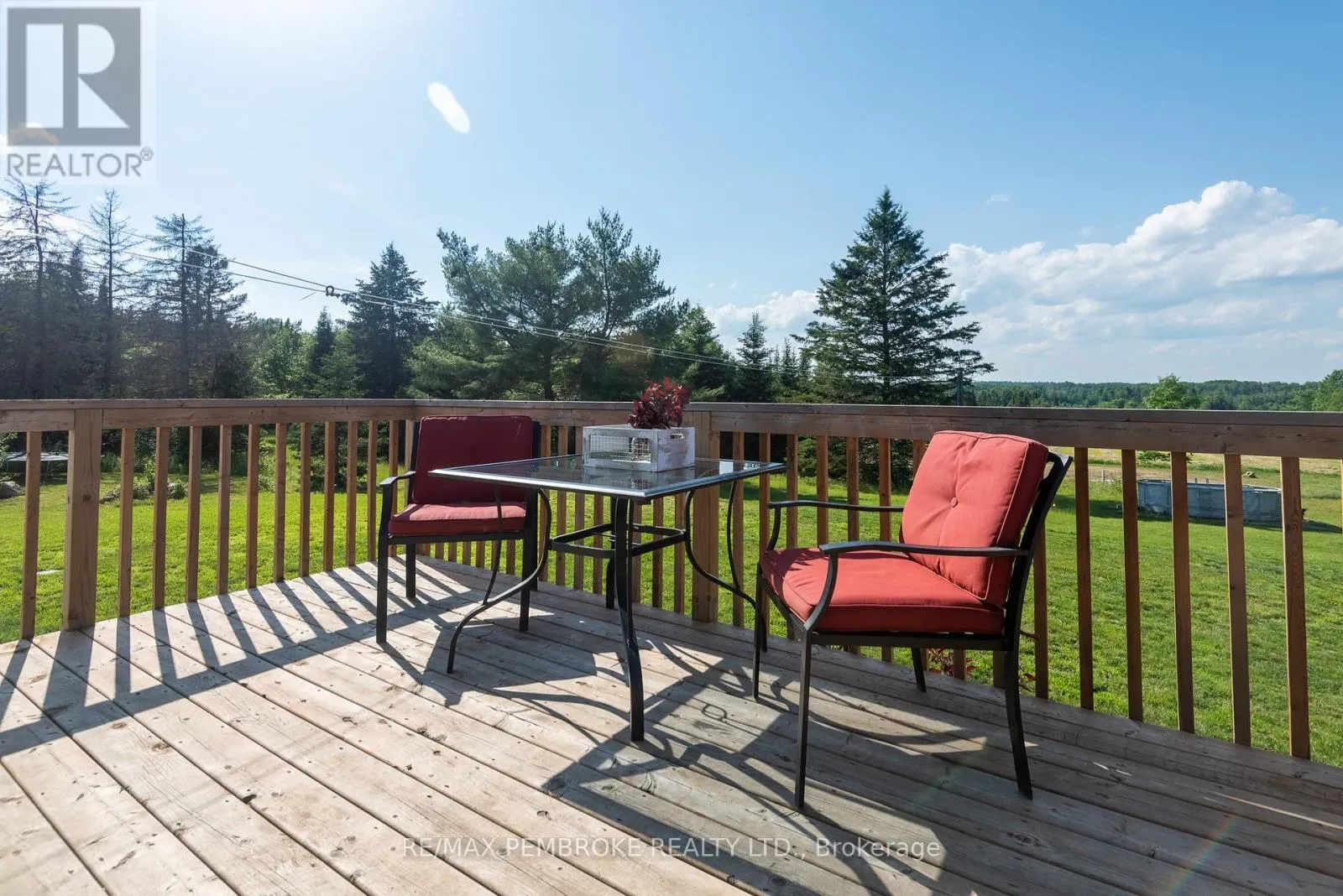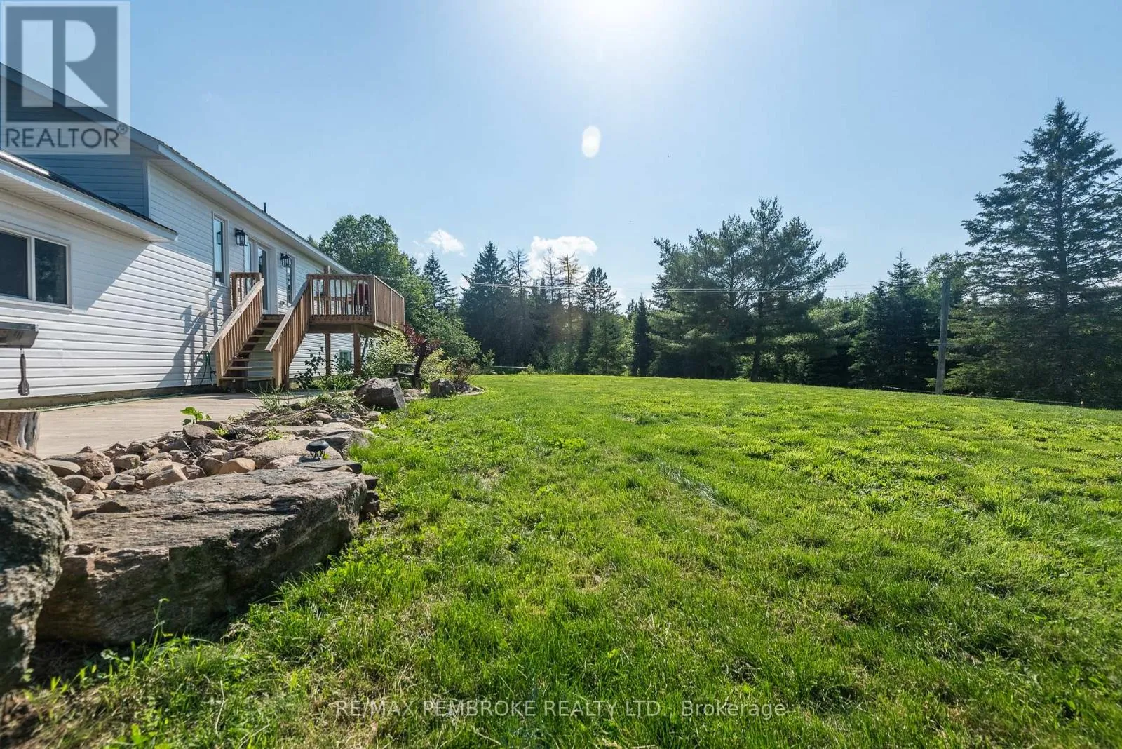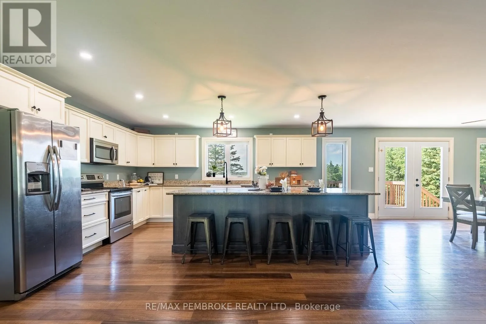 Cross Streets: Doran and Round Lake. ** Directions: Round Lake Rd to Doran to Sandy Beach. This custom built home sits on a picturesque, three acre parcel of land surrounded by fields, on a quiet country road; a quick 15 minute drive to Petawawa or Pembroke, and short commute to Highway 17. The raised ranch design welcomes you with a spacious foyer and ample natural light. The upper level boasts a custom kitchen by Sylvestre's, with modern cream cabinetry and contrasting island that seats six, has a built in second oven, and offers an abundance of prep space with natural granite countertops, and an apron front sink overlooking the rear yard. You have access to the deck and yard, as well as the attached garage from the main floor. Also on this level you will find a spacious primary bedroom with cheater ensuite and walk in closet, and two additional bedrooms. The lower level offers an expansive family room with wood fireplace, two more bedrooms, full bathroom, large finished laundry room and a utility room with lots of space for hobbies. 48 hour irrevocable on any Offer (id:27476)