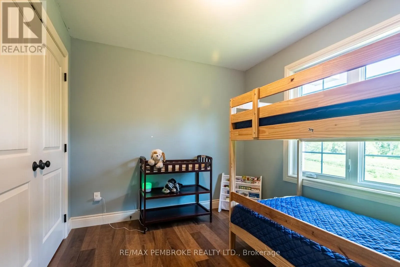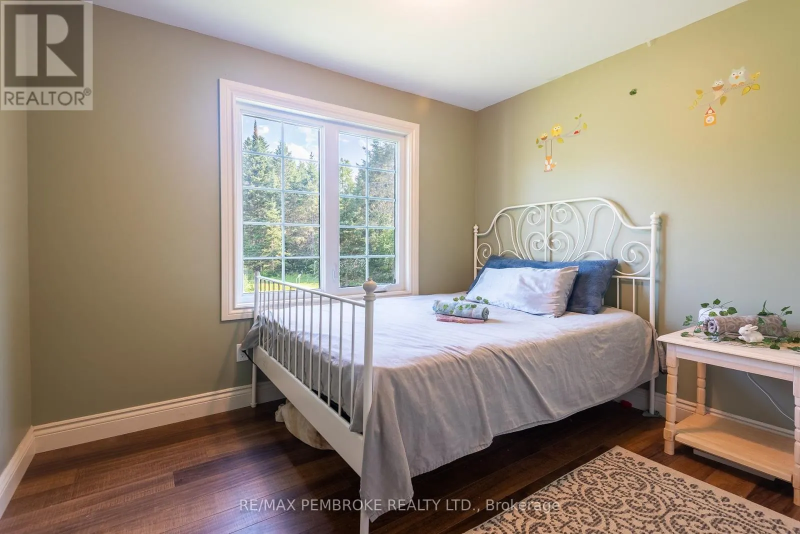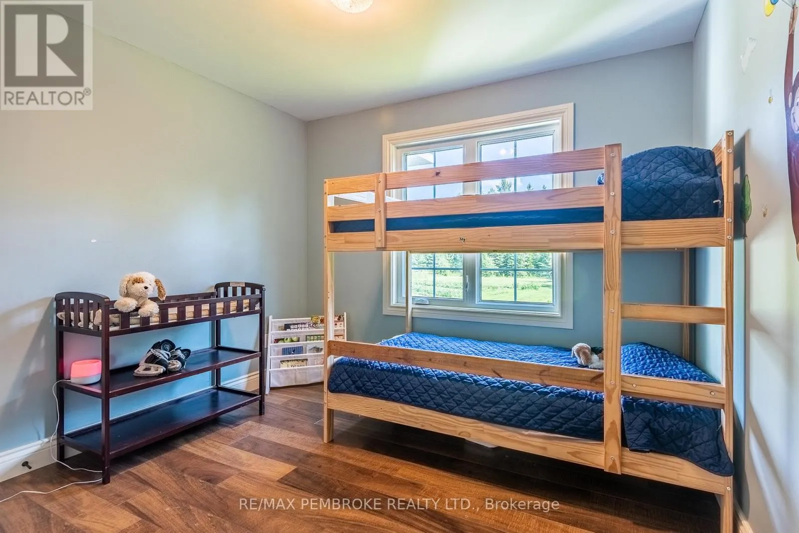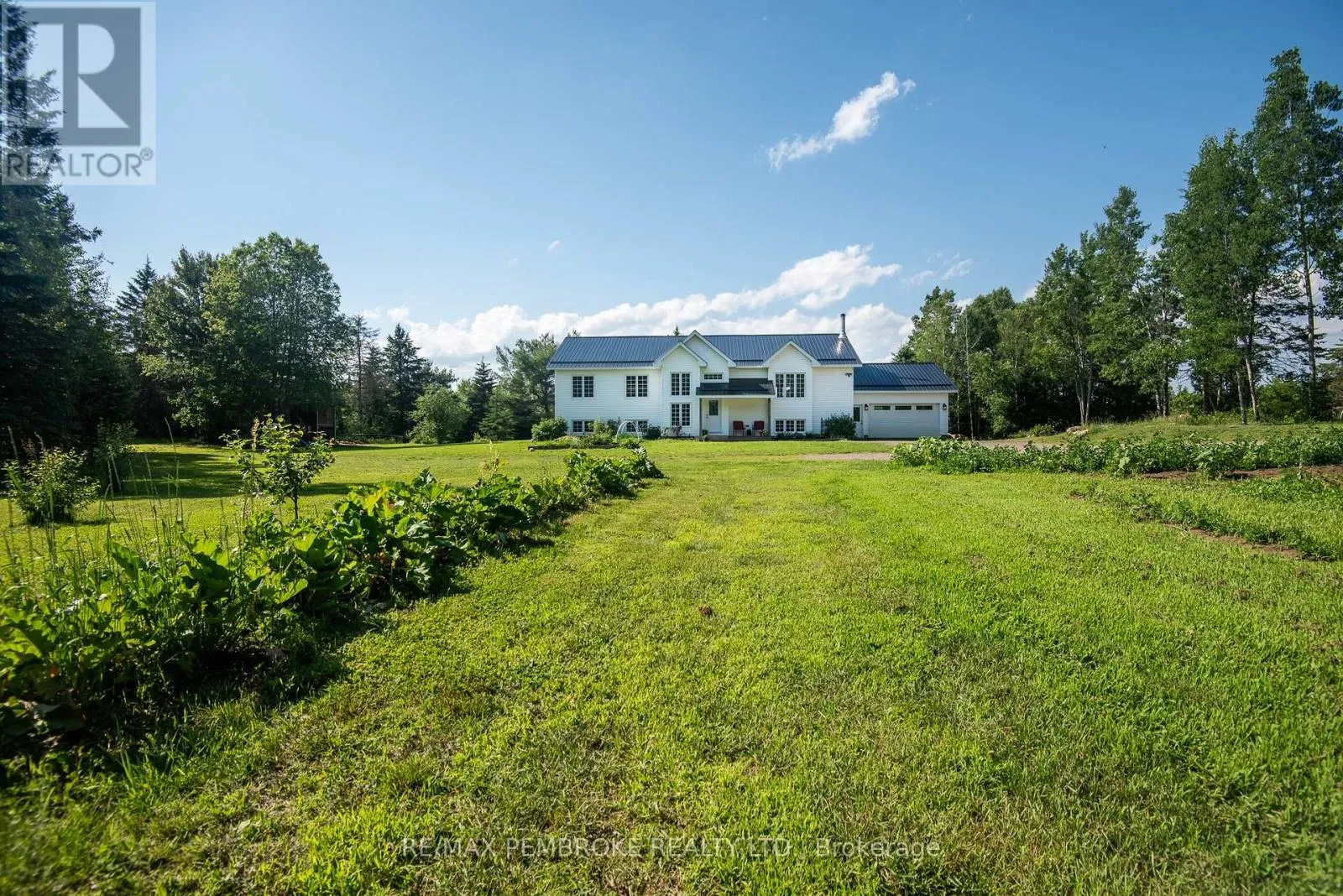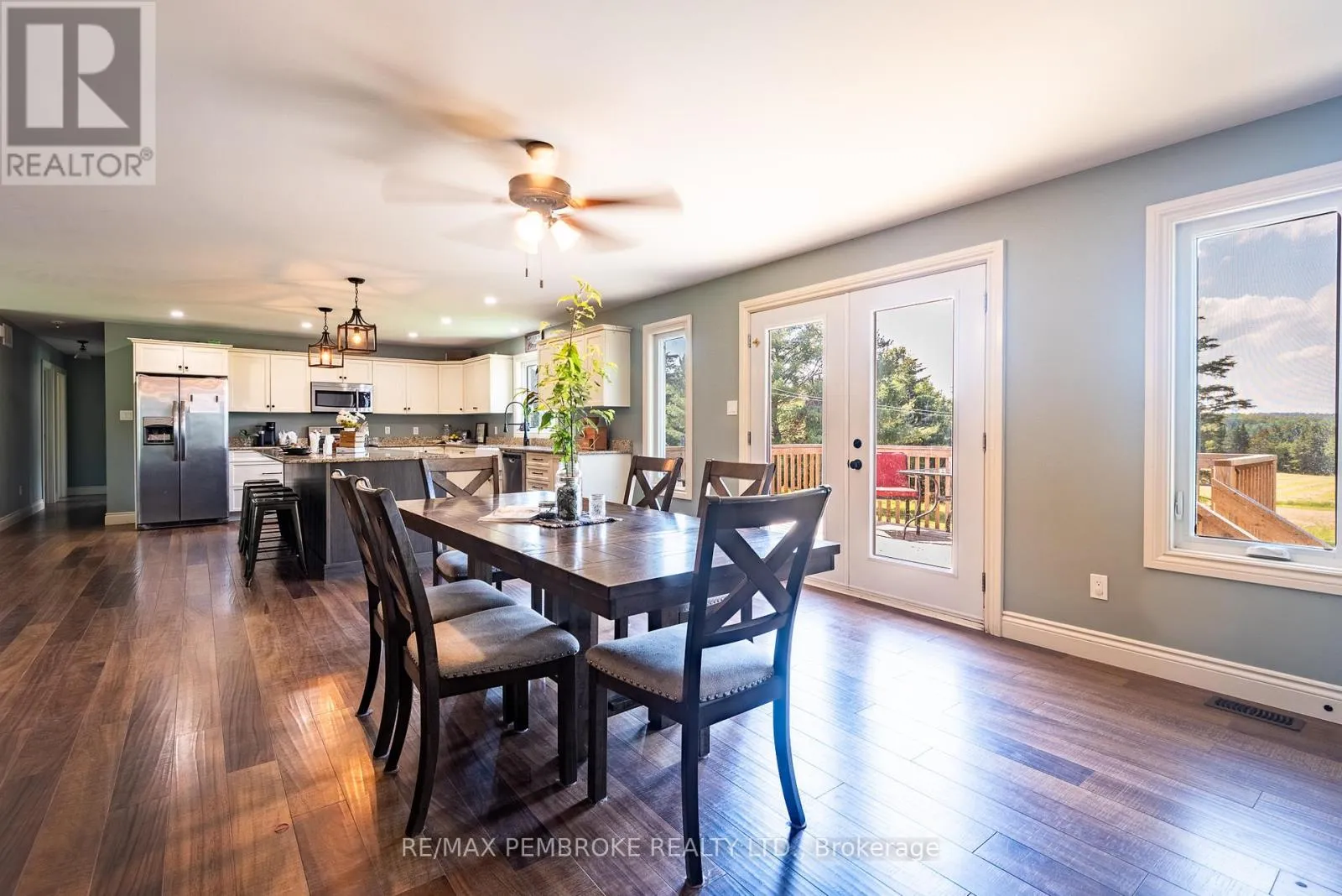 Cross Streets: Doran and Round Lake. ** Directions: Round Lake Rd to Doran to Sandy Beach. This custom built home sits on a picturesque, three acre parcel of land surrounded by fields, on a quiet country road; a quick 15 minute drive to Petawawa or Pembroke, and short commute to Highway 17. The raised ranch design welcomes you with a spacious foyer and ample natural light. The upper level boasts a custom kitchen by Sylvestre's, with modern cream cabinetry and contrasting island that seats six, has a built in second oven, and offers an abundance of prep space with natural granite countertops, and an apron front sink overlooking the rear yard. You have access to the deck and yard, as well as the attached garage from the main floor. Also on this level you will find a spacious primary bedroom with cheater ensuite and walk in closet, and two additional bedrooms. The lower level offers an expansive family room with wood fireplace, two more bedrooms, full bathroom, large finished laundry room and a utility room with lots of space for hobbies. 48 hour irrevocable on any Offer (id:27476)