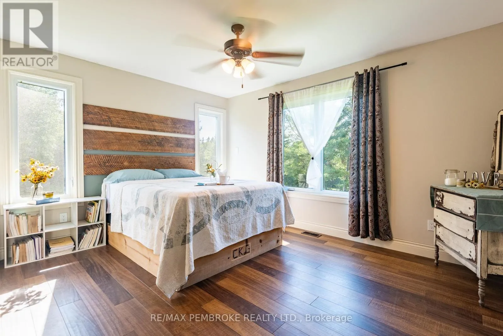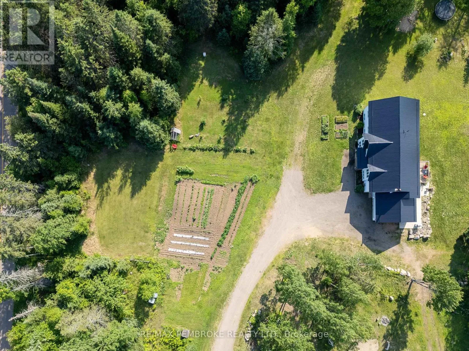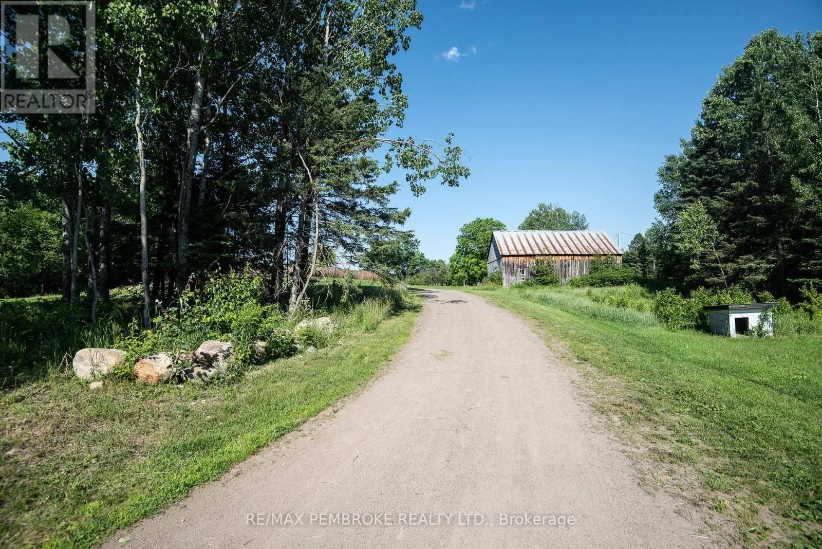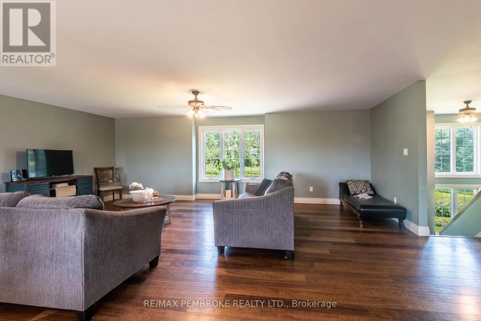 Cross Streets: Doran and Round Lake. ** Directions: Round Lake Rd to Doran to Sandy Beach. This custom built home sits on a picturesque, three acre parcel of land surrounded by fields, on a quiet country road; a quick 15 minute drive to Petawawa or Pembroke, and short commute to Highway 17. The raised ranch design welcomes you with a spacious foyer and ample natural light. The upper level boasts a custom kitchen by Sylvestre's, with modern cream cabinetry and contrasting island that seats six, has a built in second oven, and offers an abundance of prep space with natural granite countertops, and an apron front sink overlooking the rear yard. You have access to the deck and yard, as well as the attached garage from the main floor. Also on this level you will find a spacious primary bedroom with cheater ensuite and walk in closet, and two additional bedrooms. The lower level offers an expansive family room with wood fireplace, two more bedrooms, full bathroom, large finished laundry room and a utility room with lots of space for hobbies. 48 hour irrevocable on any Offer (id:27476)