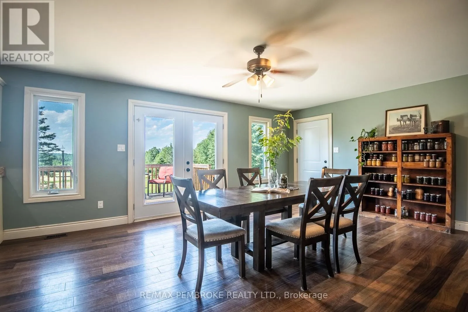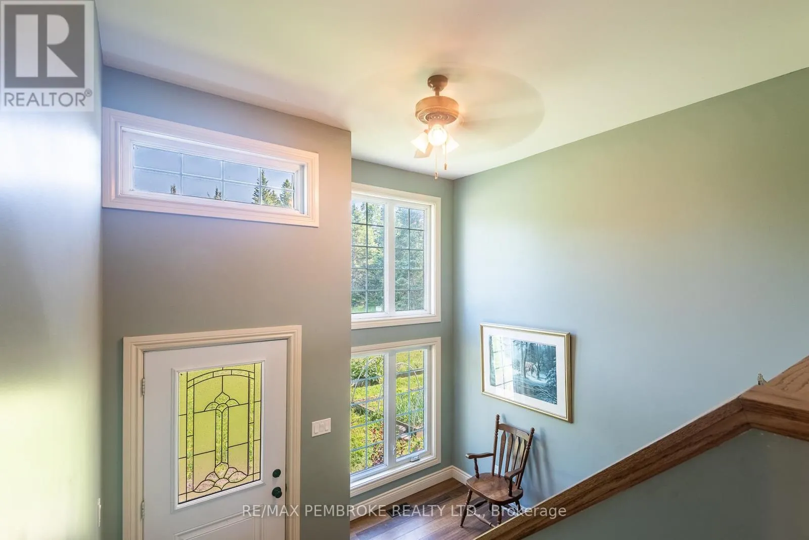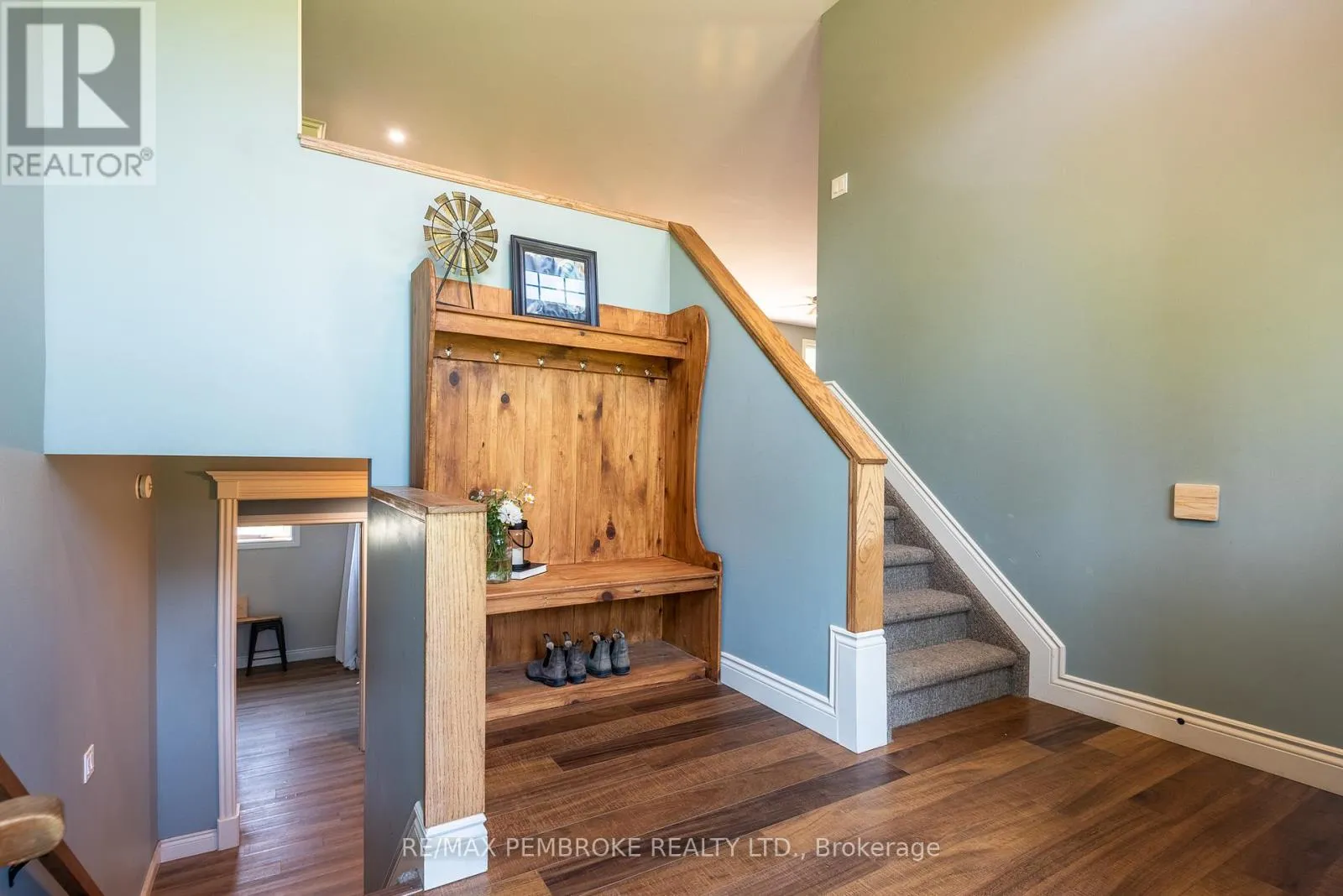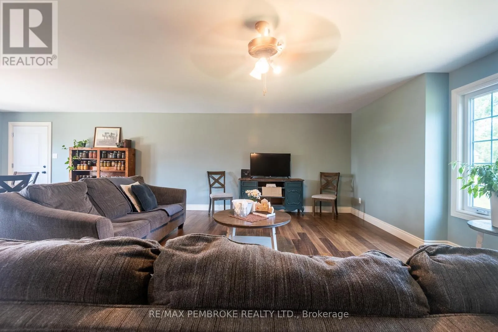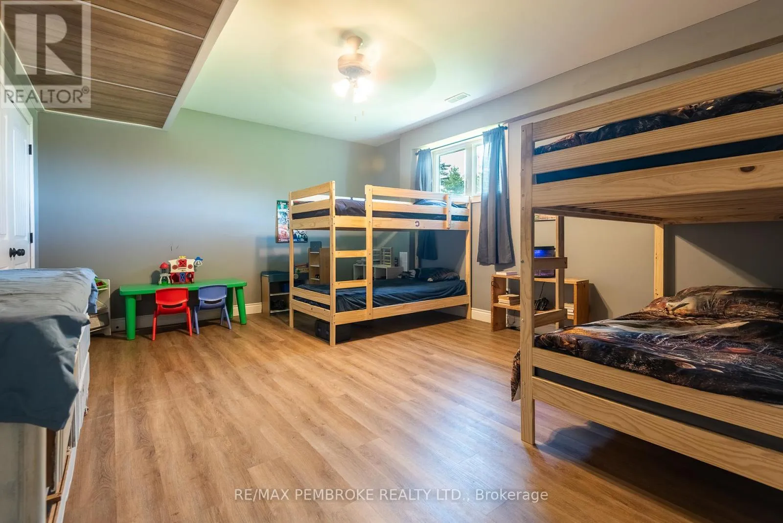 Cross Streets: Doran and Round Lake. ** Directions: Round Lake Rd to Doran to Sandy Beach. This custom built home sits on a picturesque, three acre parcel of land surrounded by fields, on a quiet country road; a quick 15 minute drive to Petawawa or Pembroke, and short commute to Highway 17. The raised ranch design welcomes you with a spacious foyer and ample natural light. The upper level boasts a custom kitchen by Sylvestre's, with modern cream cabinetry and contrasting island that seats six, has a built in second oven, and offers an abundance of prep space with natural granite countertops, and an apron front sink overlooking the rear yard. You have access to the deck and yard, as well as the attached garage from the main floor. Also on this level you will find a spacious primary bedroom with cheater ensuite and walk in closet, and two additional bedrooms. The lower level offers an expansive family room with wood fireplace, two more bedrooms, full bathroom, large finished laundry room and a utility room with lots of space for hobbies. 48 hour irrevocable on any Offer (id:27476)
