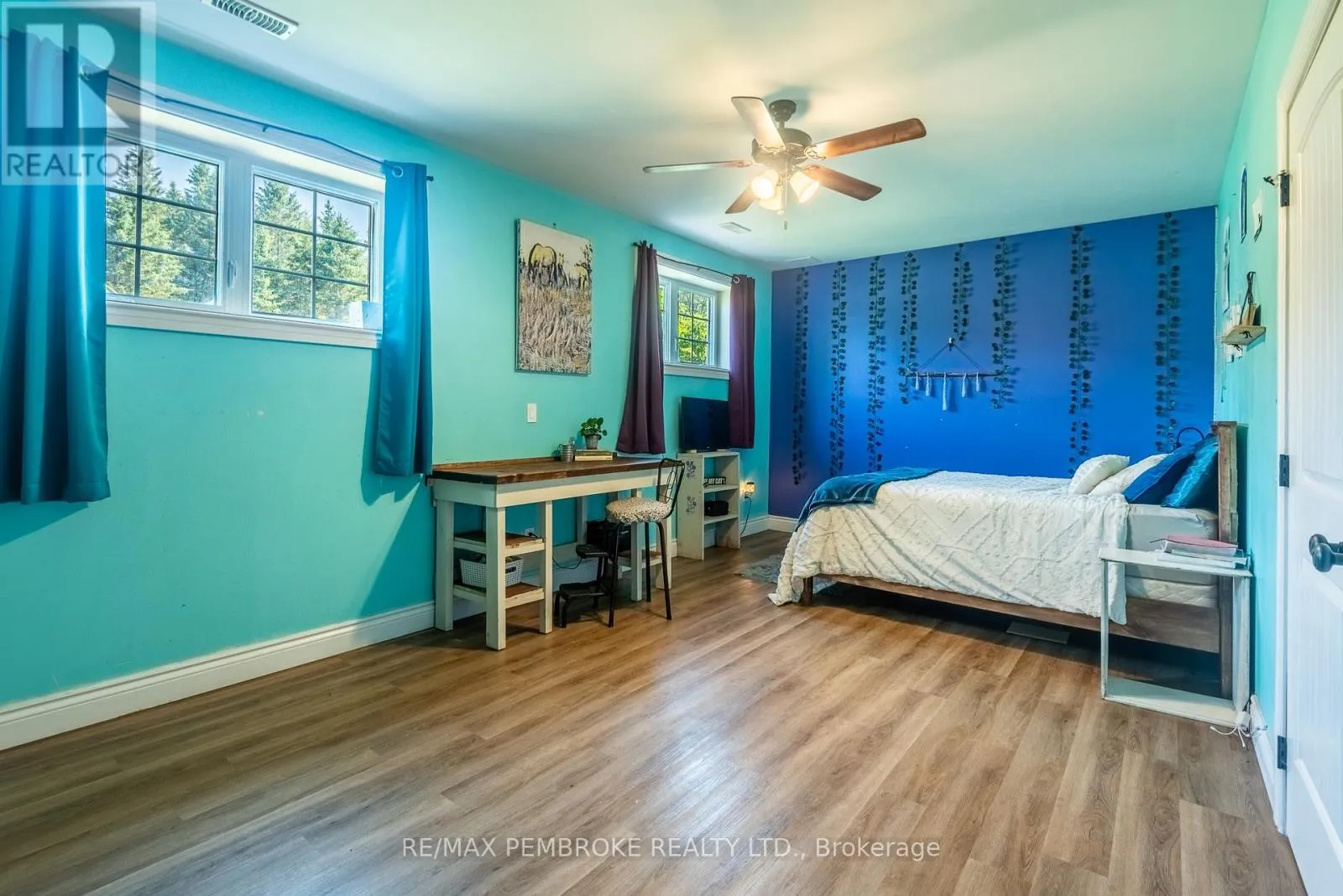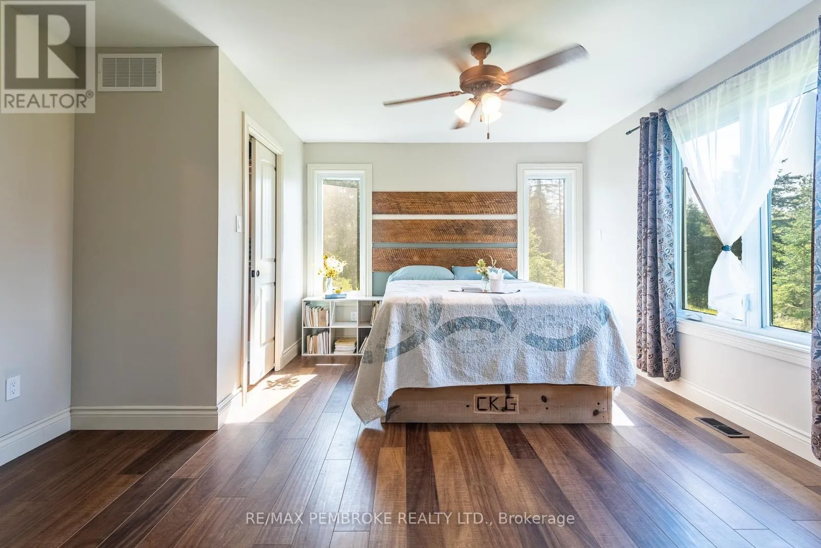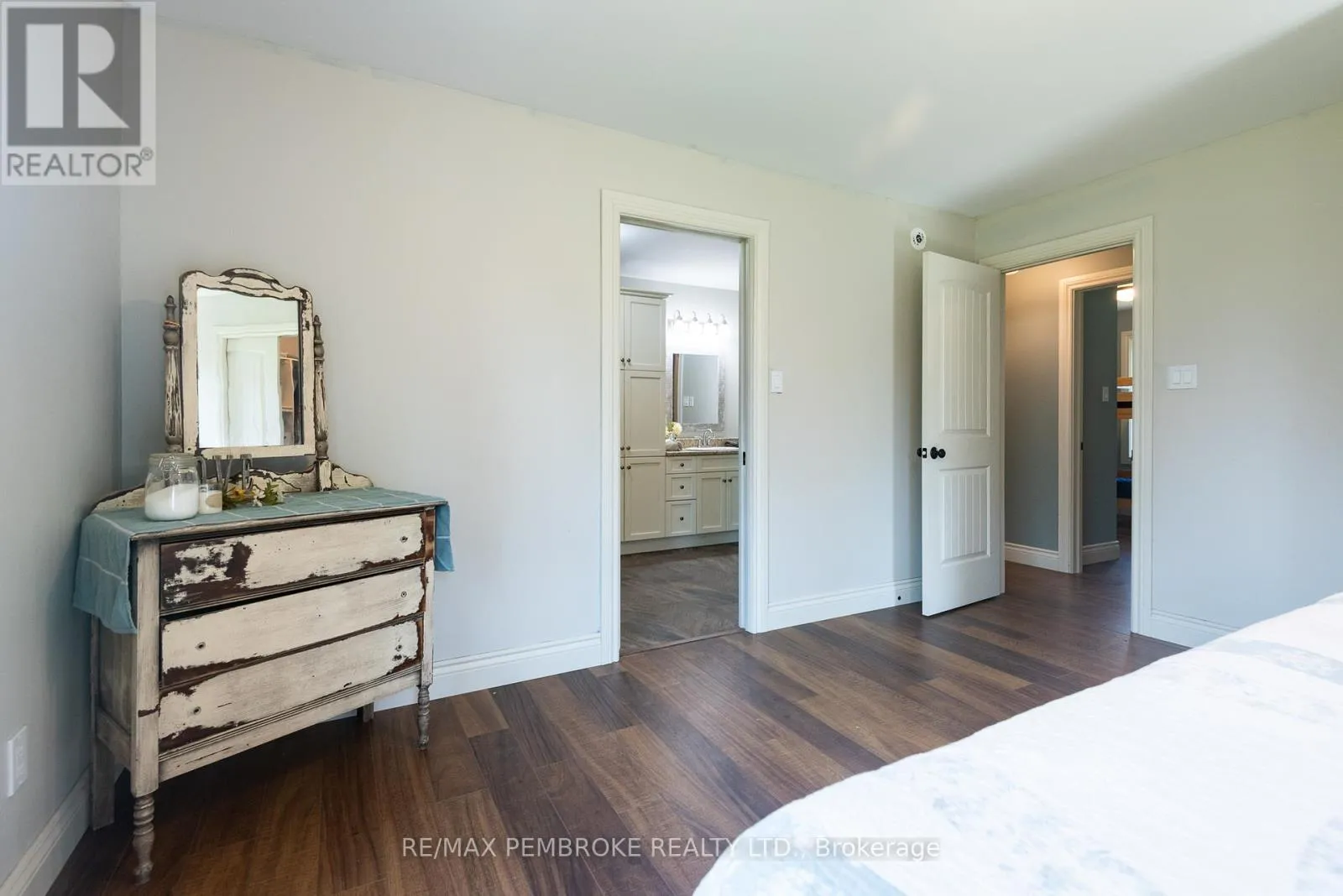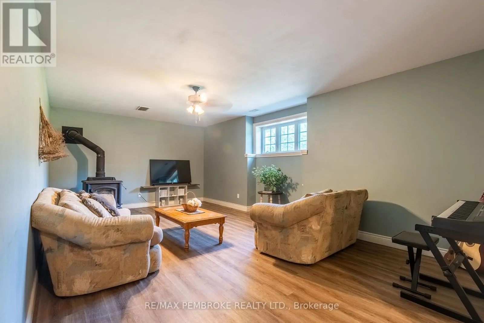 Cross Streets: Doran and Round Lake. ** Directions: Round Lake Rd to Doran to Sandy Beach. This custom built home sits on a picturesque, three acre parcel of land surrounded by fields, on a quiet country road; a quick 15 minute drive to Petawawa or Pembroke, and short commute to Highway 17. The raised ranch design welcomes you with a spacious foyer and ample natural light. The upper level boasts a custom kitchen by Sylvestre's, with modern cream cabinetry and contrasting island that seats six, has a built in second oven, and offers an abundance of prep space with natural granite countertops, and an apron front sink overlooking the rear yard. You have access to the deck and yard, as well as the attached garage from the main floor. Also on this level you will find a spacious primary bedroom with cheater ensuite and walk in closet, and two additional bedrooms. The lower level offers an expansive family room with wood fireplace, two more bedrooms, full bathroom, large finished laundry room and a utility room with lots of space for hobbies. 48 hour irrevocable on any Offer (id:27476)