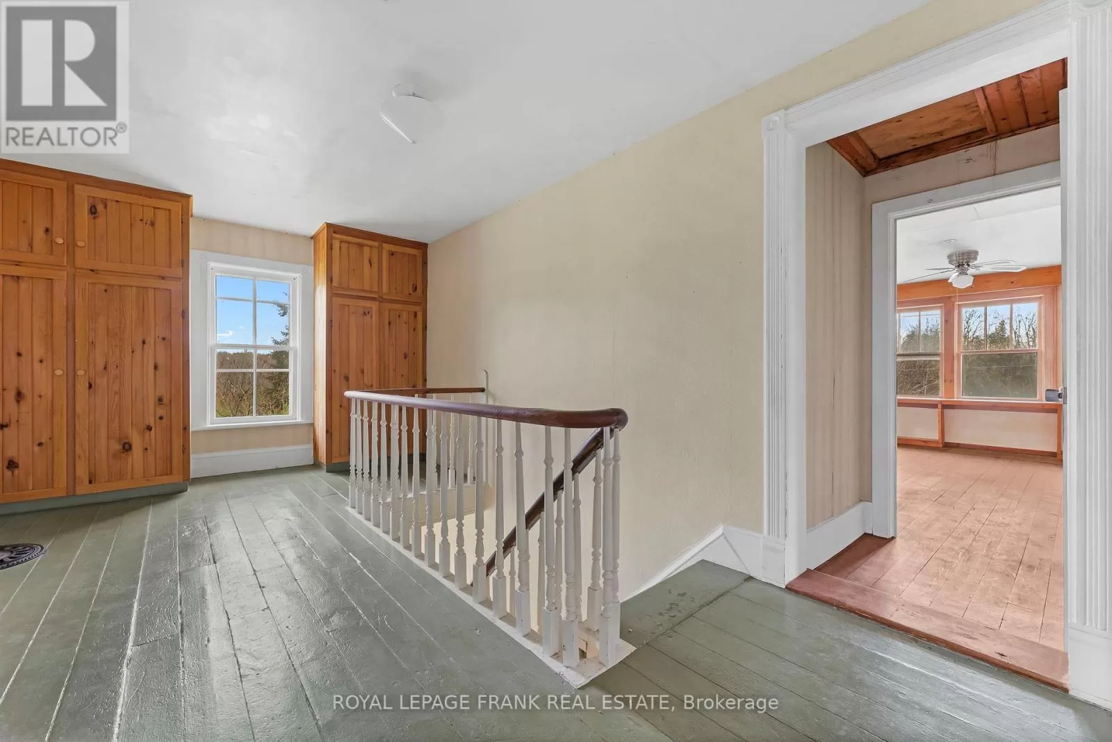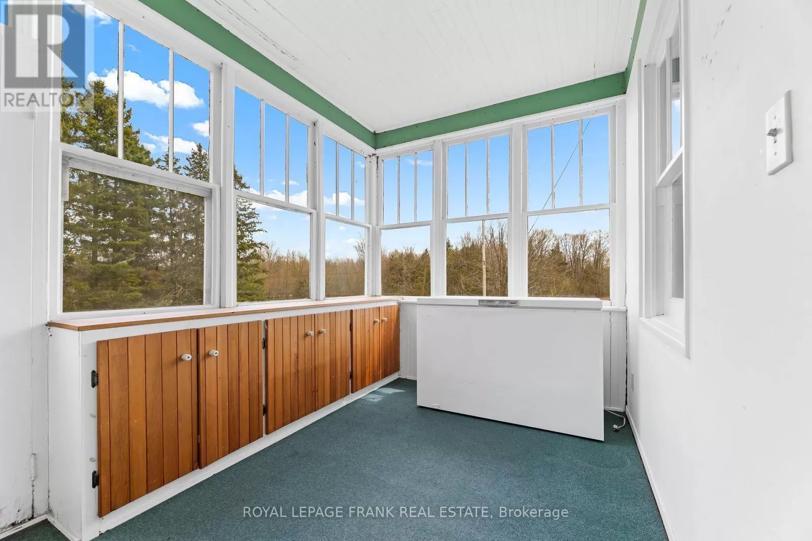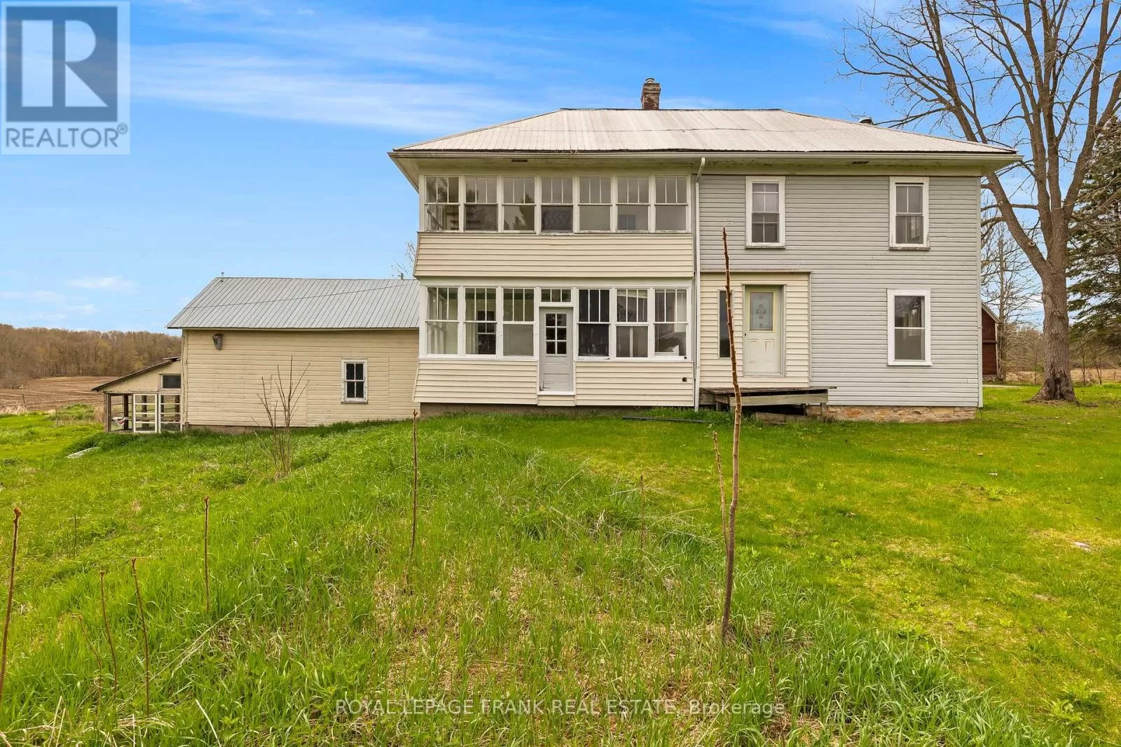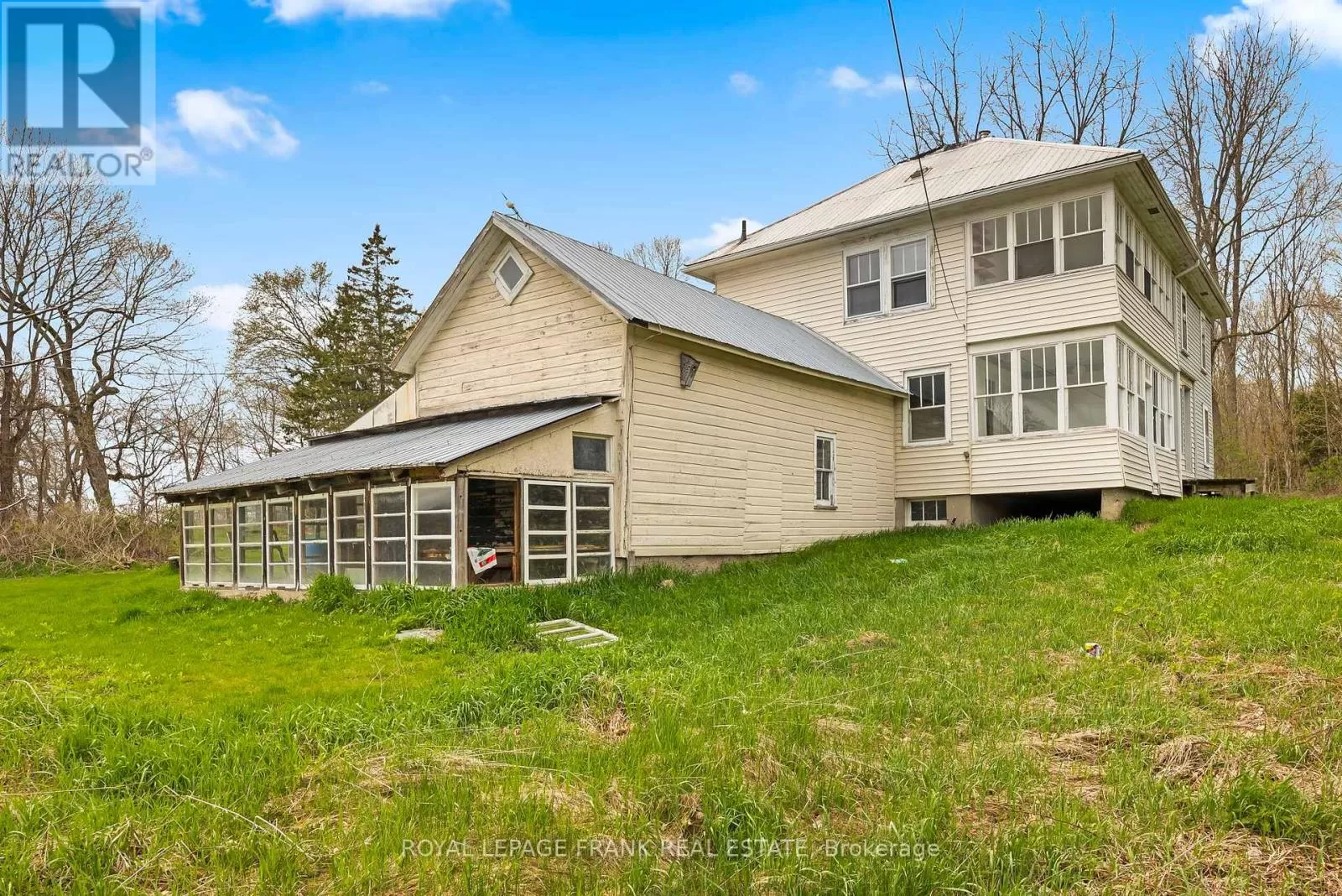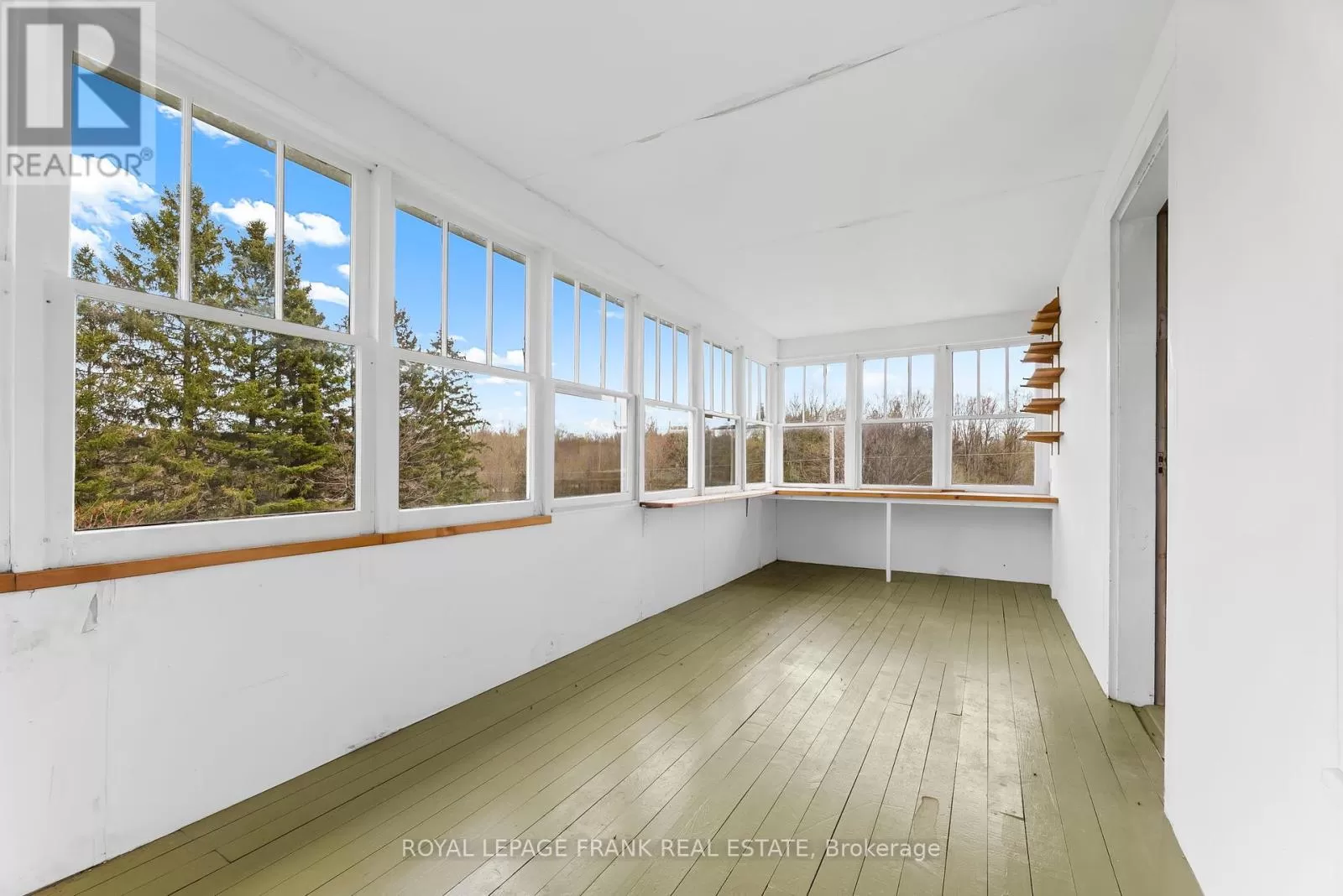 Cross Streets: COUNTY RD 32 WEST SIDE NORTH OF 401). ** Directions: NORTH FROM 401 ON HWY 32 (COUNTY RD 32) ON LEFT SIDE. A peaceful rural escape awaits you in Seeleys Bay, nestled on approx. 70 scenic acres. This two-storey farmhouse offers a wonderful blend of comfort, character, and outdoor freedom. Step onto the inviting front porch and feel instantly at ease this is a place where mornings begin with coffee and birdsong. Inside, the main level welcomes you with wood floors, an expansive, bright, eat-in kitchen ideal for casual meals or catching up with family. The main principal room has beautiful hardwood floors, is large enough to host the whole extended family for dinner, or set it up as a large living room? Ambiance abounds with a wood stove and adjacent cozy den/living room/study- a quiet place to unwind, relax with a good book or great conversations. There is also a rough-in for a small bathroom. The sunroom and convenient main floor laundry adds everyday ease. The huge wall to wall windows bring in the sunshine and serenity of the outdoors Upstairs, there are three comfortable bedrooms, a fourth or den, two bathrooms, that could serve creative space, or an extra bedroom. Another light-filled sunroom on this level offers picturesque views and a tranquil spot to recharge. It could also be your home office or studio! Outside, theres room to roam meadows, mature trees, trails, fields to grow, several useful outbuildings, (a barn, chicken coops, drive shed, silo). Whether you're dreaming of gardens, hobby farming, or just breathing in fresh country air, this property offers a true connection to nature. A detached garage provides great storage for tools, toys, or weekend projects. This home has been filled with laughter and love and offers the kind of peace and privacy that's becoming harder to find. Whether you're settling in full-time or searching for a weekend getaway, this special property is ready to welcome you home. The farmable acreage has been maintained by a local farmer and used to grow hay, soybeans, corn and oats. Back Deck is approx 27'4" (8.35 m) x 7'3"(2.23 m) (id:27476)