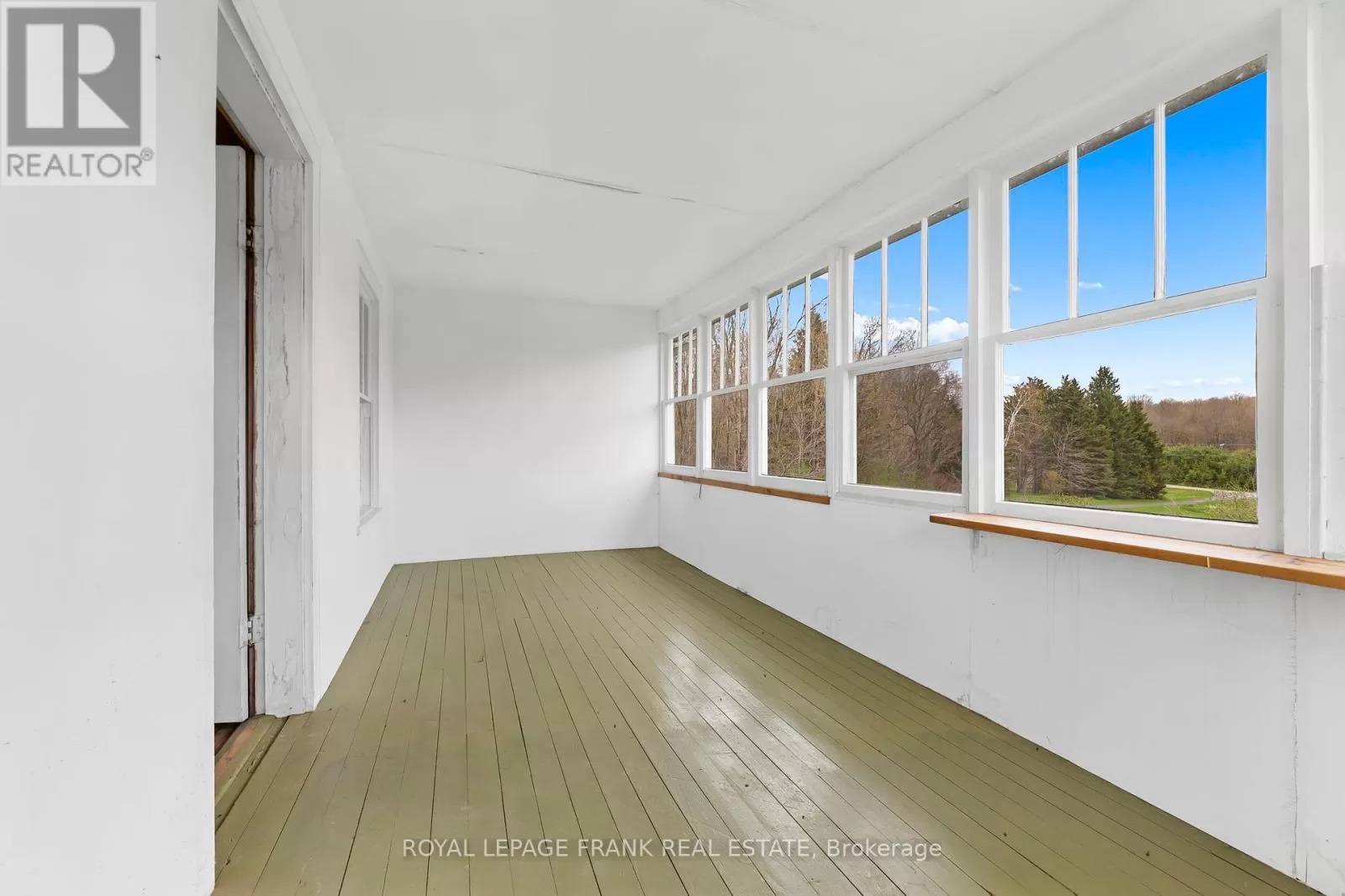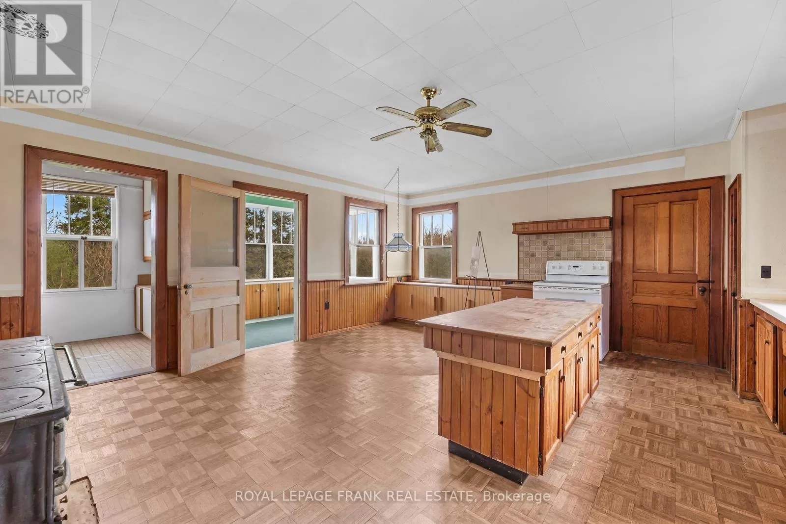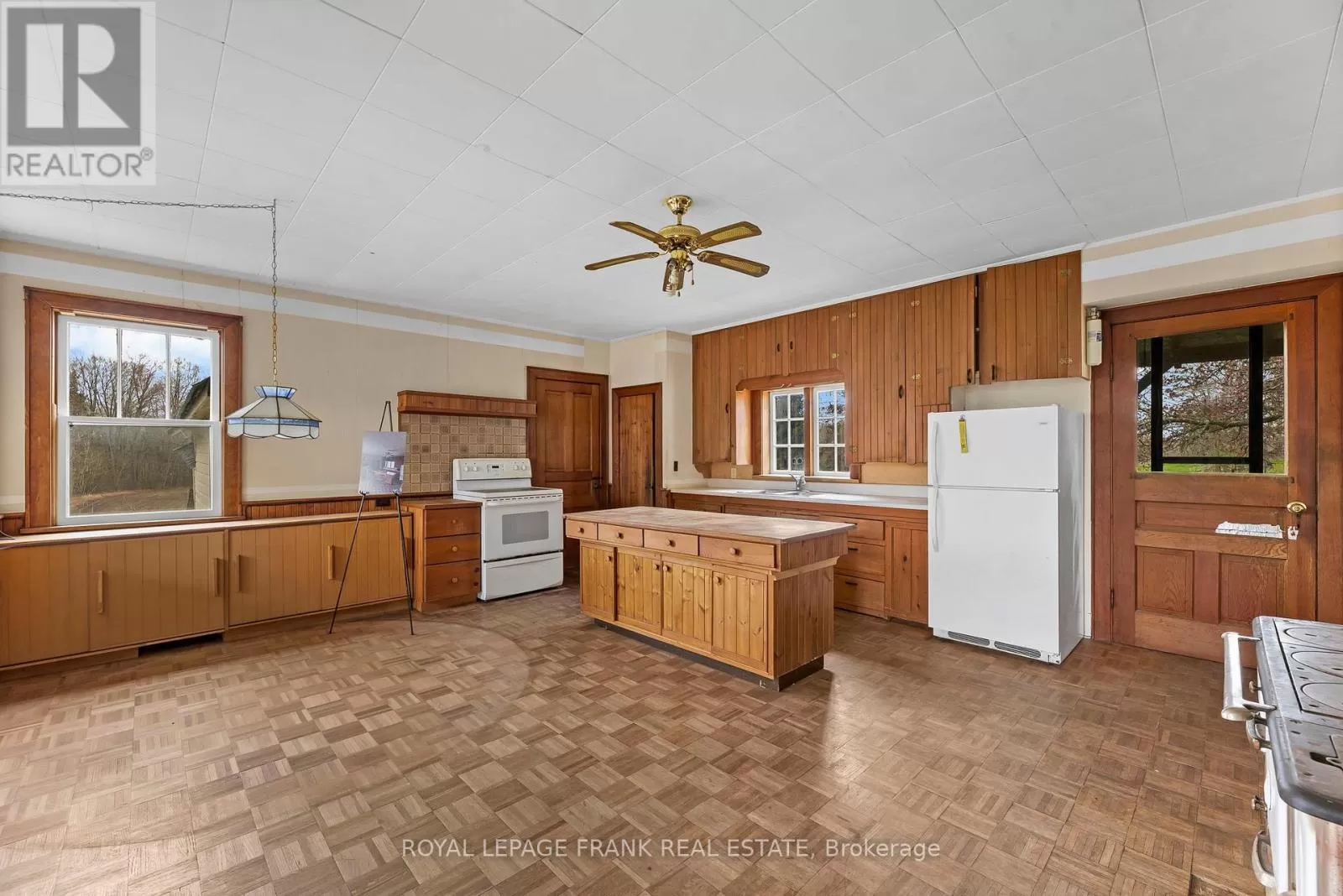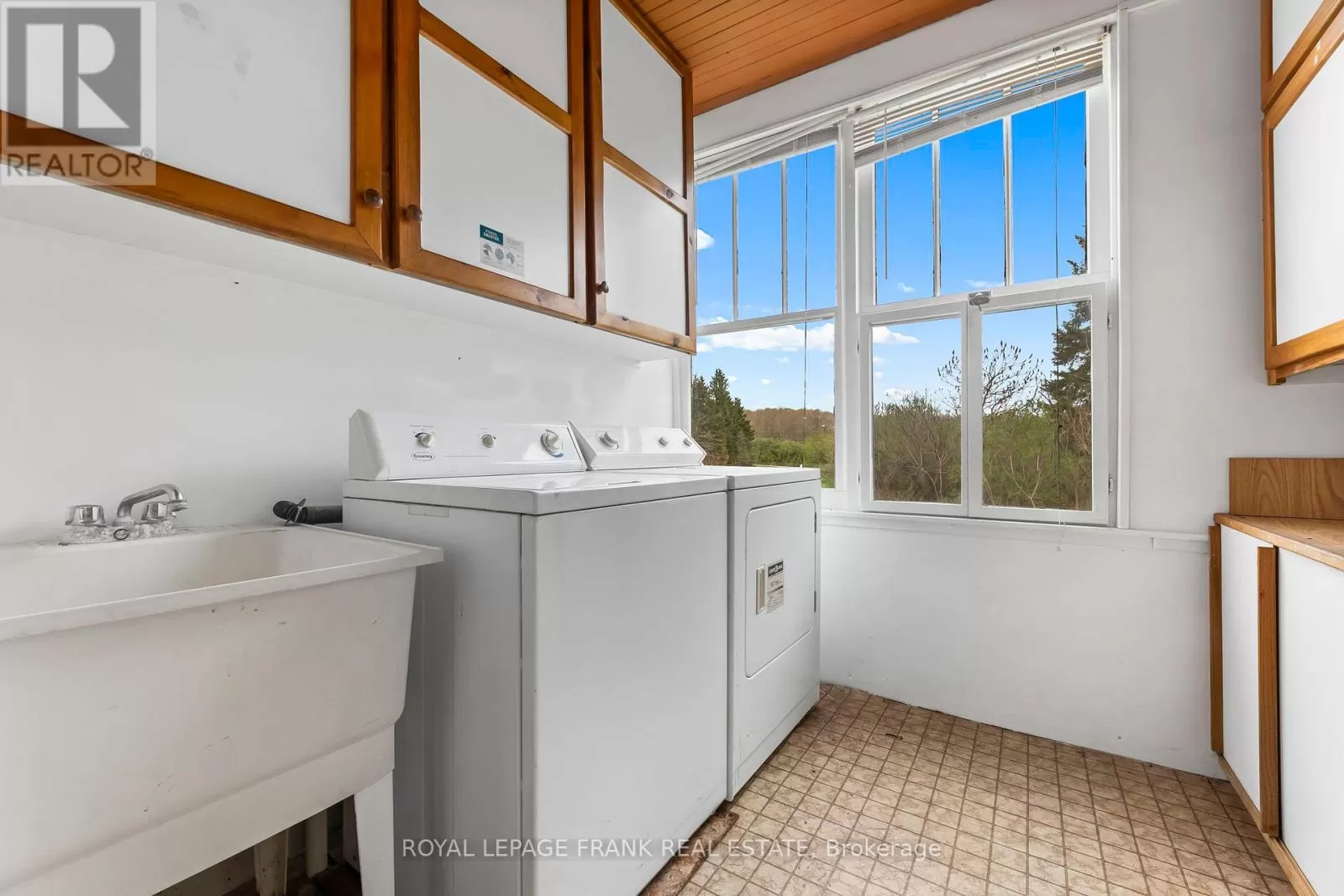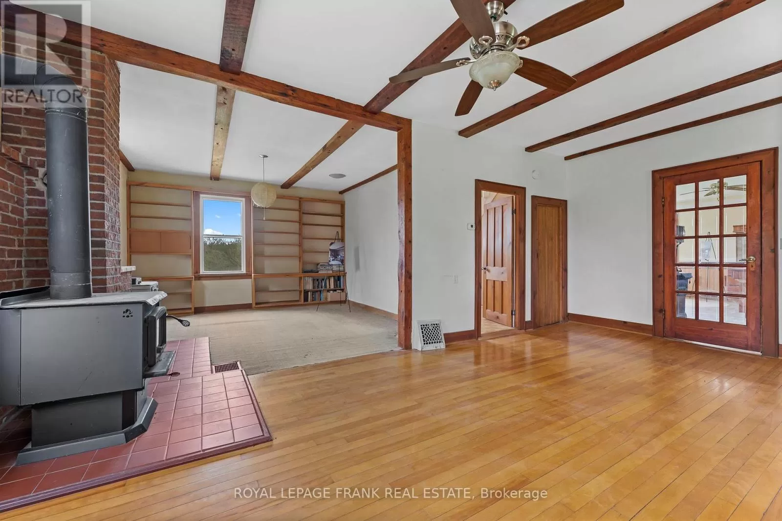 Cross Streets: COUNTY RD 32 WEST SIDE NORTH OF 401). ** Directions: NORTH FROM 401 ON HWY 32 (COUNTY RD 32) ON LEFT SIDE. A peaceful rural escape awaits you in Seeleys Bay, nestled on approx. 70 scenic acres. This two-storey farmhouse offers a wonderful blend of comfort, character, and outdoor freedom. Step onto the inviting front porch and feel instantly at ease this is a place where mornings begin with coffee and birdsong. Inside, the main level welcomes you with wood floors, an expansive, bright, eat-in kitchen ideal for casual meals or catching up with family. The main principal room has beautiful hardwood floors, is large enough to host the whole extended family for dinner, or set it up as a large living room? Ambiance abounds with a wood stove and adjacent cozy den/living room/study- a quiet place to unwind, relax with a good book or great conversations. There is also a rough-in for a small bathroom. The sunroom and convenient main floor laundry adds everyday ease. The huge wall to wall windows bring in the sunshine and serenity of the outdoors Upstairs, there are three comfortable bedrooms, a fourth or den, two bathrooms, that could serve creative space, or an extra bedroom. Another light-filled sunroom on this level offers picturesque views and a tranquil spot to recharge. It could also be your home office or studio! Outside, theres room to roam meadows, mature trees, trails, fields to grow, several useful outbuildings, (a barn, chicken coops, drive shed, silo). Whether you're dreaming of gardens, hobby farming, or just breathing in fresh country air, this property offers a true connection to nature. A detached garage provides great storage for tools, toys, or weekend projects. This home has been filled with laughter and love and offers the kind of peace and privacy that's becoming harder to find. Whether you're settling in full-time or searching for a weekend getaway, this special property is ready to welcome you home. The farmable acreage has been maintained by a local farmer and used to grow hay, soybeans, corn and oats. Back Deck is approx 27'4" (8.35 m) x 7'3"(2.23 m) (id:27476)