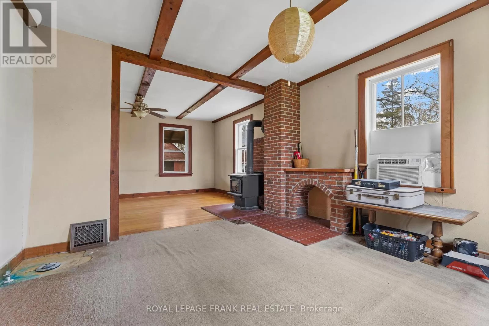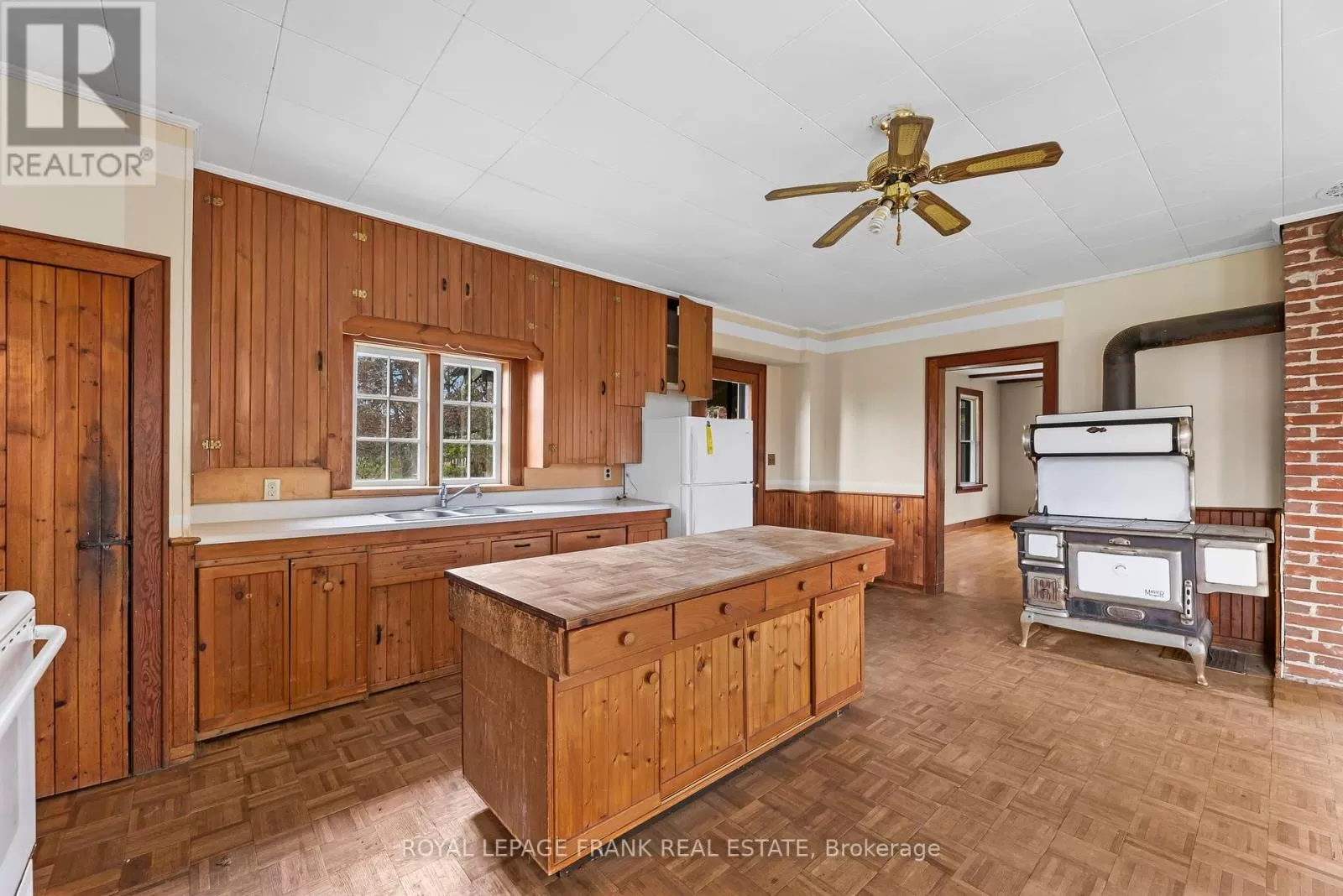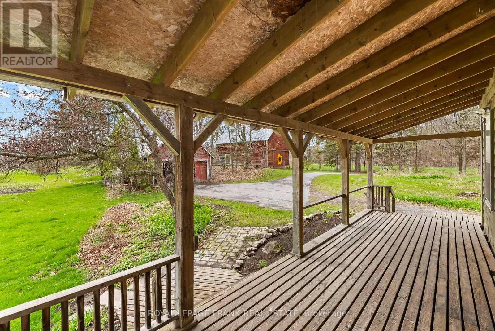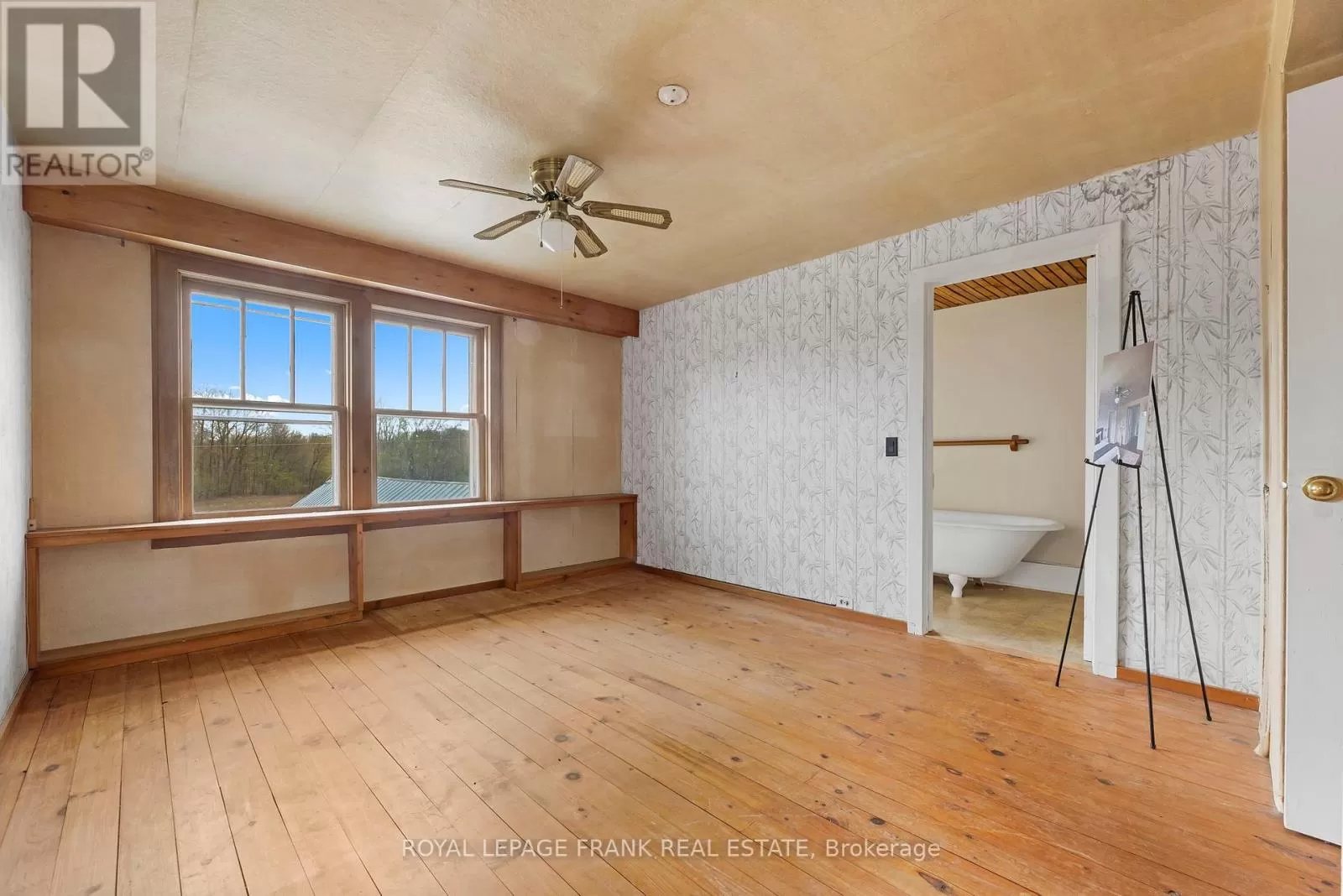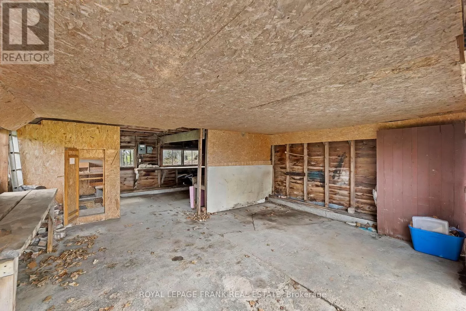 Cross Streets: COUNTY RD 32 WEST SIDE NORTH OF 401). ** Directions: NORTH FROM 401 ON HWY 32 (COUNTY RD 32) ON LEFT SIDE. A peaceful rural escape awaits you in Seeleys Bay, nestled on approx. 70 scenic acres. This two-storey farmhouse offers a wonderful blend of comfort, character, and outdoor freedom. Step onto the inviting front porch and feel instantly at ease this is a place where mornings begin with coffee and birdsong. Inside, the main level welcomes you with wood floors, an expansive, bright, eat-in kitchen ideal for casual meals or catching up with family. The main principal room has beautiful hardwood floors, is large enough to host the whole extended family for dinner, or set it up as a large living room? Ambiance abounds with a wood stove and adjacent cozy den/living room/study- a quiet place to unwind, relax with a good book or great conversations. There is also a rough-in for a small bathroom. The sunroom and convenient main floor laundry adds everyday ease. The huge wall to wall windows bring in the sunshine and serenity of the outdoors Upstairs, there are three comfortable bedrooms, a fourth or den, two bathrooms, that could serve creative space, or an extra bedroom. Another light-filled sunroom on this level offers picturesque views and a tranquil spot to recharge. It could also be your home office or studio! Outside, theres room to roam meadows, mature trees, trails, fields to grow, several useful outbuildings, (a barn, chicken coops, drive shed, silo). Whether you're dreaming of gardens, hobby farming, or just breathing in fresh country air, this property offers a true connection to nature. A detached garage provides great storage for tools, toys, or weekend projects. This home has been filled with laughter and love and offers the kind of peace and privacy that's becoming harder to find. Whether you're settling in full-time or searching for a weekend getaway, this special property is ready to welcome you home. The farmable acreage has been maintained by a local farmer and used to grow hay, soybeans, corn and oats. Back Deck is approx 27'4" (8.35 m) x 7'3"(2.23 m) (id:27476)