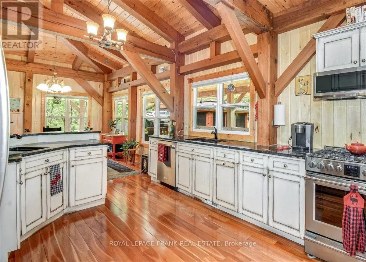 Cross Streets: Highway 62 and Steenburg Lake Road North. ** Directions: Highway 62 and Steenburg. Steenburg Lake! The complete package and more! This Timber Frame home is sure to impress. Amost 1800 square feet of living, with a full wrap around porch, perched perfectly over looking beautiful Steenburg Lake, with clean waterfront, all sitting on 86 acres of land with trails throughout. The waterfront is across the paved cottage road with a large dock system and newer floating boat house, big enough for a 22ft pontoon boat. There is a 30x40 heated shop, with drop down screen door system and a large covered area for extra storage. Hangout in the screened gazebo or chill on the wrap around porch. Extra features include: auto generator, central air, high efficiency furnace, underground sprinklers, alarm system with cameras, stainless appliances, hardwood flooring, a small pond with fountain and so much more. Recent upgrades include furnace, central air, roof and eavestroughs. This is a legacy type property that will be hard to match. Come take a look and you won't want to leave!! (id:27476)