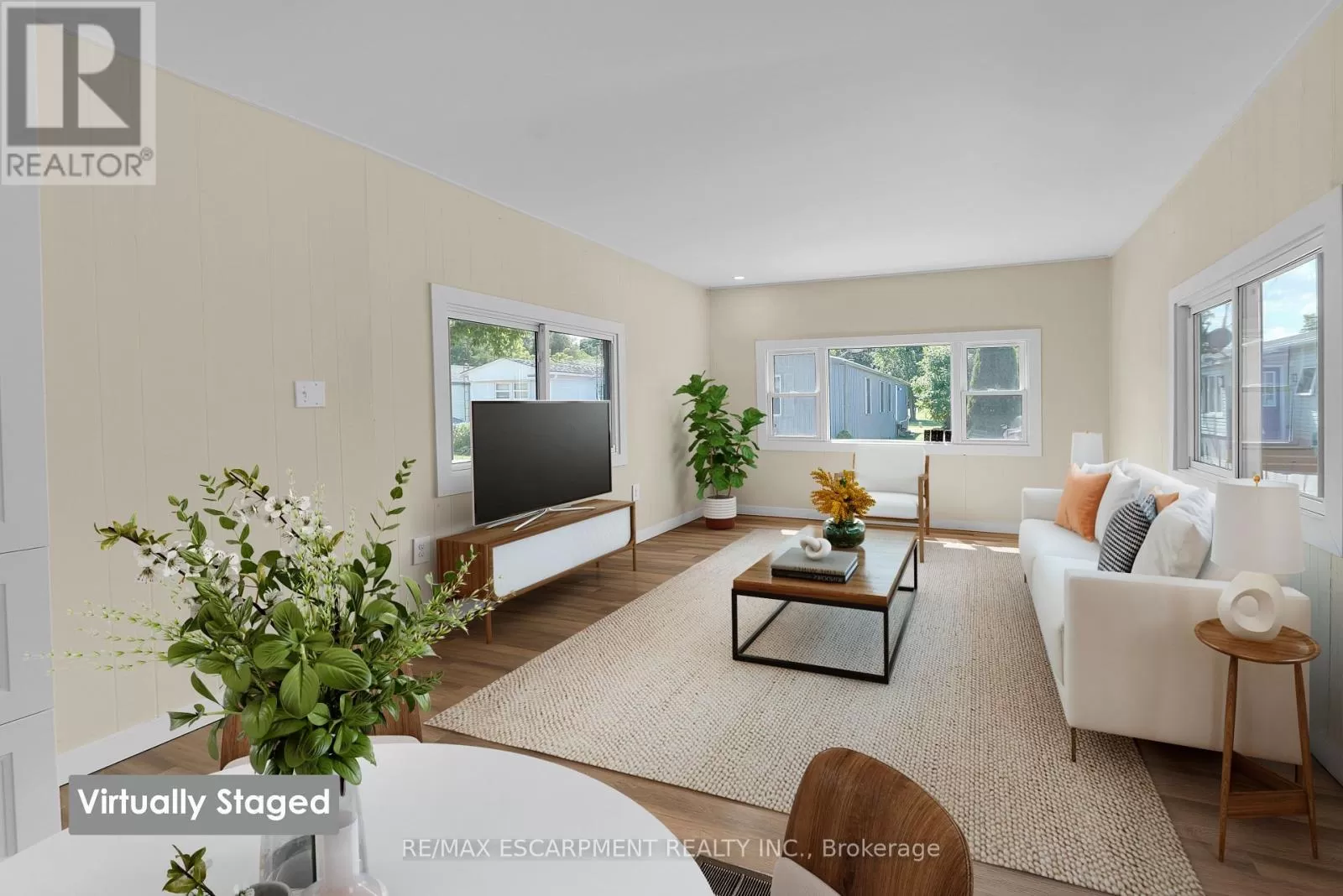 Cross Streets: Sann Road. ** Directions: From QEW, Exit Ontario St, South on Ontario St, Left onto South Service Rd, Right onto Sann Rd, Left on Abigail Lane. FRESHLY RENOVATED & MOVE-IN READY ... Welcome to 4595 Abigail Lane in Beamsville, a beautifully transformed home located in the sought-after Golden Horseshoe Estates community. Every inch of this property has been thoughtfully updated in 2025, blending modern convenience with stylish finishes so you can simply move in and enjoy. Step inside to discover a fully renovated kitchen, complete with brand-new cabinetry, countertops, and appliances. The bright, spacious living room is anchored by large windows with updated glass, flooding the space with natural light. New flooring flows seamlessly throughout, creating a fresh and cohesive feel. Down the hall, youll find a renovated 4-pc bathroom with the added convenience of in-suite laundry, plus a second exterior door for easy access. The primary bedroom features a cozy corner closet, while a second bedroom provides flexibility for guests, a home office, or hobbies. Comfort is assured with a NEW furnace & AC, roof, fresh paint throughout, all-new PEX plumbing, updated siding, and modern pot lighting. The attention to detail continues outside with a NEW DECK, rails, and spindles, as well as a new entry door. This property not only delivers style and function but also an unbeatable location just minutes from the QEW, award-winning vineyards, local restaurants, parks, and shopping. Commute with ease: 10 minutes to the Grimsby GO Station, 30 minutes to Niagara Falls and the U.S. border, and only an hour to Toronto. Enjoy the sense of community and convenience with a pad fee of $716.87/month including taxes & water, making this an affordable and desirable option in the heart of Niagara. 4595 Abigail Lane is the perfect blend of modern updates, easy living, and a location that puts everything within reach. CLICK ON MULTIMEDIA for virtual tour, drone photos, floor plans & more. (id:27476)