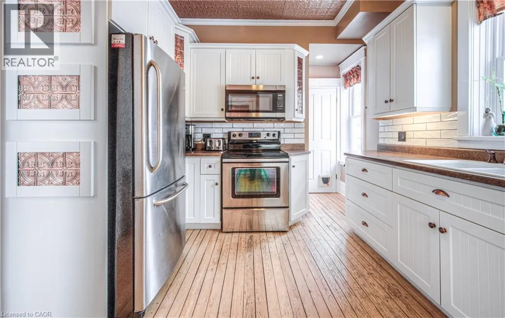 Main St W to Barber Ave North, property on left right after Elizabeth St W Get ready to fall in love with this stunning home located in the heart of Listowel. Where lazy summer afternoons on the covered back deck melt into evenings around the fire, and common modern conveniences meet rare old world character and charm. Pride of ownership is evident throughout with all the things that you would normally worry about in a century home already taken care of. Wiring...Updated, Plumbing...Done, Mechanicals...Efficient on demand hot water heater, water softener and filtration system, Windows...All replaced except for the original stained glass, Insulation...Upgraded, Bathrooms...2.5 bathrooms -all renovated, including a stunning 3 piece primary ensuite. All of this while maintaining the features you love about a century home. High ceilings, crown moulding and wood trim, french doors, pocket doors, original hardwood floors, stained glass windows... the list goes on and on. Cozy up to the fireplace or enjoy a meal in the dining room large enough to host the whole family. The updated kitchen at the back of the house overlooks the generous back yard. Upstairs, you will happen upon the sweetest 3 season sunroom, perfect for curling up with a book. As well as 2 secondary bedrooms, an office space, an updated 4 piece family bathroom and an amazing primary bedroom with a brand new 3 piece ensuite bathroom. The walk-up, finished attic allows for that family hang-out space and/or a 4th bedroom area. Outside, you can sit back and enjoy your morning coffee on the porch swing or wander along the flagstone pathways that will lead you throughout the well established English cottage style perennial gardens, complete with lilacs, an apple tree, crab apple tree and elderberries. The moment you walk through the door you will see that this one is not like the others. Easy commute to Kitchener, Waterloo, Guelph or Stratford, Listowel is close enough to the city, but retains that small town feel. (id:27476)