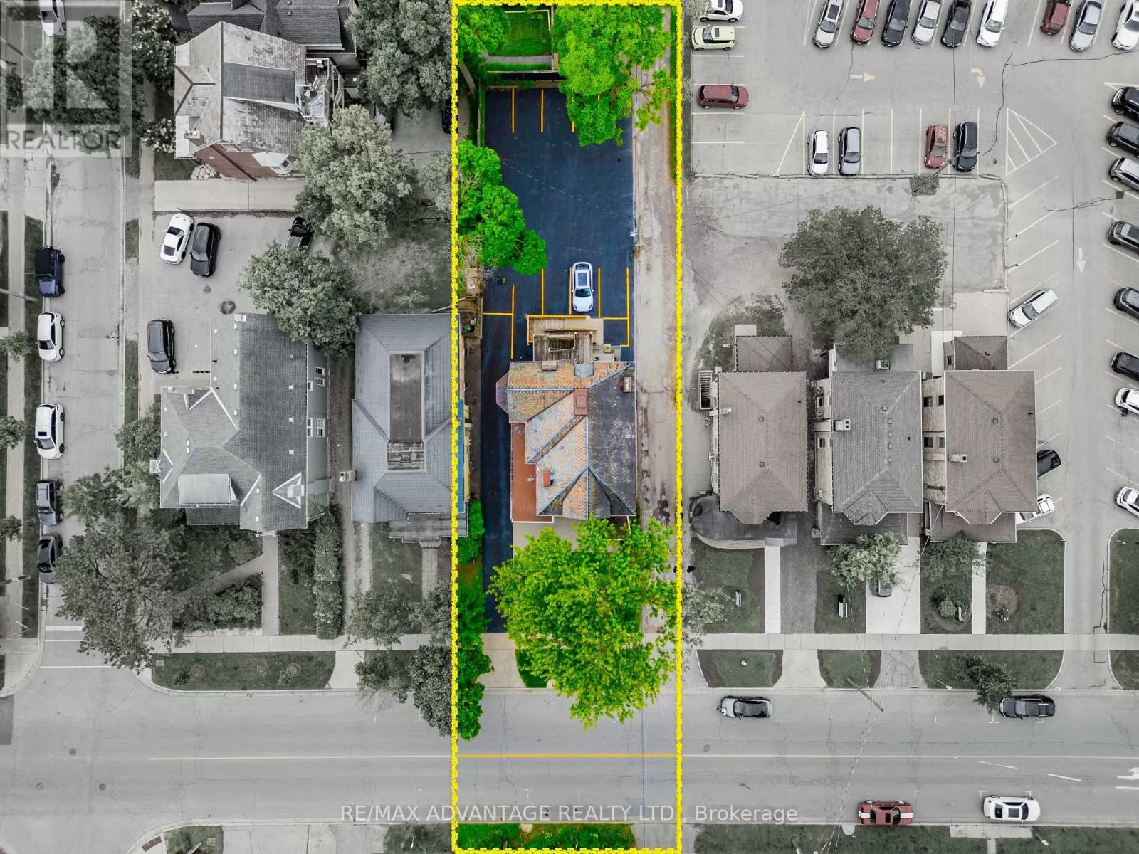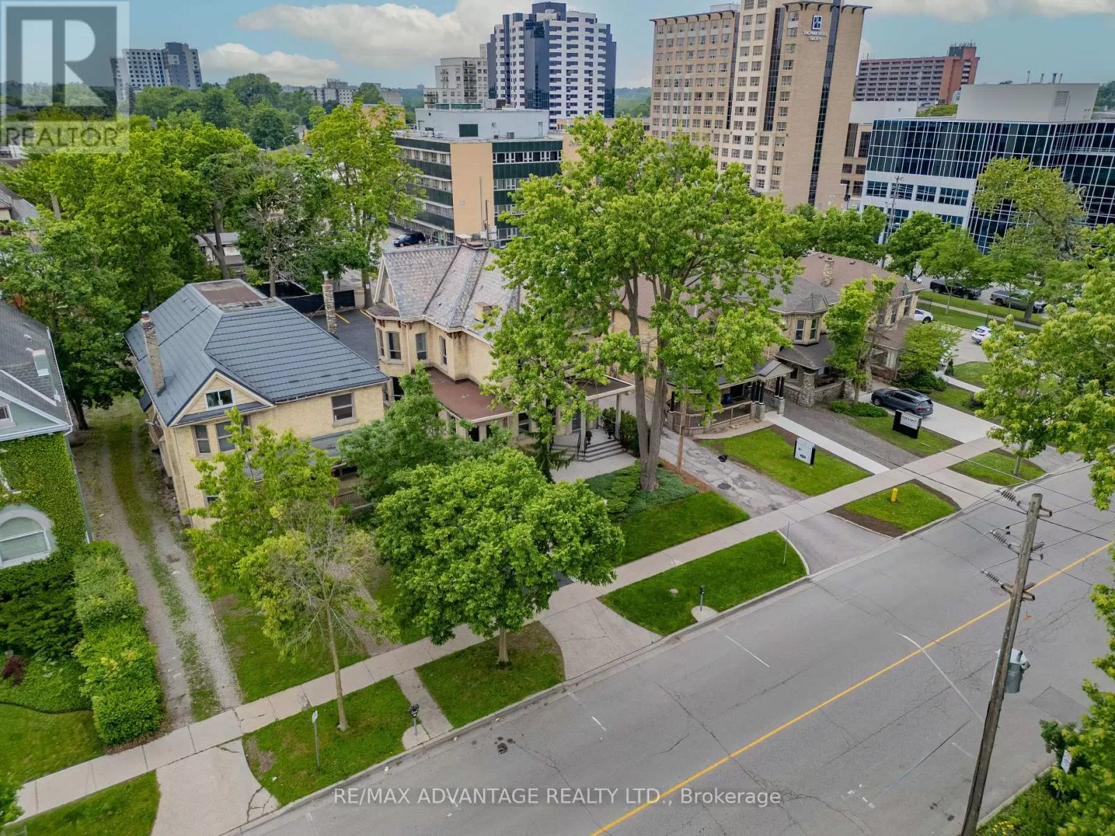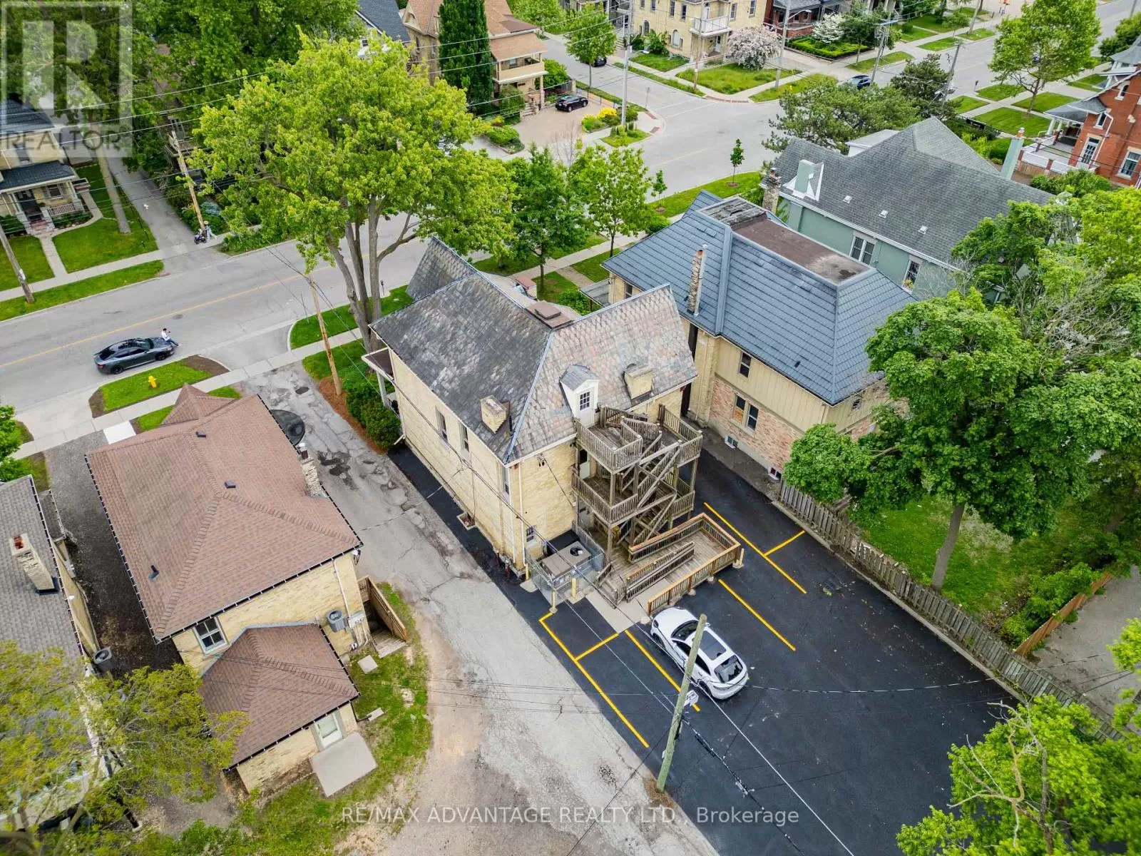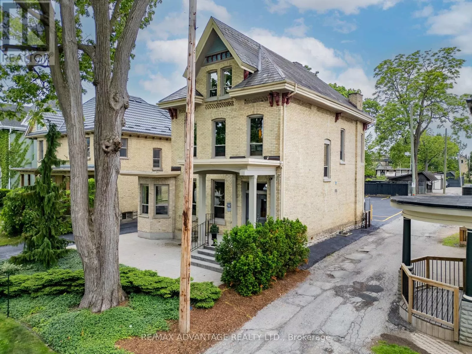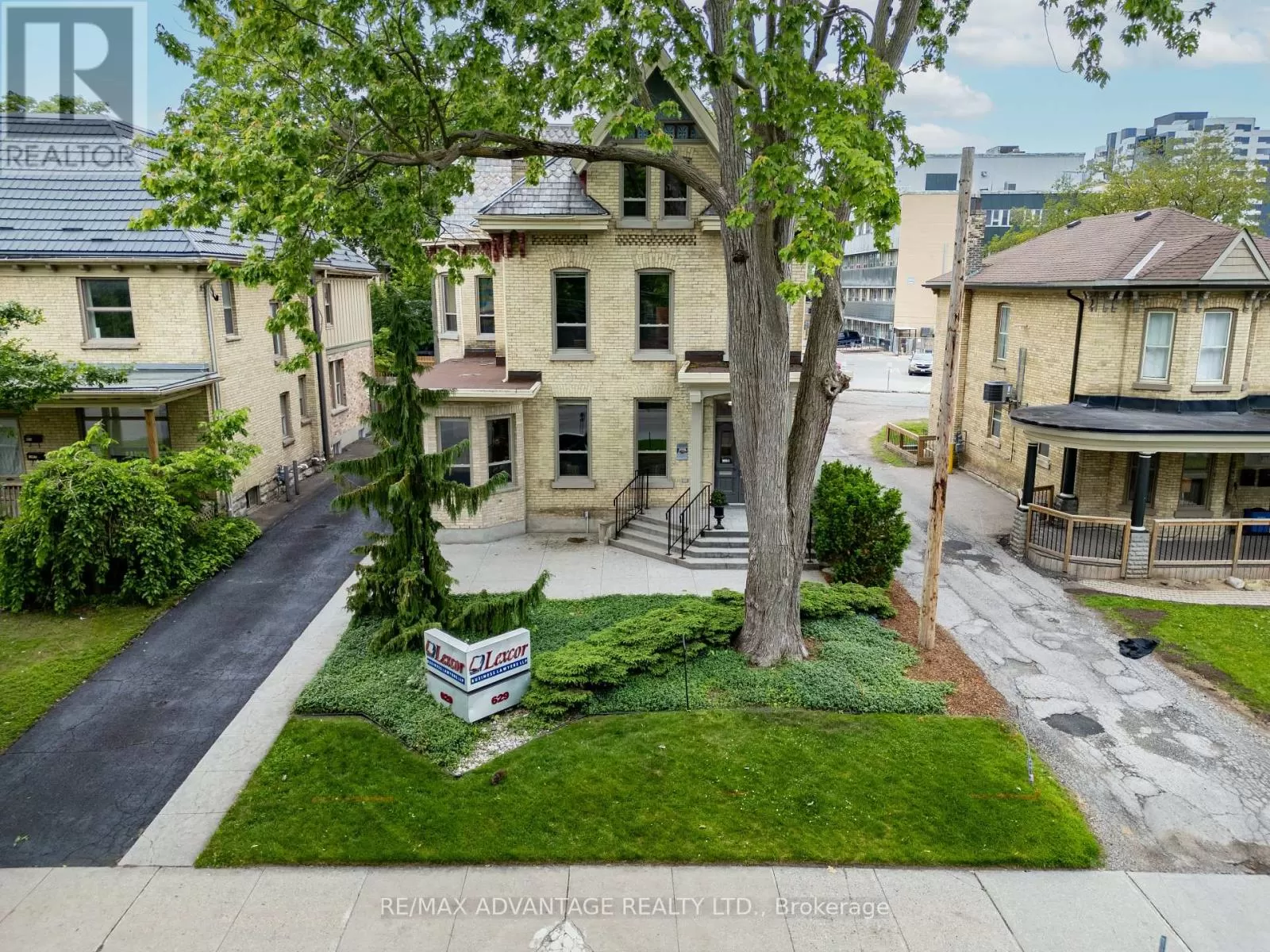 Cross Streets: Pall Mall. ** Directions: South of Pall Mall on the west side of Wellington Street. This elegant 3,116 square foot office conversion is located in the heart of London's Business District, a few steps from Victoria Park and Richmond Row. It features 10+ asphalt-paved parking spaces and includes a well-designed assortment of meeting rooms, work areas and private offices over three stories plus a basement storage area. The property has an optical fibre connection to the Internet, with Cat 5 connections in every room. The property underwent significant renovations in 2005, with structural upgrades to all floors meeting commercial code, new electrical, plumbing, insulation, windows, and high-quality interior finishes. In 2024, a 6-ton HVAC system was installed. The property includes a bathroom on each floor above grade, a main-floor coffee station, a second floor kitchenette, and wheelchair accessibility. It also has an alarm system and an inground sprinkler system. Access to the property is via a private driveway on the south and a City-owned laneway on the north. The property enjoys excellent exposure, a prominent street presence, and pylon signage. (id:27476)