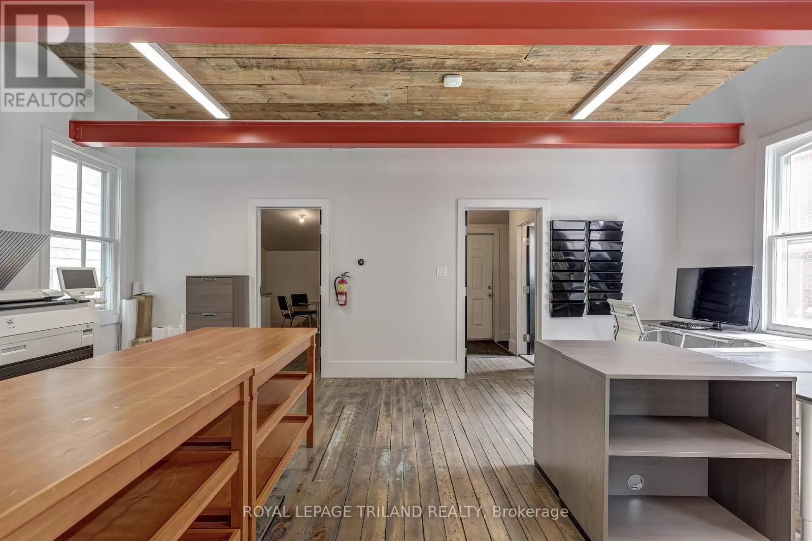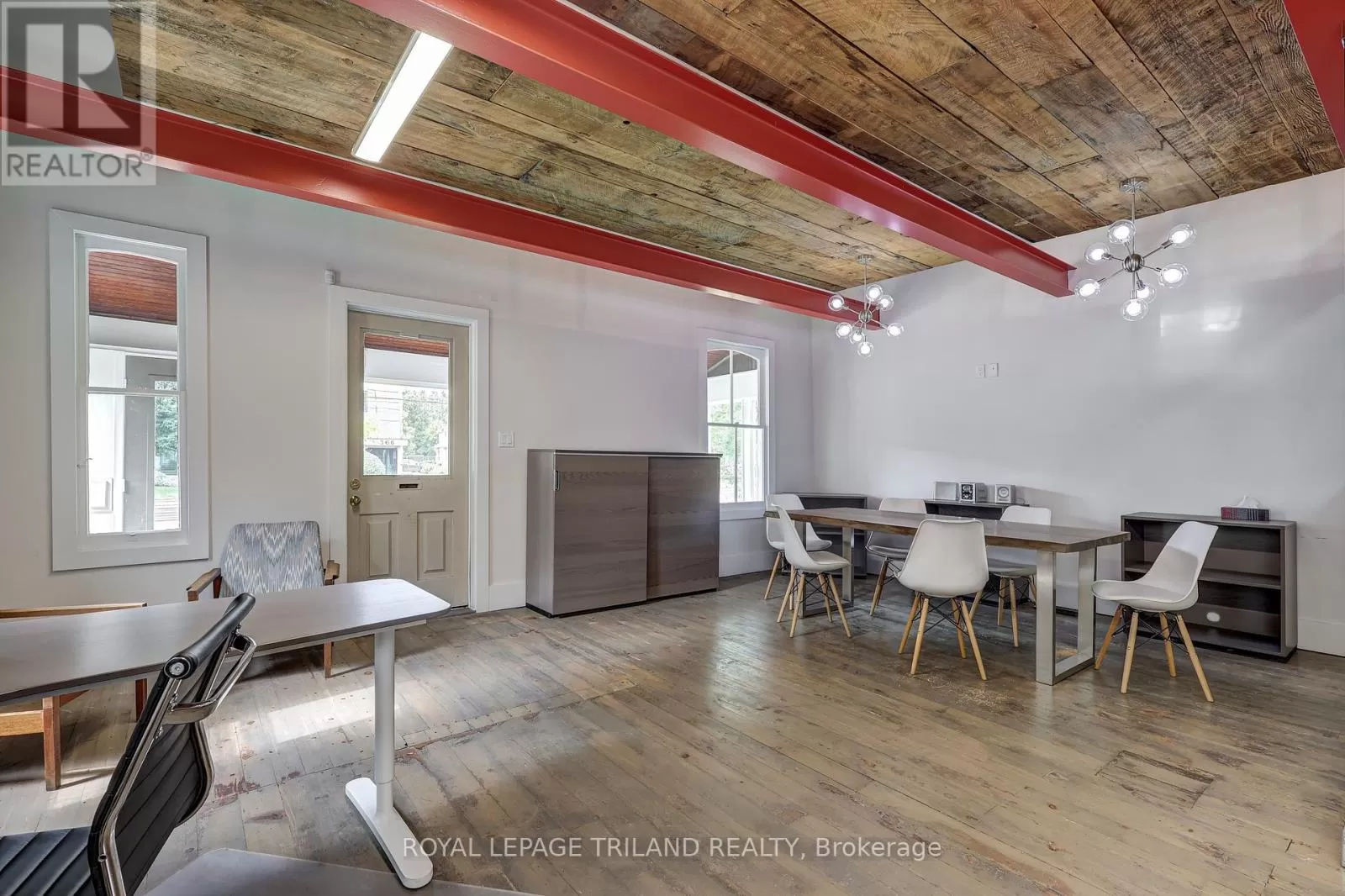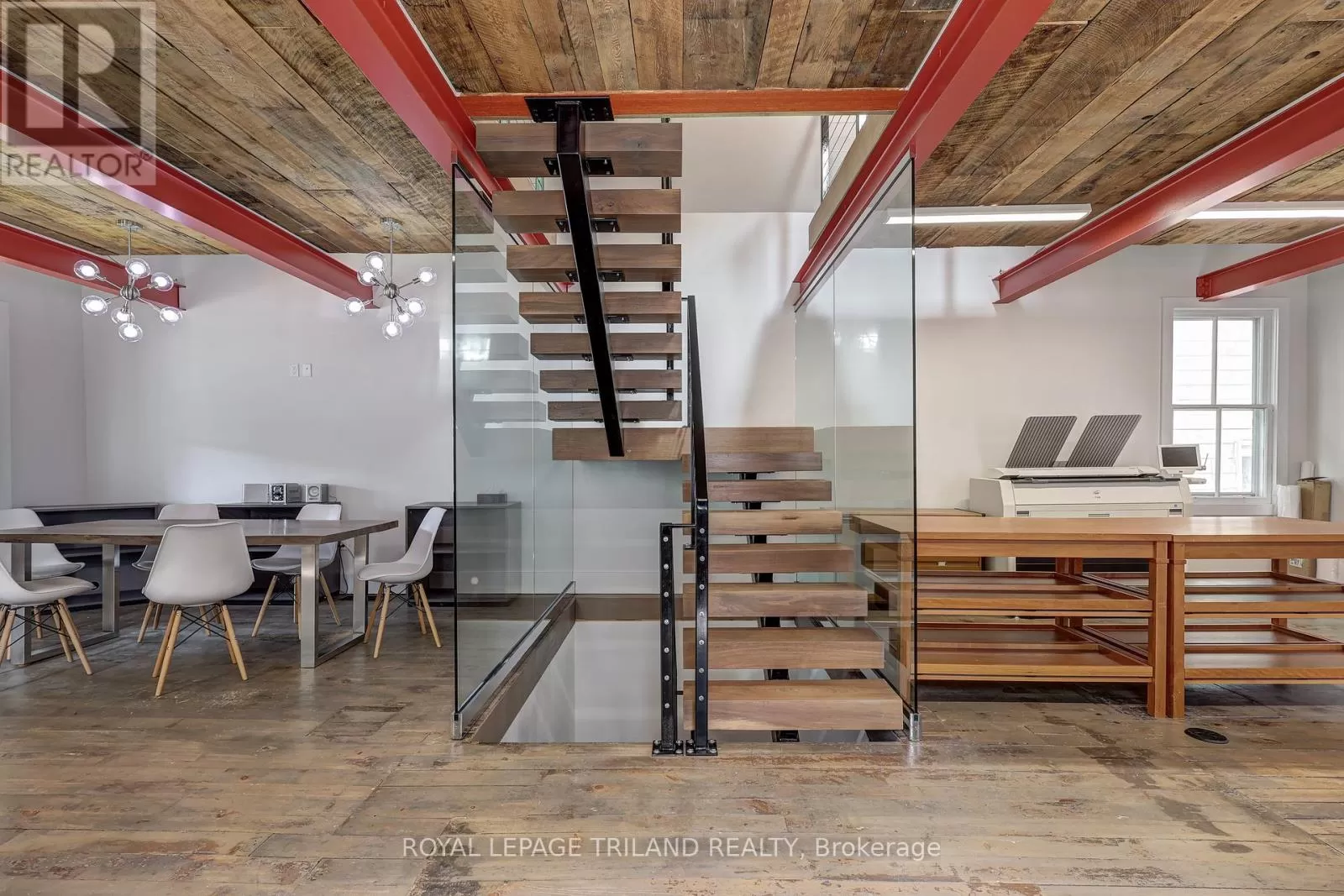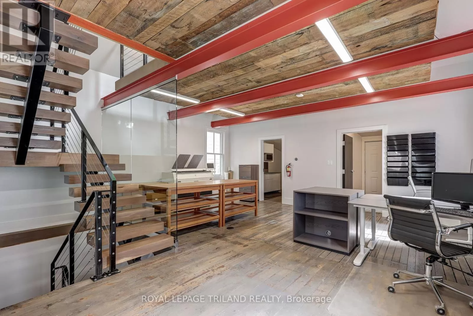Oxford and Waterloo Seize the opportunity to convert this exceptional office space into a stylish modern loft residence! Ideally situated just two blocks east of Richmond St., this prime location on Oxford St. offers high visibility with over 30,000 cars passing by daily. Zoned OC4 and R3-1, allowing for versatile uses, including a potential work/live space. Fully renovated with an open-concept layout and contemporary finishes. Features include a custom floating staircase with a glass wall, six exposed red steel I-beams, and striking rustic hardwood floors. Main floor has a kitchen and bathroom. Convenient access with private driveway off Oxford St. and additional access via lane off Colborne. Ample parking on site with over 6 spots in rear and more parking in laneway if needed. This unique space is perfect for creating a lasting impression and offers the flexibility to be an excellent residence or a dynamic work/live environment. (id:27476)