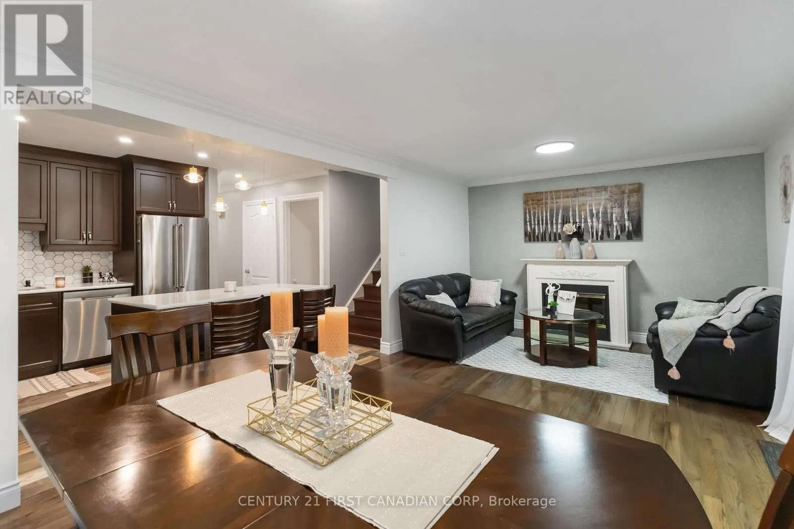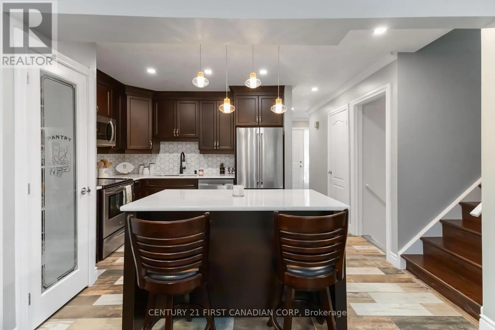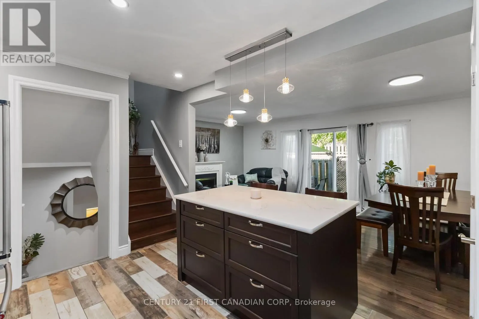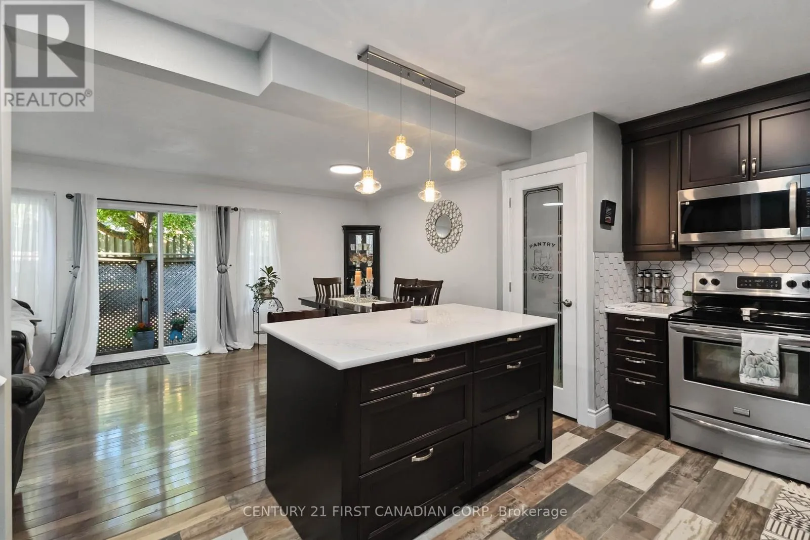 Cross Streets: Admiral and Bonaventure. ** Directions: SW on Dundas Street, left onto Bonaventure Drive, unit will be on the right hand side. Step into this stylish and well-cared-for 3-bedroom, 2-storey townhouse, tucked away in a peaceful, family-oriented community. Backing onto Bonaventure Meadows Public School, this home offers rare privacy, a backdrop of green space, and the comfort of true neighborhood living. The main level welcomes you with a bright foyer, convenient interior garage access, a modern 2-piece bath with stone counter, and a spacious main floor laundry room. The kitchen has been recently renovated with sleek quartz countertops, new island, stainless steel appliances, and large pantry with lots of storage. The kitchen flows seamlessly into the open-concept dining and living area, where windows fill the space with natural light. With no carpet the layout is both fresh and practical, perfect for busy family life or entertaining guests. Upstairs, discover three generous bedrooms, including a primary retreat that easily fits a king-size bed and features double closets. The 4-piece bathroom has been tastefully renovated with stone counters, offering both style and function. The fully finished lower level expands your living options with a spacious rec room and a separate office area ideal for working from home, gaming, or study space. Outside, enjoy a private patio perfect for summer barbecues, morning coffee, or simply relaxing while overlooking the schoolyard beyond. This prime location puts you just minutes from everything 6 minutes to Highway 401, 10 minutes to downtown London, 5 minutes to Fanshawe College, and under 20 minutes to Western University. Parks, shopping, and public transit are also close at hand. (id:27476)