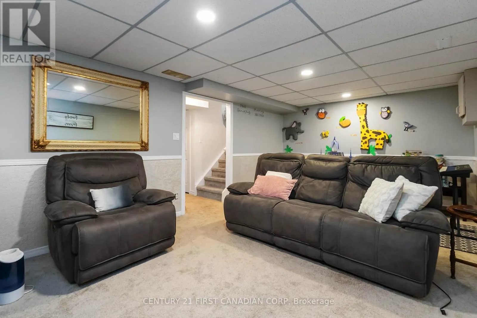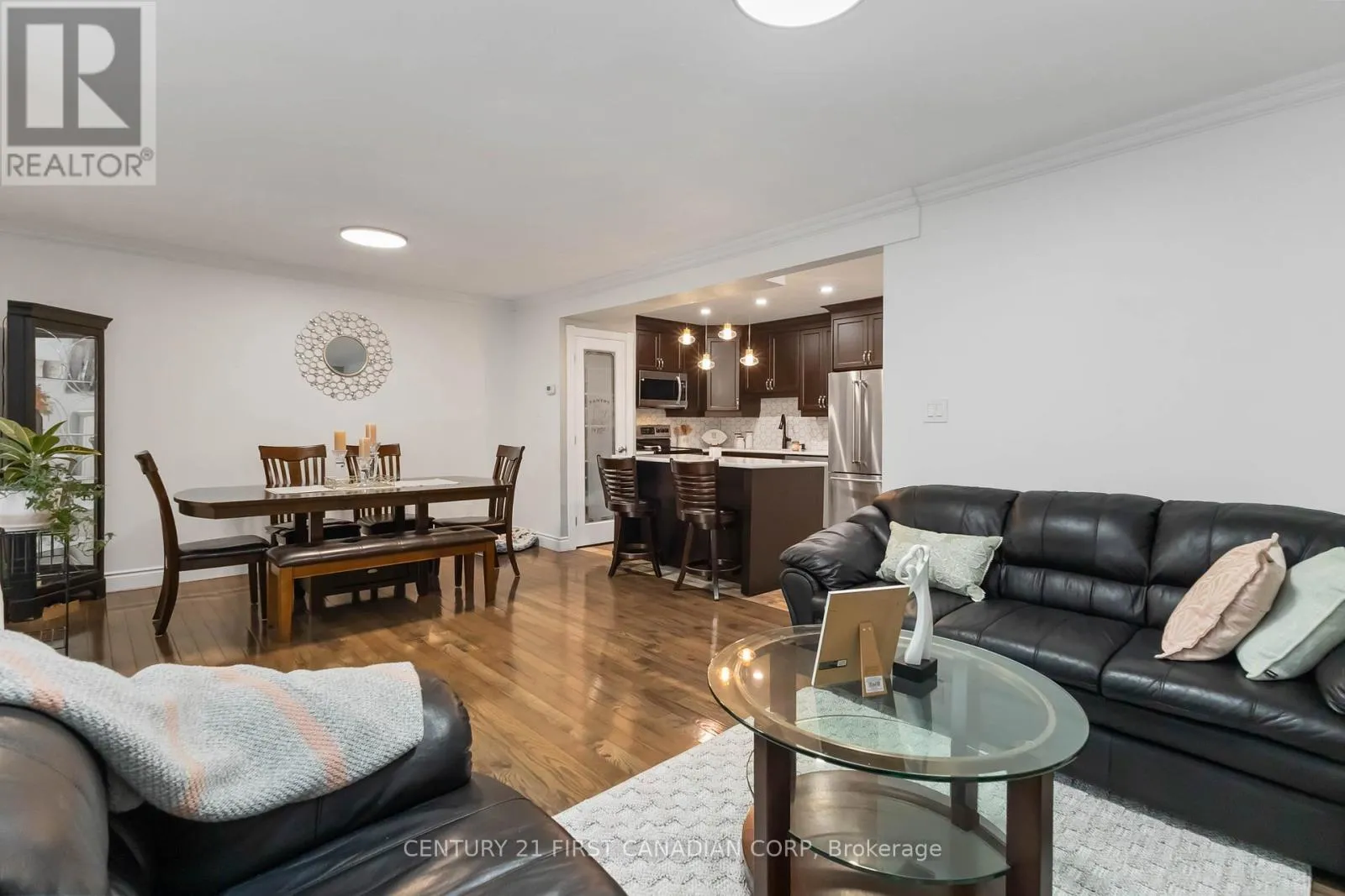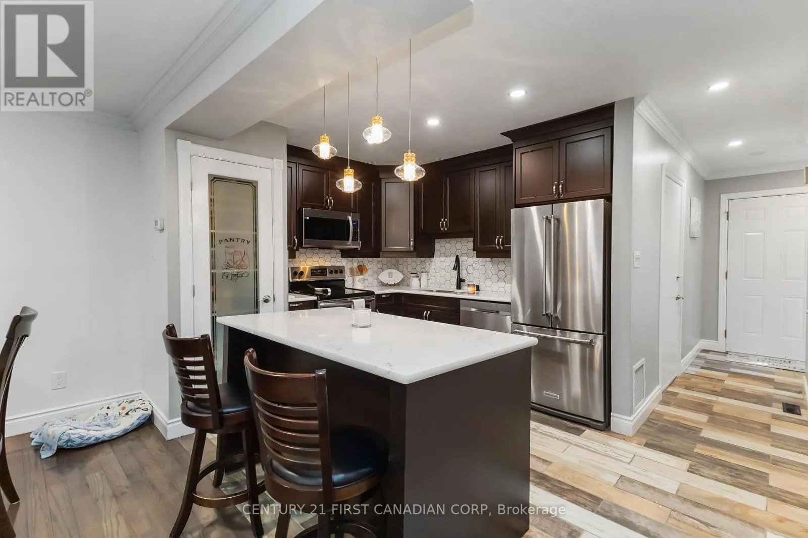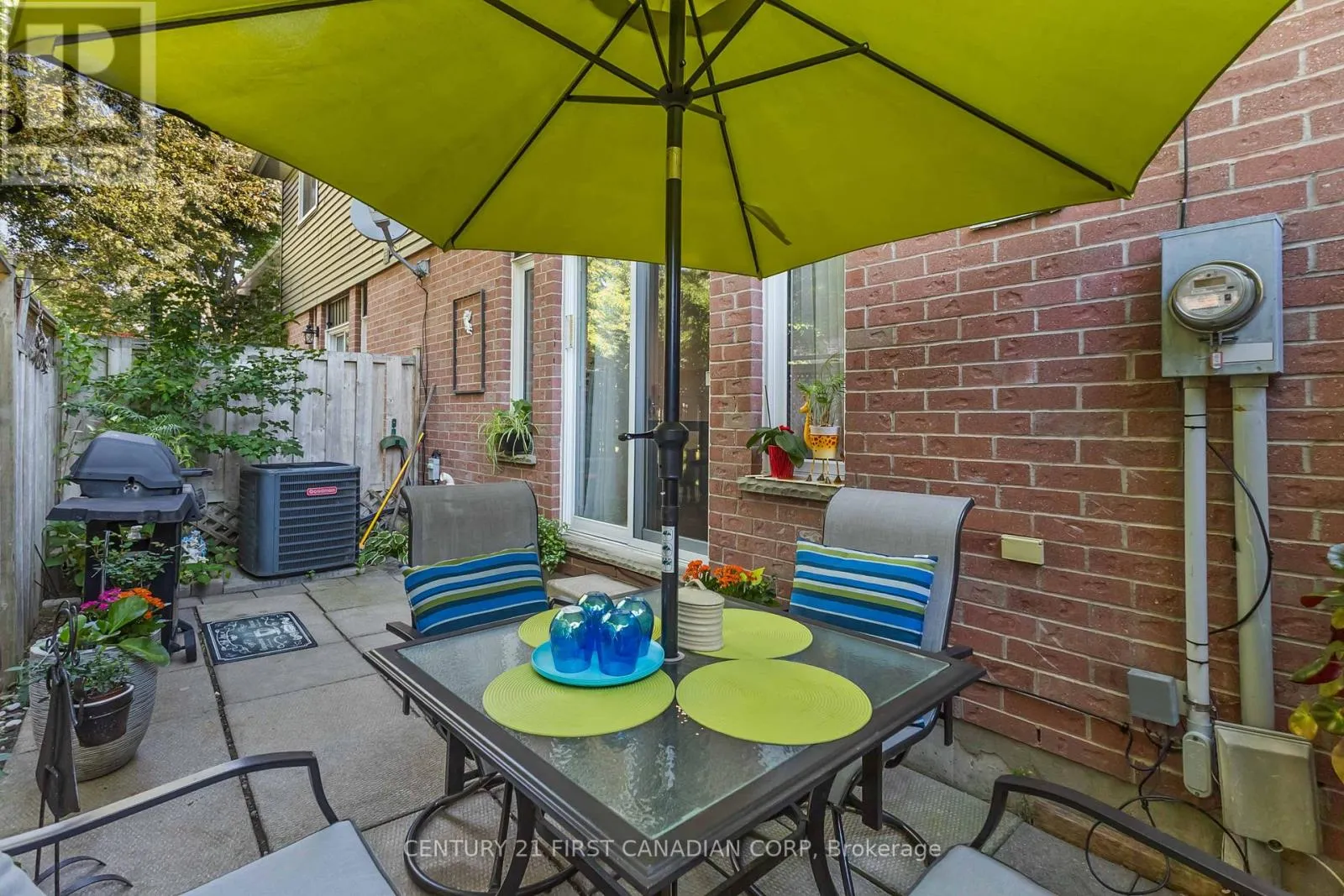 Cross Streets: Admiral and Bonaventure. ** Directions: SW on Dundas Street, left onto Bonaventure Drive, unit will be on the right hand side. Step into this stylish and well-cared-for 3-bedroom, 2-storey townhouse, tucked away in a peaceful, family-oriented community. Backing onto Bonaventure Meadows Public School, this home offers rare privacy, a backdrop of green space, and the comfort of true neighborhood living. The main level welcomes you with a bright foyer, convenient interior garage access, a modern 2-piece bath with stone counter, and a spacious main floor laundry room. The kitchen has been recently renovated with sleek quartz countertops, new island, stainless steel appliances, and large pantry with lots of storage. The kitchen flows seamlessly into the open-concept dining and living area, where windows fill the space with natural light. With no carpet the layout is both fresh and practical, perfect for busy family life or entertaining guests. Upstairs, discover three generous bedrooms, including a primary retreat that easily fits a king-size bed and features double closets. The 4-piece bathroom has been tastefully renovated with stone counters, offering both style and function. The fully finished lower level expands your living options with a spacious rec room and a separate office area ideal for working from home, gaming, or study space. Outside, enjoy a private patio perfect for summer barbecues, morning coffee, or simply relaxing while overlooking the schoolyard beyond. This prime location puts you just minutes from everything 6 minutes to Highway 401, 10 minutes to downtown London, 5 minutes to Fanshawe College, and under 20 minutes to Western University. Parks, shopping, and public transit are also close at hand. (id:27476)