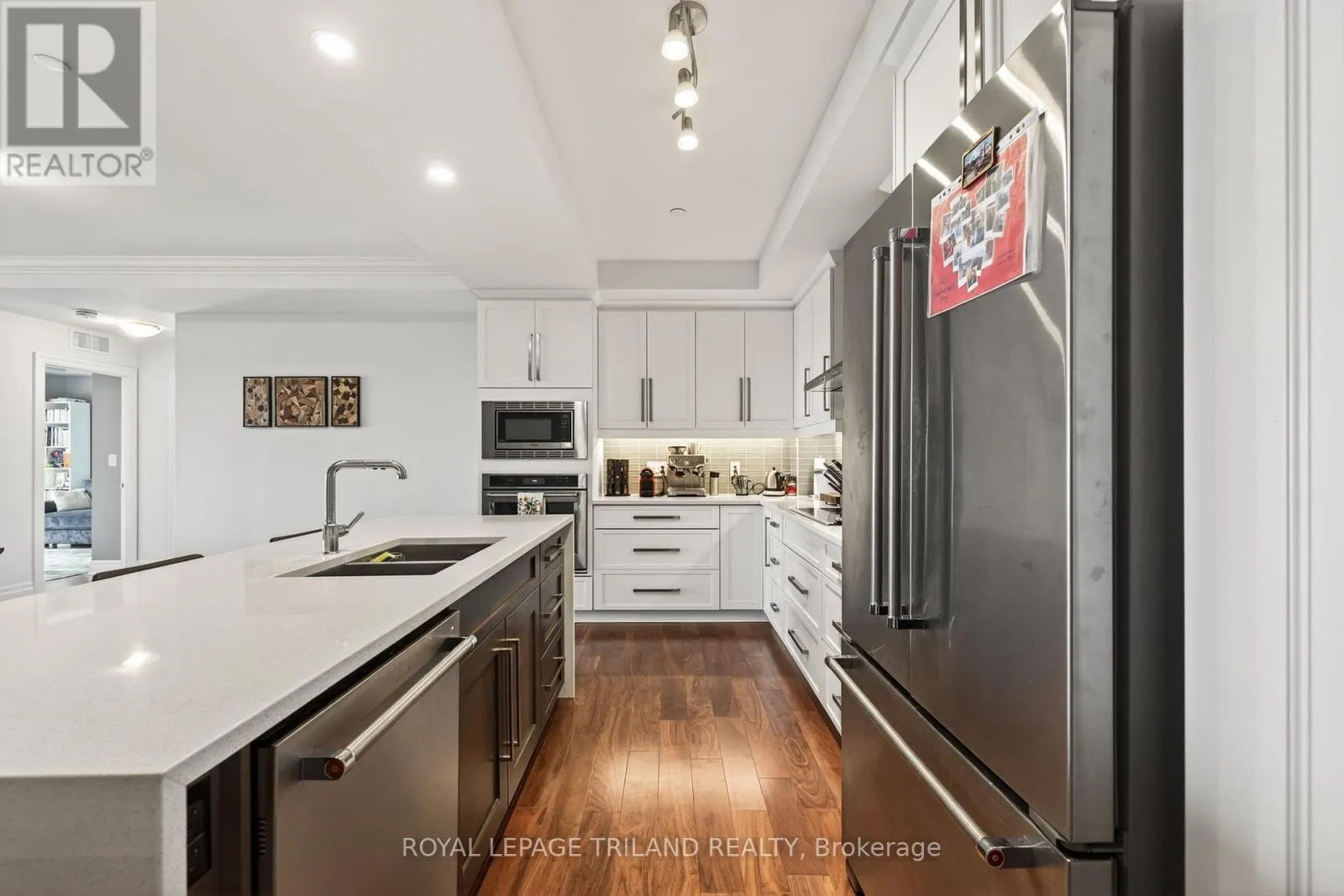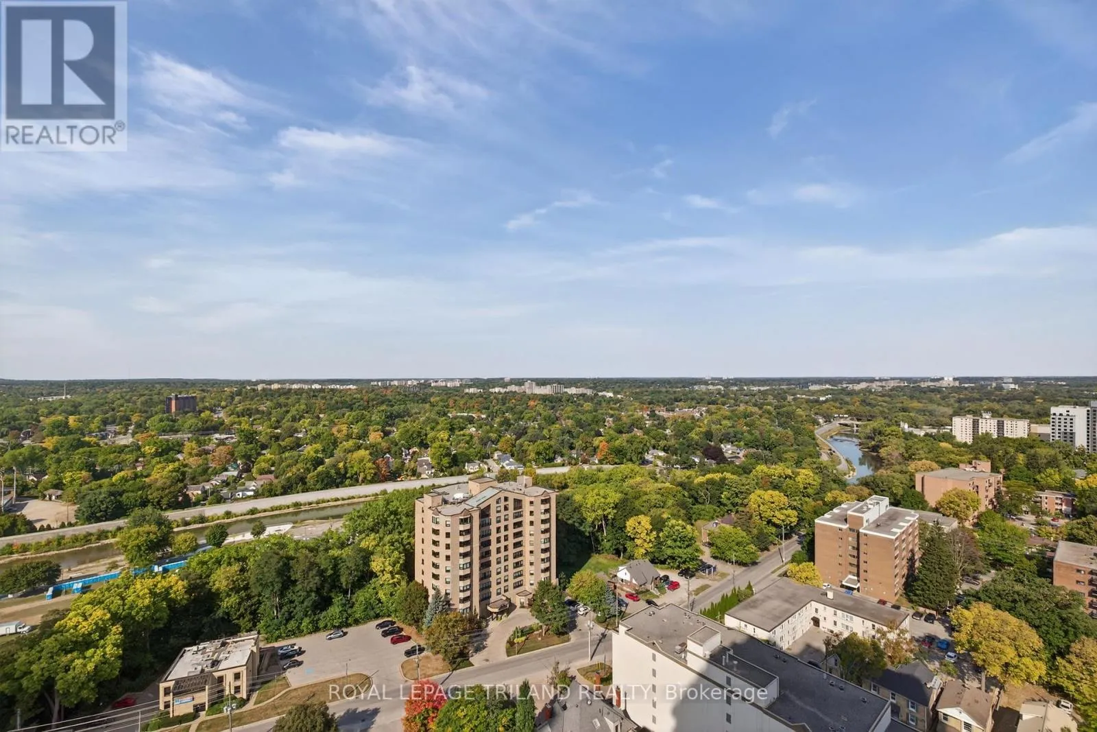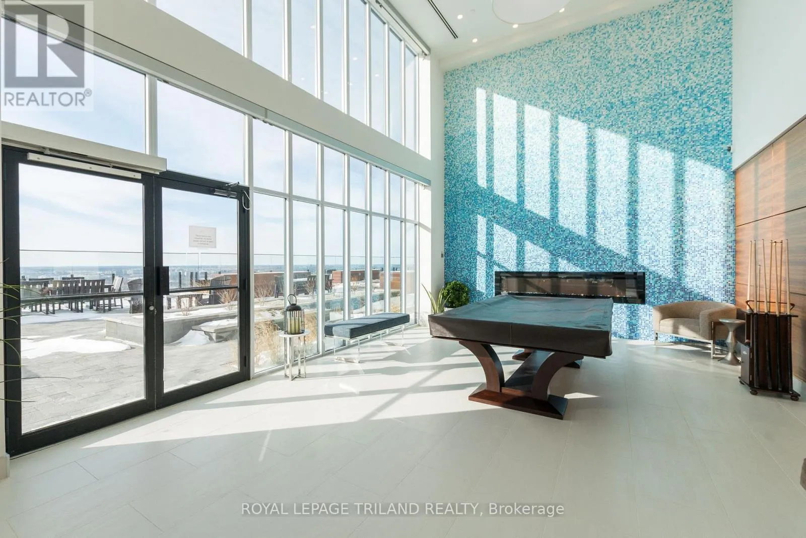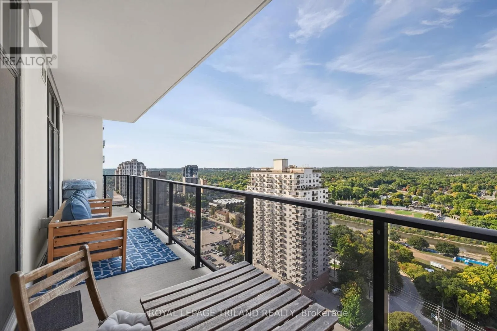 Cross Streets: Dufferin. ** Directions: The Azure is located on the west side of Talbot between Kent & Dufferin. The Azure! Situated on the 23rd floor, this unit offers unobstructed panoramic western views stunning in every season and highlighted by remarkable sunsets. With over 1,400 sq. ft. of living space plus a 160 sq. ft. balcony, this two-bedroom plus den, two-bathroom condo combines convenience, thoughtful design and modern finishes. The kitchen features built-in appliances, quartz countertops, backsplash and island seating. An open-concept layout provides a dedicated dining area and flows into the living room, complete with electric fireplace, recessed ceiling detail, and balcony access. The primary suite includes a walk-in closet, 4-piece ensuite, and its own balcony entry. Additional conveniences include in-suite laundry, ample storage, an owned parking space located directly off the elevator access, and a same-floor storage locker. Residents enjoy exceptional building amenities, including a 29th-floor rooftop patio with BBQs, lounge seating, gas fire pit and picnic space, fitness room, golf simulator, pool table, library, seating areas with wet bar and a guest suite. Reasonable condo fees include heating, cooling, water, and building insurance/maintenance. Walk to restaurants, shops, Covent Garden Market and Canada Life Place. All of this in a prime downtown location, within a highly regarded building offering exceptional amenities and suited for any lifestyle! (id:27476)