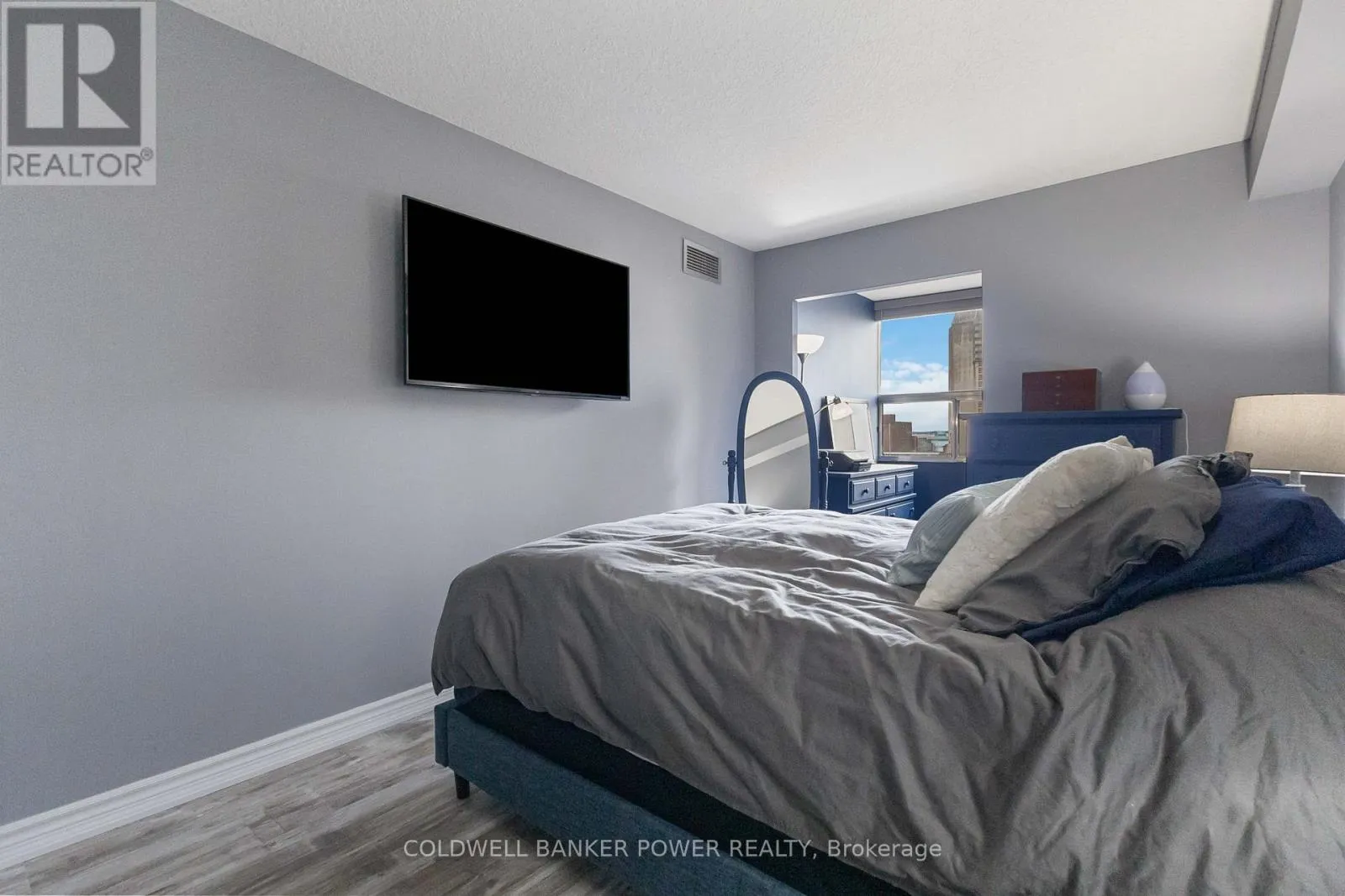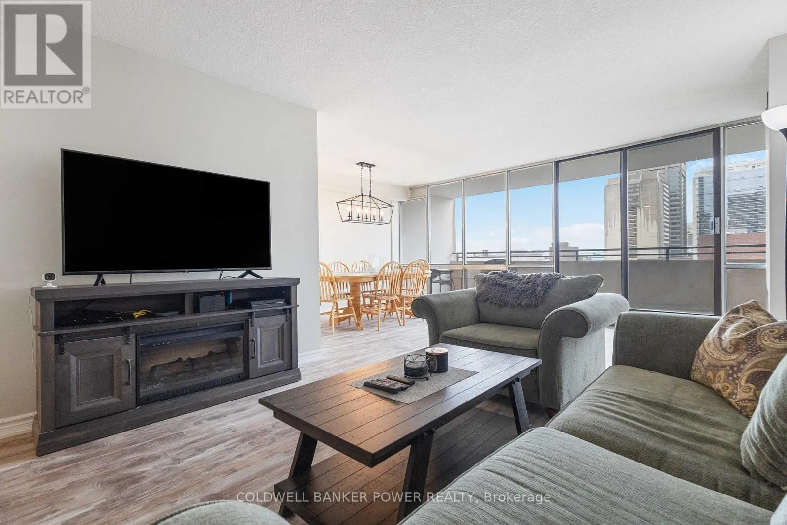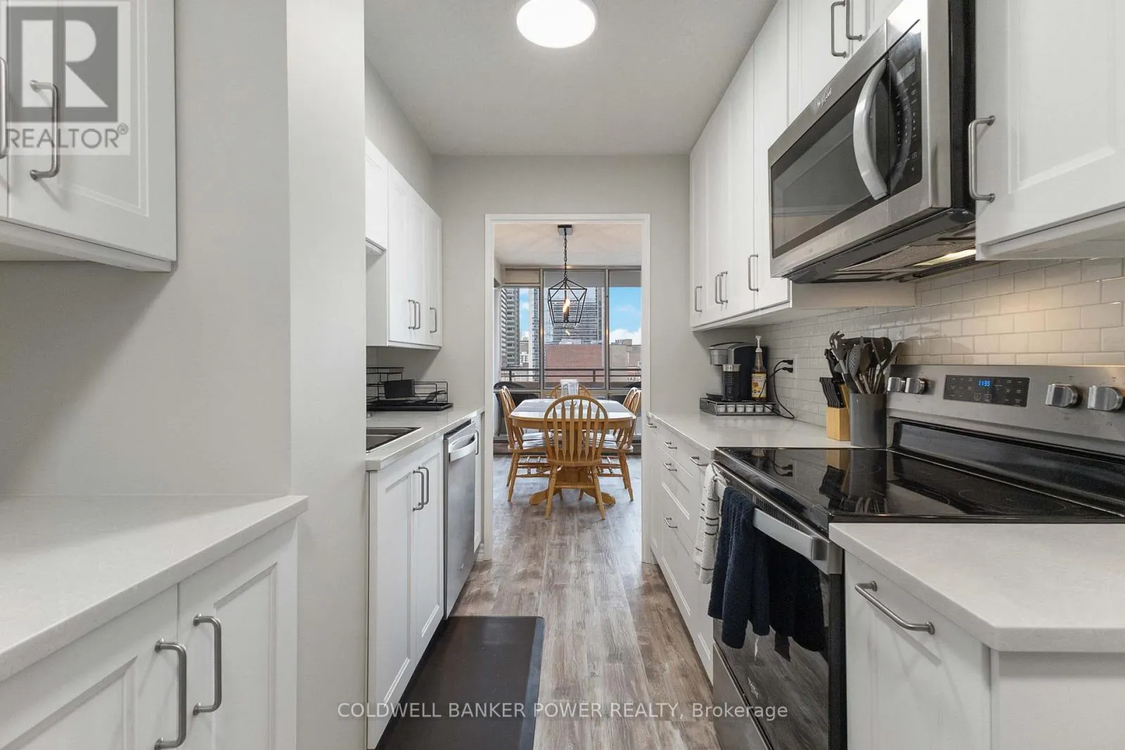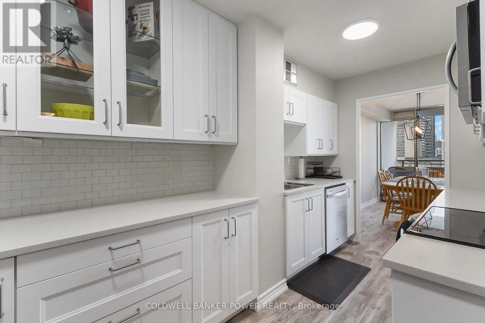 On the South West Corner of Dundas St and Colborne St Fully renovated 1 BEDROOM PLUS OFFICE/DEN, beautiful new white kitchen with quartz countertops and subway tile backsplash, neutral vinyl floors (no carpet), bright and spacious unit with desirable west facing exposure overlooking downtown and sunsets! Fantastic downtown location and within walking distance to great restaurants, parks, trails, shopping, transit, summer festivals and more! This home offers spacious primary bedroom and small den/office, huge great room area and large eating area overlooking wall to wall windows with access to expansive balcony. 1 underground parking spot included. NOTE: Condo fee includes: heat, hydro, water, internet, cable tv, central air as well as extensive amenities including indoor pool, party room, workout room, convenience store on main level, party room and secure entry. 4 appliances included. (id:27476)