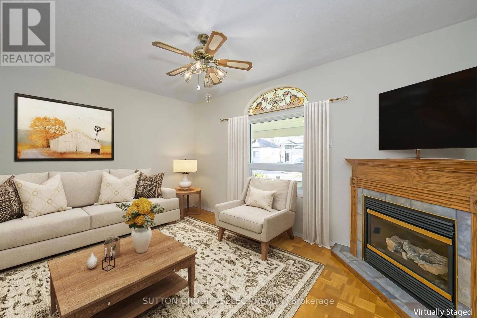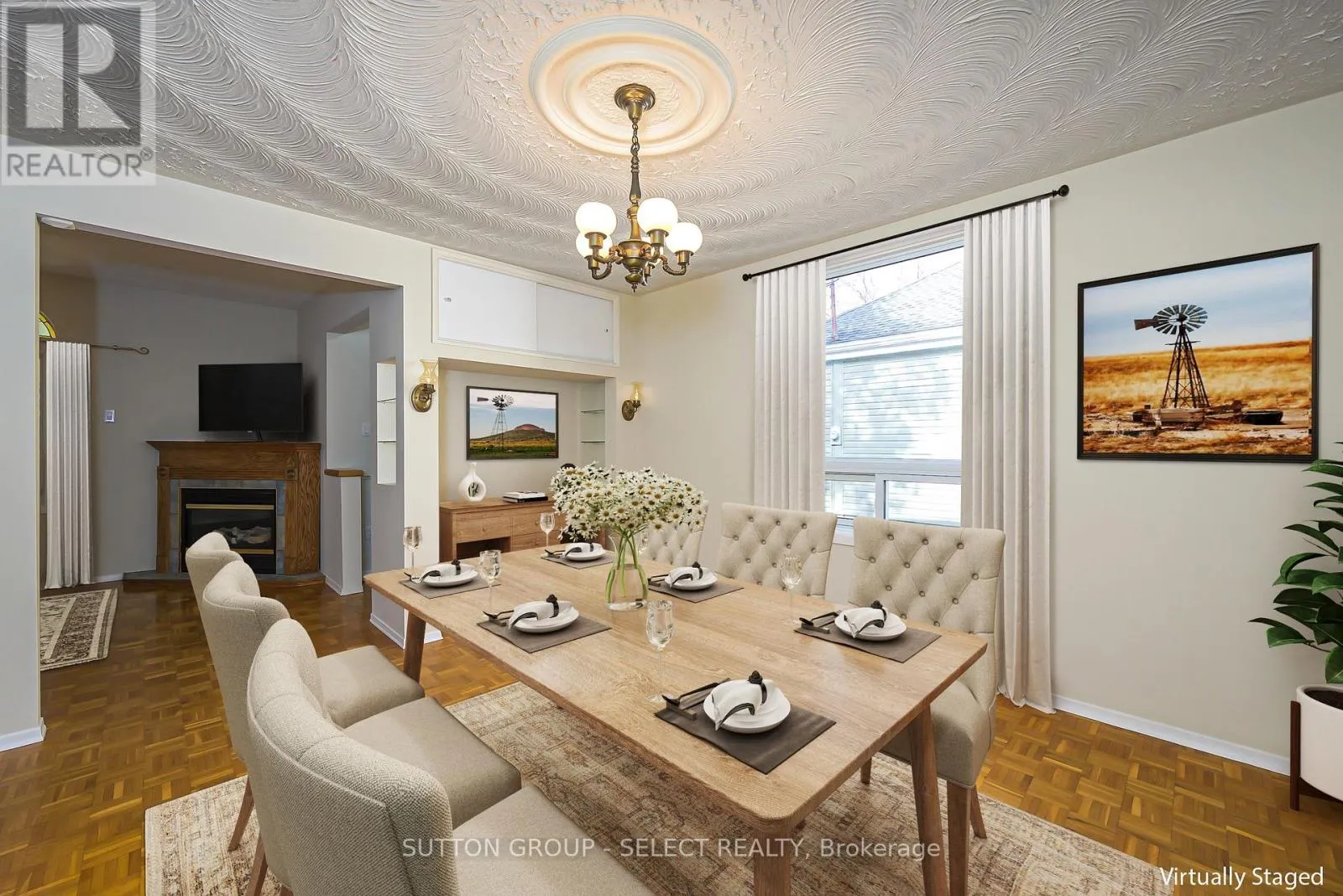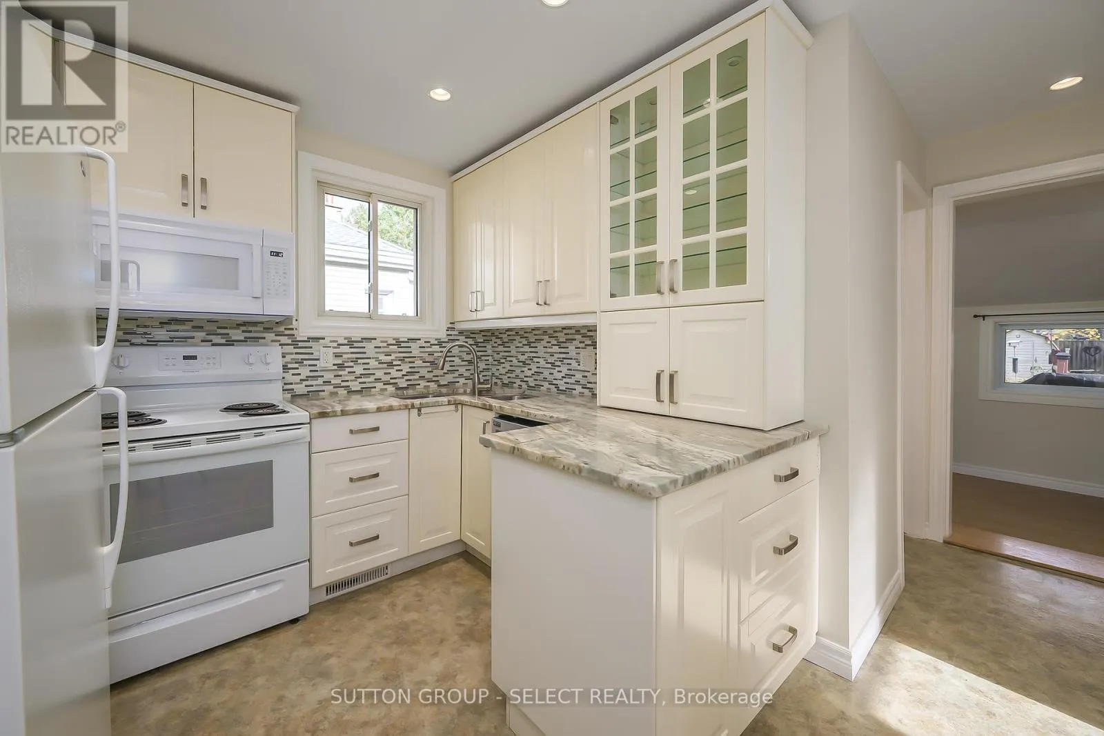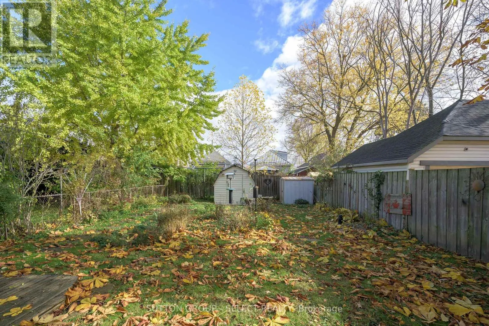 Cross Streets: Dundas Street East. ** Directions: Dorinda Street north from Dundas Street East. Move in ready bungalow in Old East! They don't get much better than this! This 2 bedroom, 1 bathroom bungalow is a sweet as they come. Freshly painted thru out, just move in & relax because everything is done! The cosy living room features a gas fireplace & large window w/ original stain glass transom overlooking the huge covered front porch. Well maintained parquet flooring in living room & the large dining room lend to the warmth & pride of ownership this home exudes. The dining room also features a large window allowing for plenty of light. The large primary bedroom has brand new carpeting and features a wall to wall closet & 2 large windows. The kitchen has been updated with warm white cabinetry & granite countertops, The smaller footprint has been maximized with clever pull outs & an efficient work triangle. The vented over the range microwave is new (never used), the dishwasher is newer. The corner stainless sink is provided with plenty of light from the nearby window. The second bedroom just off the kitchen features a generous closet and laminate flooring. The 4pc bath has been updated with a granite topped vanity, newer toilet & a bath fitter style bathub/shower with convenient grab bars. The mudroom features two large closets and overlooks the deep backyard. Laundry could be moved to mudroom from lower level.The exterior of the home is vinyl siding, Roof was replaced in 2021. The long concrete driveway leads to a 1-1/2 garage that is insulated & oversized (14' x 24-1/2') There are also two garden sheds on the property and room for a garden. The yard is fully fenced & features a recently painted wood deck and natural gas bbq. Laundry is in the lower level in the unfinished partial basement. The basement has been spray foamed for extra insulating value. The furnace was replaced in 2016, AC in 2015. Steps from the new Kellogg's entertainment complex, bus rapid transit, this low maintenance home is perfect for a young urban professional. (id:27476)