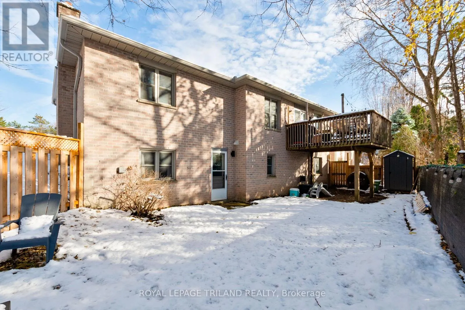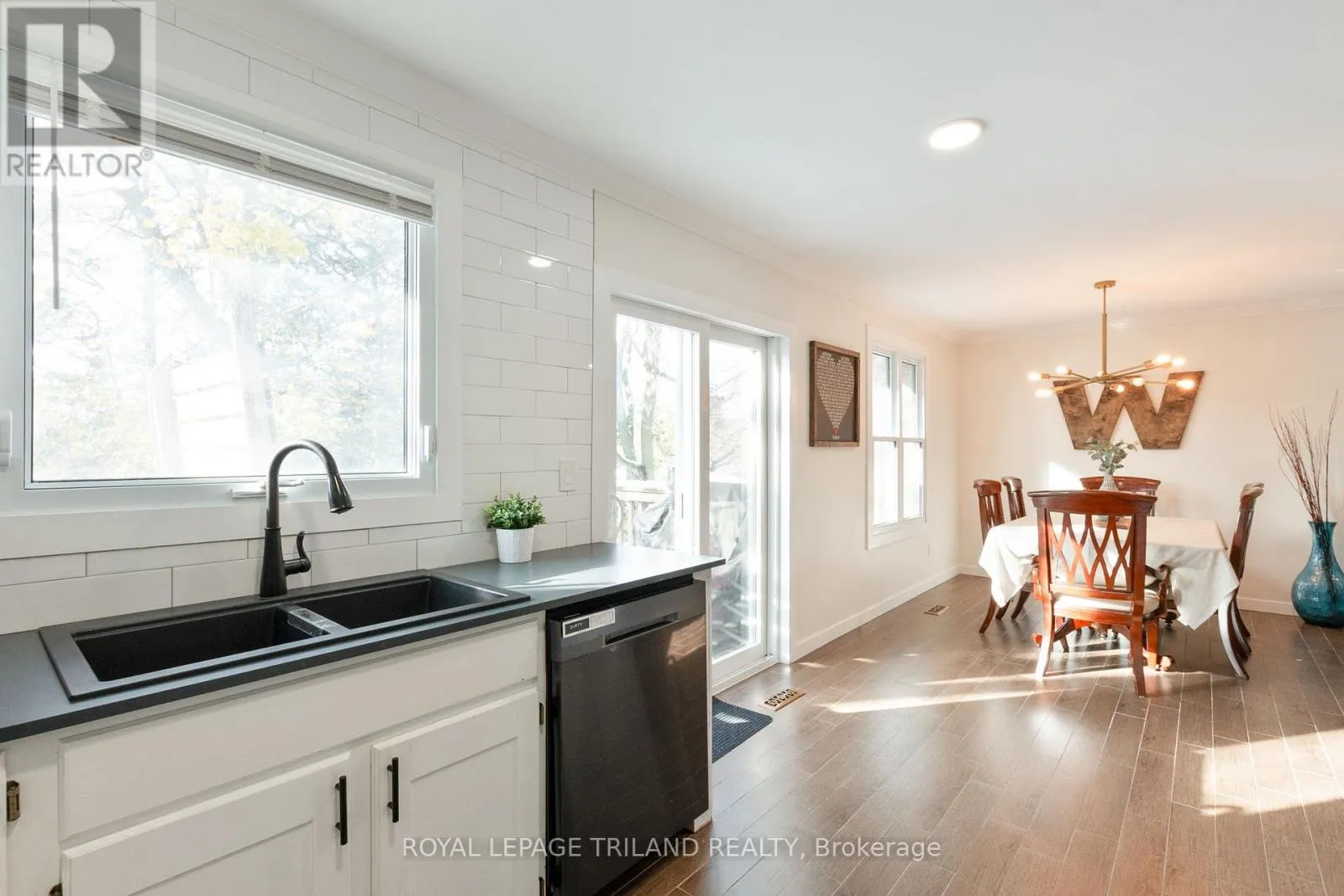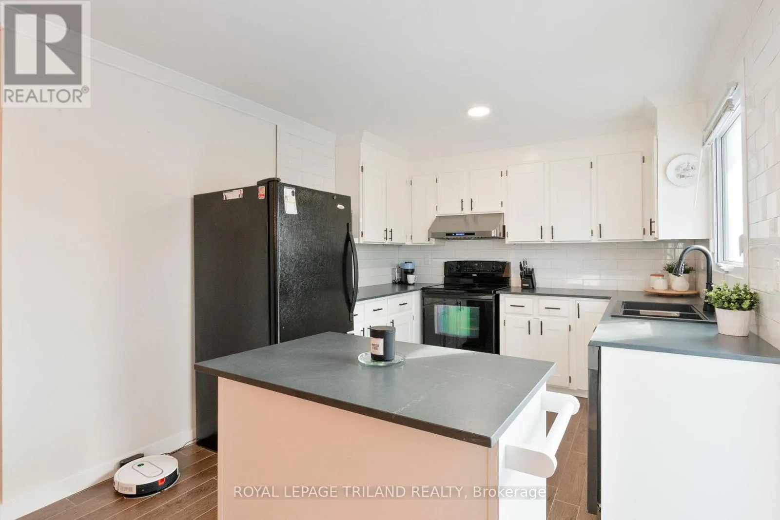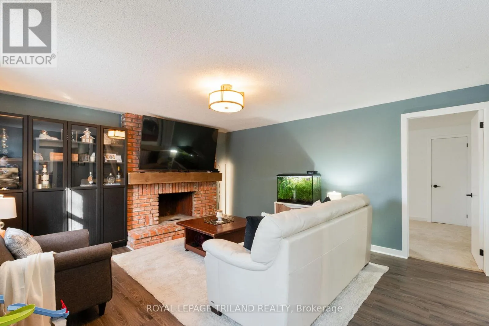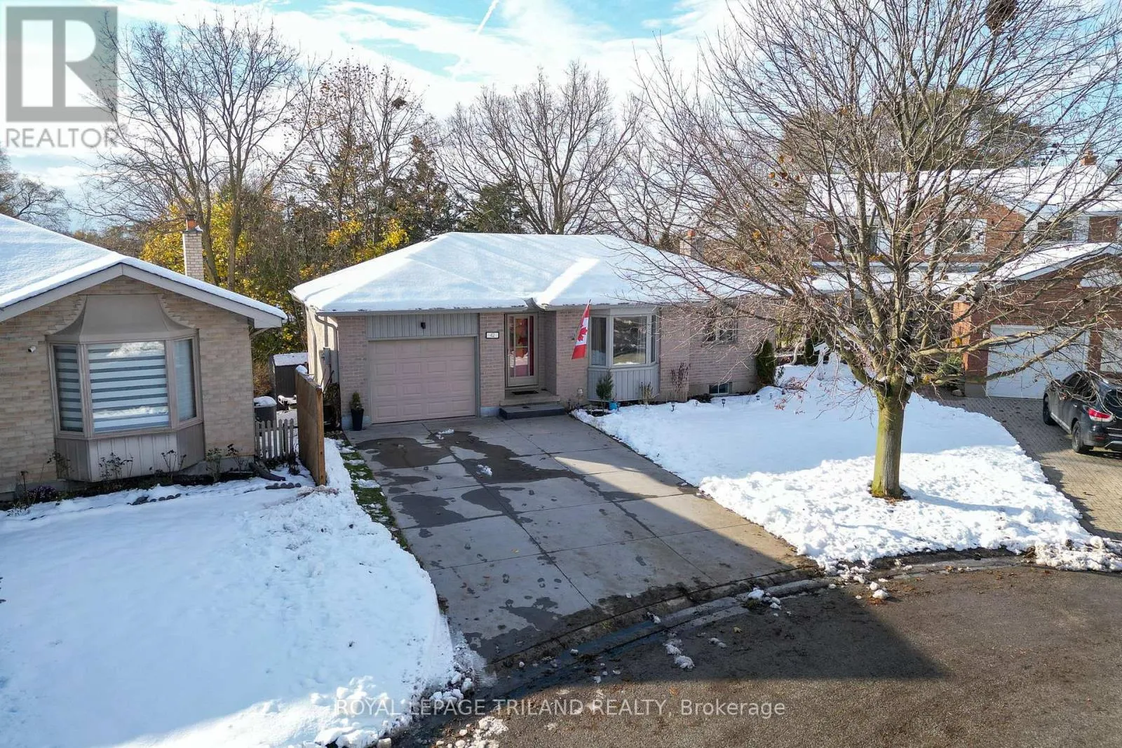 Cross Streets: BENEDICT CRT AND VICTORIA ST. ** Directions: Benedict Court & Victoria Street. Welcome to 42 Benedict Court, a beautifully updated all-brick 2+2 bedroom bungalow situated on a spacious pie-shaped lot at the end of a quiet, family-friendly court in Northeast London. With its versatile layout, walk-out lower level, and modern updates, this home is ideal for families, downsizers, or those seeking excellent in-law suite potential.An updated concrete driveway provides parking for up to four vehicles, paired with an insulated single-car garage with inside entry. Inside, the bright formal living room is filled with natural light from the east-facing updated bay window and finished in luxury vinyl plank flooring. The open-concept main level continues with wood-look tile flooring flowing into the dining area and updated kitchen, featuring white cabinetry, subway tile backsplash, Silestone quartz counters, a moveable island, and access to the elevated deck through an updated sliding door.The main floor offers two generous bedrooms and a fully renovated 5-piece bathroom with dual sinks, a quartz countertop, tiled tub surround, and a warm wood-accent ceiling detail. The fully finished walk-out lower level provides exceptional natural light with oversized above-grade windows. The welcoming family room features laminate flooring and a charming brick wood-burning fireplace. Two additional spacious bedrooms and an updated 3-piece bath make this level perfect for extended family or guests. With its separate entrance potential, this space offers outstanding in-law suite possibilities. A large laundry and storage area complete the level. Additional updates include new gutters around the entire home. Located minutes from downtown London, Western University, Fanshawe College, parks, schools, and major amenities, this home combines quiet court living with exceptional convenience. 42 Benedict Court is move-in ready and full of potential. Don't miss it! (id:27476)