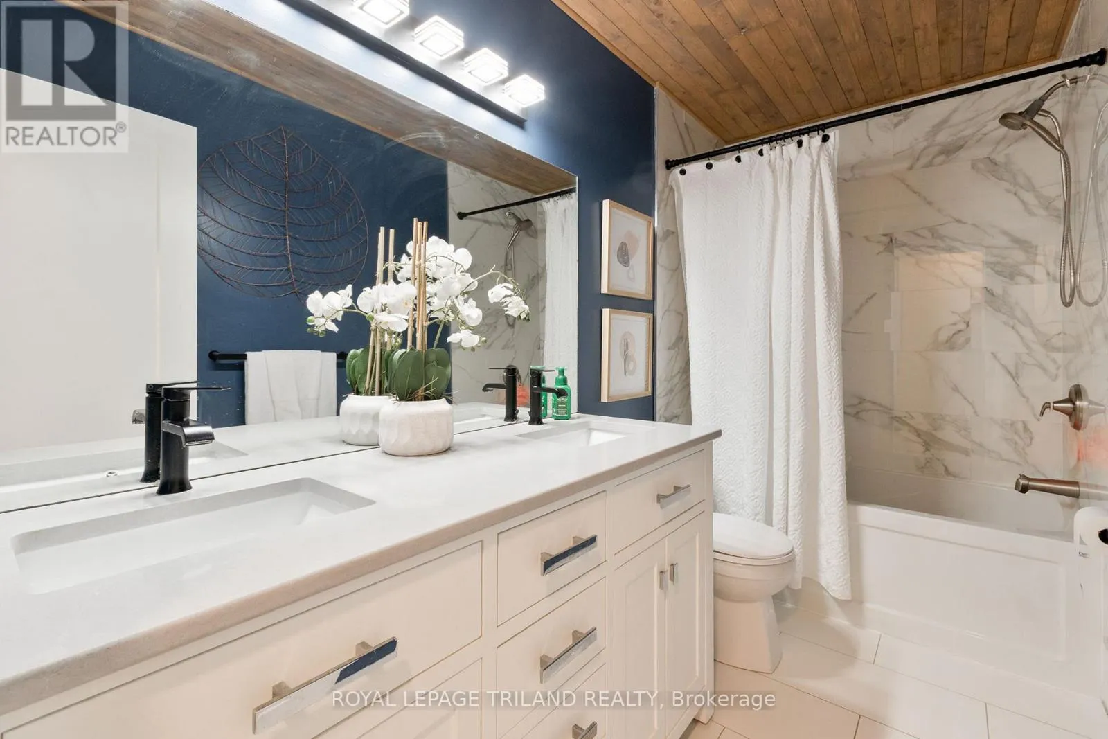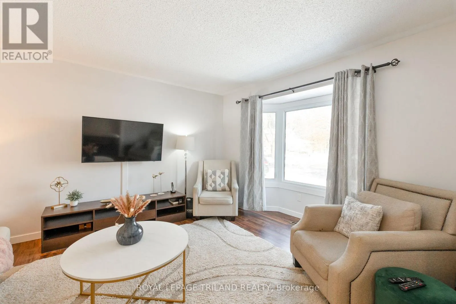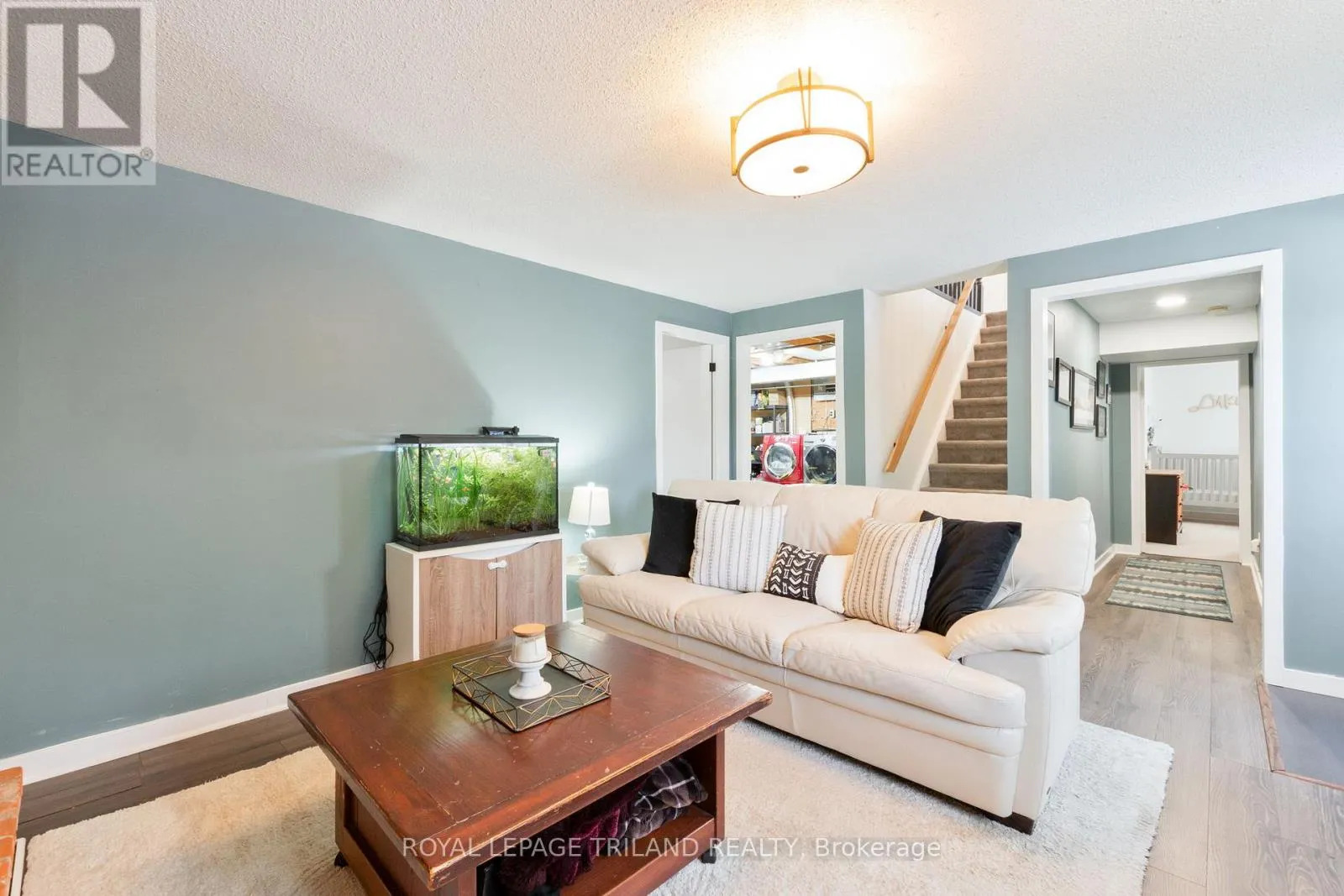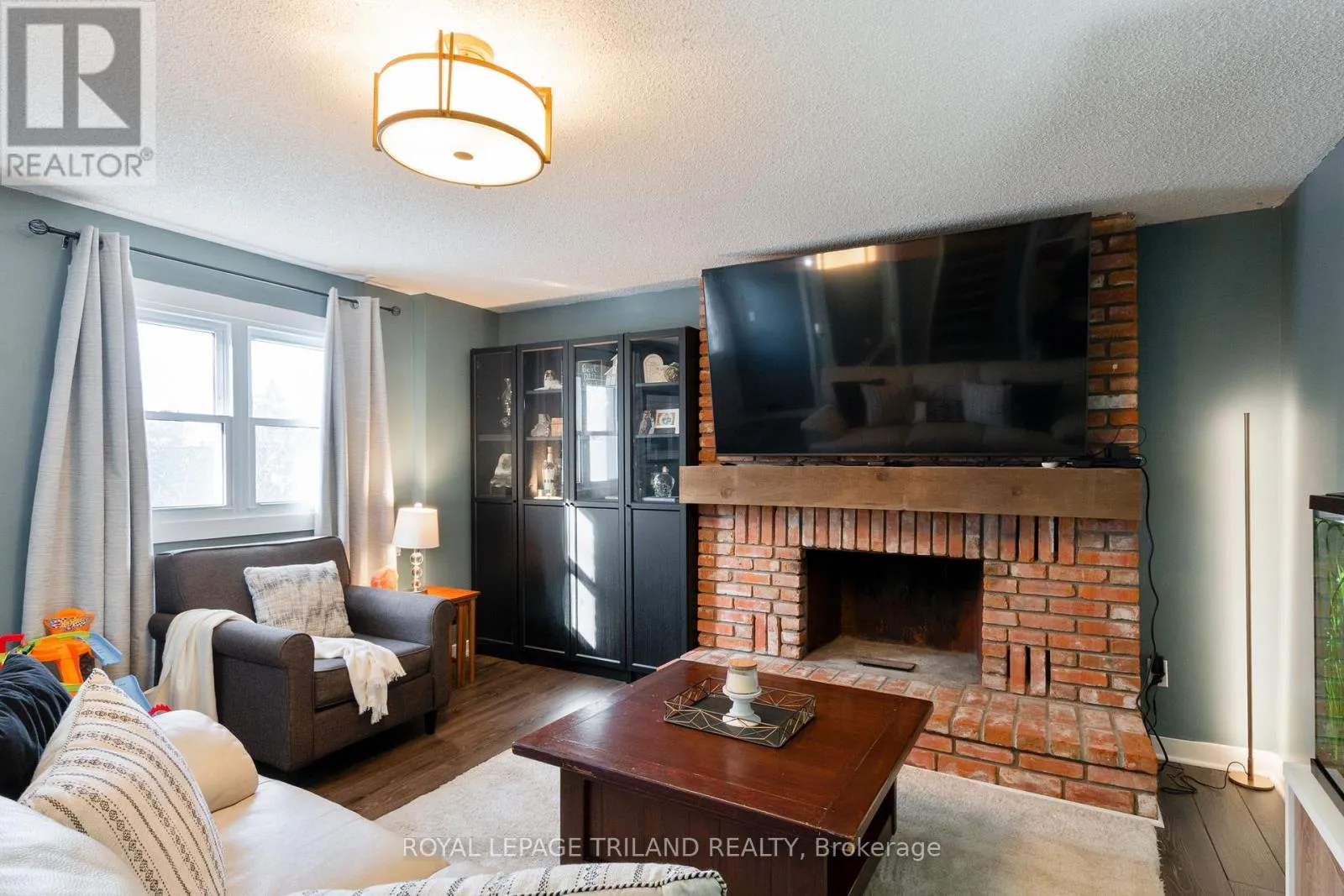 Cross Streets: BENEDICT CRT AND VICTORIA ST. ** Directions: Benedict Court & Victoria Street. Welcome to 42 Benedict Court, a beautifully updated all-brick 2+2 bedroom bungalow situated on a spacious pie-shaped lot at the end of a quiet, family-friendly court in Northeast London. With its versatile layout, walk-out lower level, and modern updates, this home is ideal for families, downsizers, or those seeking excellent in-law suite potential.An updated concrete driveway provides parking for up to four vehicles, paired with an insulated single-car garage with inside entry. Inside, the bright formal living room is filled with natural light from the east-facing updated bay window and finished in luxury vinyl plank flooring. The open-concept main level continues with wood-look tile flooring flowing into the dining area and updated kitchen, featuring white cabinetry, subway tile backsplash, Silestone quartz counters, a moveable island, and access to the elevated deck through an updated sliding door.The main floor offers two generous bedrooms and a fully renovated 5-piece bathroom with dual sinks, a quartz countertop, tiled tub surround, and a warm wood-accent ceiling detail. The fully finished walk-out lower level provides exceptional natural light with oversized above-grade windows. The welcoming family room features laminate flooring and a charming brick wood-burning fireplace. Two additional spacious bedrooms and an updated 3-piece bath make this level perfect for extended family or guests. With its separate entrance potential, this space offers outstanding in-law suite possibilities. A large laundry and storage area complete the level. Additional updates include new gutters around the entire home. Located minutes from downtown London, Western University, Fanshawe College, parks, schools, and major amenities, this home combines quiet court living with exceptional convenience. 42 Benedict Court is move-in ready and full of potential. Don't miss it! (id:27476)
