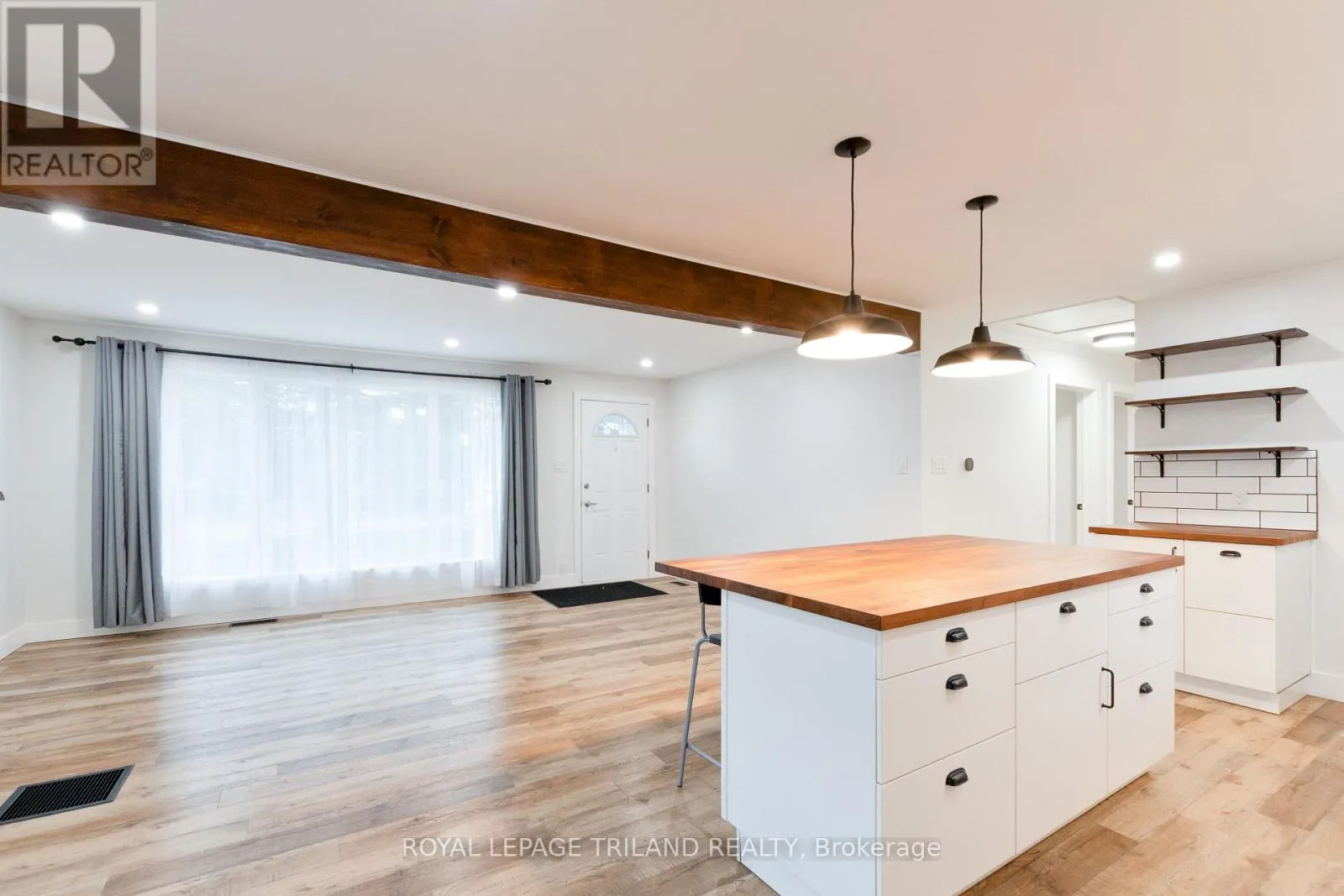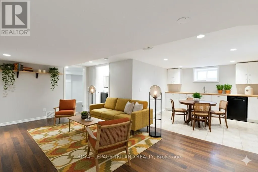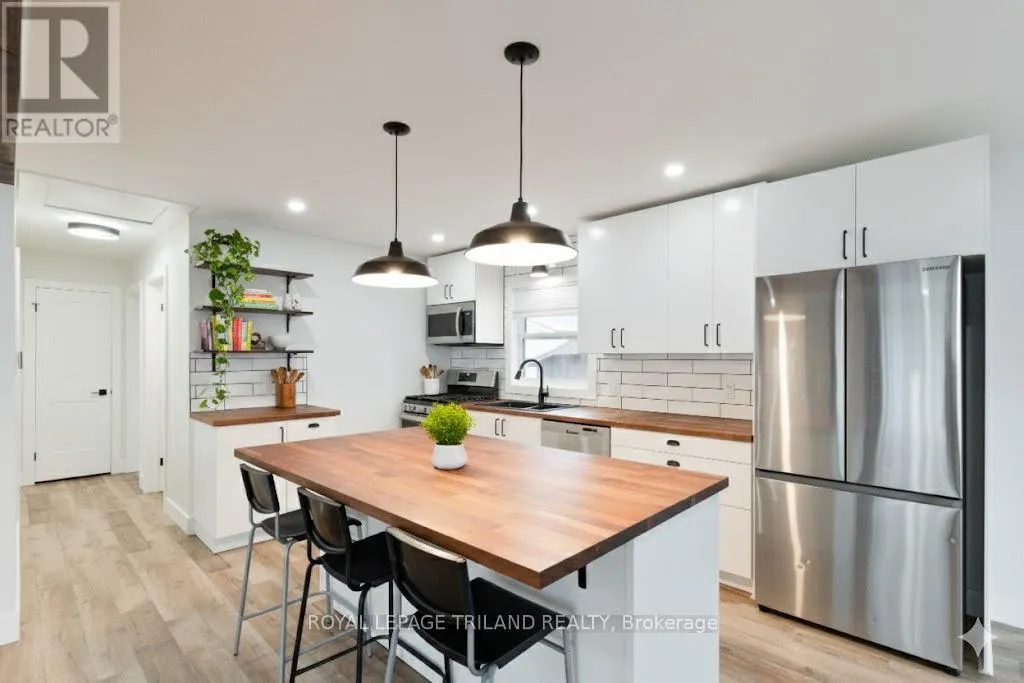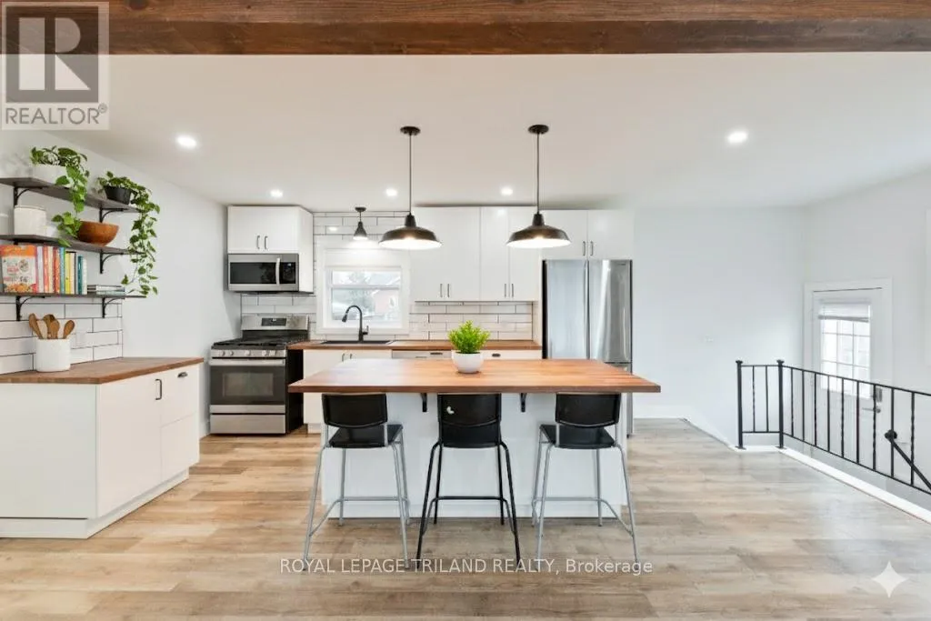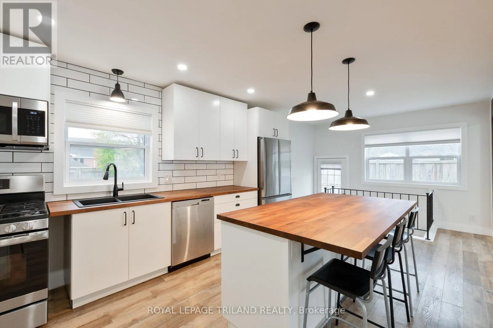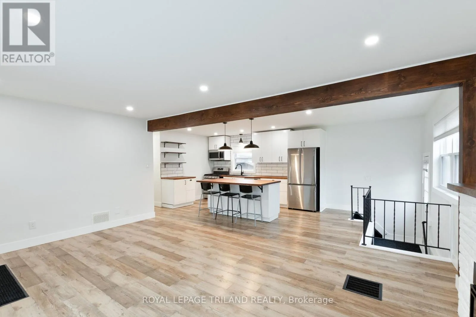 Cross Streets: McNay. ** Directions: North on Barker from Oxford or from McNay head west , right on Barker, home in on your left. Modernized Ranch with In-Law Suite Potential in Prime Carling Heights. Welcome home to 167 Barker street, a stunningly updated 3+1 bedroom, 2-full bath ranch nestled on a quiet street in highly desirable North-East London. Designed for modern living and exceptional flexibility, this home is truly turnkey and ready for its next owners. The open-concept main floor immediately captures attention, defined by a dark, rich wood beam that artfully separates the living area and the chef-inspired kitchen. Recent 2021 updates transformed this space with brand-new flooring, sleek pot lights, and an electric fireplace that provides both ambiance and warmth. The kitchen is a true showpiece, boasting stainless steel appliances, modern floating shelves, pendant lights over the island, a stylish backsplash, and a cutting-board-style countertop. Financial flexibility awaits on the lower level, which is perfectly set up as a kitchenette/wet bar with its own full bathroom, living space, and bedroom-ideal for a "granny suite," roommates, or a fantastic entertainment zone. Major updates are handled, including a furnace replaced in 2020 and shingles currently being completed. This home is an excellent opportunity for first-time buyers seeking affordability, families looking to share space, or those downsizing without sacrificing style. All appliances are included: full-size main-floor fridge, stove, microwave, dishwasher, washer, dryer, mini fridge, chest freezer, and central vac. The backyard is fenced, offering a private outdoor retreat.Don't miss the chance to own this move-in-ready gem where the big-ticket items are done and the style is already set! Call today to book your private tour and make this flexible, modern ranch your new address! Note: some images have been virtually staged. (id:27476)