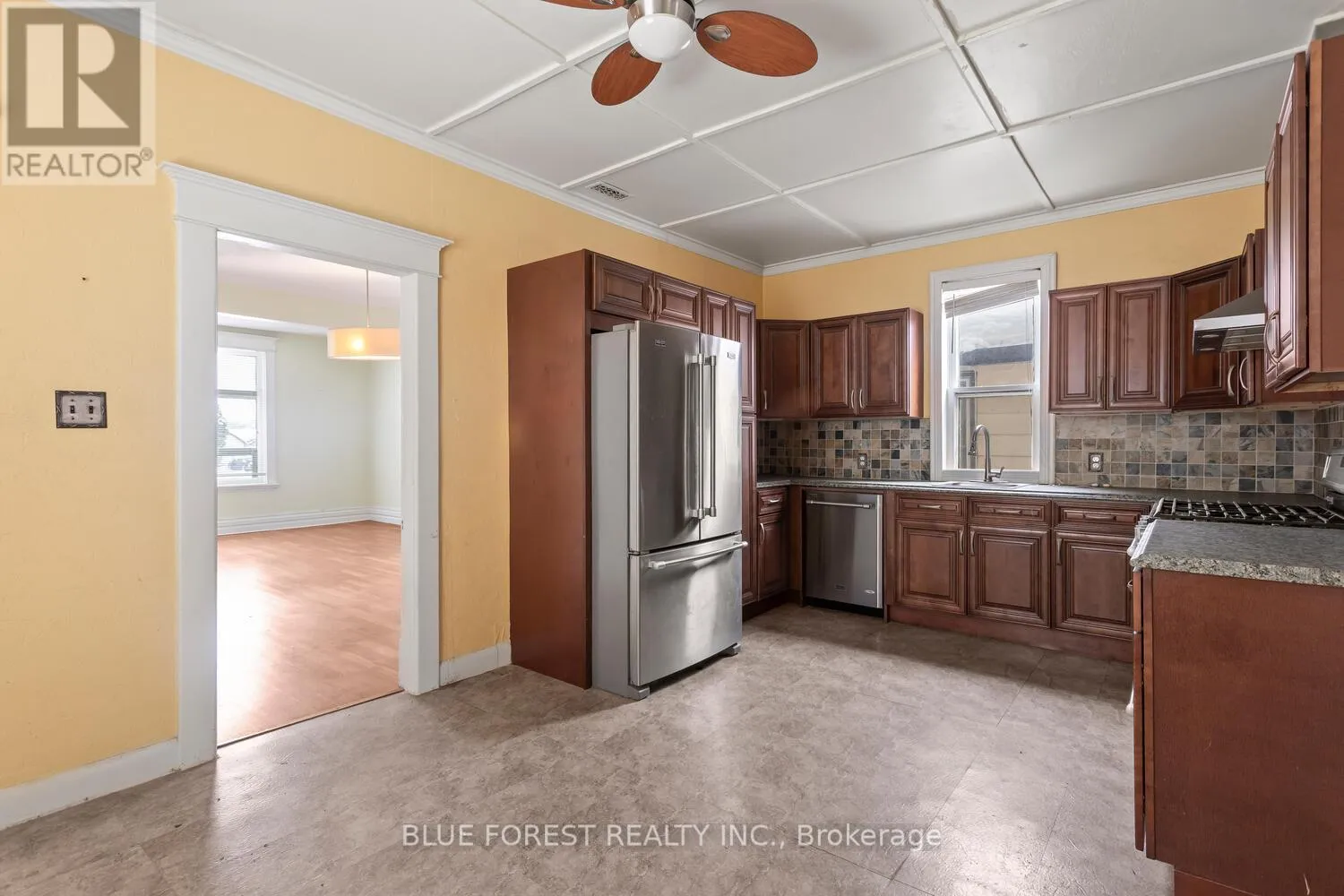Cross Streets: DUNDAS/SPRUCE. ** Directions: HEADING EAST ON DUNDAS TURN RIGHT ONTO SPRUCE-HOUE ON LEFT. Brick home in mature East London neighbourhood. Large living and dining rooms. Newer kitchen cabinets with pantry. Three bedrooms on upper level. Two baths. Basement suitable for storage. Covered deck overlooks the treed yard. Detached garage and ample parking. Convenient location-close to schools, transportation and shopping. Quick possession available. Sold As is. (id:27476)
