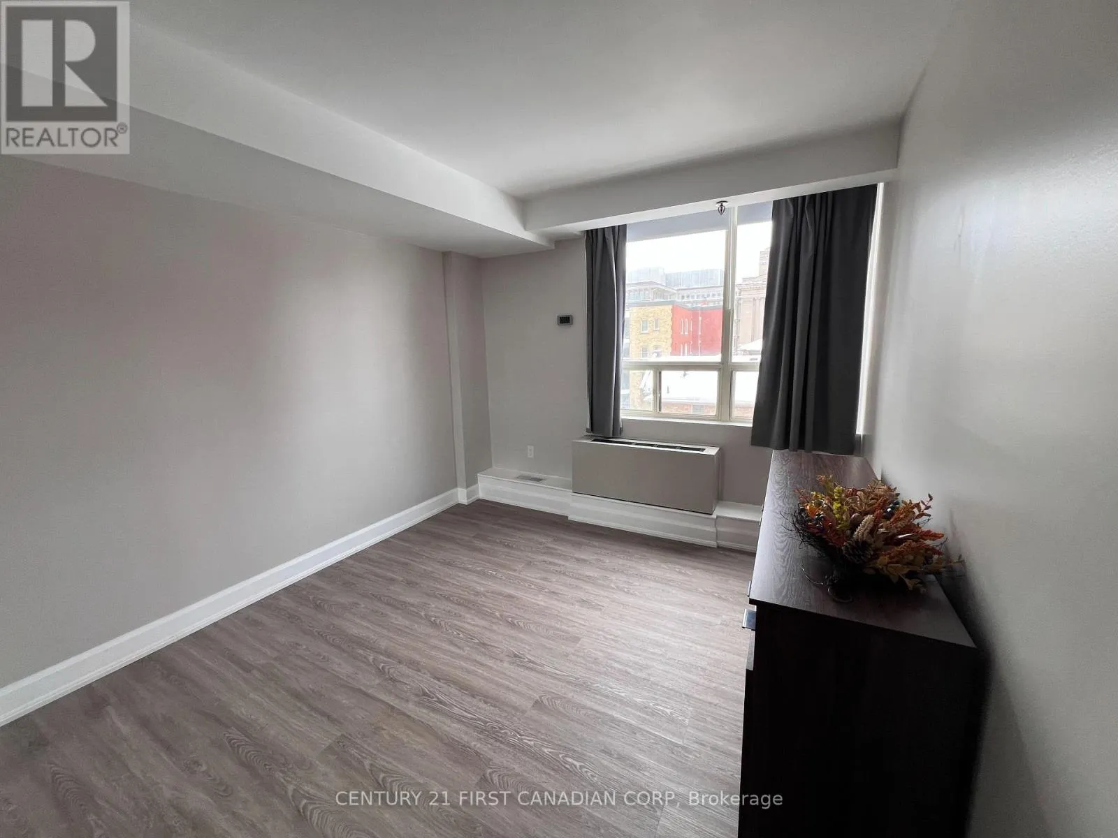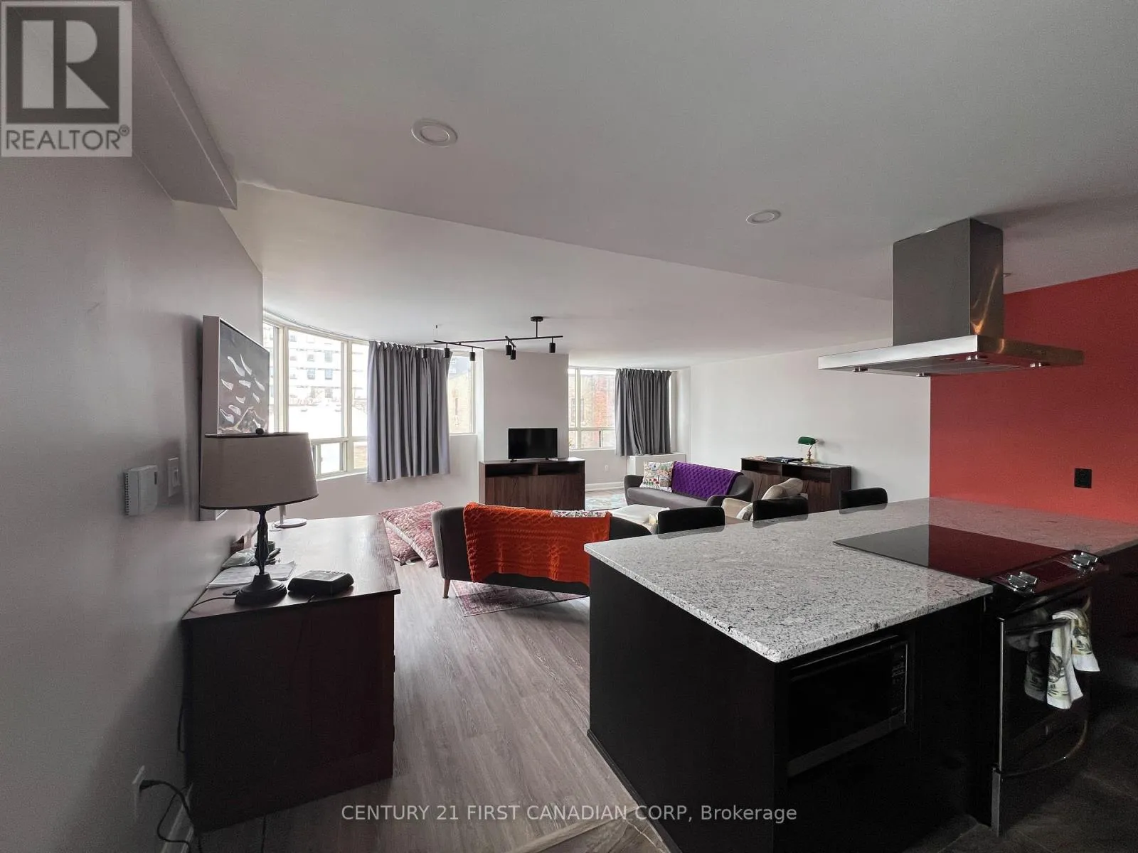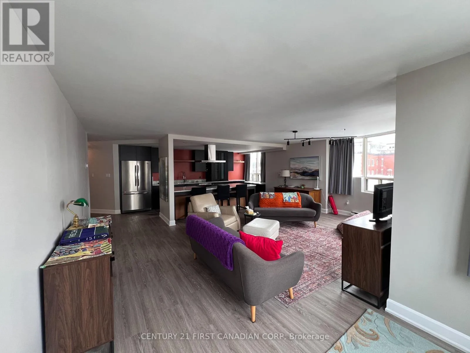 Cross Streets: QUEEN. ** Directions: From Dundas St & Wellington St, go east on Wellington St, turn right onto Dufferin Ave, then right onto Picton St. Enter the parking lot on the right.Queens Ave. Experience the convenience of downtown living in this fully updated fourth-floor apartment. Offering two generous bedrooms and two full bathrooms, this bright unit has been thoughtfully refreshed with new flooring, fresh paint, and a contemporary kitchen featuring granite countertops. Large windows provide plenty of natural light along with views of downtown London and the neighbouring historic church. Step outside and enjoy being just minutes from Victoria Park, local shops, restaurants, and public transit. The well-managed, secure building offers excellent amenities, including an indoor pool, a rooftop patio ideal for relaxing or entertaining, and a private entertainment suite that can be reserved for gatherings or overnight guests. Whether you're looking to downsize or settle into a vibrant urban lifestyle, this home delivers comfort, style, and unbeatable location. (id:27476)