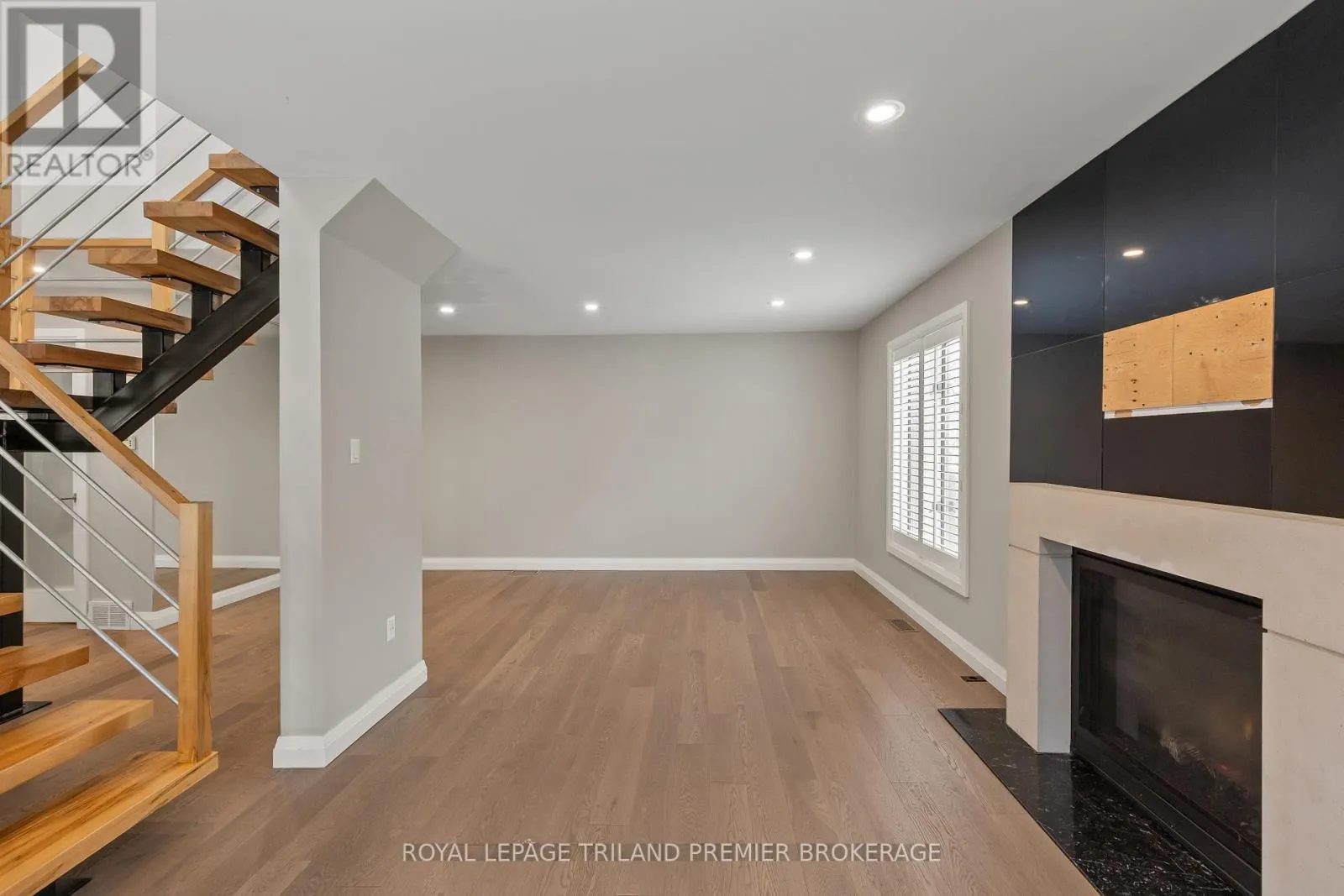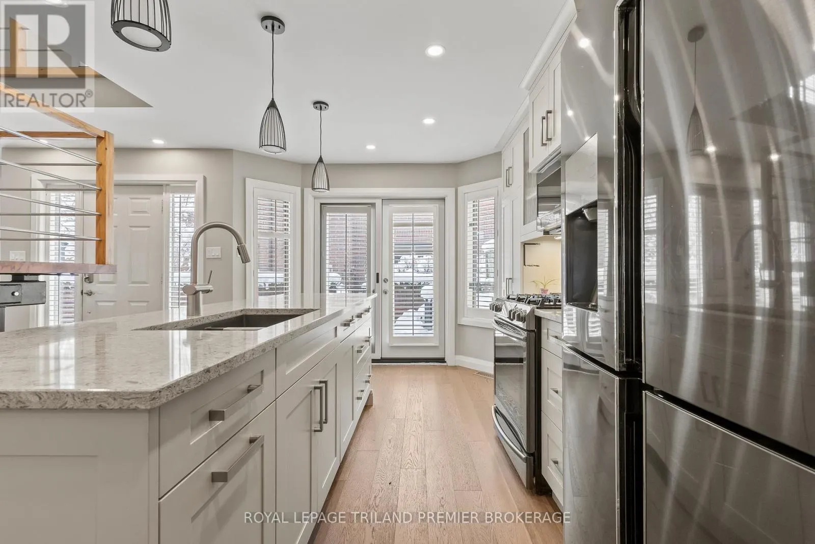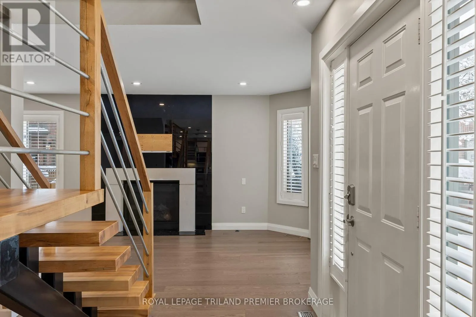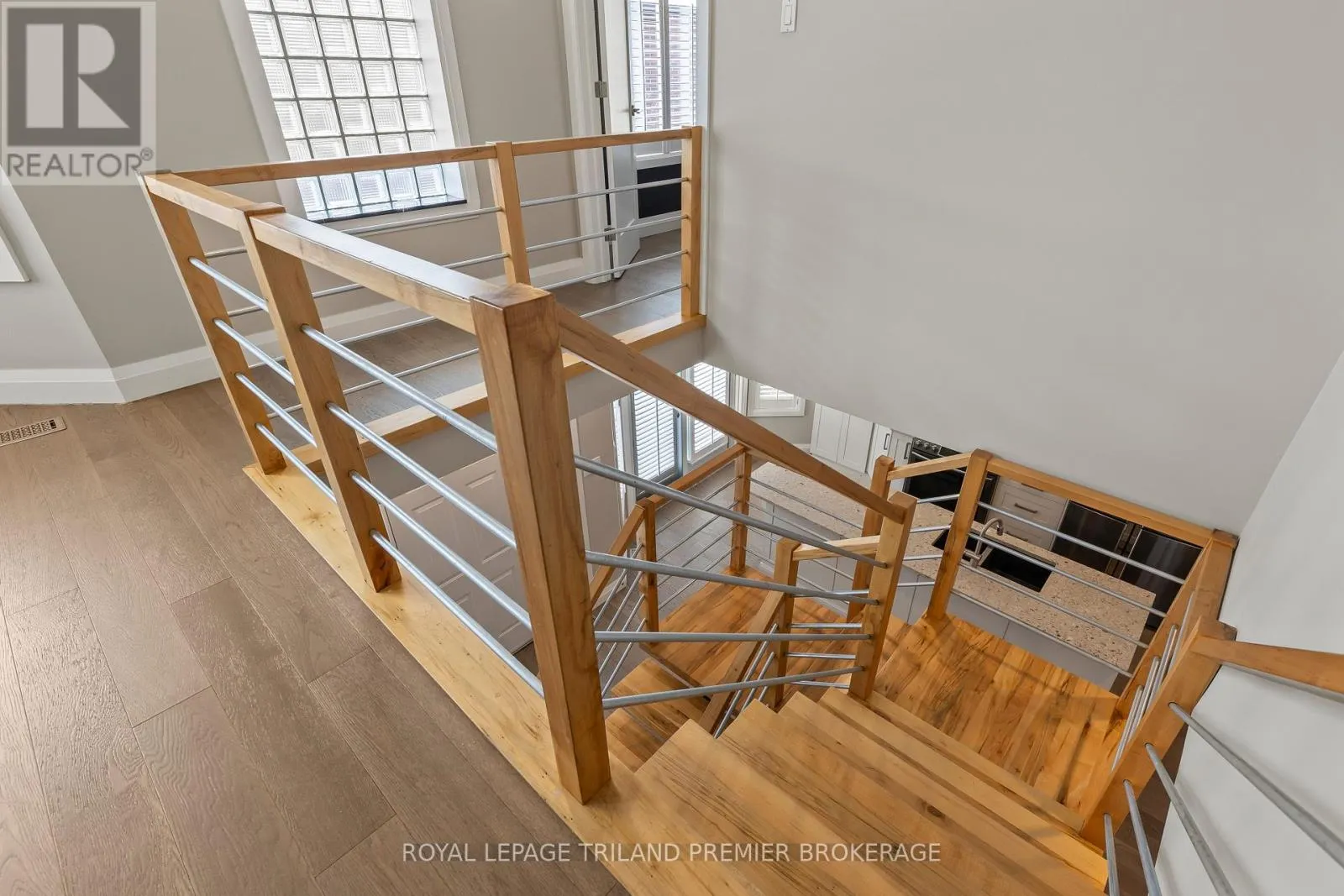 ON ALBERT BETWEEN TALBOT AND RICHMOND STREET Welcome to this exceptional and contemporary multi-level condominium, located in a private enclave just steps from Richmond Row in the heart of Downtown London. Inside, you'll find a fully updated and thoughtfully designed unit featuring an open-concept main level with a spacious kitchen complete with abundant cabinetry, granite countertops, stainless steel appliances, and a large island with breakfast bar. The main floor also includes a convenient 2-piece bathroom and an expansive great room highlighted by a gas fireplace and direct access to your private courtyard-an ideal space for relaxing or entertaining. The modern open-riser hardwood staircase leads to the upper level, which offers two generous bedrooms, each with its own updated 3-piece ensuite. A bright loft area with custom built-ins provides an excellent flex space, perfect for a home office or bright reading space. The fully finished lower level includes an additional family room with an updated 3-piece bathroom, as well as a mudroom with direct access to the underground parking garage (2 parking spaces)-an outstanding feature rarely found in condo living. Enjoy immediate access to London's finest dining, shopping, markets, theatres, arenas, parks, and all the vibrancy downtown living has to offer. This impressive home is the perfect opportunity for buyers seeking style, convenience, and an unparalleled downtown lifestyle. (id:27476)