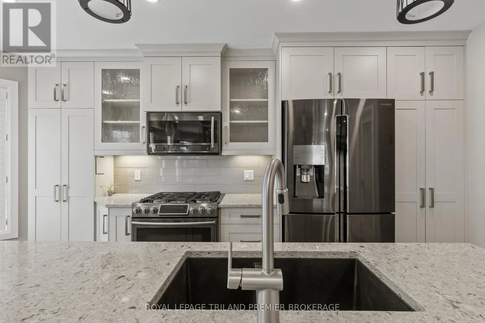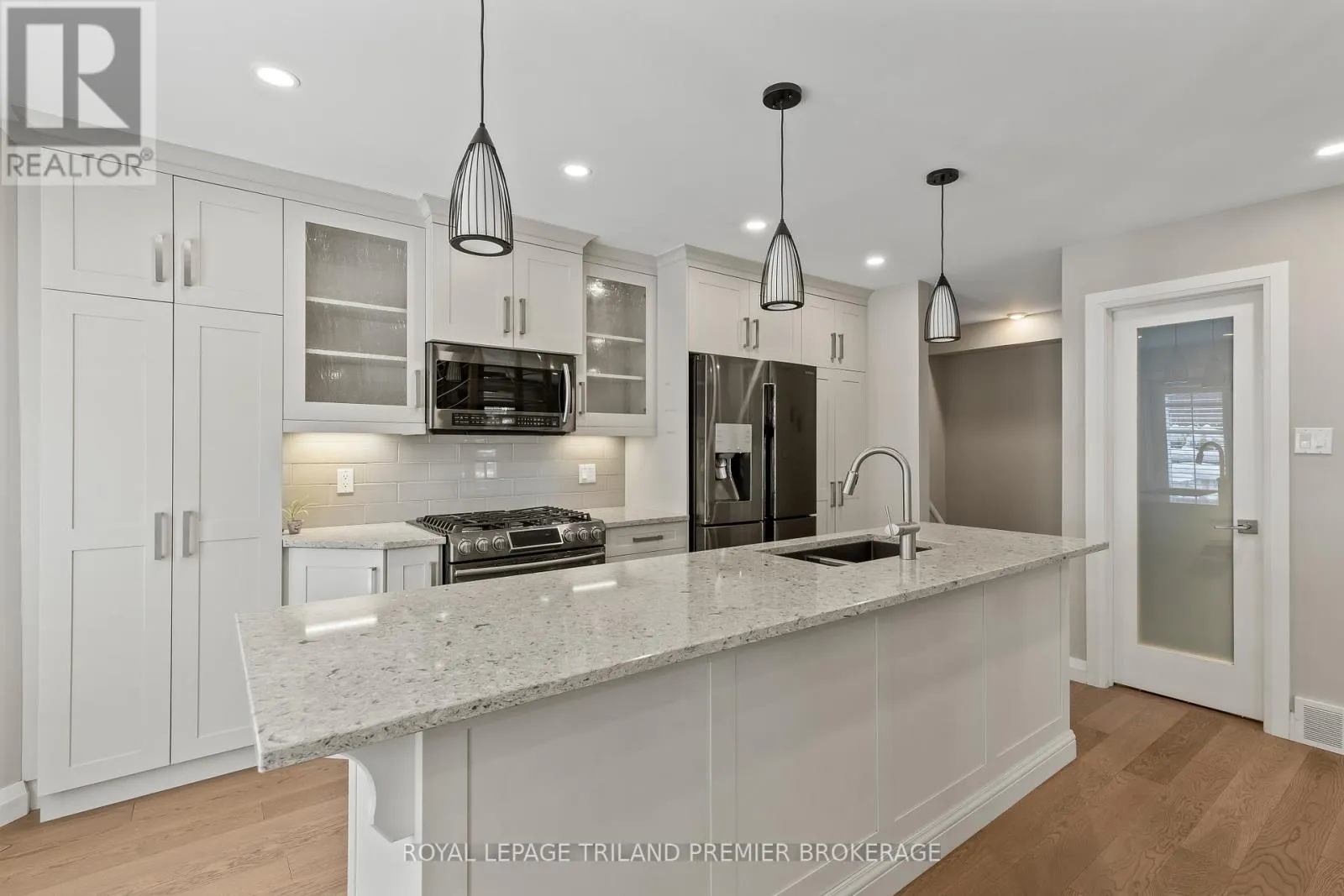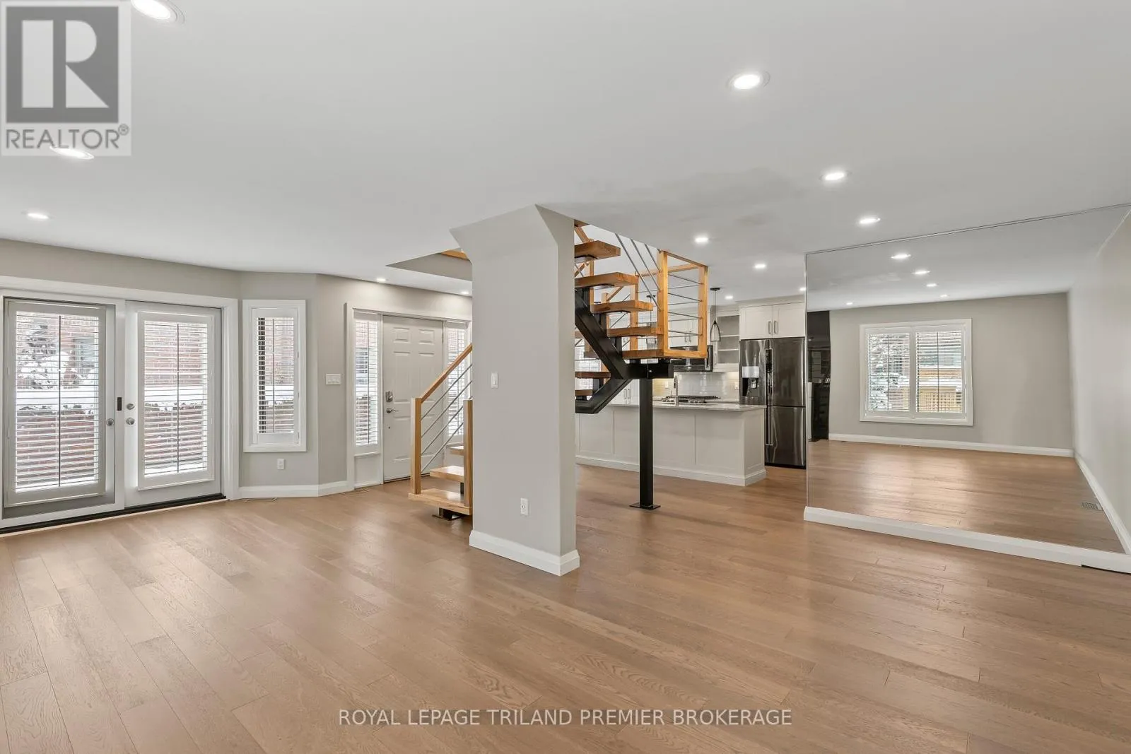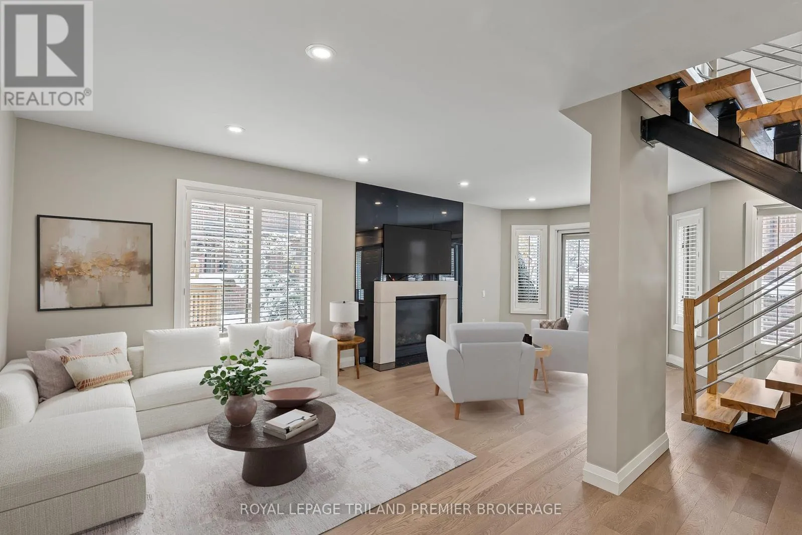 ON ALBERT BETWEEN TALBOT AND RICHMOND STREET Welcome to this exceptional and contemporary multi-level condominium, located in a private enclave just steps from Richmond Row in the heart of Downtown London. Inside, you'll find a fully updated and thoughtfully designed unit featuring an open-concept main level with a spacious kitchen complete with abundant cabinetry, granite countertops, stainless steel appliances, and a large island with breakfast bar. The main floor also includes a convenient 2-piece bathroom and an expansive great room highlighted by a gas fireplace and direct access to your private courtyard-an ideal space for relaxing or entertaining. The modern open-riser hardwood staircase leads to the upper level, which offers two generous bedrooms, each with its own updated 3-piece ensuite. A bright loft area with custom built-ins provides an excellent flex space, perfect for a home office or bright reading space. The fully finished lower level includes an additional family room with an updated 3-piece bathroom, as well as a mudroom with direct access to the underground parking garage (2 parking spaces)-an outstanding feature rarely found in condo living. Enjoy immediate access to London's finest dining, shopping, markets, theatres, arenas, parks, and all the vibrancy downtown living has to offer. This impressive home is the perfect opportunity for buyers seeking style, convenience, and an unparalleled downtown lifestyle. (id:27476)