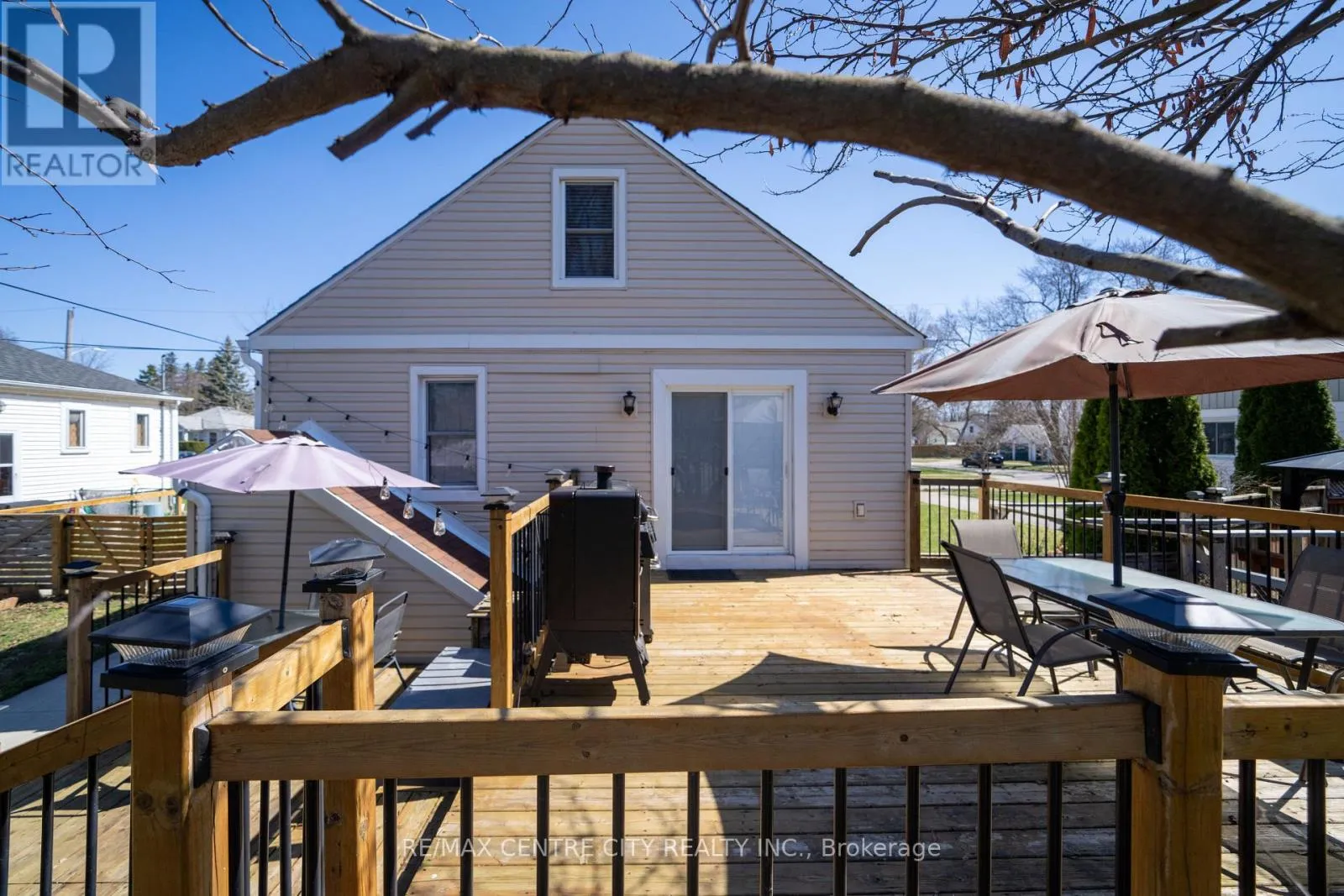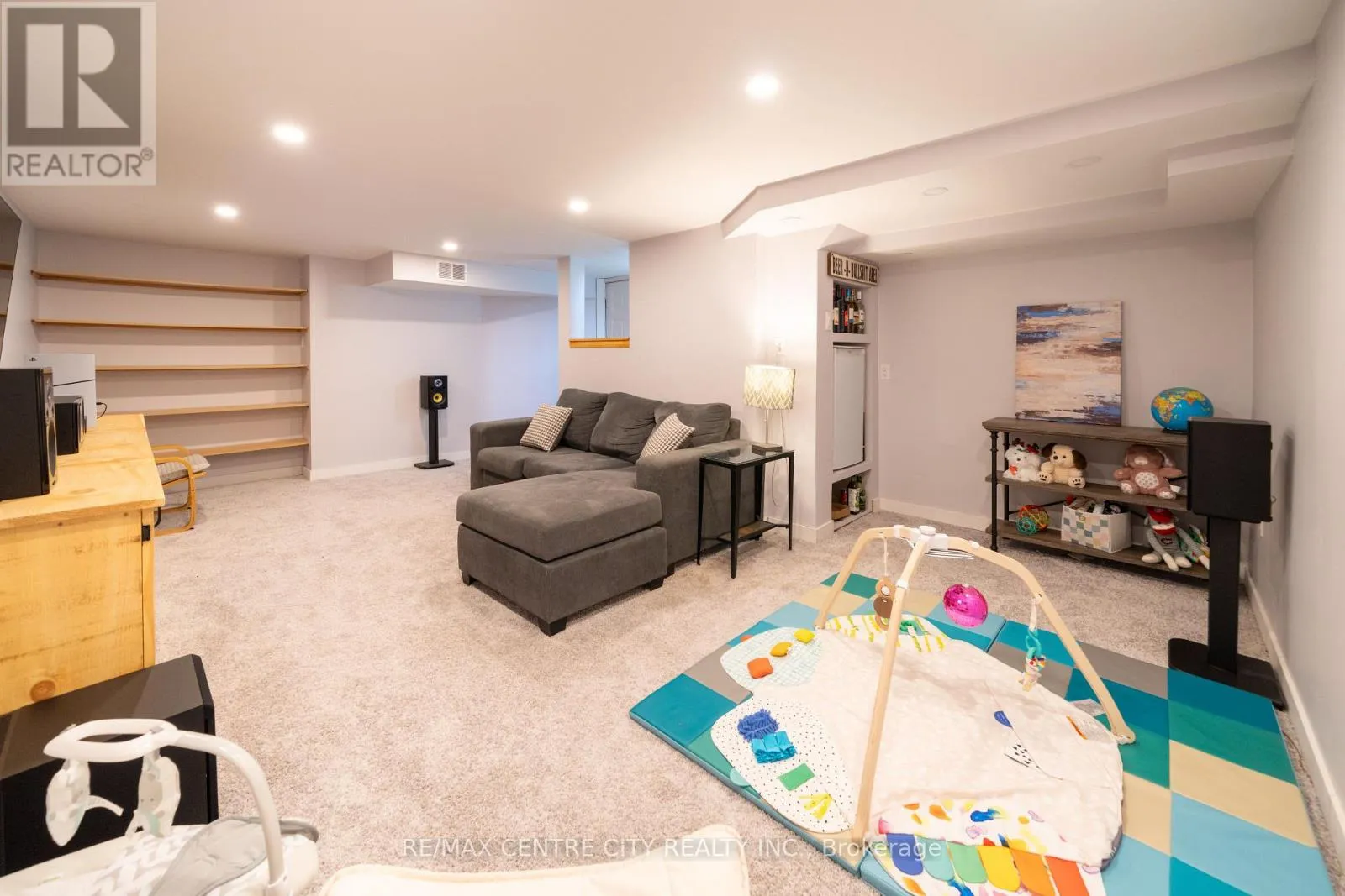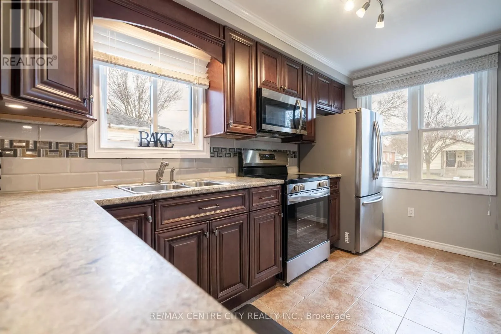 Cross Streets: OXFORD AND STRAND. ** Directions: FROM OXFORD ST. E TURN SOUTH ONTO STRAND, HOUSE IS ON RIGHT BEFORE PICCADILLY ST. Well-kept home on an oversized lot . Charming 1.5-storey brick home located in a quiet, family-friendly neighbourhood close to schools, parks, amenities, bus routes, and Fanshawe College. This move-in-ready property sits on a large 60 ft x 120 ft lot and features an updated kitchen with solid wood cabinets, a bright living room, two main-floor bedrooms, and a 4-piece bathroom with a jetted tub. The primary bedroom includes patio doors leading to a spacious 2-tier deck. The second floor offers an additional bedroom and a bonus area that can function as a primary suite or flexible living space. The recently finished lower level includes a separate entrance from the side of the house, family room, 2-piece bathroom, and laundry room. Outside, you'll find a large concrete driveway with ample parking for 6 vehicle , a fully fenced yard with wide gate access, and two garden sheds. Shingles were replaced in 2019. A solid home in a central location with plenty of potential. (id:27476)