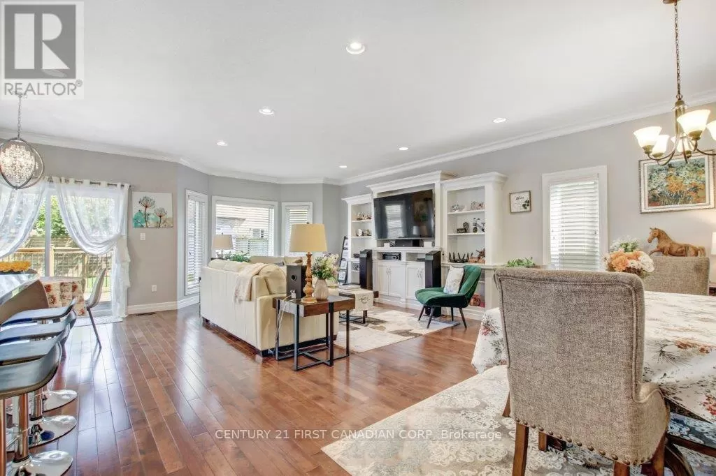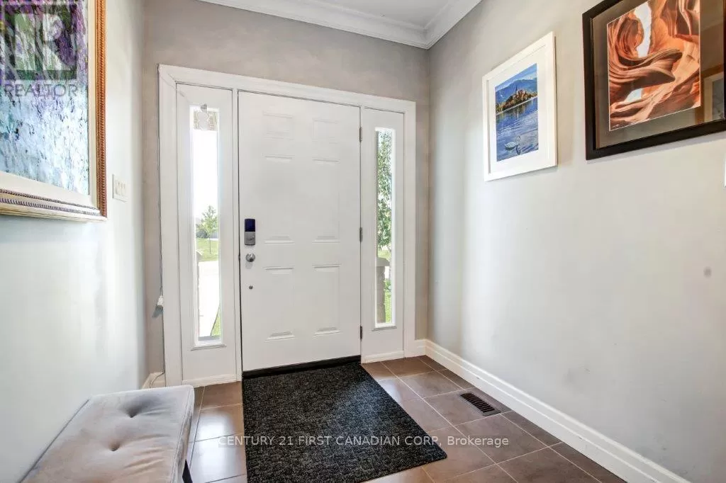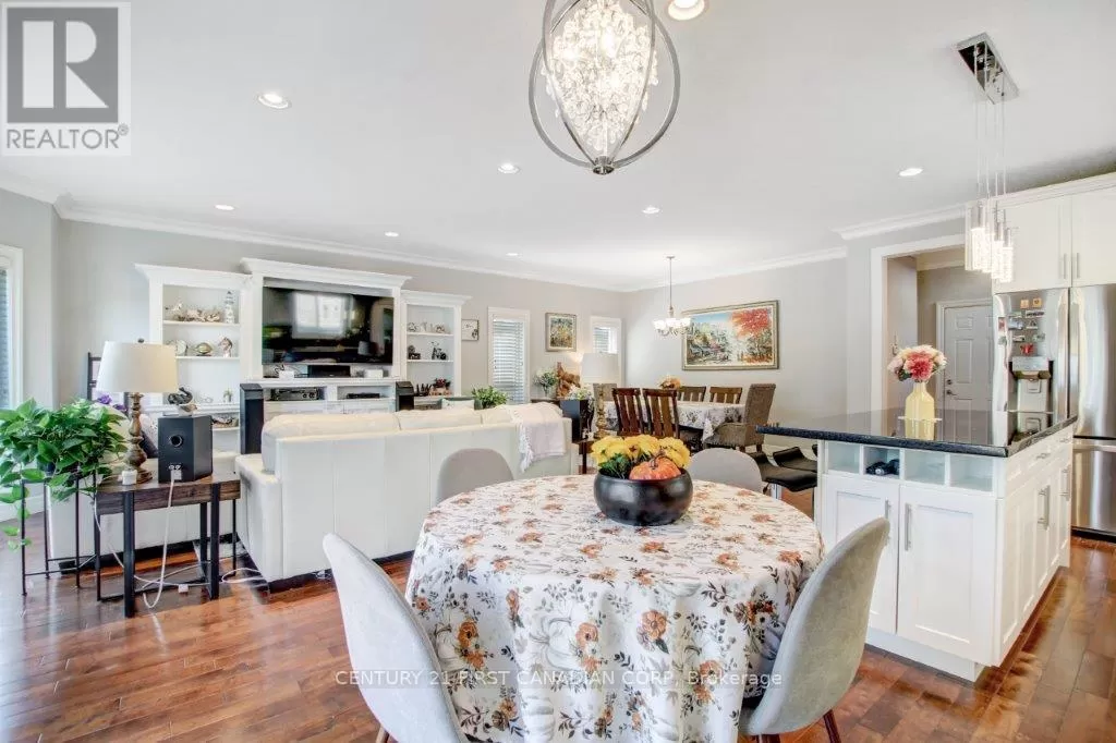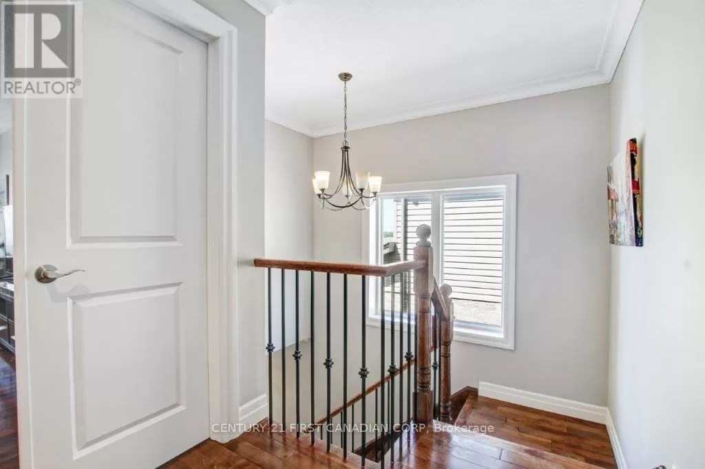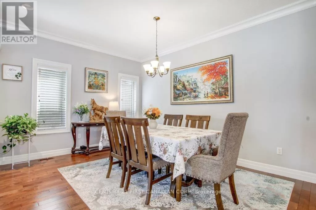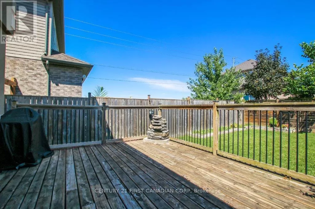 Sarnia Road to Cherrywood Trail Welcome to this stunning 2-Storey home, featuring 4 bedrooms and 3.5 bathrooms, ideally situated in the desirable Hyde Park community. The exterior boasts an elegant combination of stone and stucco on the front, complemented by brick and stucco on both sides, with a concrete driveway. Inside, the main floor offers 9-foot ceilings and an open-concept kitchen, complete with a walk-in pantry and granite countertops. The eating area seamlessly transitions to a spacious deck, perfect for outdoor entertaining. The second floor features an oversized master bedroom with double doors, a vaulted ceiling, and large windows that fill the room with natural light. It also includes a custom walk-in closet and a large ensuite bathroom. The three additional generous bedrooms are bright and inviting, and a convenient laundry room is also located on this floor. Both the main and second levels come with hardwood floors and crown molding. The fully finished basement provides additional living space with a large recreation room, an electric fireplace, a wet bar, and a three-piece bathroom. This home is in an amazing location, at the heart of a growing and family-friendly community in London, close to schools, parks, shopping, and all major amenities. (id:27476)