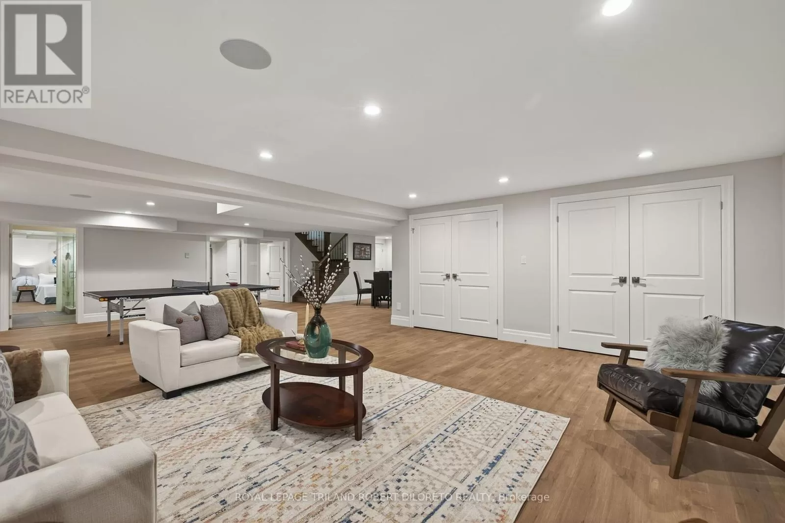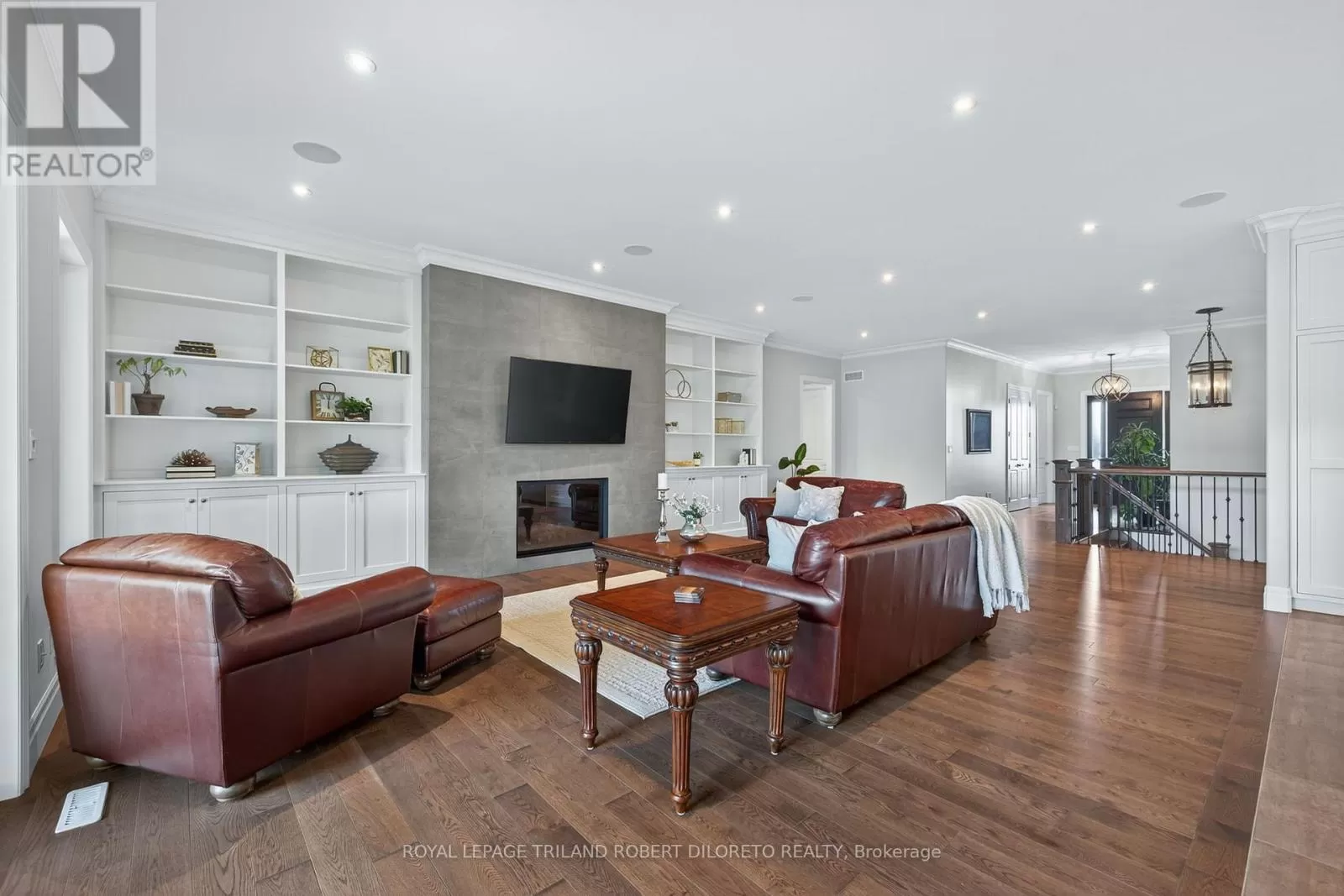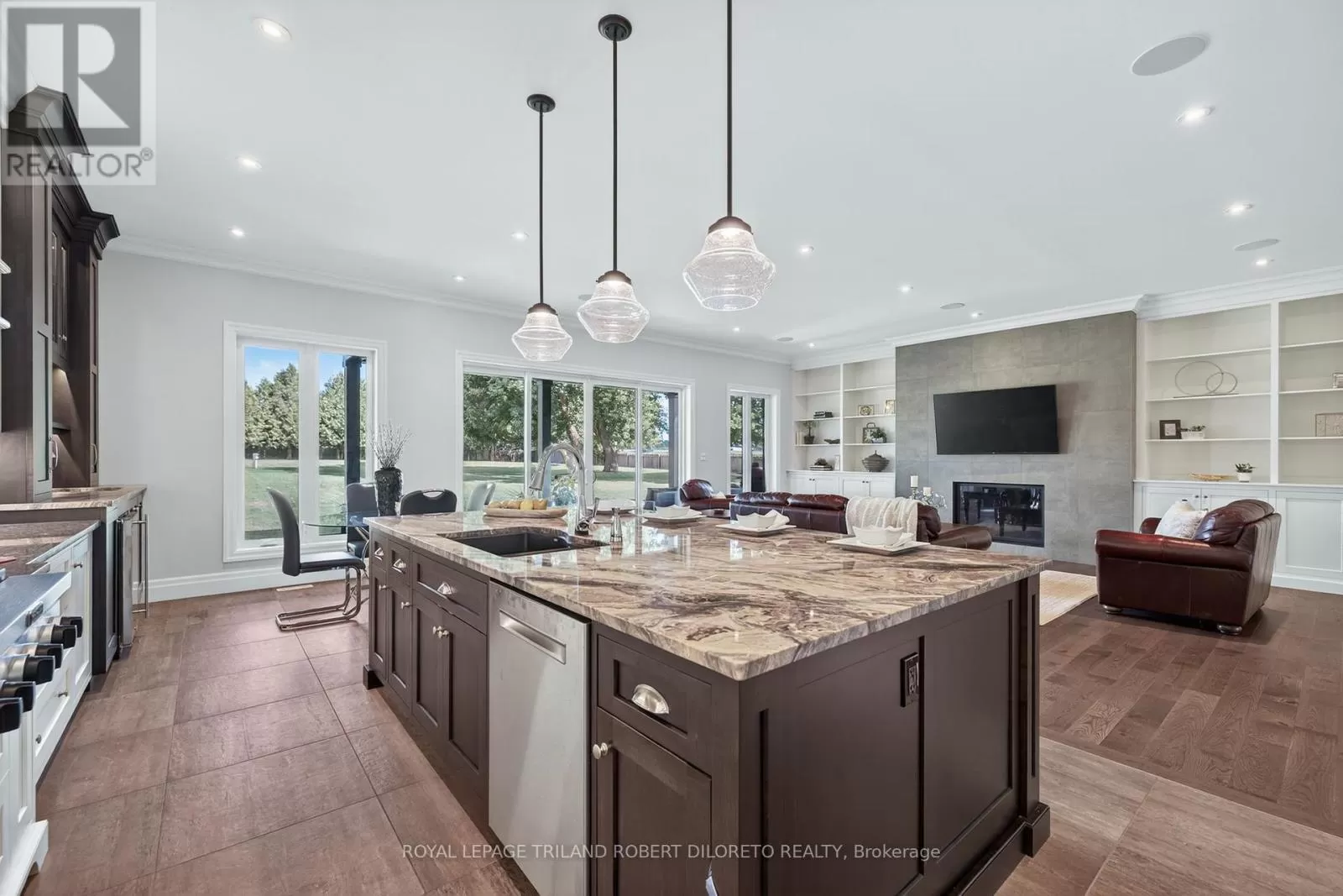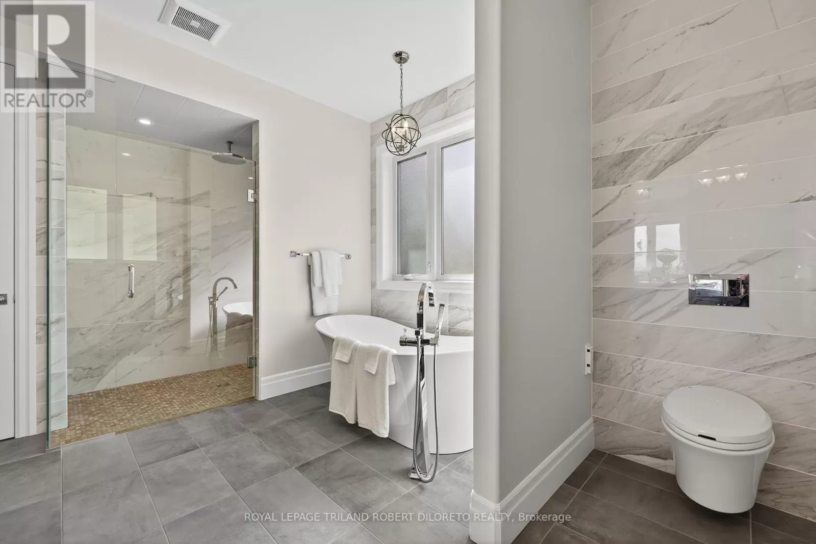 Cross Streets: Hyde Park Road. ** Directions: HYDE PARK NORTH TO SUNNINGDALE. EAST ON SUNNINGDALE TO PROPERTY ON NORTH SIDE. Gorgeous 1 ACRE parcel w/Outstanding custom designed & built (2017) 3+1 Bedroom, 4 Bath One floor executive home w/over 3000sf of superior quality, style & amenities on main level + fully finished lower & attached 4 car garage! Situated within steps of all shopping & amenities in Hyde Park of North London, this impeccably maintained home exudes Total wow factor throughout & is perfect for large or growing family + aging in place as this home is barrier-free with zero entry front door & patio door (no steps), wide hallways & doors, barrier free showers on main floor + discreetly hidden elevator which accesses the lower level. HIGHTLIGHTS: All brick & stone exterior w/multi-car drive & concrete walkways; all exterior windows & doors triple glazed for additional R-value & soundproofing; main floor exterior walls have 2" spray foam for added R-value; open concept interior w/high ceilings, custom millwork, ample recessed lighting & neutral décor for that timeless understated elegance; hardwood flooring & tile on main; designer kitchen w/high end custom cabinetry, KITCHENAID & BOSCH appliances, island w/marble counters + contrasting wood coffee bar; great room w/f/place flanked by custom built-ins; formal dining room; main floor office; 3 amazing bedrooms on main boast primary w/5pc ens, walk-in closet w/custom organizers + walkout to patio; additional main floor bedroom w/ens privileges; main floor laundry & 2pc powder room; the massive basement is finished to same high standards & is ideal for guest or in-law suite boasting 2" spray foam in all exterior walls + in-floor heat; huge family room, theatre/media room, 2nd kitchen w/quartz counters, fridge, stove, dishwasher & microwave, bedroom, gym area w/rubber floors, 3pc bath + loads of storage; fully fenced park-like yard w/large covered concrete patio & plenty of grass space for kids or pets! The list goes on! The property is serviced by Propane & fittings can be switched to future natural gas. Must See! (id:27476)