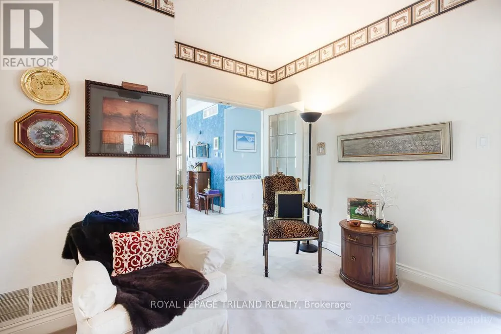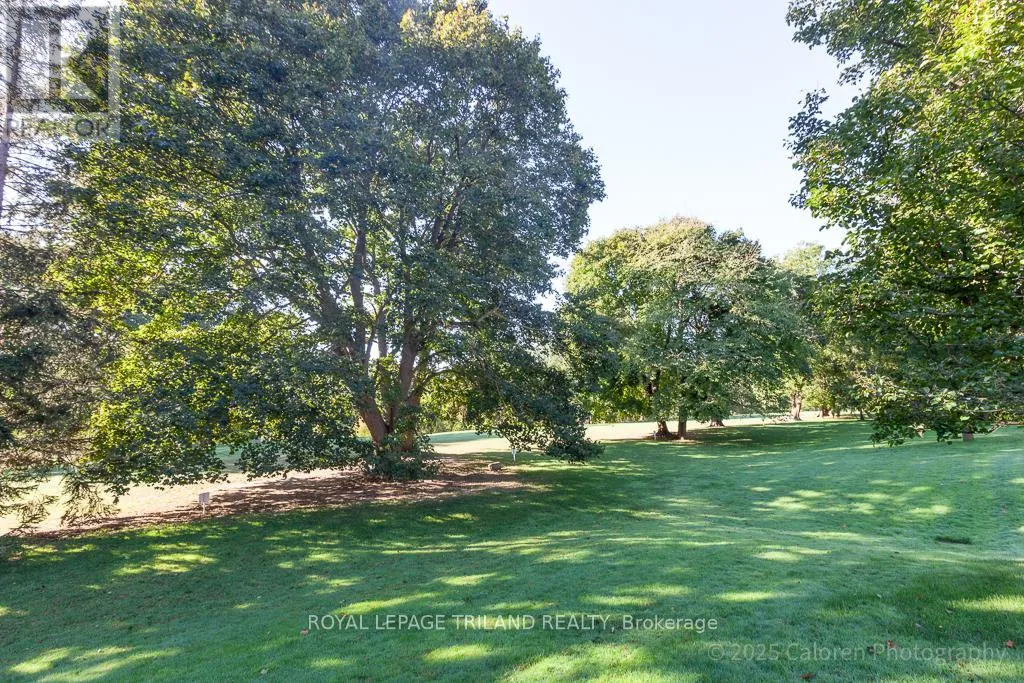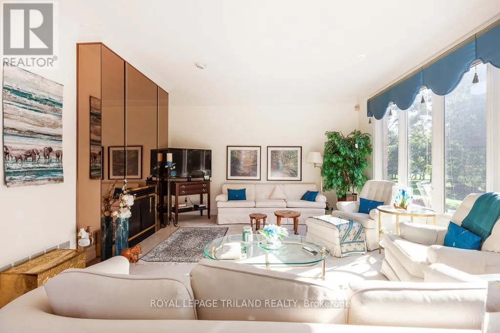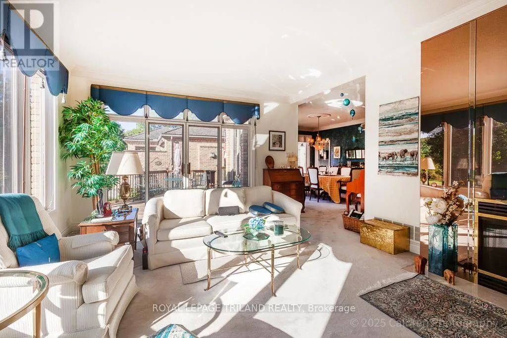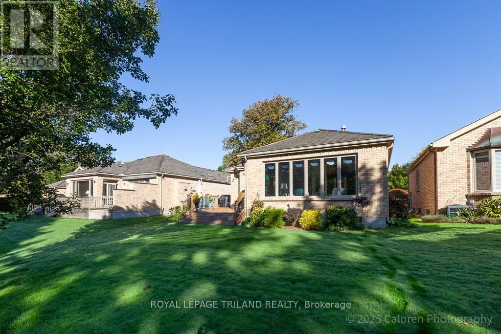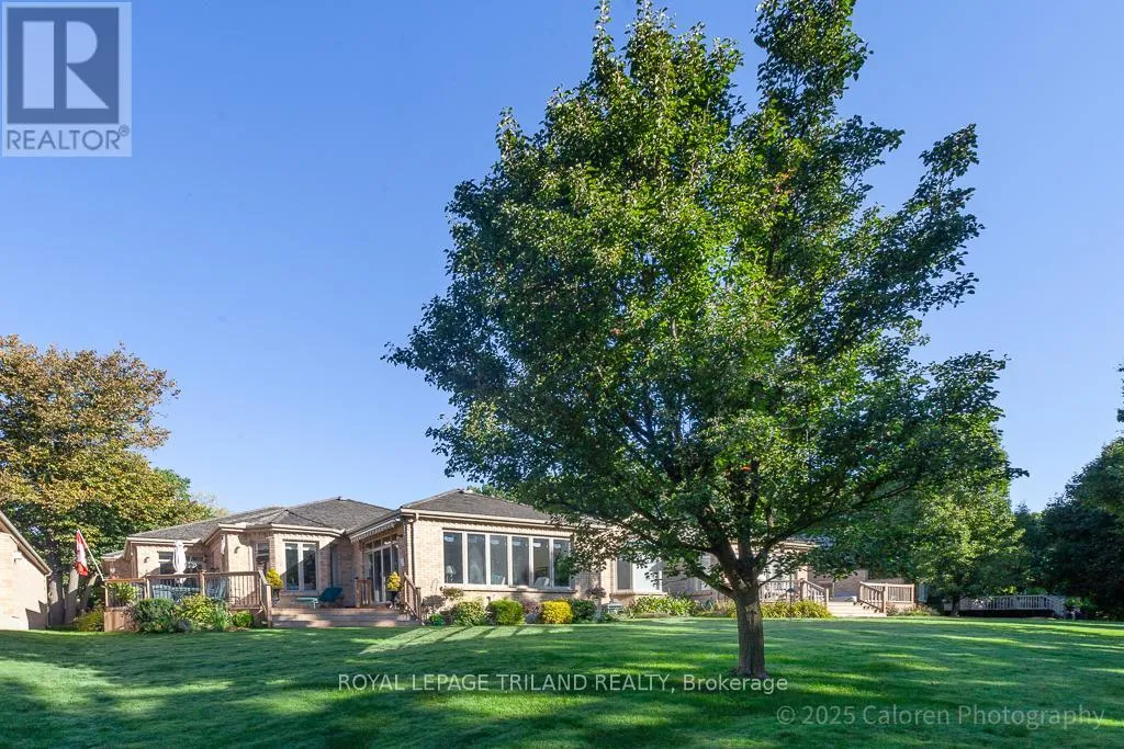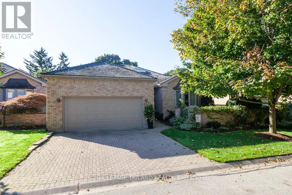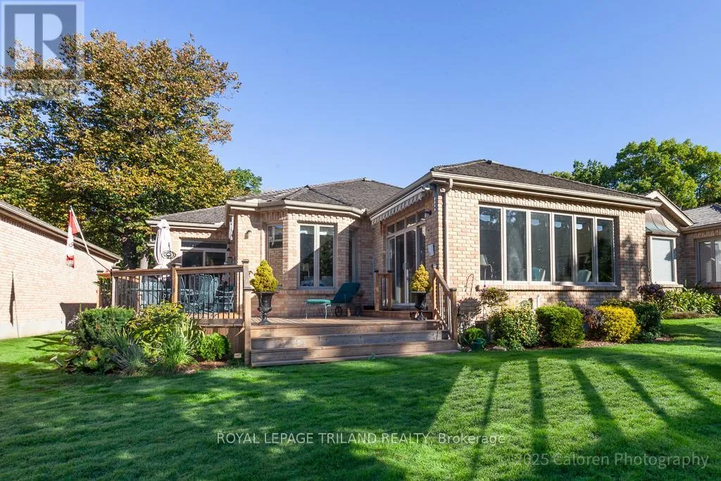 Cross Streets: HYDE PARK AND RIVERSIDE. ** Directions: WEST ON RIVERSIDE DR, COMPLEX JUST PAST THAMES VALLEY GOLF. Experience refined living in one of Londons most prestigious enclaves with this superb luxury detached condo in Hazel Lanes. This meticulously maintained home offers over 2,200 square feet of sun-filled main floor space, backing onto the scenic Thames Valley Golf Course for a tranquil and private setting perfect for both relaxation and sophisticated entertaining.Inside, discover a generous living room with a cozy gas fireplace and patio walkout to an expansive wrap-around deck equipped with retractable awnings, offering sweeping treed and golf course views. The main level features an elegant formal dining room, a spacious eat-in kitchen with abundant cabinetry and counter space, plus a bright den with direct access to a private interior courtyard.Retire to the oversized primary suite, complete with a large walk-in closet and a modern en-suite featuring a walk-in tub/shower. A second spacious bedroom, full bath, and convenient laundry area round out the main floor. The impressive 9-foot ceilings are enhanced by elegant crown moulding and a striking great room, adding to the overall sense of space and grandeur.The lower level offers a massive family room with its own fireplace, a third bathroom, and generous storage solutions ideal for extended family gatherings. A double garage with inside entry provides added convenience.Residents of Hazel Lanes enjoy access to a large heated saltwater pool, manicured green spaces, and walking and bike trails just steps away along the Thames River and Springbank Park, while Hyde Parks shopping and downtown amenities remain within easy reach. Recent updates include a newer cedar shake roof 2019, newer deck, and a high-efficiency furnace and central air installed in 2016.This exclusive, sought-after community combines elegant design with luxury amenities and an unbeatable location. Schedule your private viewing and experience the serenity and sophistication of Hazel Lanes living. (id:27476)