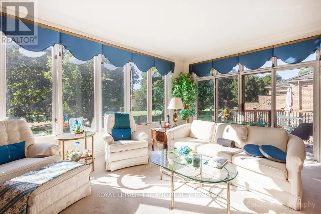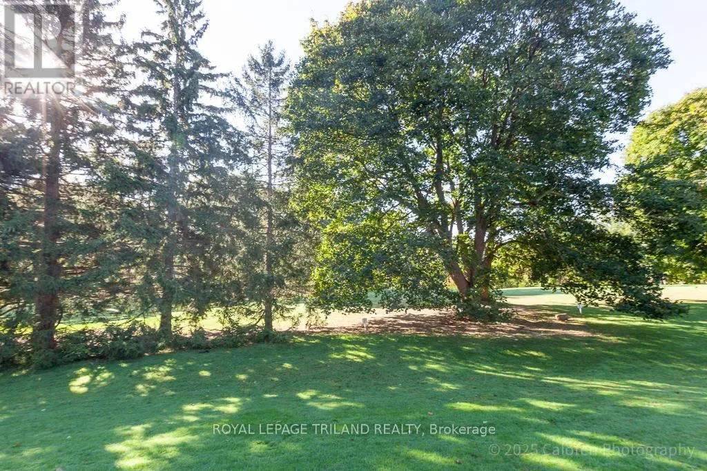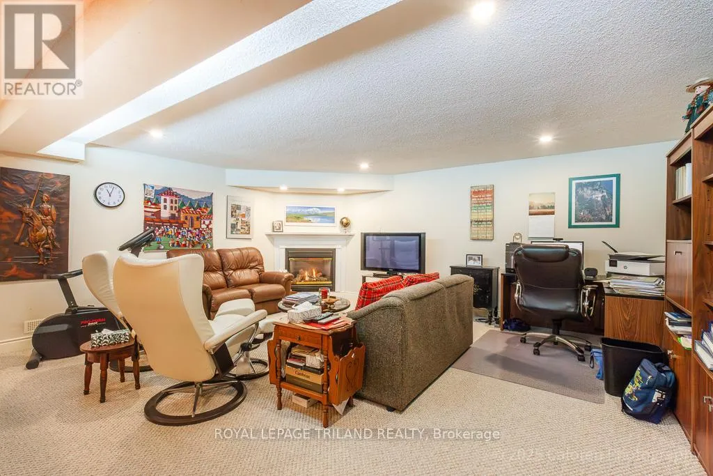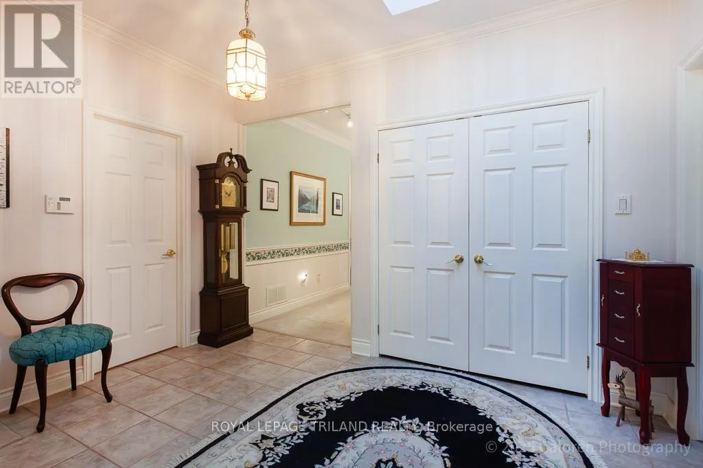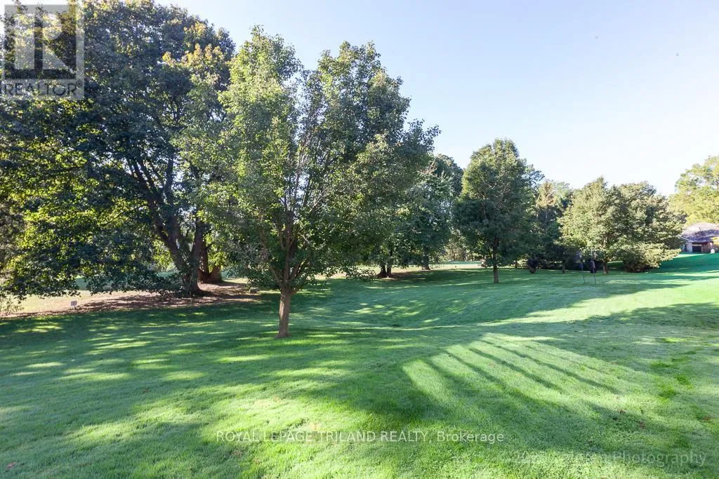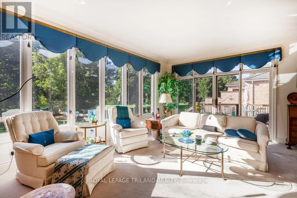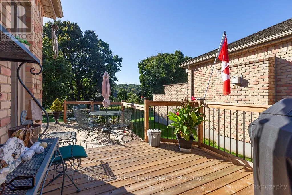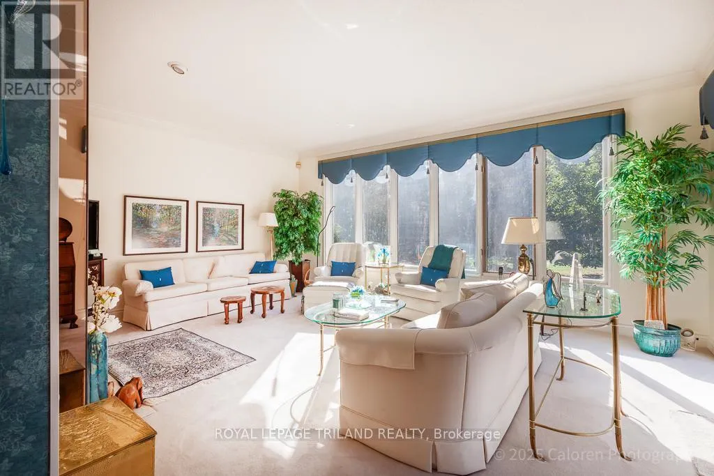Cross Streets: HYDE PARK AND RIVERSIDE. ** Directions: WEST ON RIVERSIDE DR, COMPLEX JUST PAST THAMES VALLEY GOLF. Experience refined living in one of Londons most prestigious enclaves with this superb luxury detached condo in Hazel Lanes. This meticulously maintained home offers over 2,200 square feet of sun-filled main floor space, backing onto the scenic Thames Valley Golf Course for a tranquil and private setting perfect for both relaxation and sophisticated entertaining.Inside, discover a generous living room with a cozy gas fireplace and patio walkout to an expansive wrap-around deck equipped with retractable awnings, offering sweeping treed and golf course views. The main level features an elegant formal dining room, a spacious eat-in kitchen with abundant cabinetry and counter space, plus a bright den with direct access to a private interior courtyard.Retire to the oversized primary suite, complete with a large walk-in closet and a modern en-suite featuring a walk-in tub/shower. A second spacious bedroom, full bath, and convenient laundry area round out the main floor. The impressive 9-foot ceilings are enhanced by elegant crown moulding and a striking great room, adding to the overall sense of space and grandeur.The lower level offers a massive family room with its own fireplace, a third bathroom, and generous storage solutions ideal for extended family gatherings. A double garage with inside entry provides added convenience.Residents of Hazel Lanes enjoy access to a large heated saltwater pool, manicured green spaces, and walking and bike trails just steps away along the Thames River and Springbank Park, while Hyde Parks shopping and downtown amenities remain within easy reach. Recent updates include a newer cedar shake roof 2019, newer deck, and a high-efficiency furnace and central air installed in 2016.This exclusive, sought-after community combines elegant design with luxury amenities and an unbeatable location. Schedule your private viewing and experience the serenity and sophistication of Hazel Lanes living. (id:27476)