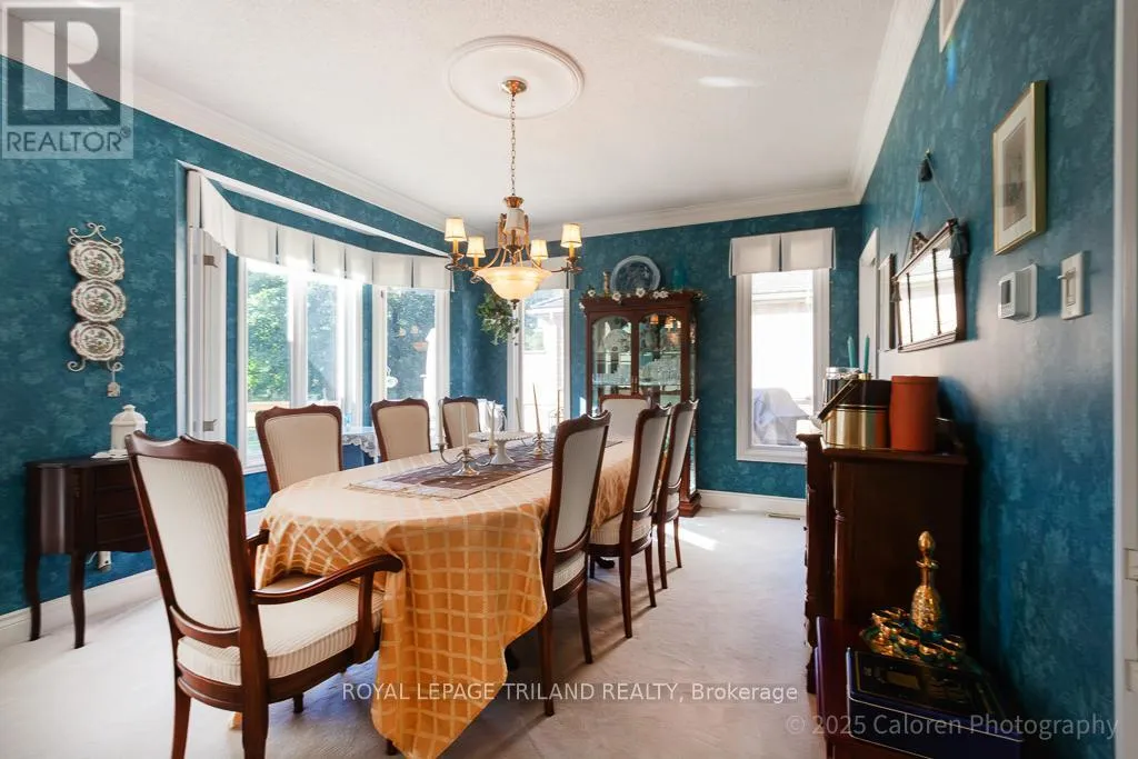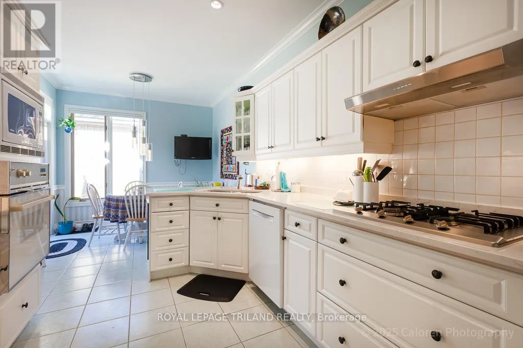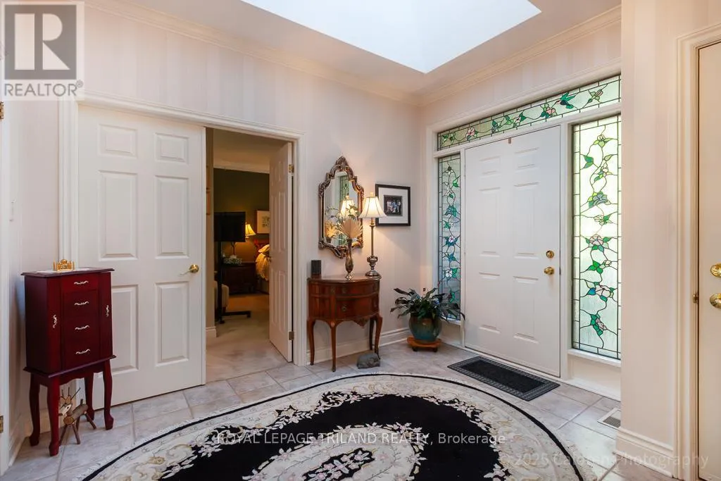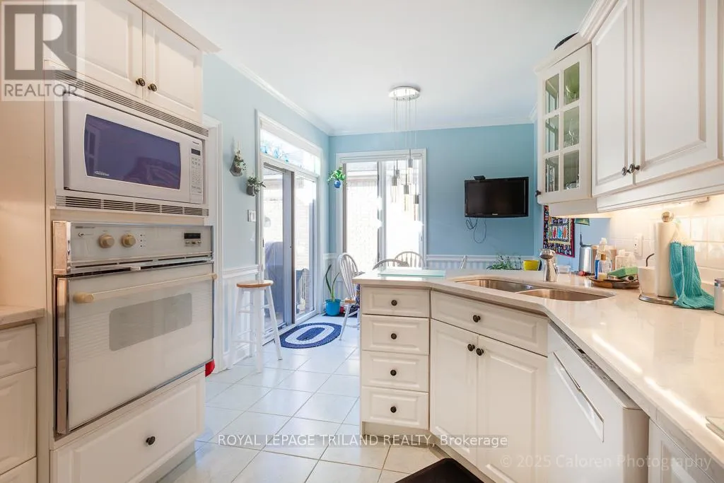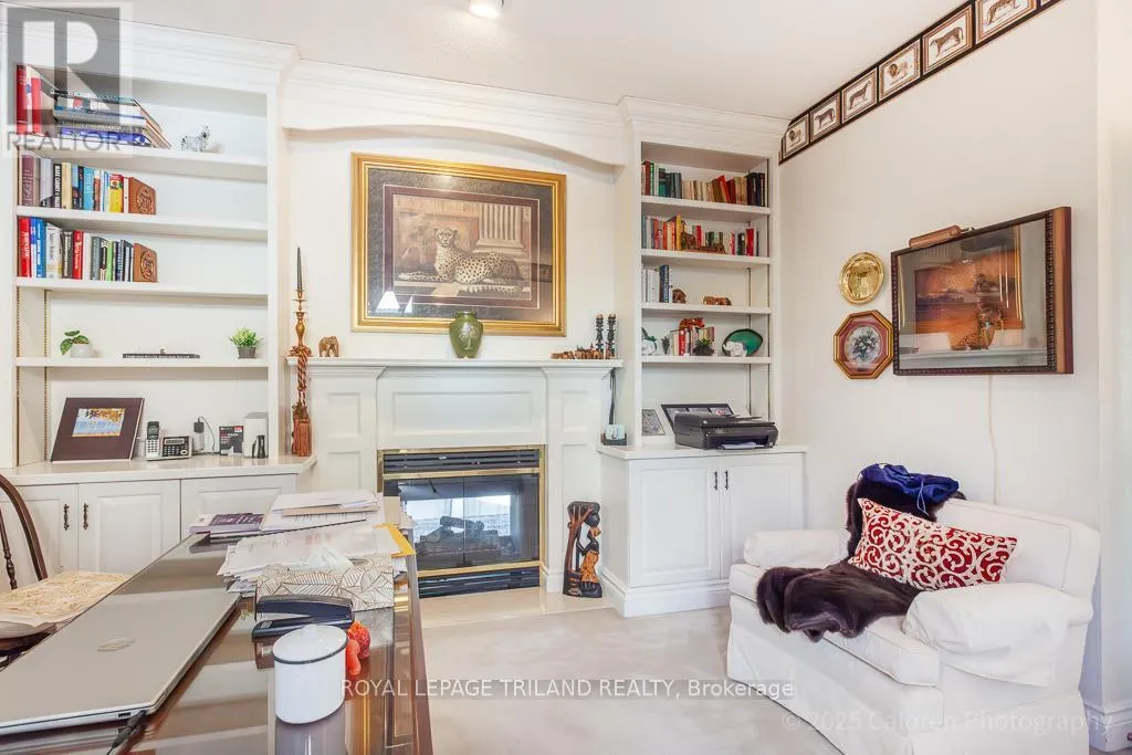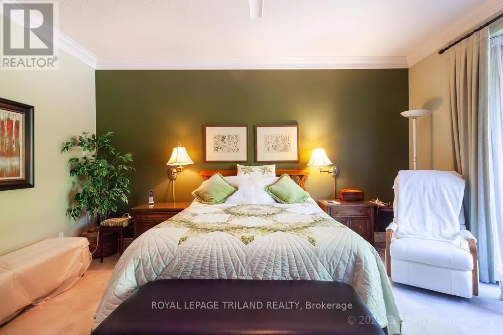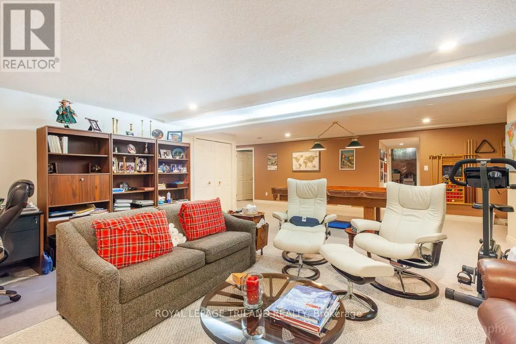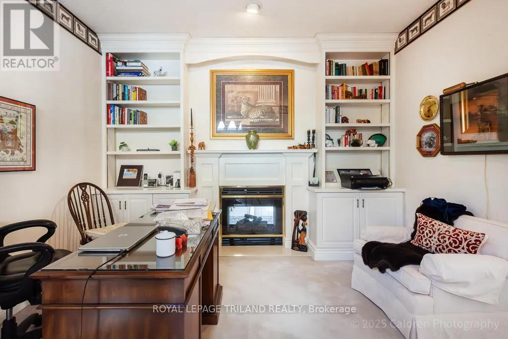 Cross Streets: HYDE PARK AND RIVERSIDE. ** Directions: WEST ON RIVERSIDE DR, COMPLEX JUST PAST THAMES VALLEY GOLF. Experience refined living in one of Londons most prestigious enclaves with this superb luxury detached condo in Hazel Lanes. This meticulously maintained home offers over 2,200 square feet of sun-filled main floor space, backing onto the scenic Thames Valley Golf Course for a tranquil and private setting perfect for both relaxation and sophisticated entertaining.Inside, discover a generous living room with a cozy gas fireplace and patio walkout to an expansive wrap-around deck equipped with retractable awnings, offering sweeping treed and golf course views. The main level features an elegant formal dining room, a spacious eat-in kitchen with abundant cabinetry and counter space, plus a bright den with direct access to a private interior courtyard.Retire to the oversized primary suite, complete with a large walk-in closet and a modern en-suite featuring a walk-in tub/shower. A second spacious bedroom, full bath, and convenient laundry area round out the main floor. The impressive 9-foot ceilings are enhanced by elegant crown moulding and a striking great room, adding to the overall sense of space and grandeur.The lower level offers a massive family room with its own fireplace, a third bathroom, and generous storage solutions ideal for extended family gatherings. A double garage with inside entry provides added convenience.Residents of Hazel Lanes enjoy access to a large heated saltwater pool, manicured green spaces, and walking and bike trails just steps away along the Thames River and Springbank Park, while Hyde Parks shopping and downtown amenities remain within easy reach. Recent updates include a newer cedar shake roof 2019, newer deck, and a high-efficiency furnace and central air installed in 2016.This exclusive, sought-after community combines elegant design with luxury amenities and an unbeatable location. Schedule your private viewing and experience the serenity and sophistication of Hazel Lanes living. (id:27476)