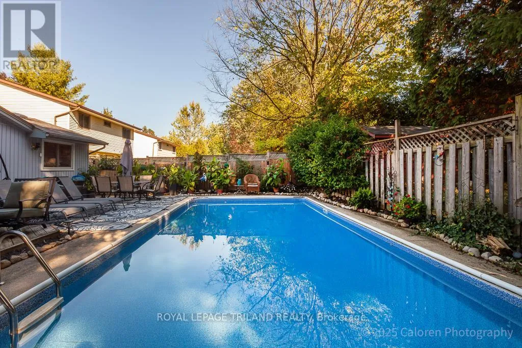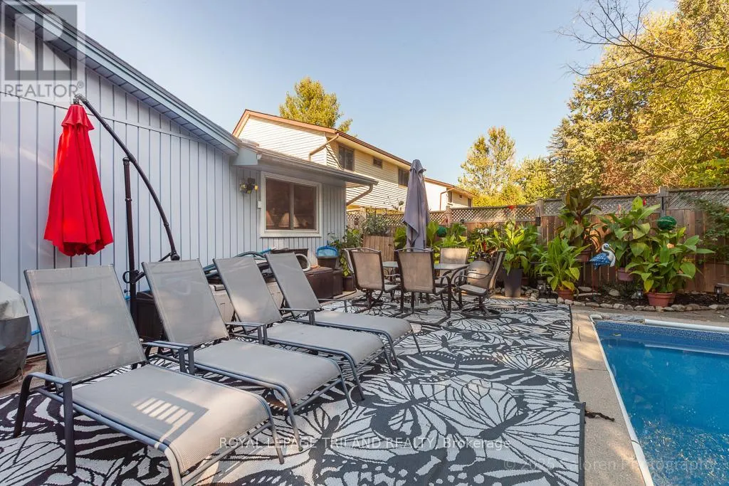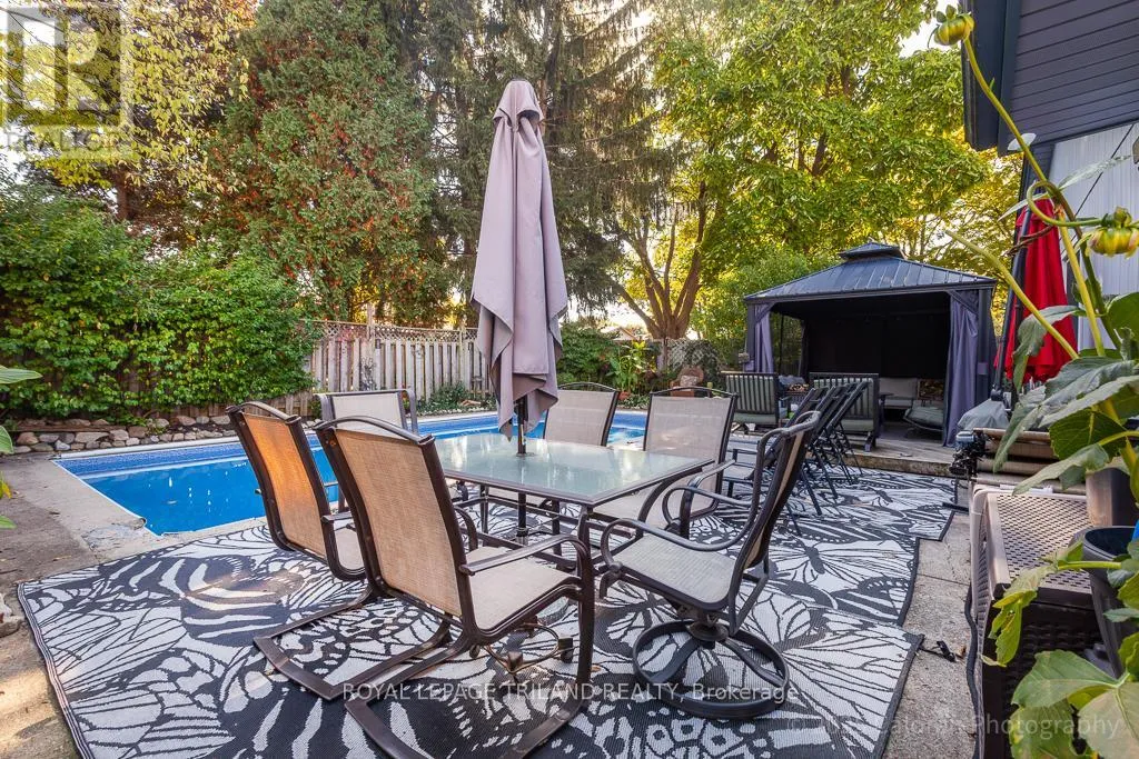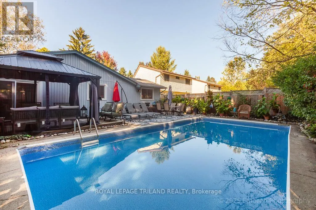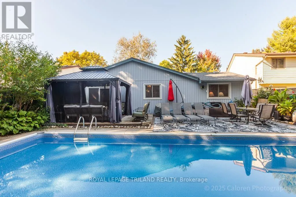 Cross Streets: CRABTREE AND YARDLWY WOODS. ** Directions: NORTH ON WONDERLAND, LEFT ON BLACKACRES, RIGHT ON YARDLEY, LEFT ON CRABTREE. Dive into comfort and relaxation with this inviting northwest London bungalow, complete with a sparkling inground swimming pool and a private hot tubperfect for unwinding or entertaining friends under the sun.This flexible home features three spacious main-floor bedrooms, plus a surprise loft retreat ideal for a fourth bedroom or a quiet home office. The principal bedroom is conveniently located on the main floor, while the open-concept great room combines a welcoming dining area and living space highlighted by a cozy gas fireplace.The large kitchen offers plenty of room for casual meals and flows seamlessly onto a private walled side garden through patio doors, providing a tranquil spot for morning coffee or evening gatherings. Step outside to enjoy the lush, south-facing backyard, where a canvas gazebo and deck lounge area create the perfect setting for summer relaxation.Recent updates include refreshed bathrooms, new shingles (2022), and a durable cement double-wide driveway for added convenience. Located in a quiet, sought-after residential neighbourhood, this property is close to grocery stores, the library, gym facilities, wooded trails, easy transportation options, and minutes from Western University.Welcome home to a lifestyle that blends comfort, flexibility, and outdoor enjoyment in one of Londons most desirable communities. (id:27476)
