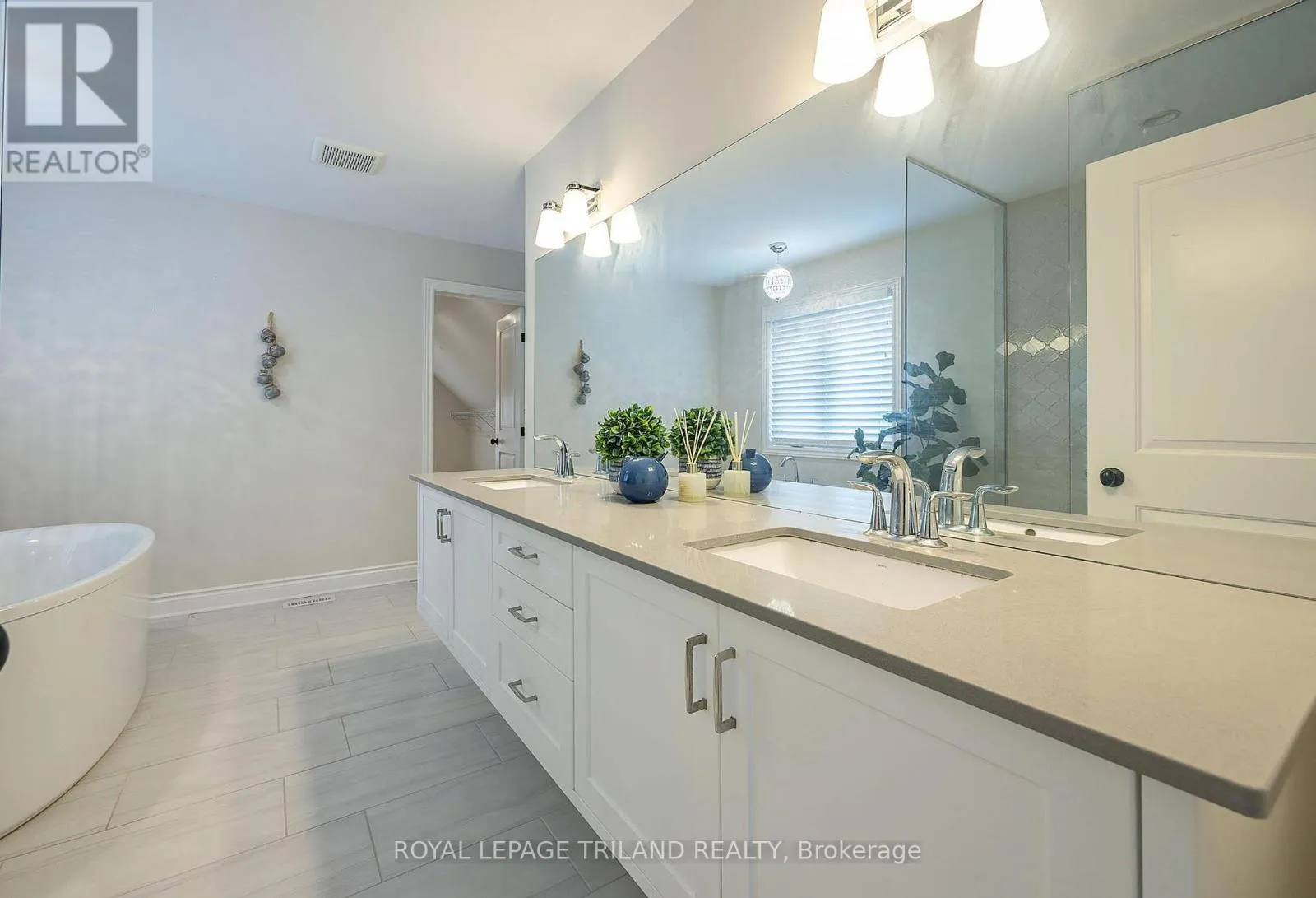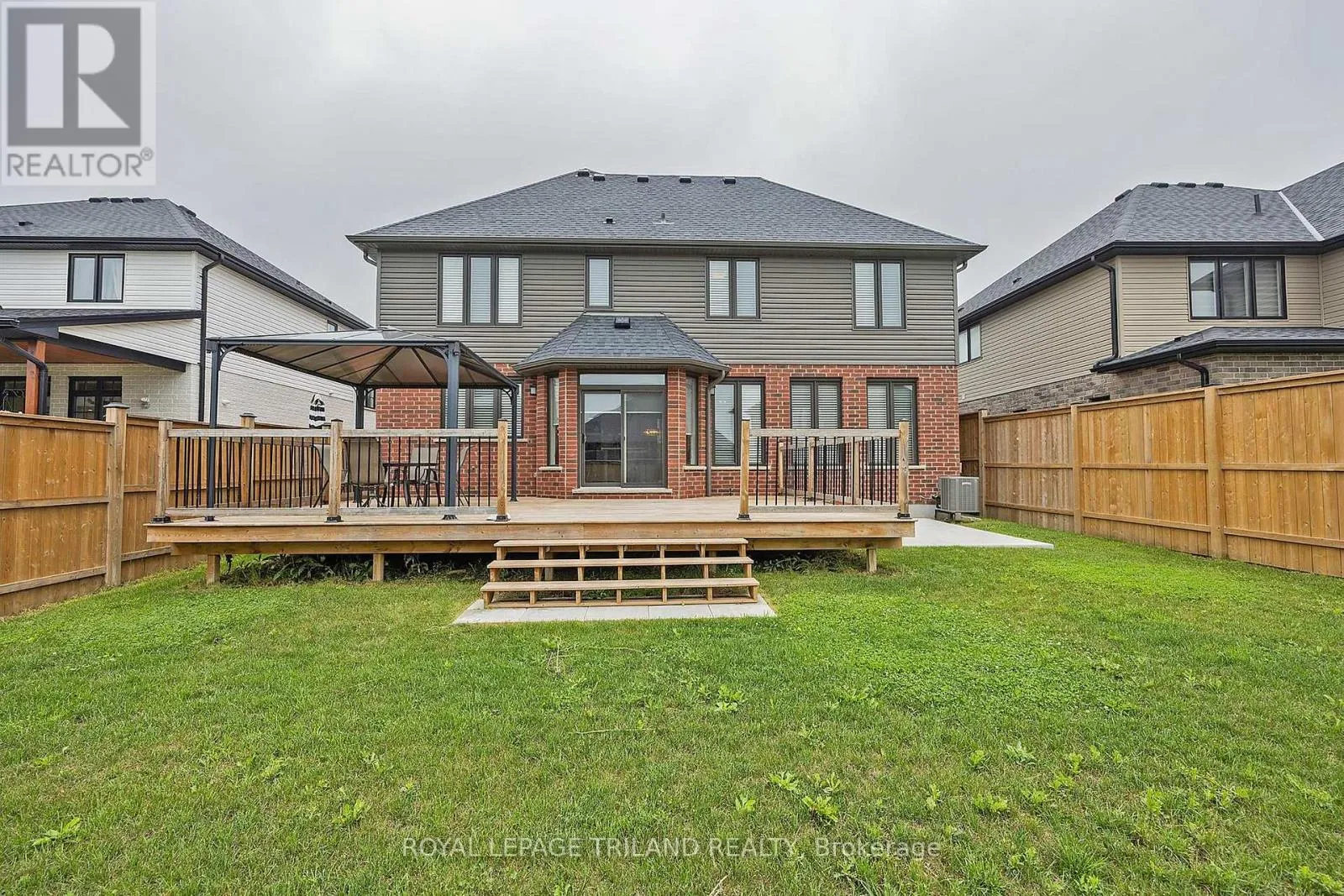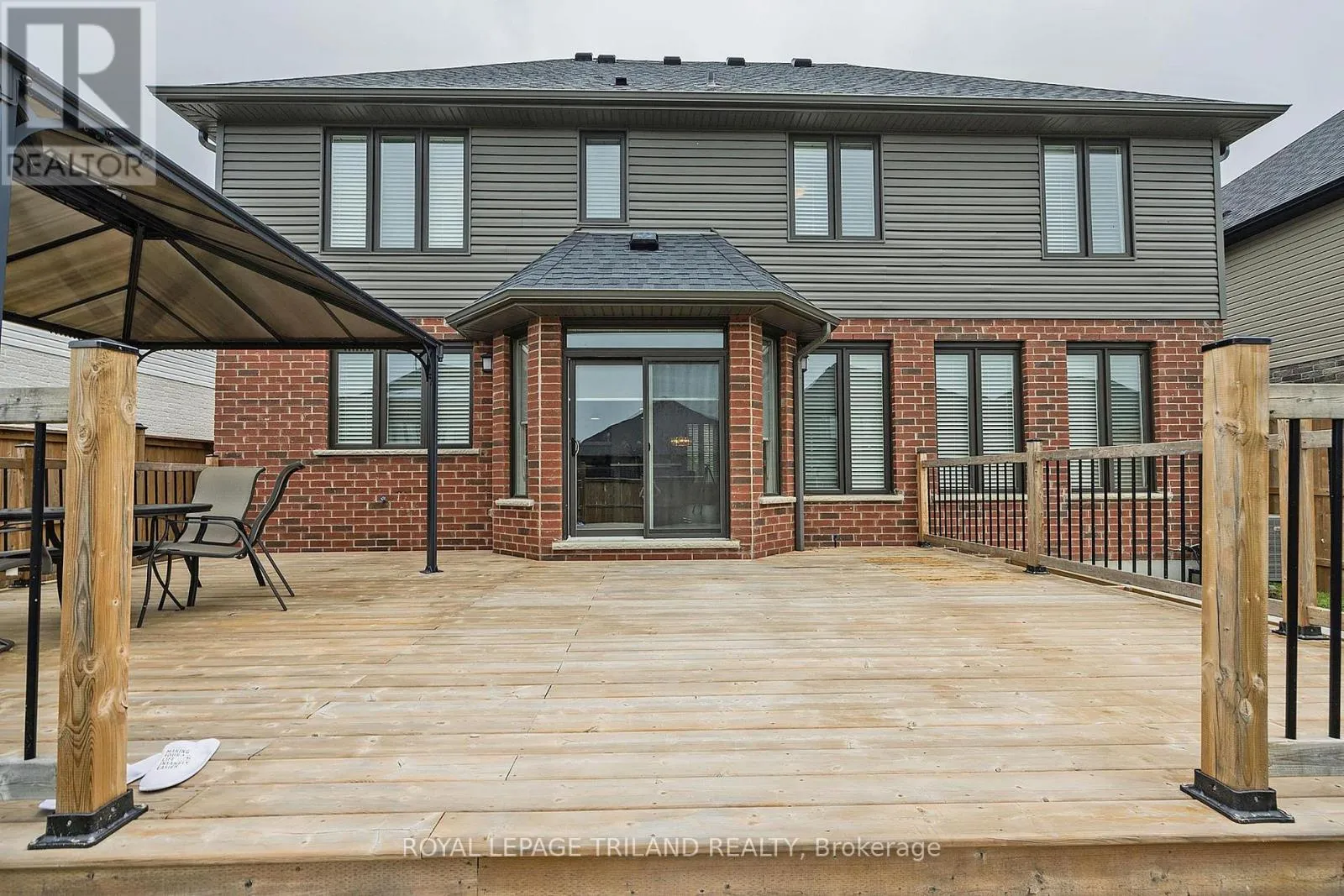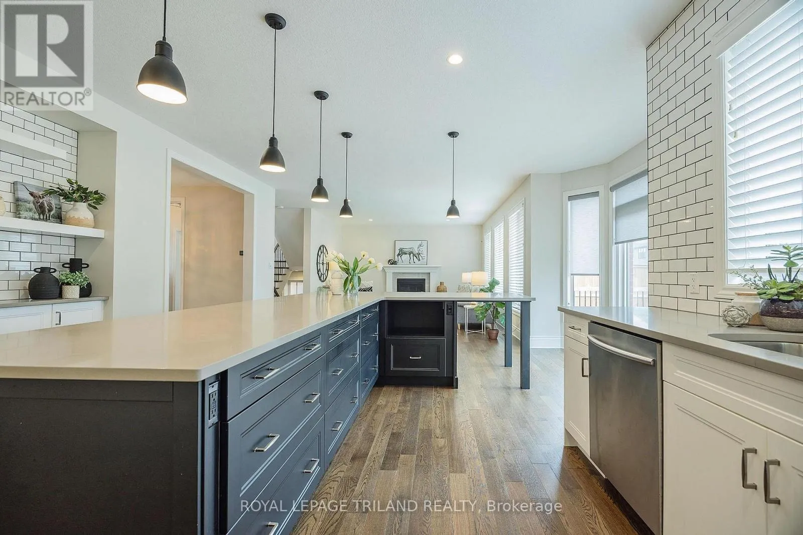 SUPERIOR DRIVE AND MADDEX WAY Elegant 4-Bedroom Home with Dual Primary Suites in Prime North London This beautifully appointed 4-bedroom, 5-bath home offers two spacious primary bedrooms with private ensuites. The home features classic red brick exterior, black-framed windows, tumbled stone driveway, and a covered front porch with great curb appeal. Inside, enjoy an open-concept main level with warm hardwood floors, high ceilings, and sun-filled spaces. The gourmet kitchen impresses with white and black cabinetry, ceiling-height subway tile, quartz countertops, gas stove, stainless appliances, dry bar with floating shelves, and a massive8-seat L-shaped island. A walk-in pantry adds extra function. The bright living room offers a gas fireplace, recessed lighting, panoramic backyard views, and walkout to a covered deck and fully fenced yard. A vaulted office, mudroom/laundry, and 2-piecebath complete the main floor. The primary suite boasts a tray ceiling, spa-like 5-piece ensuite with freestanding tub, double vanity, custom glass shower, and a huge walk-in closet. The second bedroom also includes a vaulted ceiling and private ensuite. Two additional bedrooms share a 4-piece bath. The unfinished basement with large windows and plumbing rough-in awaits your personal touch. Ideally located near YMCA, Masonville Mall, Weldon Park, Sunningdale Golf, UWO, and University Hospital. Welcome home (id:27476)