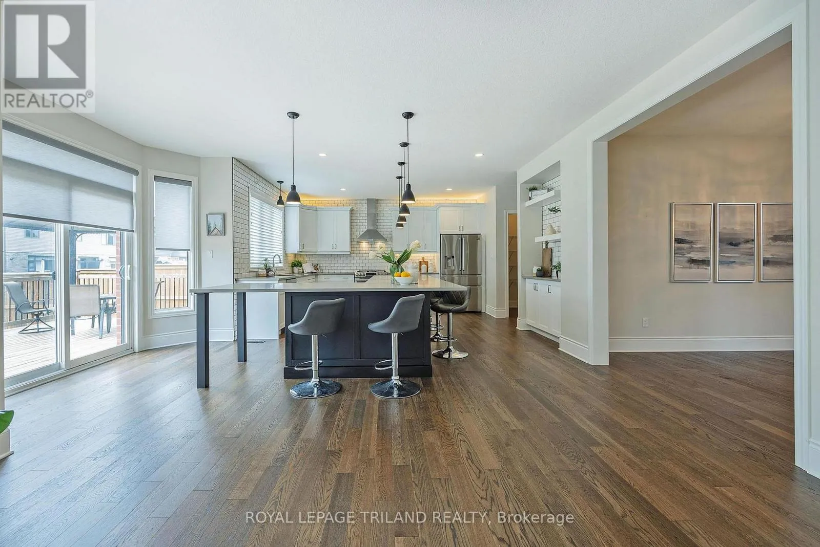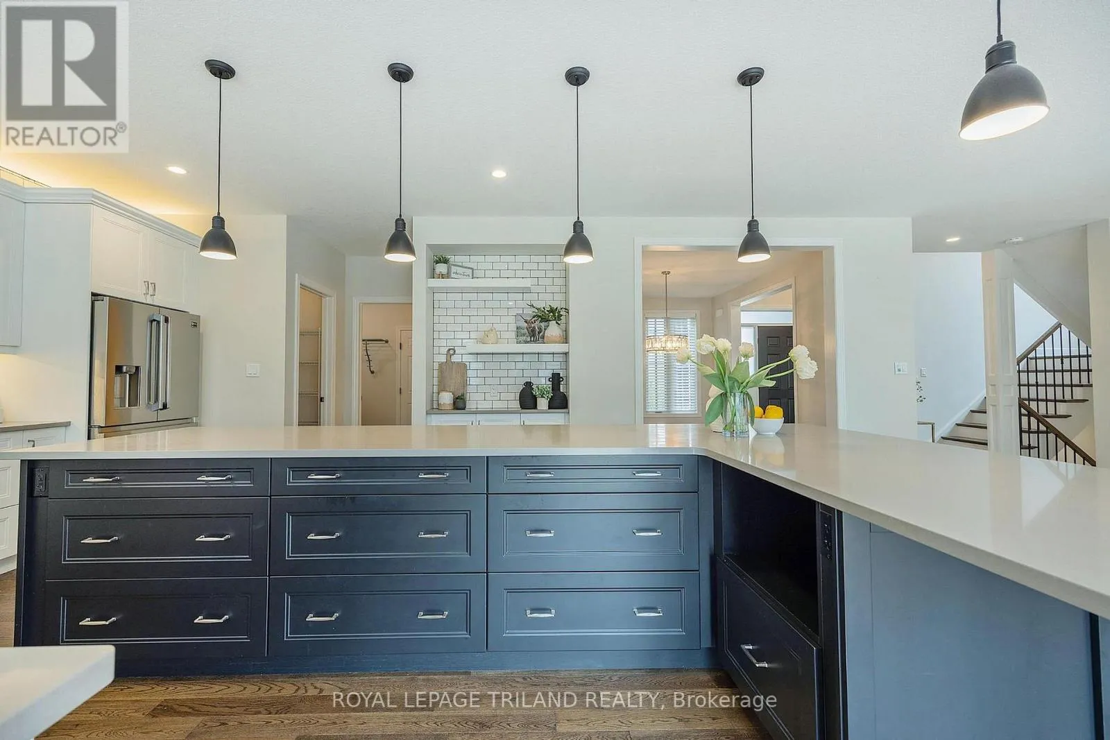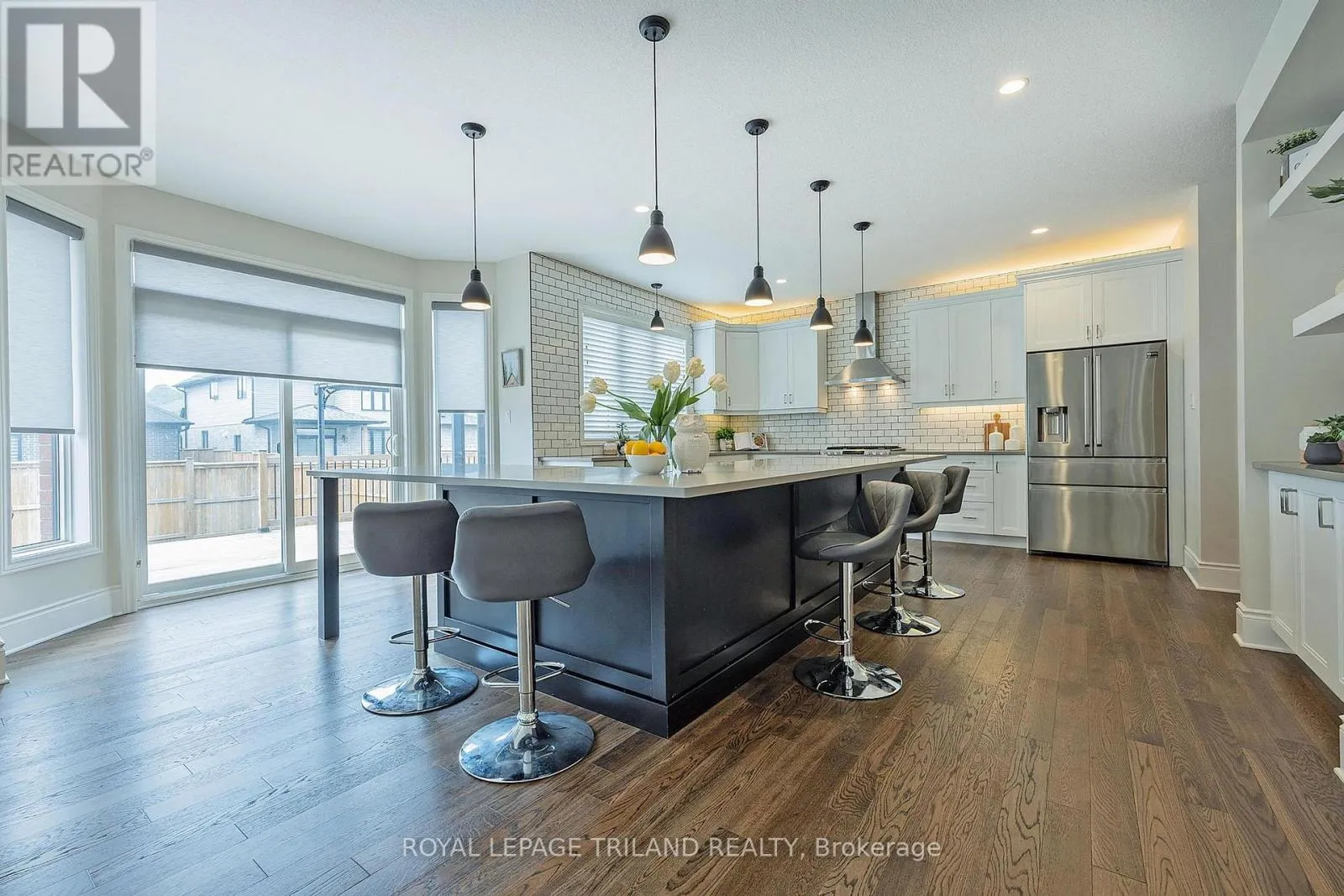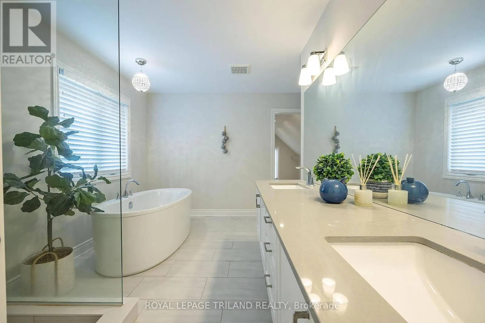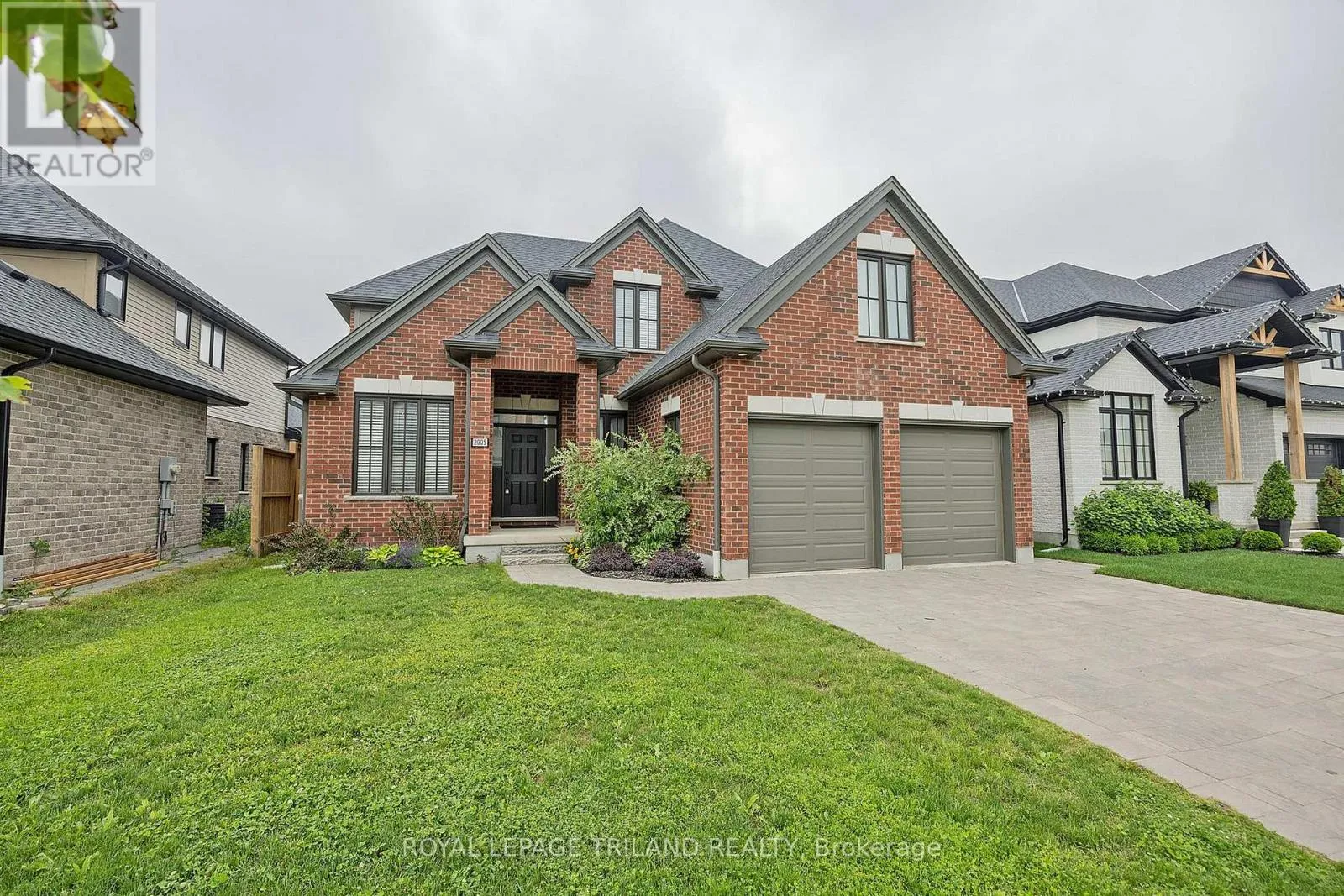 SUPERIOR DRIVE AND MADDEX WAY Elegant 4-Bedroom Home with Dual Primary Suites in Prime North London This beautifully appointed 4-bedroom, 5-bath home offers two spacious primary bedrooms with private ensuites. The home features classic red brick exterior, black-framed windows, tumbled stone driveway, and a covered front porch with great curb appeal. Inside, enjoy an open-concept main level with warm hardwood floors, high ceilings, and sun-filled spaces. The gourmet kitchen impresses with white and black cabinetry, ceiling-height subway tile, quartz countertops, gas stove, stainless appliances, dry bar with floating shelves, and a massive8-seat L-shaped island. A walk-in pantry adds extra function. The bright living room offers a gas fireplace, recessed lighting, panoramic backyard views, and walkout to a covered deck and fully fenced yard. A vaulted office, mudroom/laundry, and 2-piecebath complete the main floor. The primary suite boasts a tray ceiling, spa-like 5-piece ensuite with freestanding tub, double vanity, custom glass shower, and a huge walk-in closet. The second bedroom also includes a vaulted ceiling and private ensuite. Two additional bedrooms share a 4-piece bath. The unfinished basement with large windows and plumbing rough-in awaits your personal touch. Ideally located near YMCA, Masonville Mall, Weldon Park, Sunningdale Golf, UWO, and University Hospital. Welcome home (id:27476)