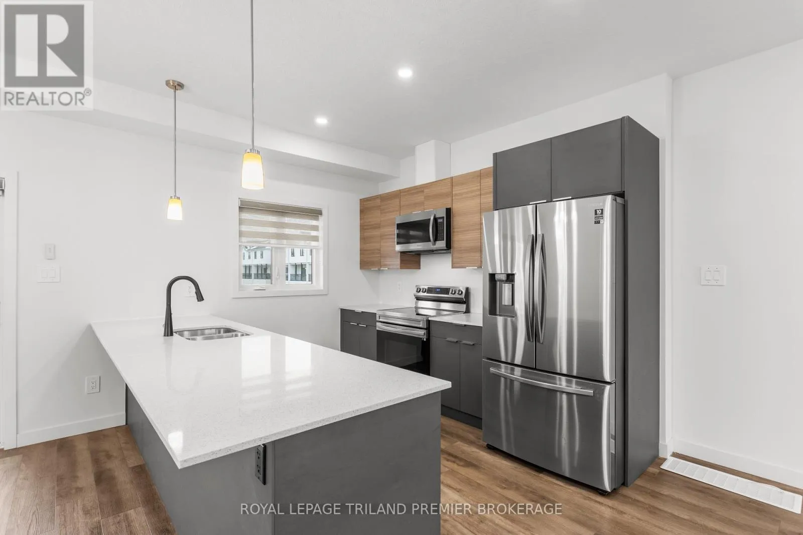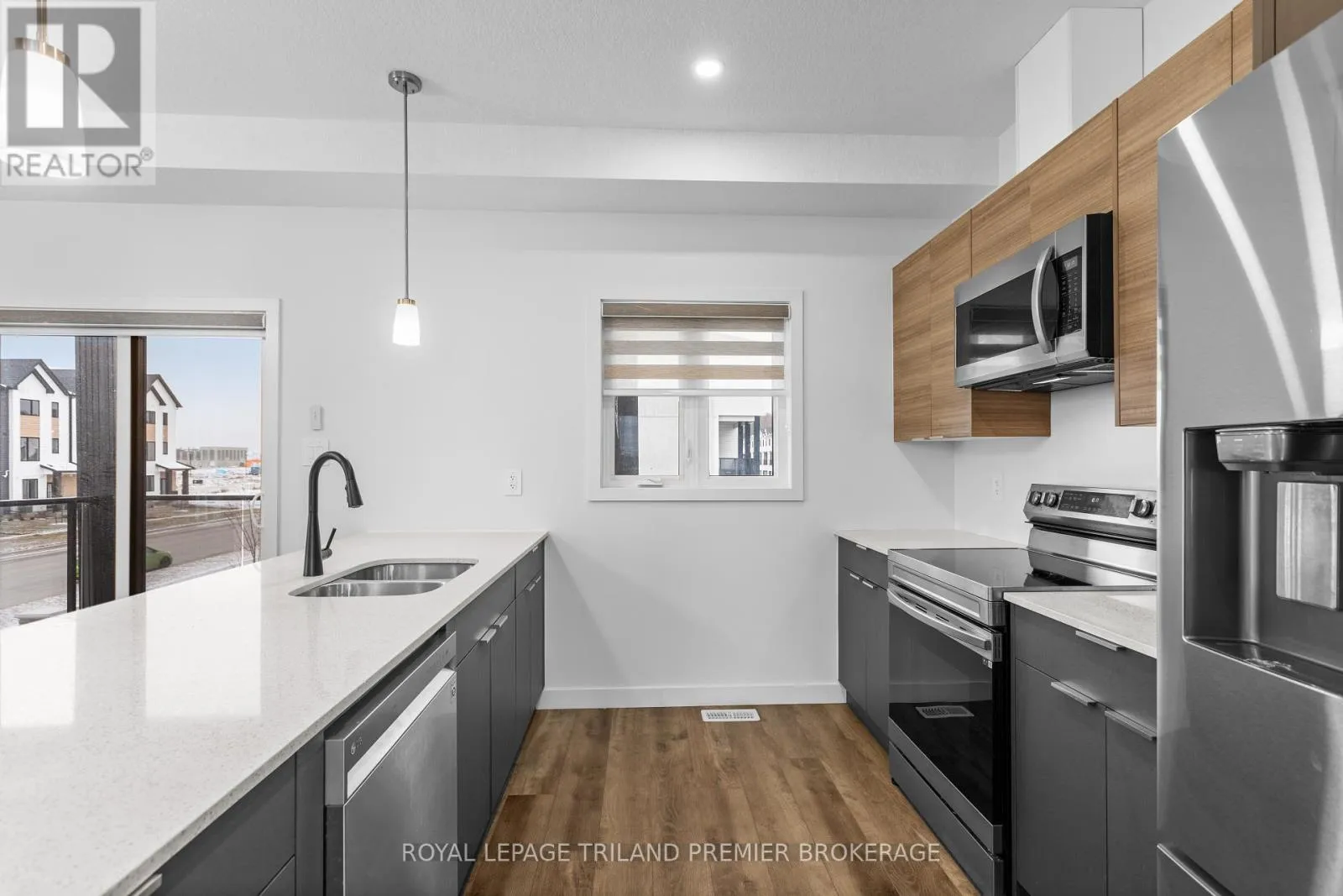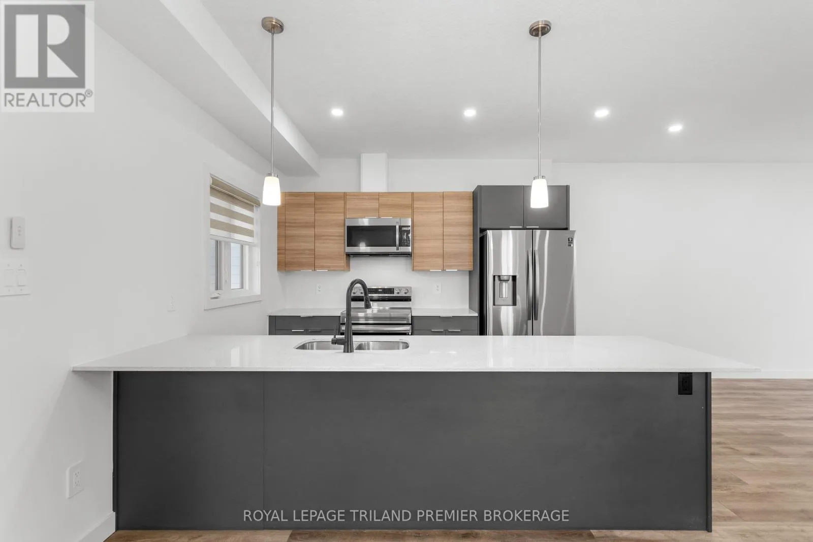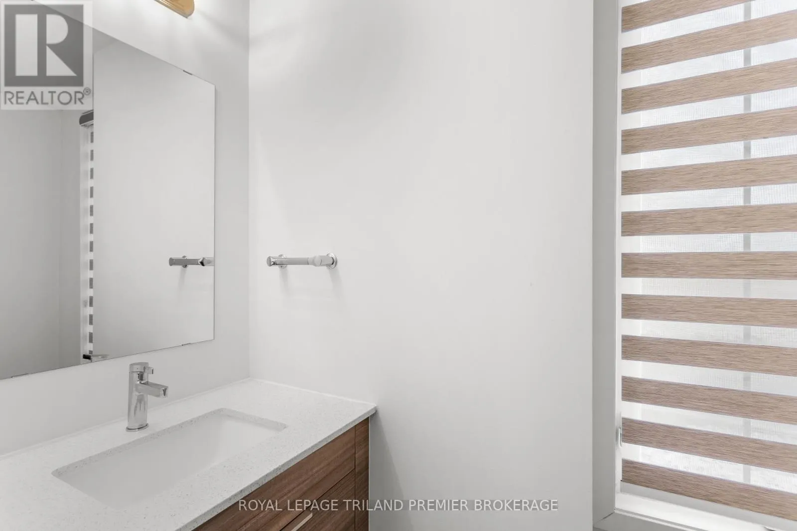 HEADING NORTH ON HYDE PARK FROM FANSHAWE PARK, TURN RIGHT ONTO TWILITE, RIGHT ONTO TOKALA, RIGHT ONTO HENRICA LIKE NEW! Gorgeous 3 storey end unit in desirable northwest London. Enter through the front door into the bright lower level featuring spacious foyer; direct access to the garage; full 4- piece bathroom; and bedroom which is perfect for a private guest suite or work from home office. The main level is open concept with large windows and laminate flooring; generous family room; kitchen with stainless steel appliances, quartz countertops; under cabinet lighting; lots of storage and peninsula with breakfast bar; generous dinette with private balcony access; and convenient 2 piece powder room. The upper level boasts 4- piece main bathroom and 3 spacious bedrooms including master suite with walk in closet, 3-piece ensuite and balcony which is the perfect place to have your morning coffee. Bonus garage for storage or parking with garage door opener. Corner lot with lots of green space to enjoy. Fabulous location close to public transit, parks, trails, schools, golf, shopping, restaurants, UWO, University Hospital and more. 2 parking spaces (one driveway, one garage). $2750 is plus utilities. Must be able to provide credit check, letter of employment, references,3 months consecutive bank statements and deposit. No smoking, pets allowed but restricted, maintenance free with lawn and snow removal covered by condo corp, visitor parking available, tenant to provide proof of tenants insurance. (id:27476)