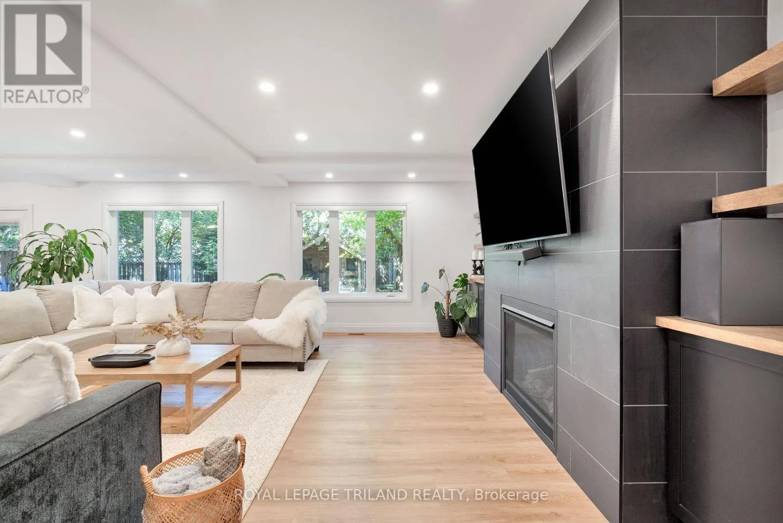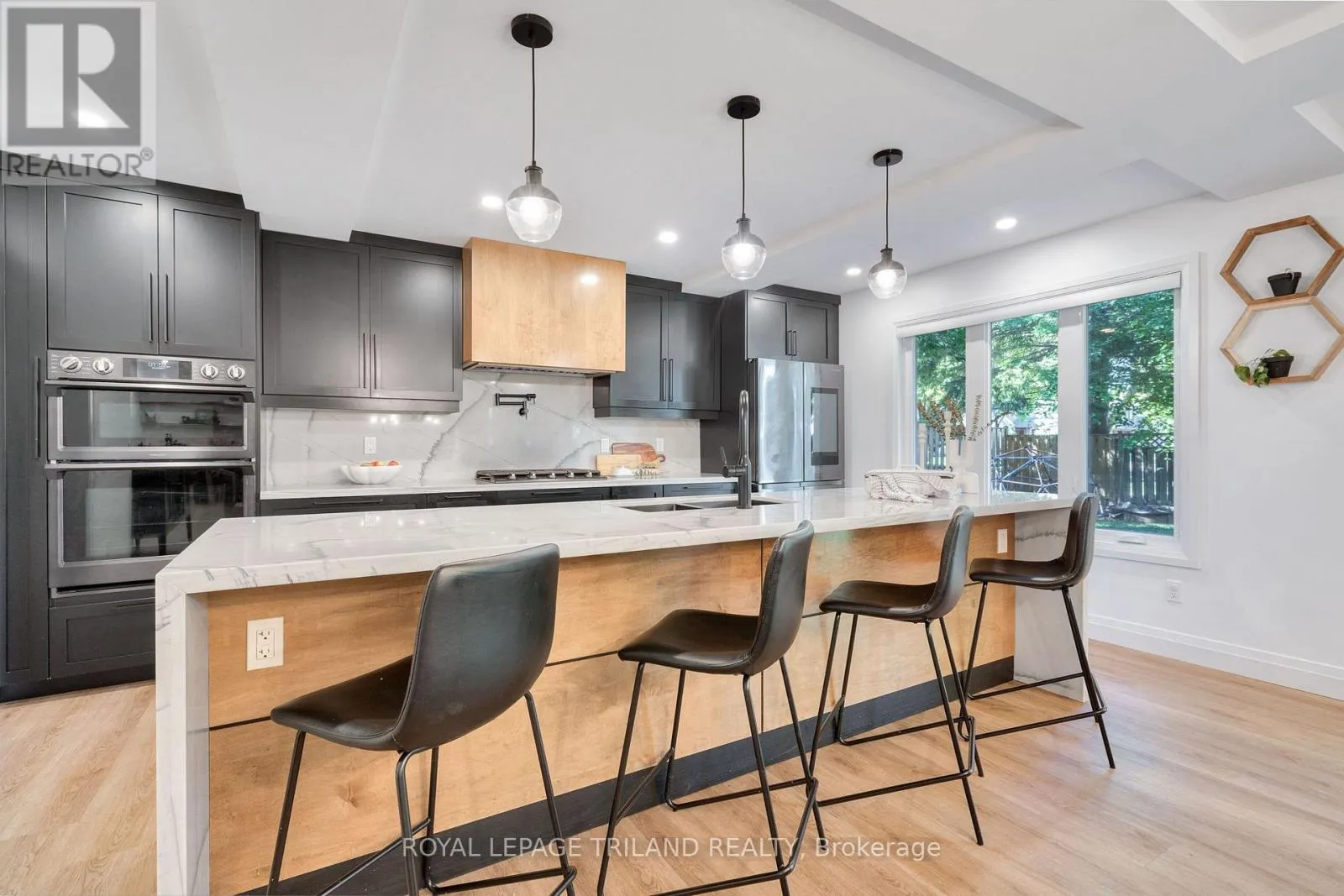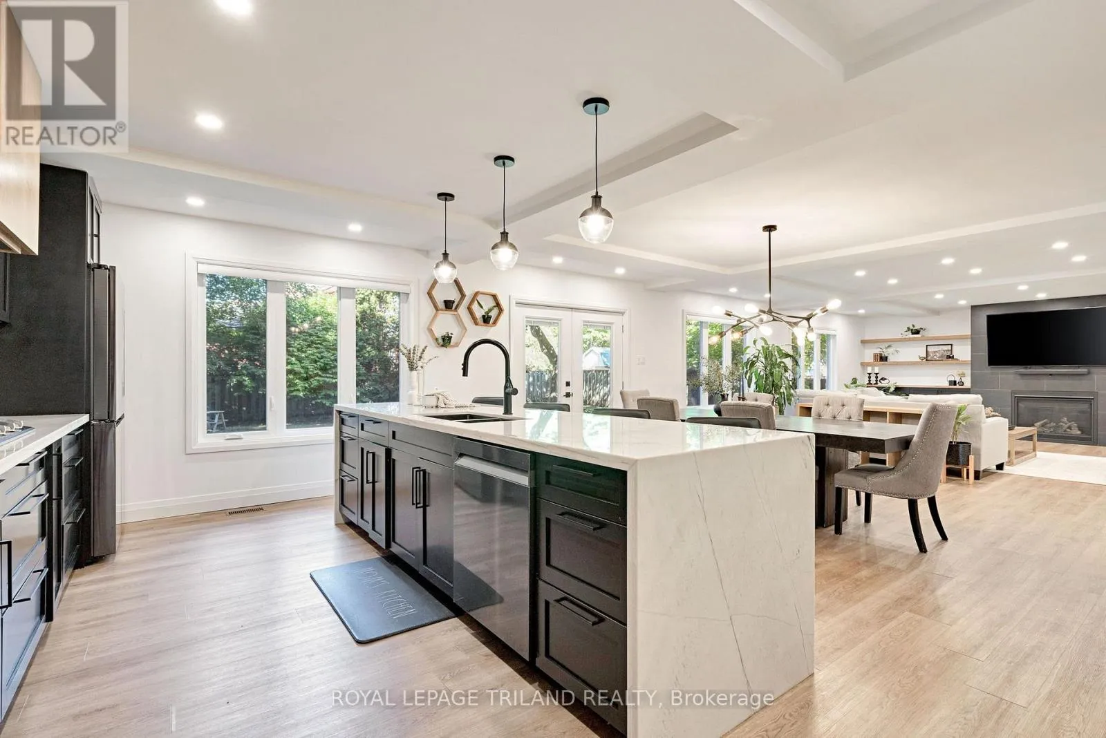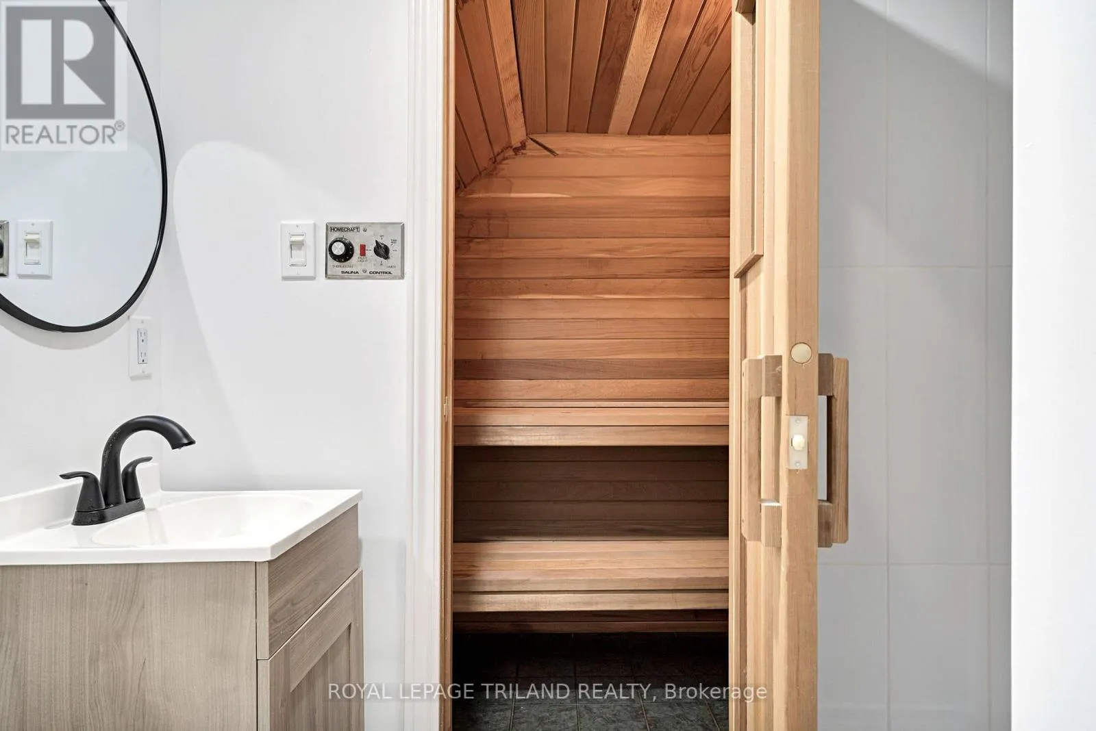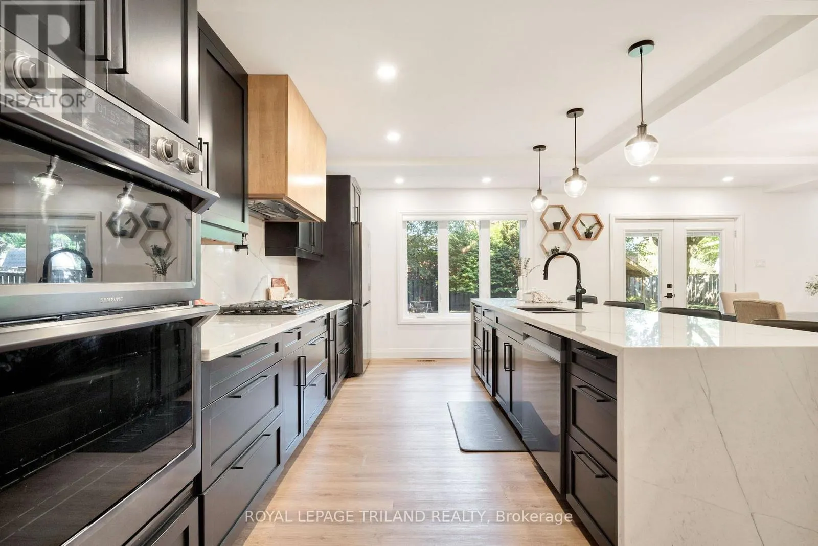 Cross Streets: Hastings Drive. ** Directions: Fanshawe Park Road East, North onto Hastings Drive, West onto Wendy Crescent. Welcome to 22 Wendy Crescent, a truly one-of-a-kind home located on a mature, quiet street in one of London's most coveted family neighbourhoods. This stunning 4-bedroom, 4-bathroom two-story home has been extensively renovated from top to bottom, including a spacious 800 sq. ft. addition that expands the homes already generous floor plan. The interior has been thoughtfully remodeled, with a redesigned main floor that's both bright and modern. At the heart of the home is a show-stopping kitchen, complete with an oversized island and sleek, contemporary finishes. The main level also includes a dedicated home office, offering a quiet and productive space for remote work or study. Upstairs, the primary bedroom features a large walk-in closet and a beautifully appointed en-suite bathroom. The fully finished basement adds even more living space, offering brand-new carpet, a potential 5th bedroom, a 3-piece washroom, a wet bar, and a built-in sauna - perfect for entertaining, hosting guests, or enjoying a private retreat. Significant exterior upgrades have also been completed, including updated windows, garage doors, and a concrete patio in the backyard - ideal for outdoor dining or relaxing in your own outdoor space. Located within walking distance to top-rated schools, nearby parks, and scenic walking trails and just minutes from Masonville Mall and all north-end amenities - this home combines modern luxury with the charm of a well-established, family-friendly neighbourhood. ** This is a linked property.** (id:27476)