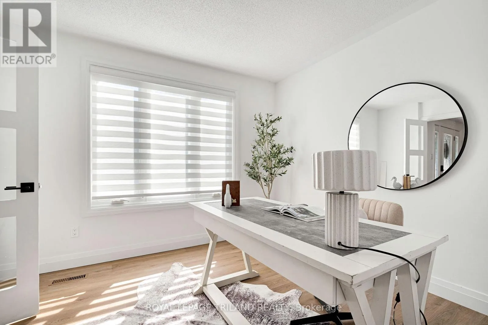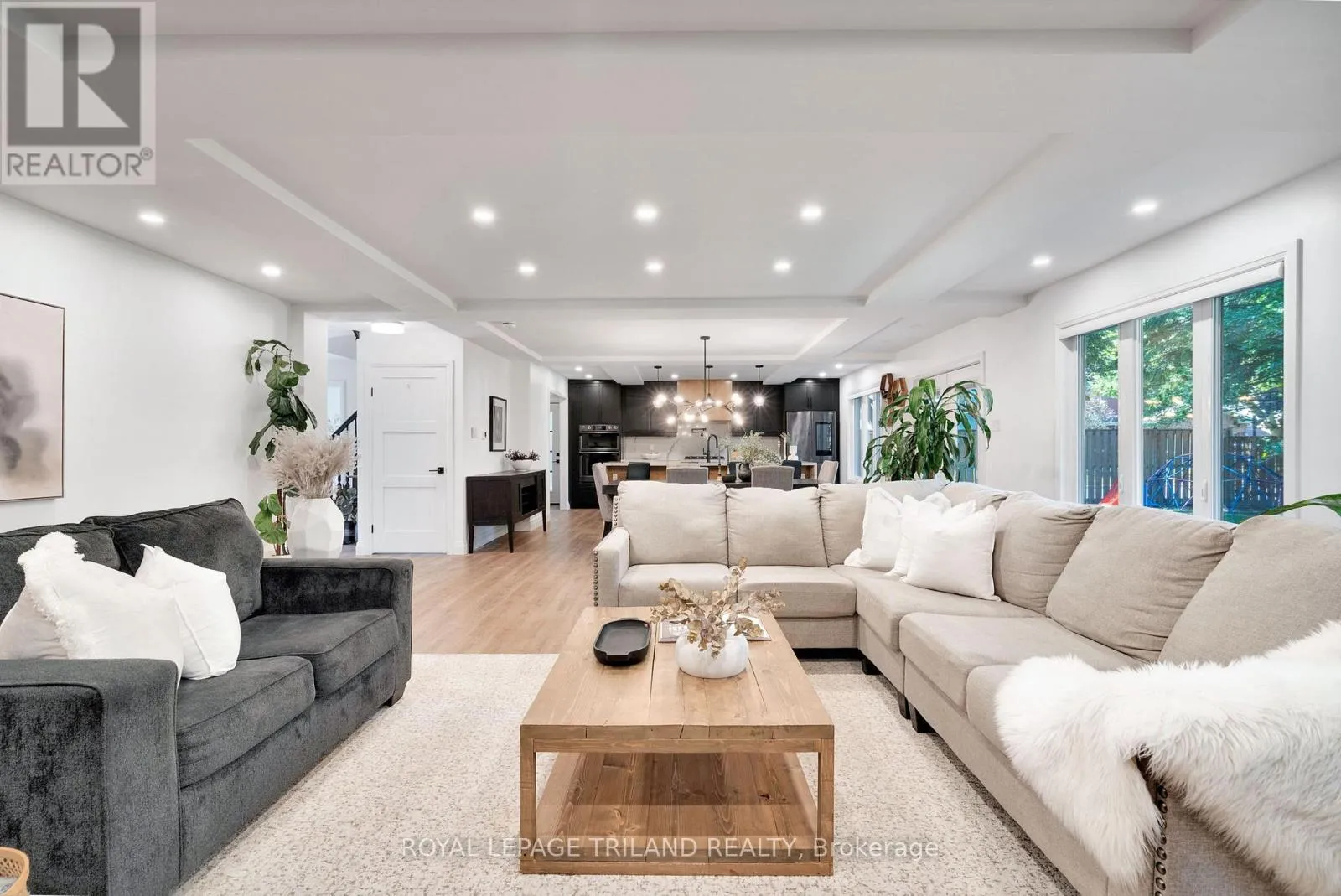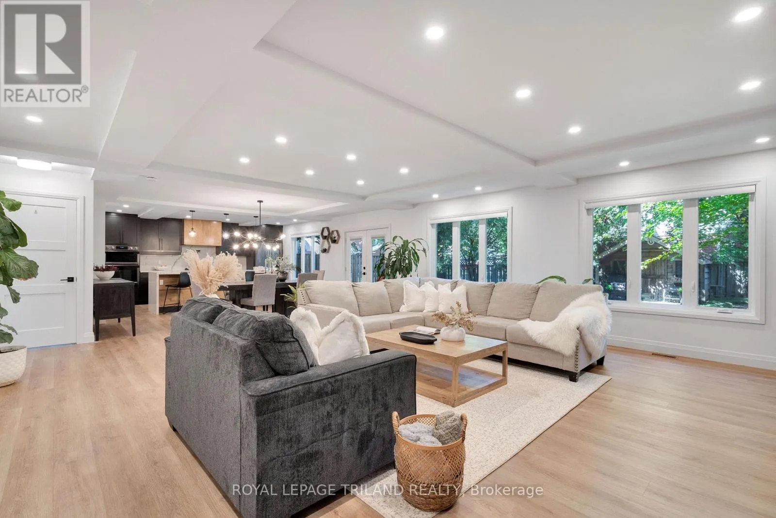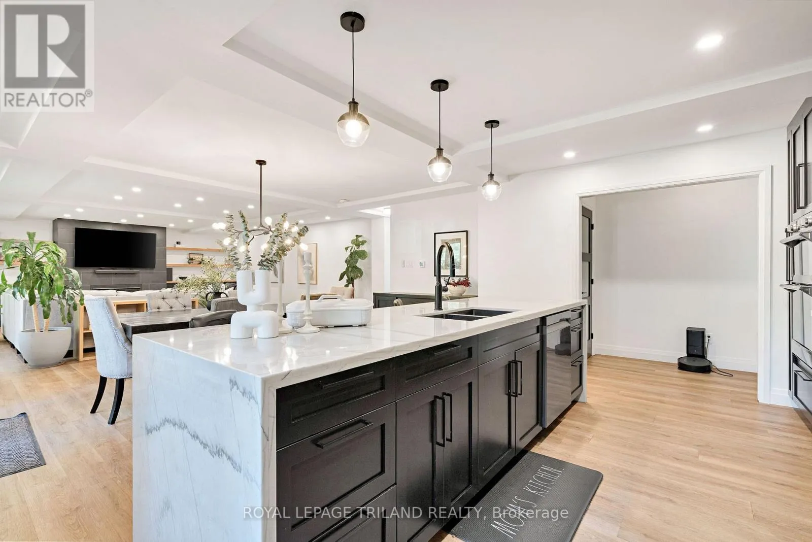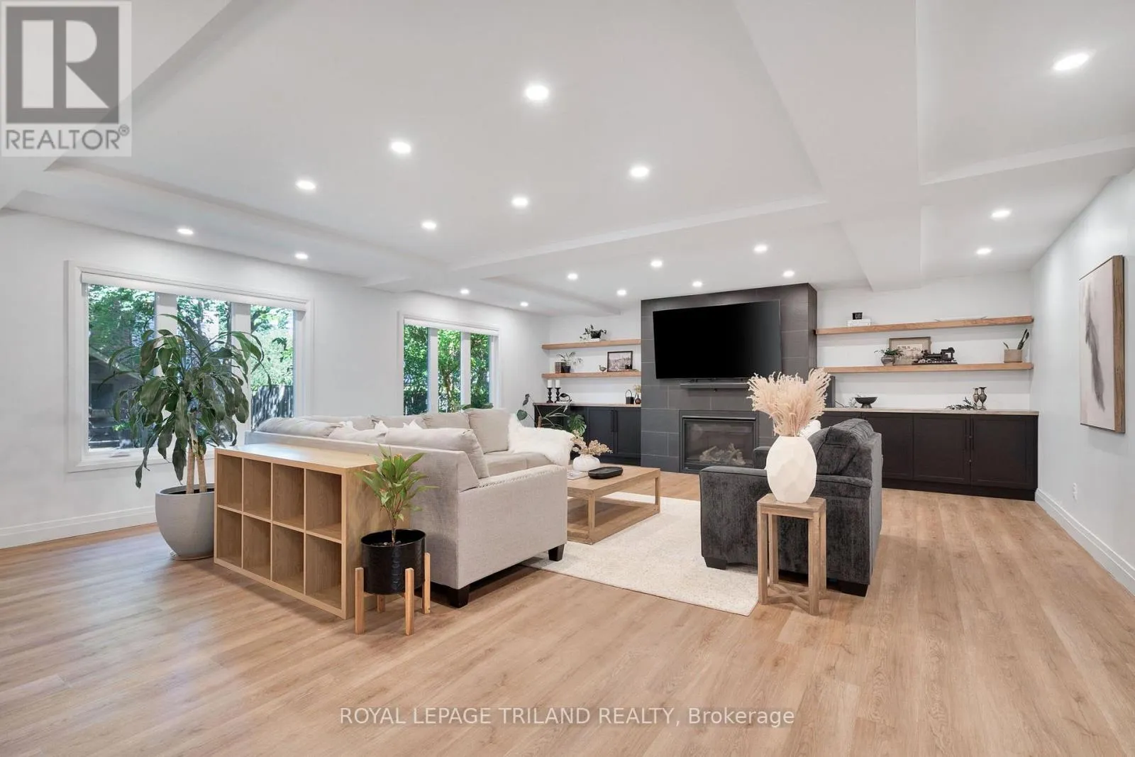 Cross Streets: Hastings Drive. ** Directions: Fanshawe Park Road East, North onto Hastings Drive, West onto Wendy Crescent. Welcome to 22 Wendy Crescent, a truly one-of-a-kind home located on a mature, quiet street in one of London's most coveted family neighbourhoods. This stunning 4-bedroom, 4-bathroom two-story home has been extensively renovated from top to bottom, including a spacious 800 sq. ft. addition that expands the homes already generous floor plan. The interior has been thoughtfully remodeled, with a redesigned main floor that's both bright and modern. At the heart of the home is a show-stopping kitchen, complete with an oversized island and sleek, contemporary finishes. The main level also includes a dedicated home office, offering a quiet and productive space for remote work or study. Upstairs, the primary bedroom features a large walk-in closet and a beautifully appointed en-suite bathroom. The fully finished basement adds even more living space, offering brand-new carpet, a potential 5th bedroom, a 3-piece washroom, a wet bar, and a built-in sauna - perfect for entertaining, hosting guests, or enjoying a private retreat. Significant exterior upgrades have also been completed, including updated windows, garage doors, and a concrete patio in the backyard - ideal for outdoor dining or relaxing in your own outdoor space. Located within walking distance to top-rated schools, nearby parks, and scenic walking trails and just minutes from Masonville Mall and all north-end amenities - this home combines modern luxury with the charm of a well-established, family-friendly neighbourhood. ** This is a linked property.** (id:27476)