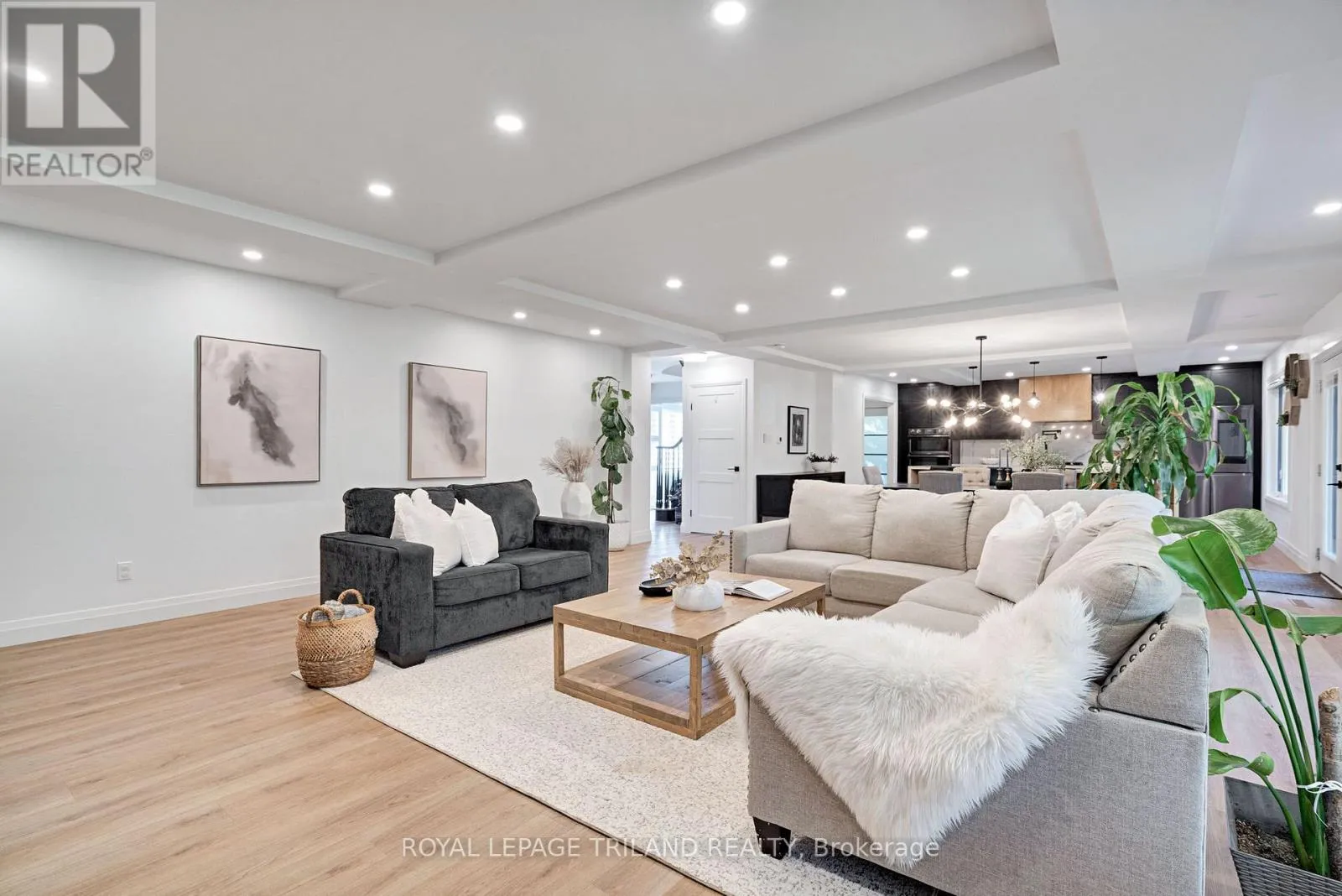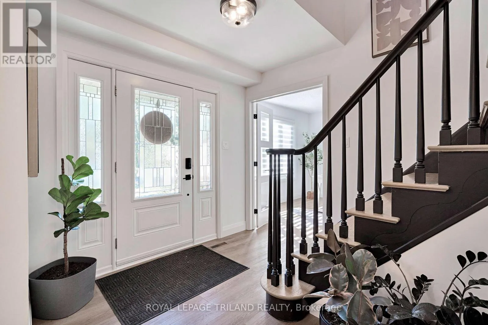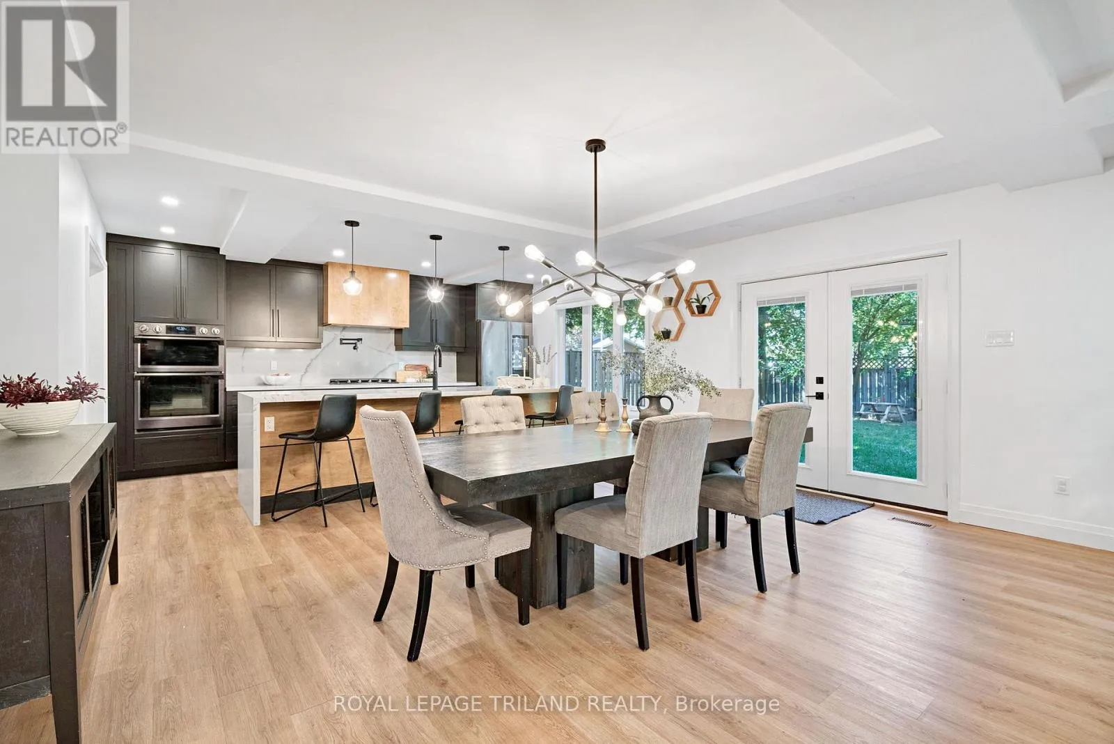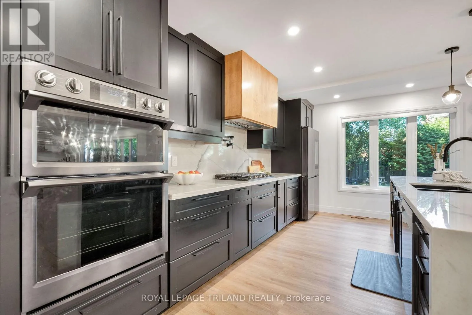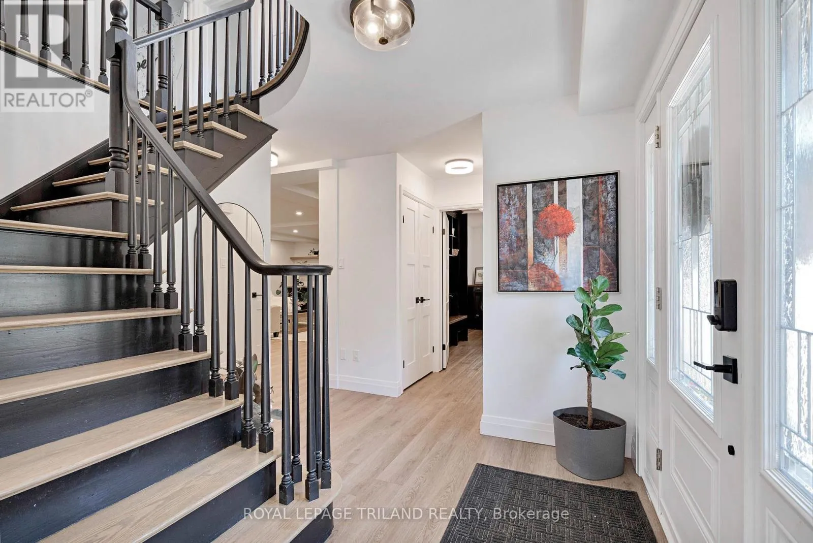 Cross Streets: Hastings Drive. ** Directions: Fanshawe Park Road East, North onto Hastings Drive, West onto Wendy Crescent. Welcome to 22 Wendy Crescent, a truly one-of-a-kind home located on a mature, quiet street in one of London's most coveted family neighbourhoods. This stunning 4-bedroom, 4-bathroom two-story home has been extensively renovated from top to bottom, including a spacious 800 sq. ft. addition that expands the homes already generous floor plan. The interior has been thoughtfully remodeled, with a redesigned main floor that's both bright and modern. At the heart of the home is a show-stopping kitchen, complete with an oversized island and sleek, contemporary finishes. The main level also includes a dedicated home office, offering a quiet and productive space for remote work or study. Upstairs, the primary bedroom features a large walk-in closet and a beautifully appointed en-suite bathroom. The fully finished basement adds even more living space, offering brand-new carpet, a potential 5th bedroom, a 3-piece washroom, a wet bar, and a built-in sauna - perfect for entertaining, hosting guests, or enjoying a private retreat. Significant exterior upgrades have also been completed, including updated windows, garage doors, and a concrete patio in the backyard - ideal for outdoor dining or relaxing in your own outdoor space. Located within walking distance to top-rated schools, nearby parks, and scenic walking trails and just minutes from Masonville Mall and all north-end amenities - this home combines modern luxury with the charm of a well-established, family-friendly neighbourhood. ** This is a linked property.** (id:27476)