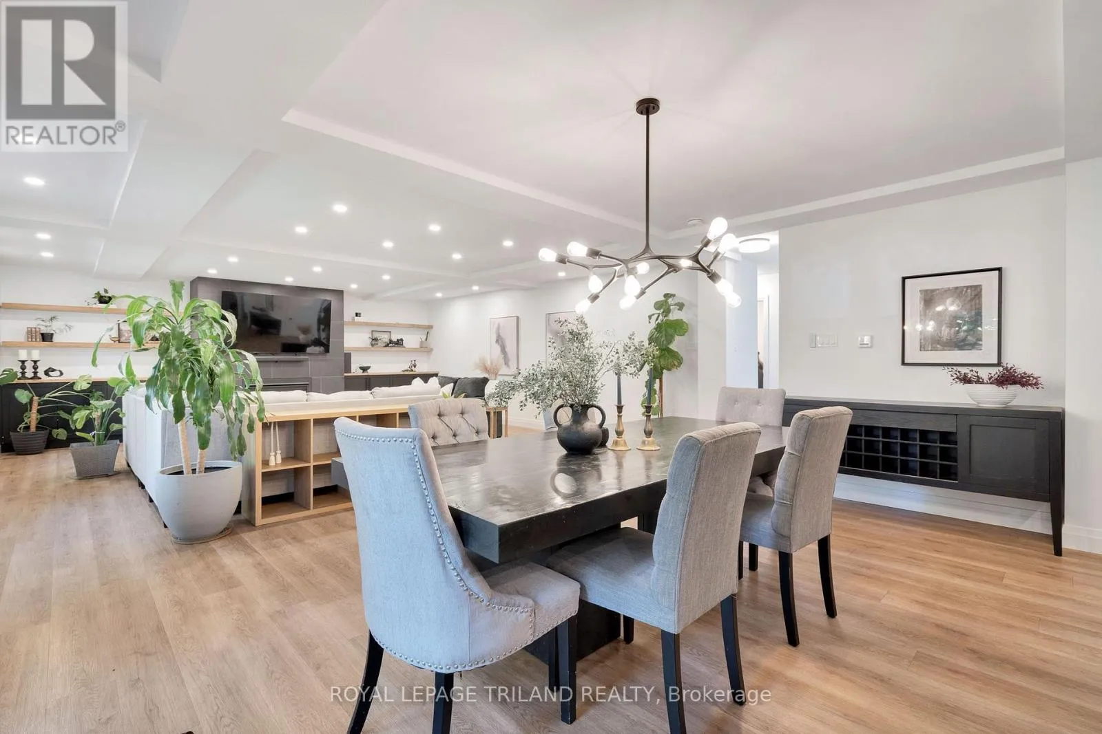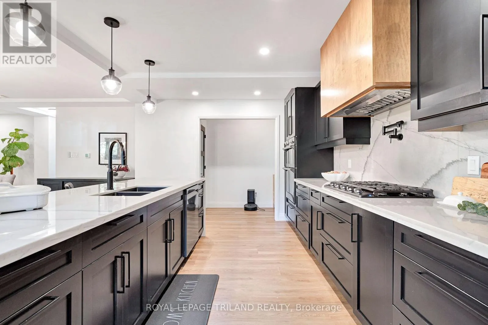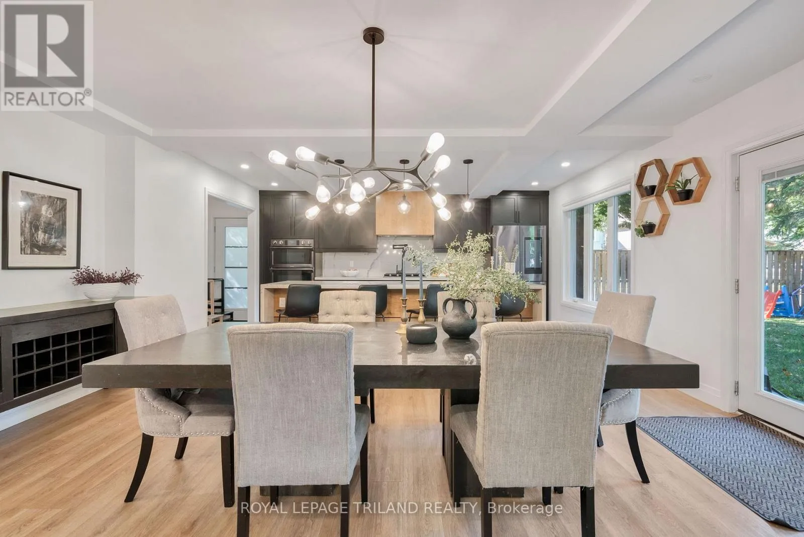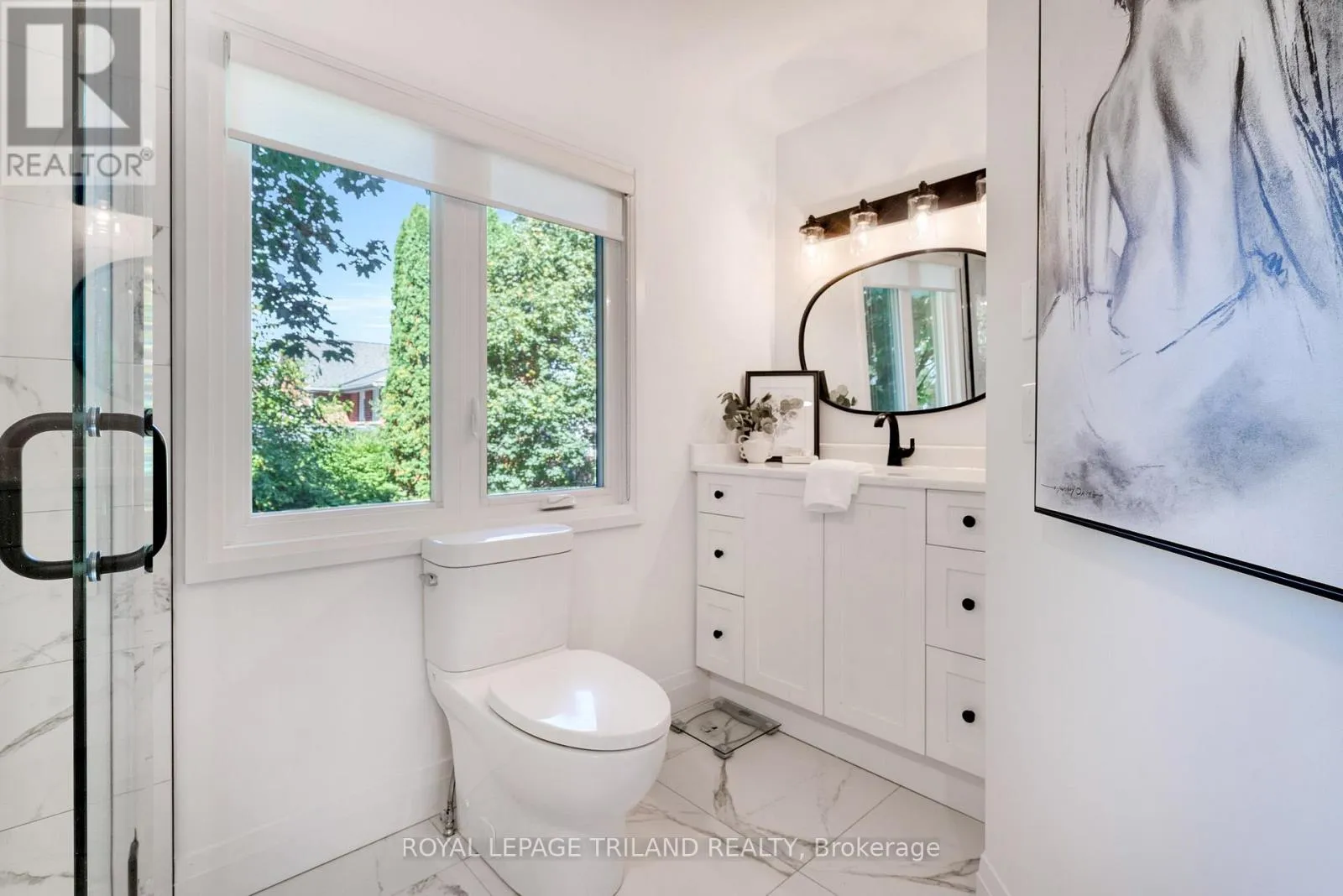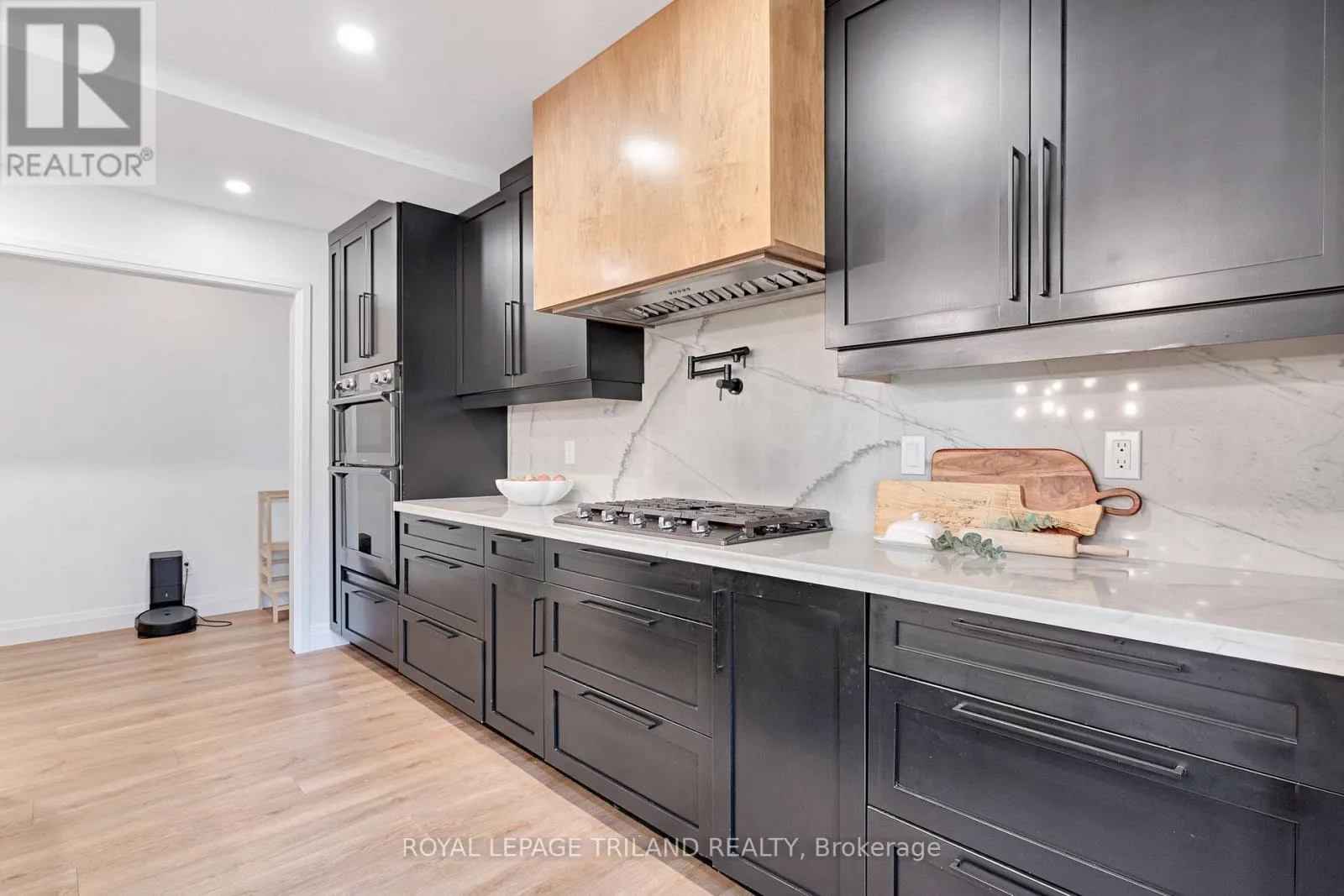 Cross Streets: Hastings Drive. ** Directions: Fanshawe Park Road East, North onto Hastings Drive, West onto Wendy Crescent. Welcome to 22 Wendy Crescent, a truly one-of-a-kind home located on a mature, quiet street in one of London's most coveted family neighbourhoods. This stunning 4-bedroom, 4-bathroom two-story home has been extensively renovated from top to bottom, including a spacious 800 sq. ft. addition that expands the homes already generous floor plan. The interior has been thoughtfully remodeled, with a redesigned main floor that's both bright and modern. At the heart of the home is a show-stopping kitchen, complete with an oversized island and sleek, contemporary finishes. The main level also includes a dedicated home office, offering a quiet and productive space for remote work or study. Upstairs, the primary bedroom features a large walk-in closet and a beautifully appointed en-suite bathroom. The fully finished basement adds even more living space, offering brand-new carpet, a potential 5th bedroom, a 3-piece washroom, a wet bar, and a built-in sauna - perfect for entertaining, hosting guests, or enjoying a private retreat. Significant exterior upgrades have also been completed, including updated windows, garage doors, and a concrete patio in the backyard - ideal for outdoor dining or relaxing in your own outdoor space. Located within walking distance to top-rated schools, nearby parks, and scenic walking trails and just minutes from Masonville Mall and all north-end amenities - this home combines modern luxury with the charm of a well-established, family-friendly neighbourhood. ** This is a linked property.** (id:27476)