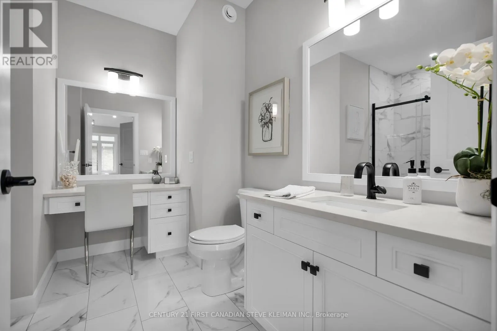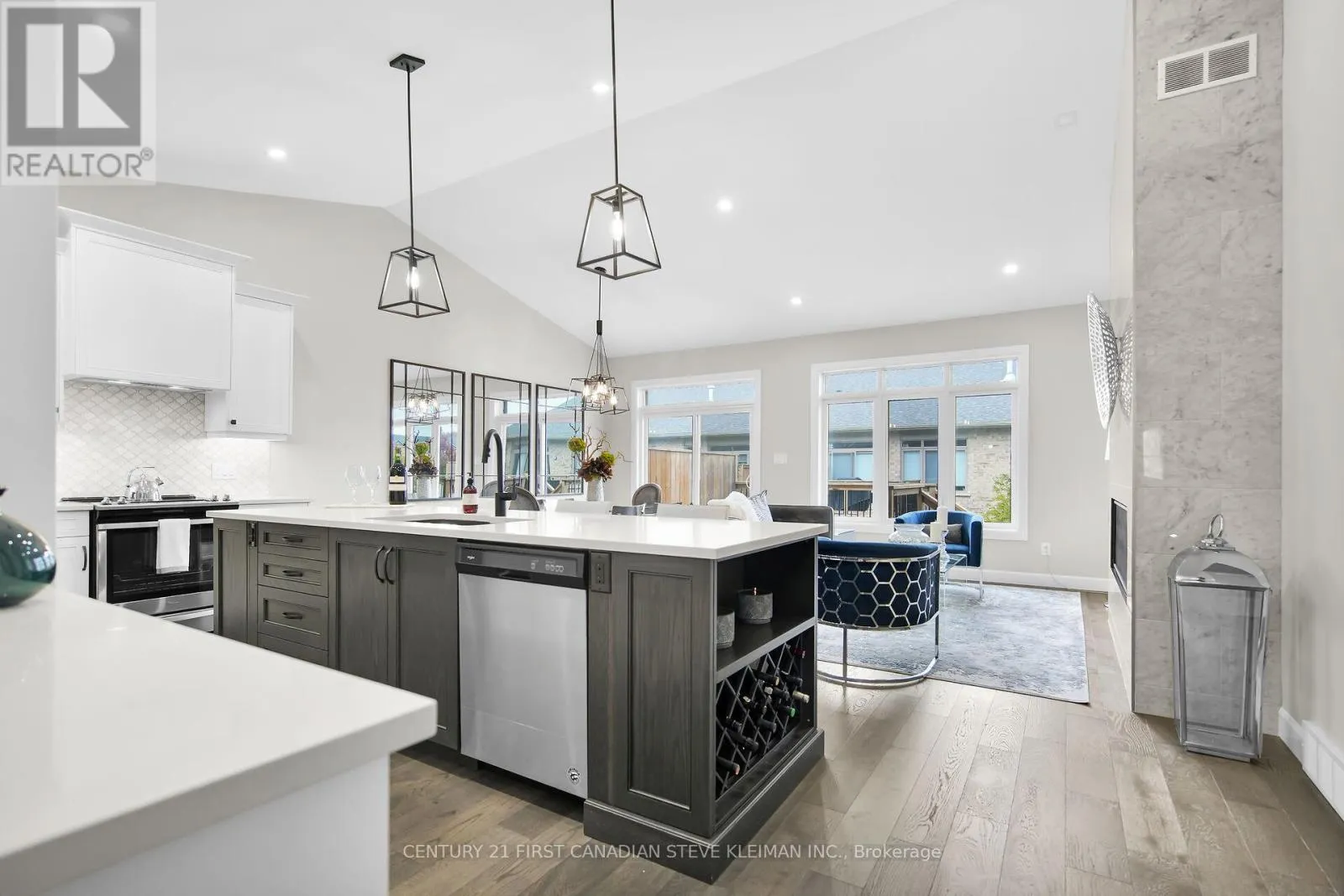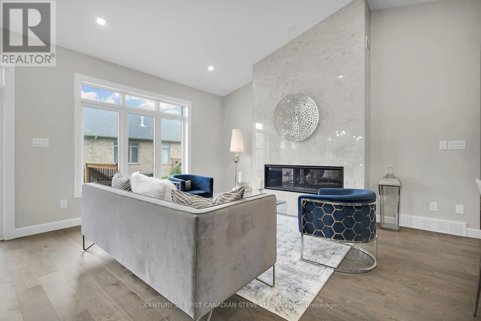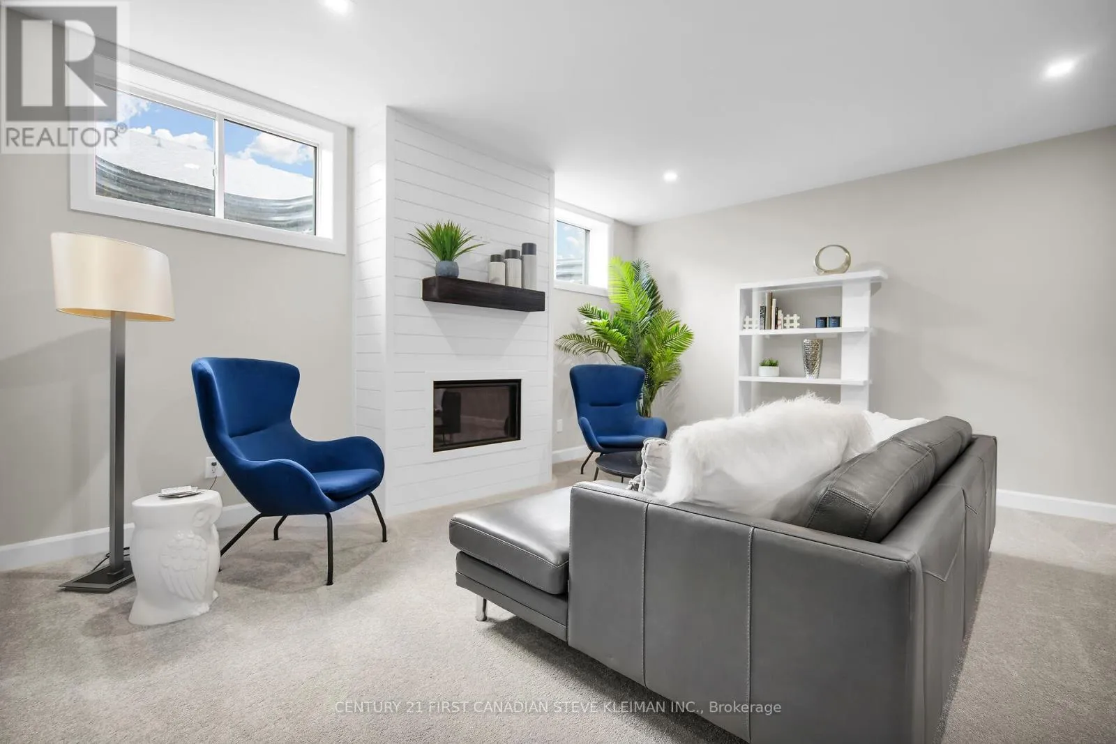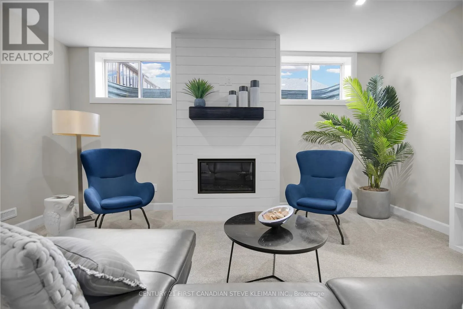 Cross Streets: Fair Oaks. ** Directions: Sunningdale to Fair Oaks to Buroak Drive. THIS COMPLETELY LOADED MODEL HOME IS NOW FOR SALE AT FOX COURT! Only one lucky buyer will own the showcase home with all the bells and whistles. Welcome to FOX COURT, a community of new builds by AUBURN HOMES. This open-concept and highly sought-after Sheffield floor plan features 2,222 sq. ft. of finished living space, including 1,407 sq. ft. on the main floor, designed with premium finishes throughout. The entertainer's chef's kitchen offers a large breakfast-bar island overlooking the great room and dining area, highlighted by a vaulted ceiling and sleek linear gas fireplace with floor to ceiling tile surround. The primary bedroom includes a large walk-in closet and a beautifully appointed 3-pc ensuite with makeup vanity. A versatile second bedroom or den provides double closets. You'll love the convenience of main-floor laundry and the additional 4-pc bathroom. Quartz countertops featured in the kitchen and all bathrooms. The finished basement adds even more space with a third bedroom, recreation room with second fireplace, and a 3-pc bathroom, plus plenty of storage. Enjoy outdoor living with a lovely covered front porch and a private back deck off the dining room - perfect for coffee, grilling, or entertaining. Come see the tens of thousands of dollars in custom upgrades that Auburn Homes put into this designer model to showcase the entire community. And the best part - never water, cut the grass, or shovel snow again! Care-free living with a warm sense of community. (id:27476)